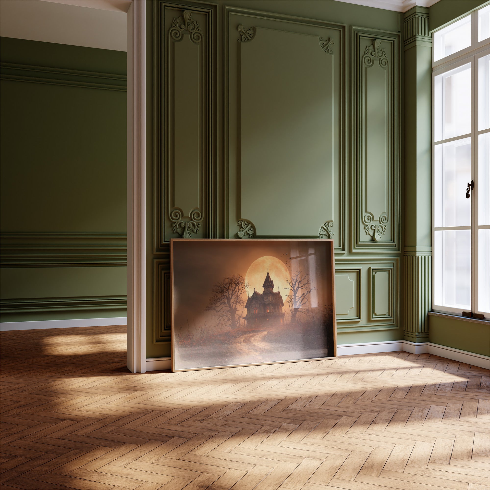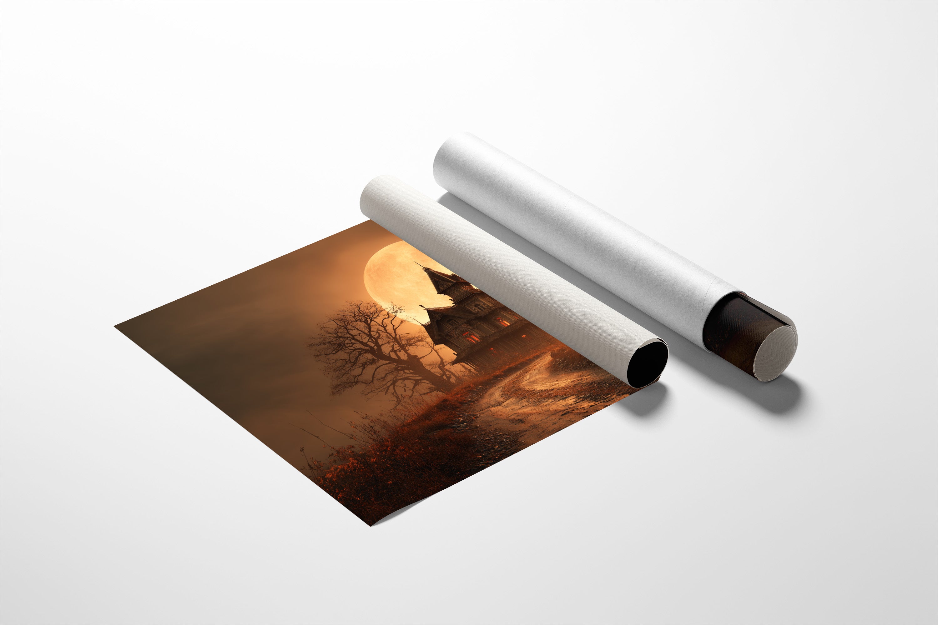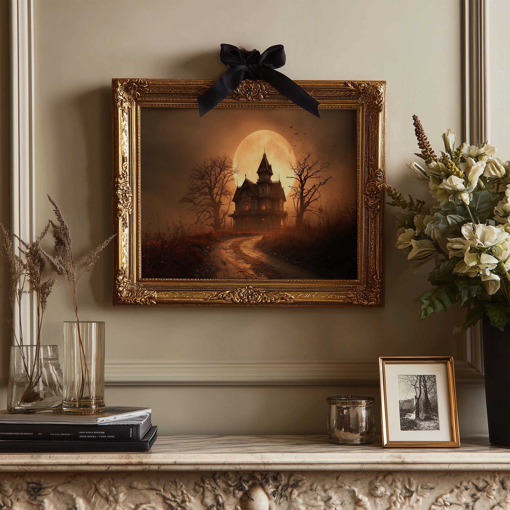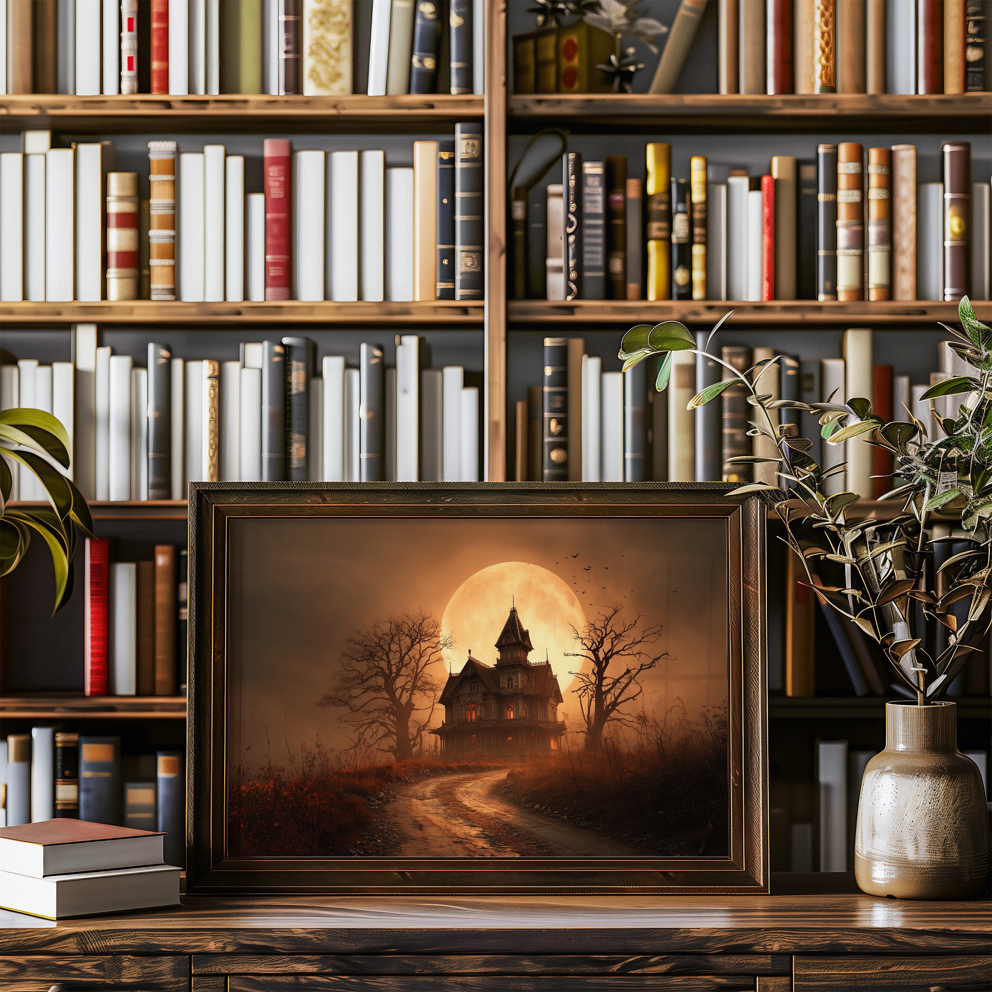 The amber glow of an impossibly large moon bathes an eerie Victorian mansion in golden light. Skeletal trees frame the scene, their twisted branches reaching skyward against the autumn-hued sky while a winding dirt path invites curious travelers toward the mysterious dwelling. Rich sepia tones blend with burnt orange and deep shadows, creating a nostalgic yet slightly unsettling atmosphere that balances between melancholy and enchantment. This haunting scene brings character to home libraries, reading nooks, or office spaces where literary imaginations flourish.