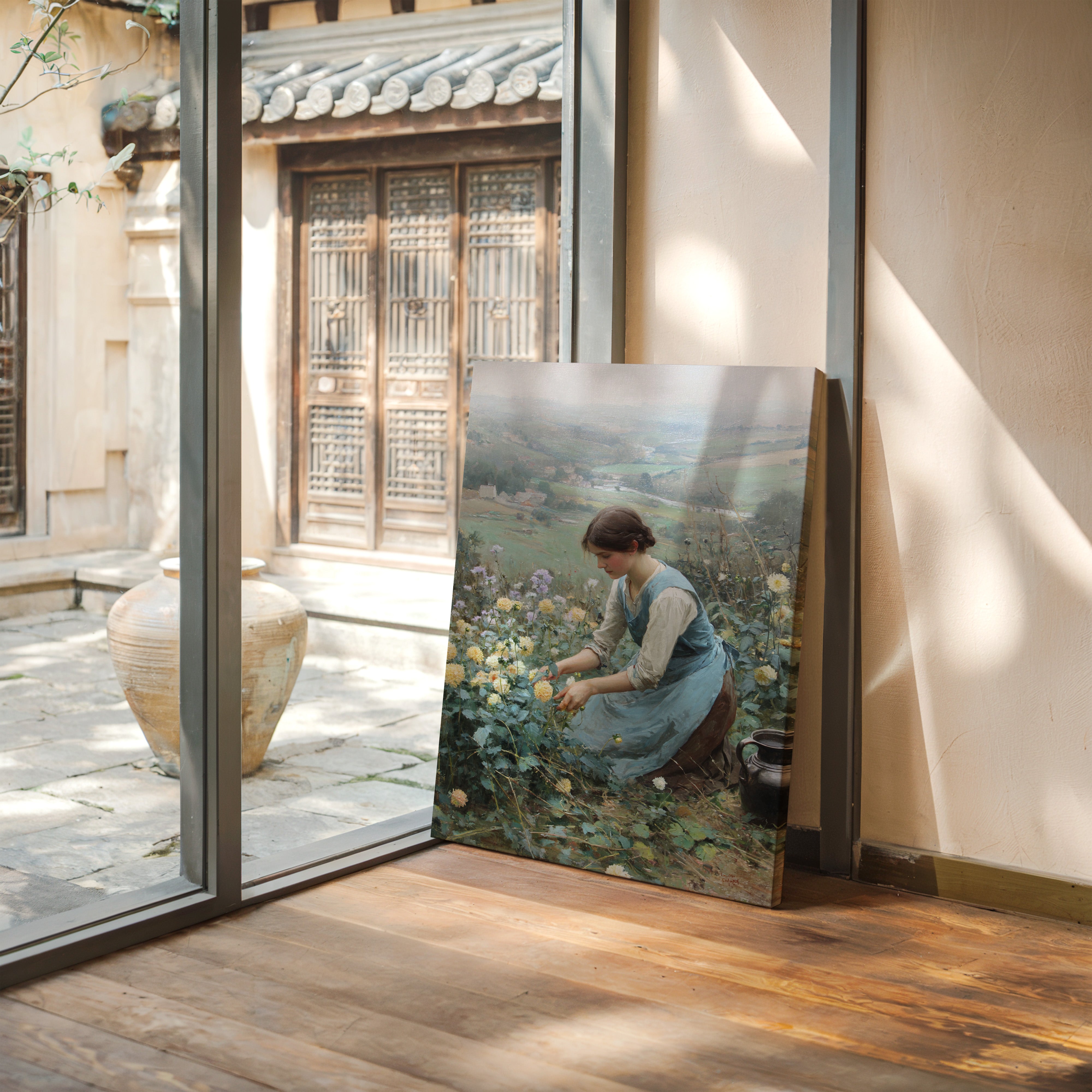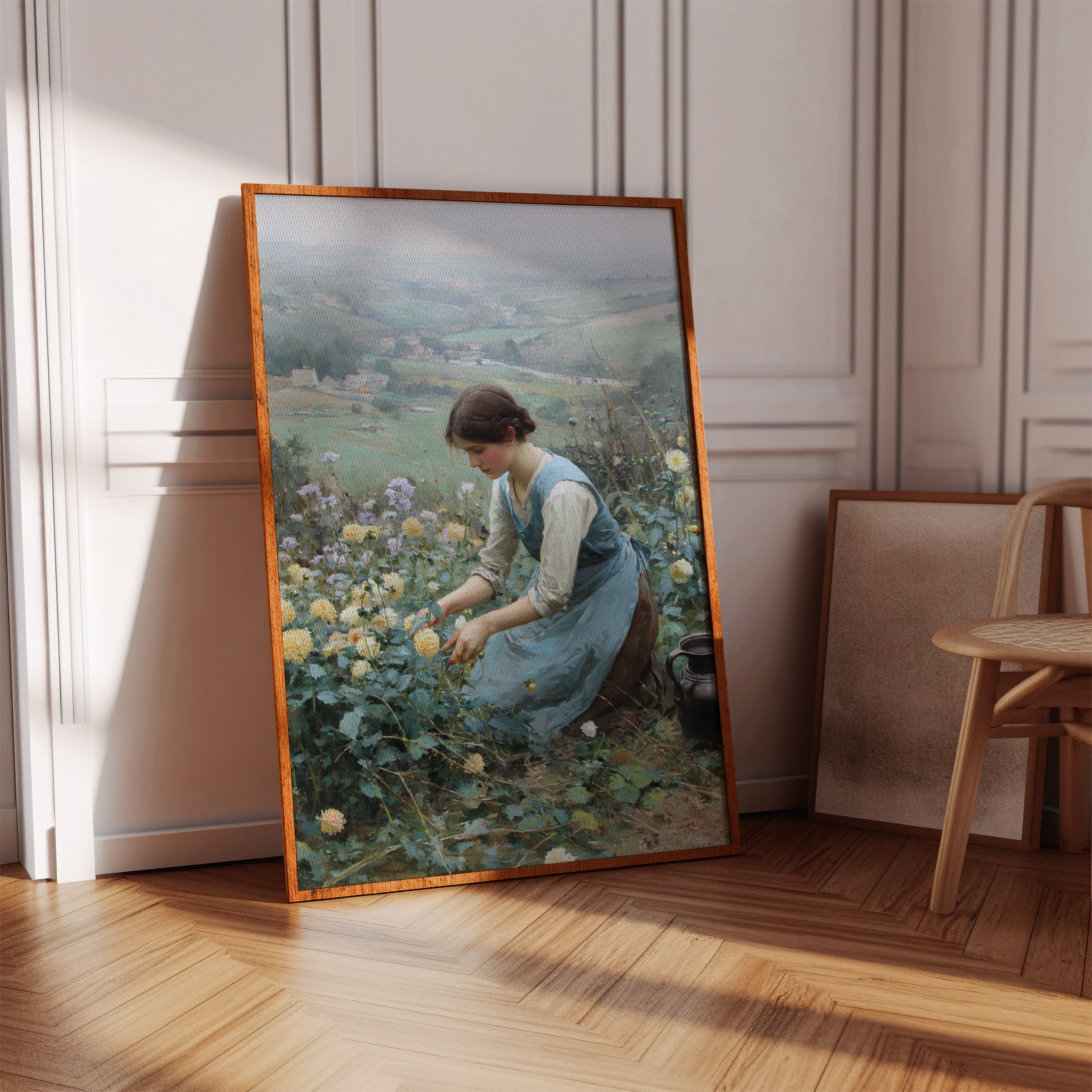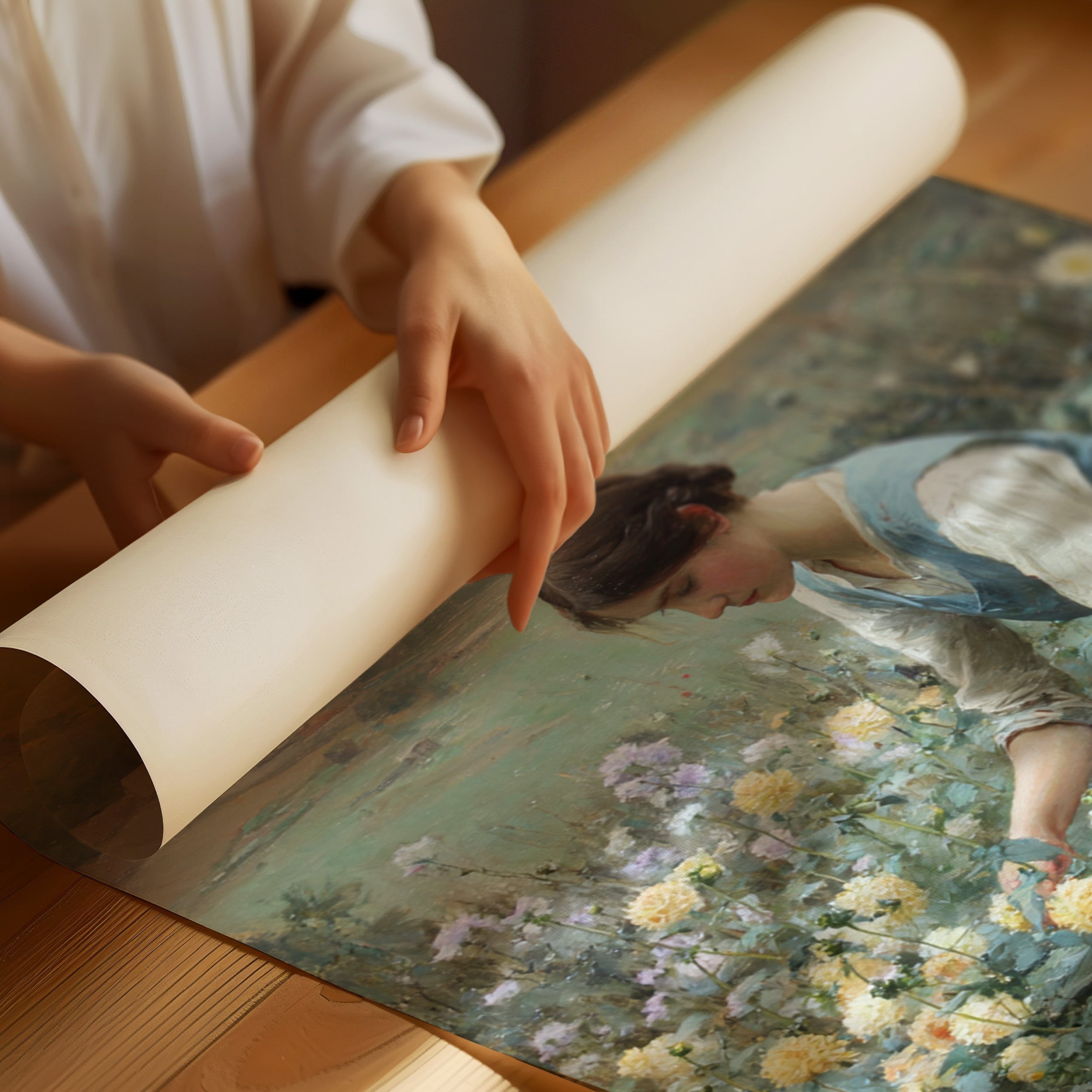 "In a serene embrace of nature, a young woman delicately tends to the blooms, each petal a testament to her nurturing spirit. This piece captures the essence of artisanal craftsmanship, celebrating the beauty of handpicked moments. The soft hues of yellow and lavender dance amidst the lush greens, evoking a sense of tranquility and connection to the land. Placed in a sunlit corner of your living room or a cozy reading nook, it invites the calm of a blooming garden into your home.