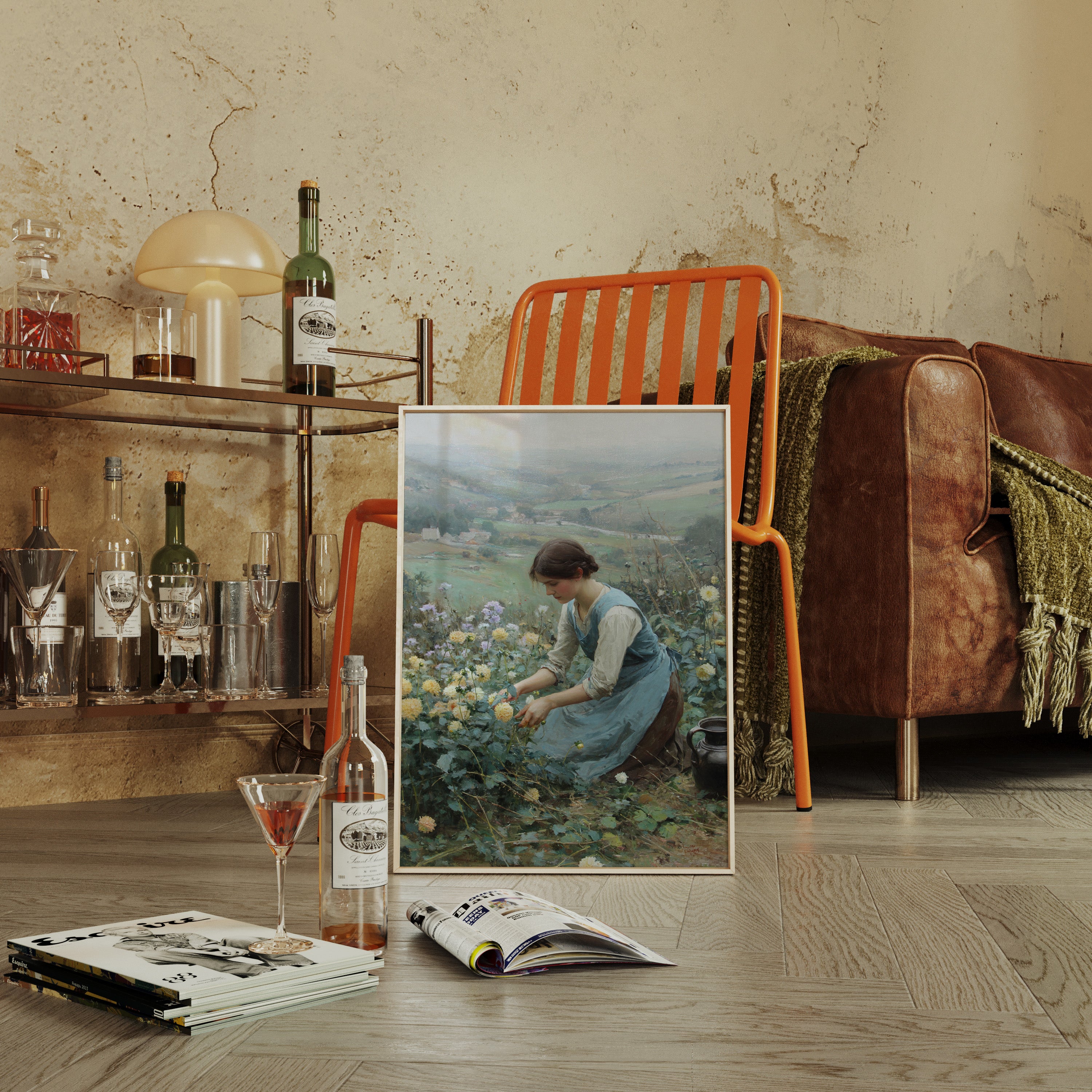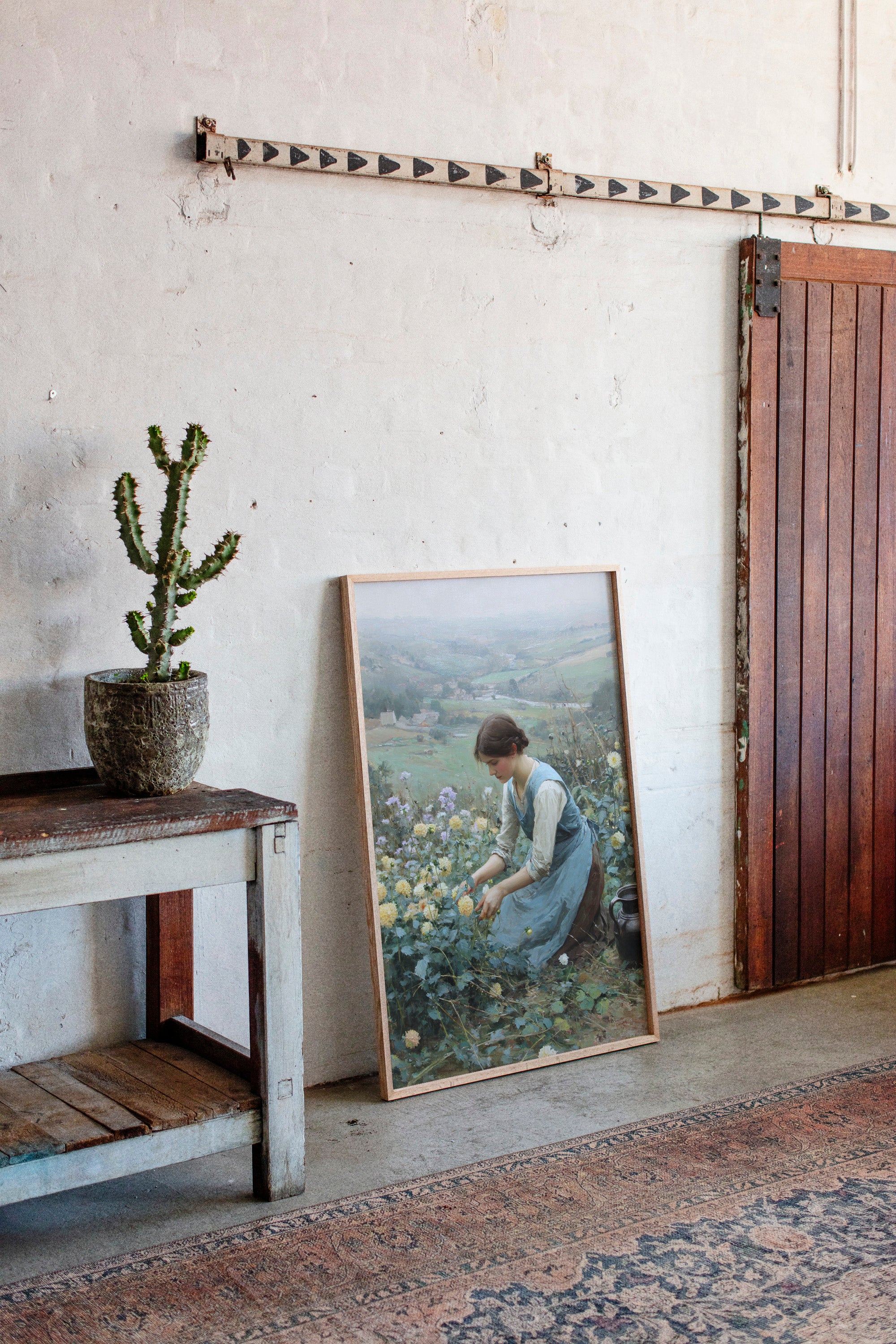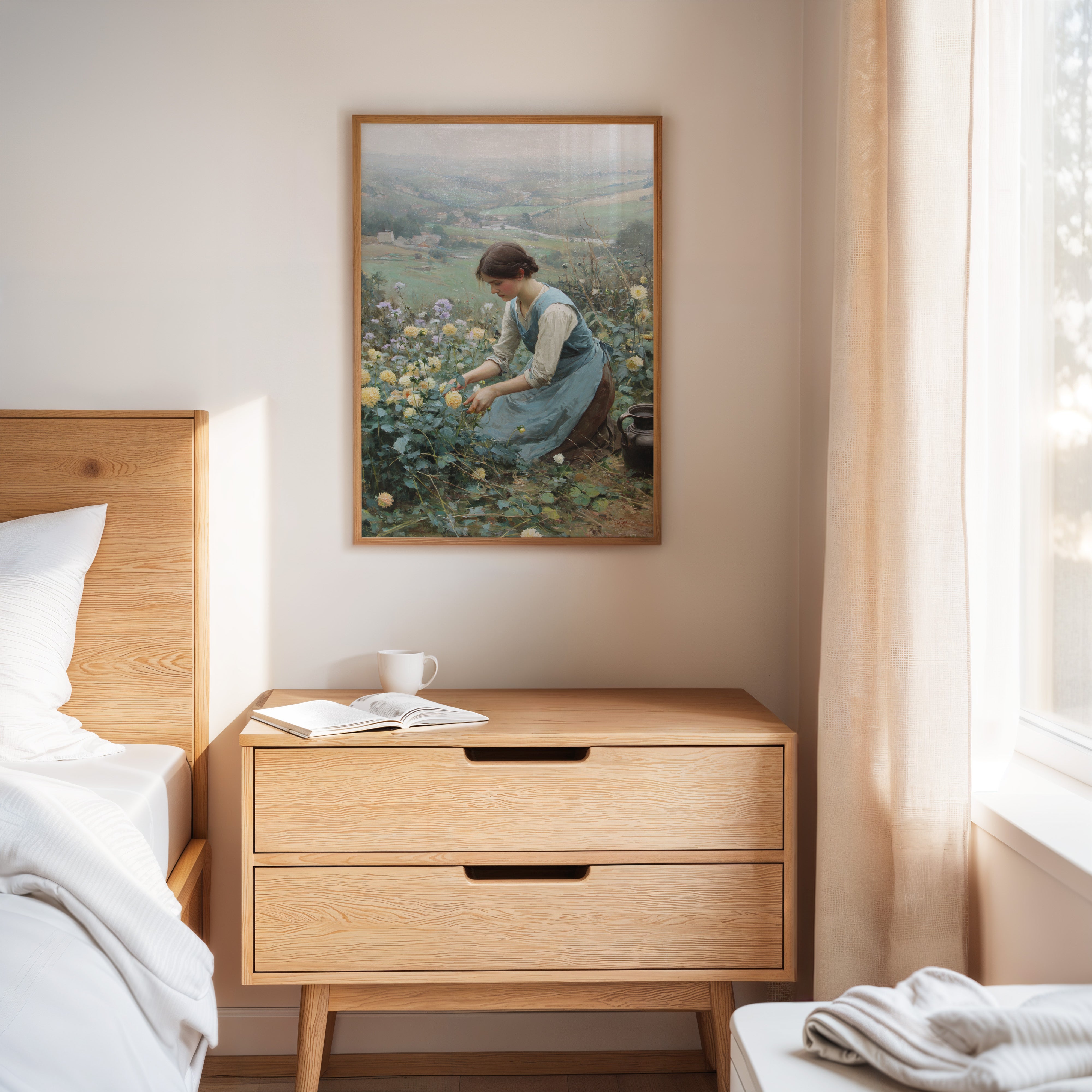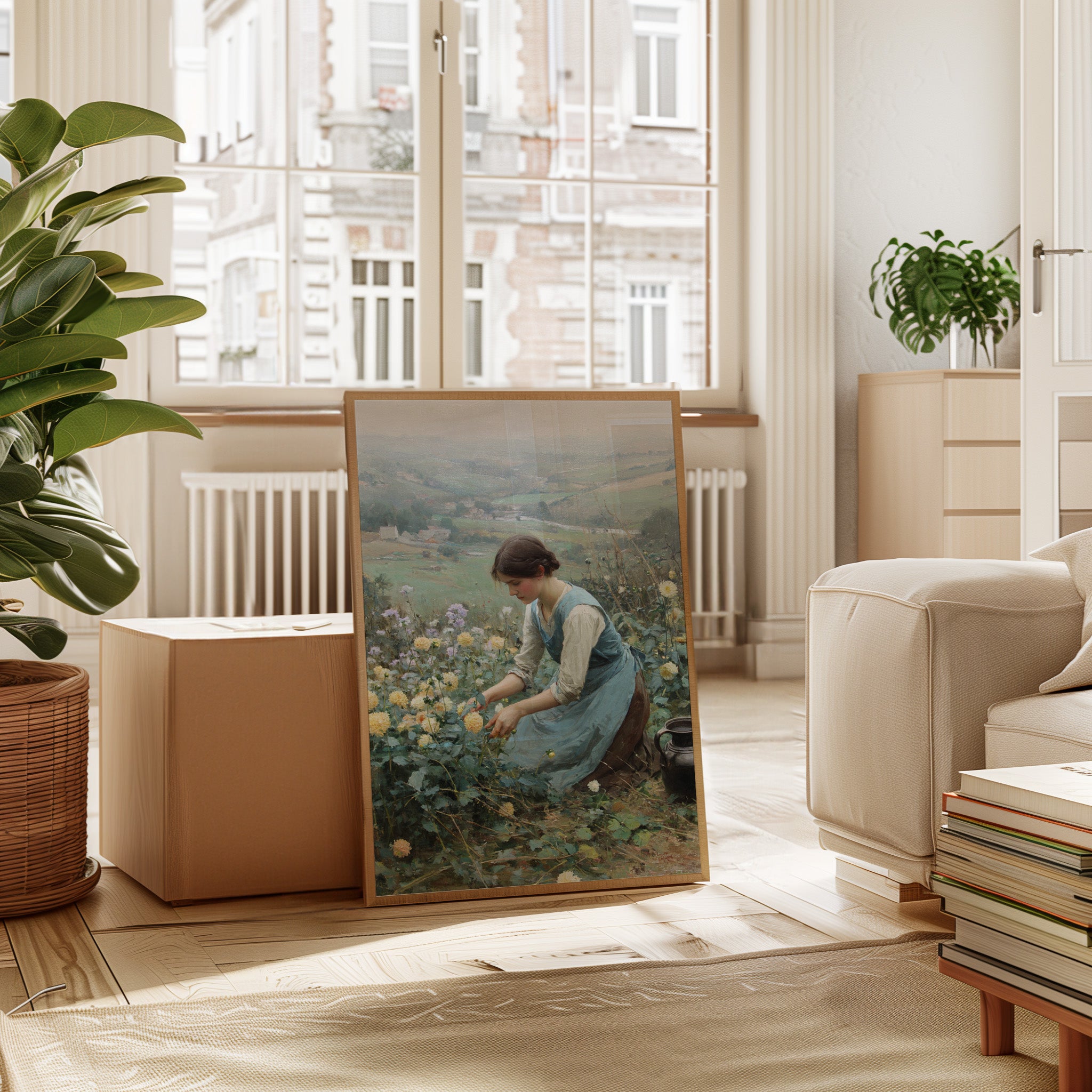 "In a serene embrace of nature, a young woman delicately tends to the blooms, each petal a testament to her nurturing spirit. This piece captures the essence of artisanal craftsmanship, celebrating the beauty of handpicked moments. The soft hues of yellow and lavender dance amidst the lush greens, evoking a sense of tranquility and connection to the land. Placed in a sunlit corner of your living room or a cozy reading nook, it invites the calm of a blooming garden into your home.