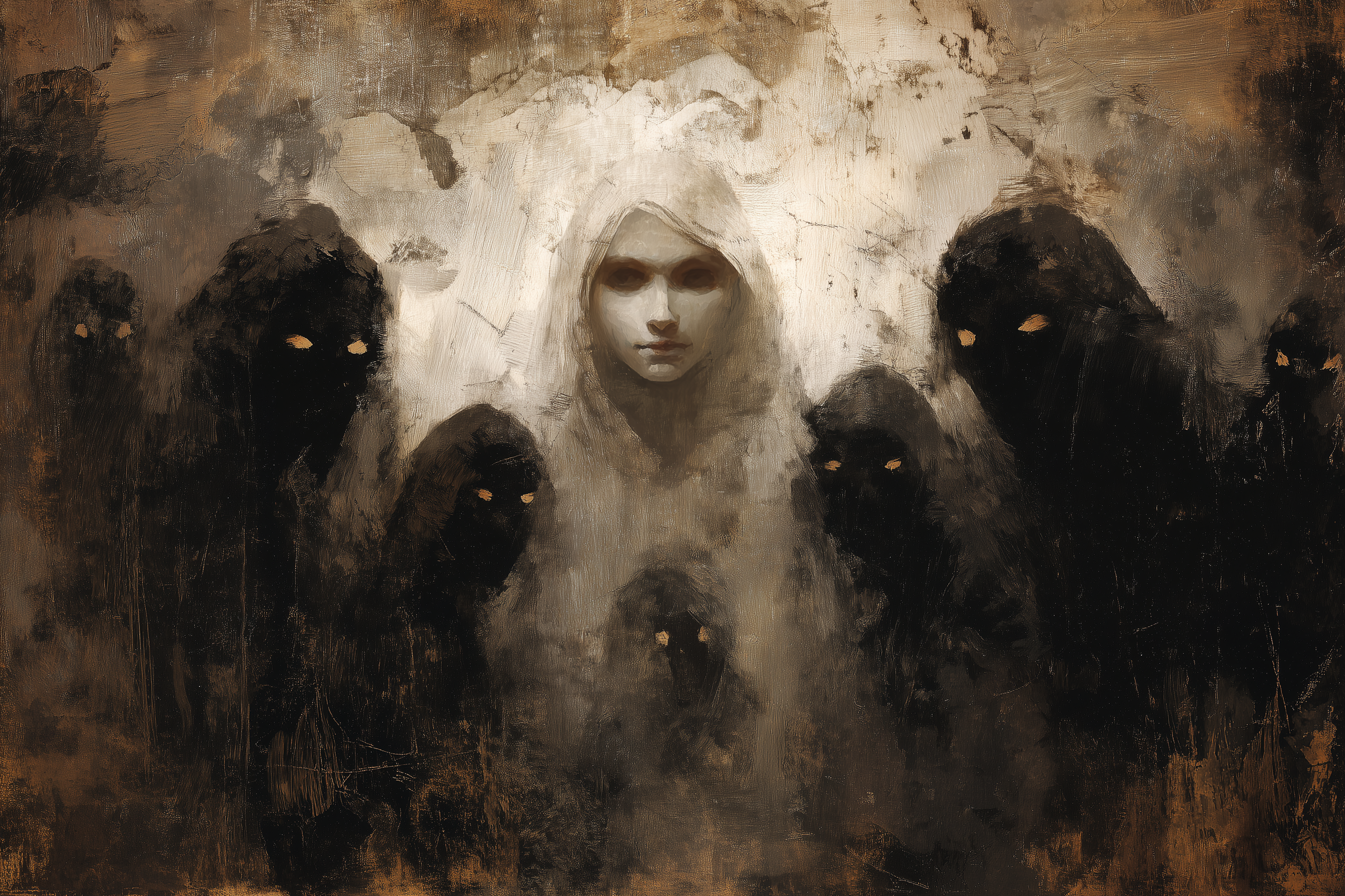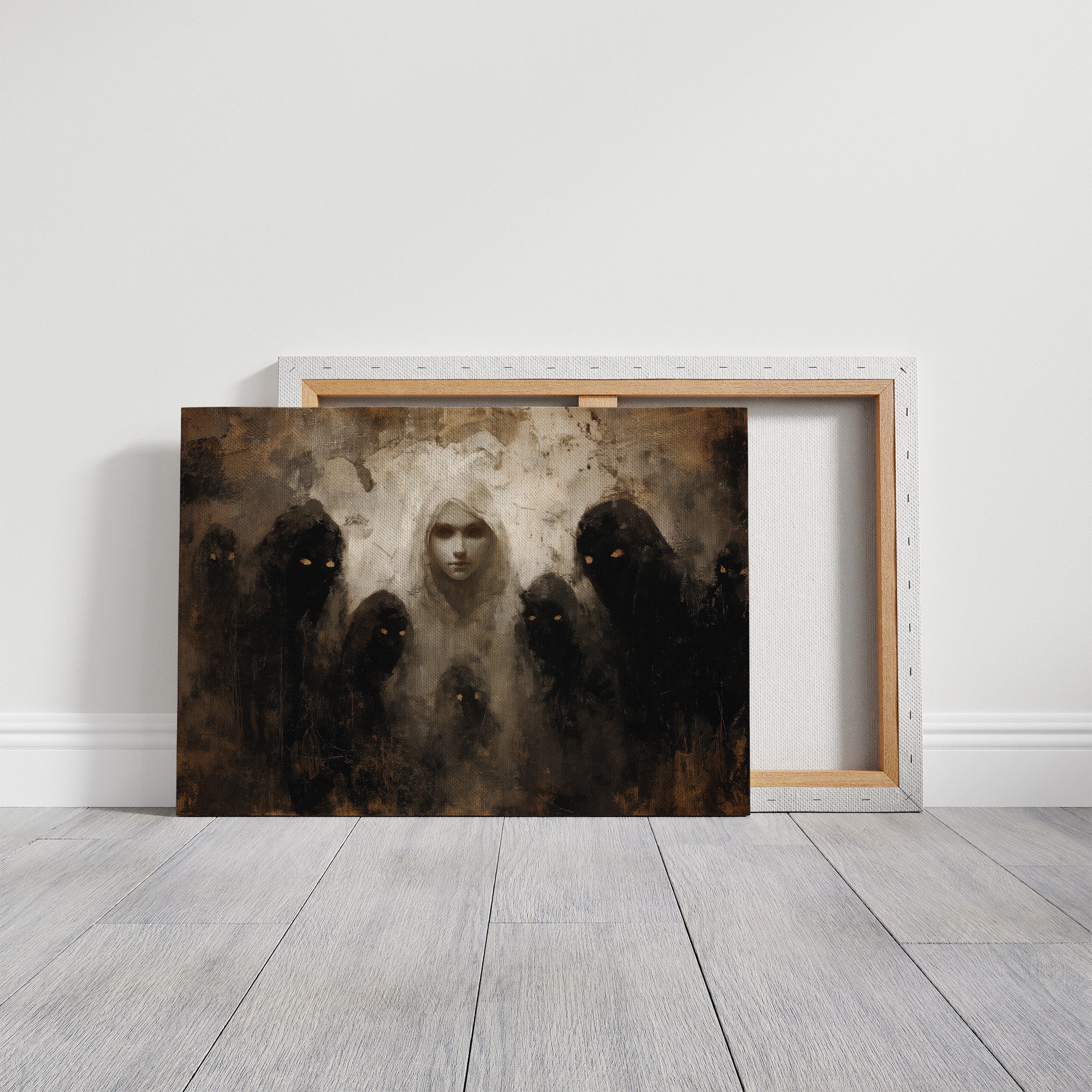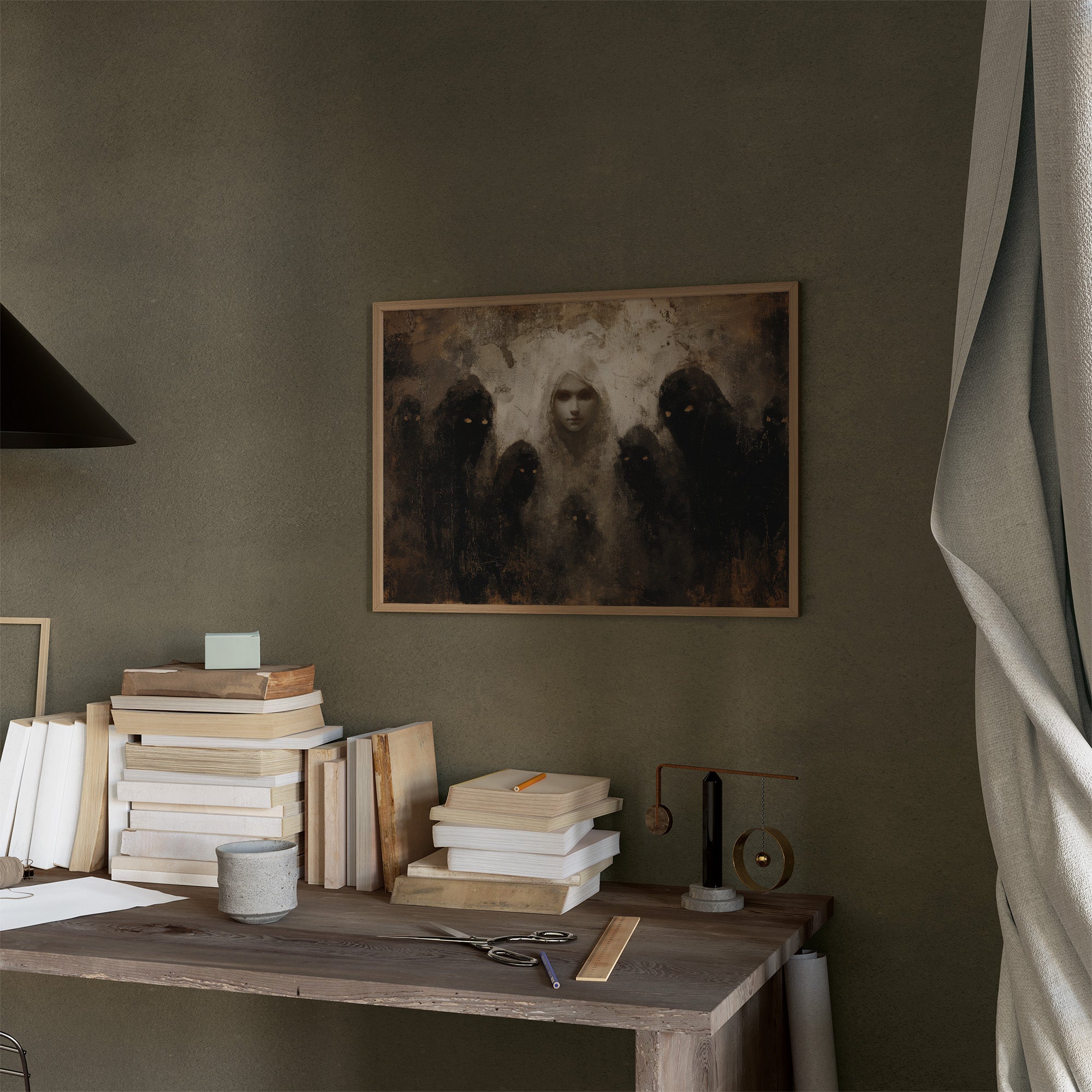 A mysterious painting rests against wooden bookshelves, inviting curious eyes into its haunting narrative. The ethereal figure emerges from smoky darkness, surrounded by shadowy forms with glowing eyes that seem to guard ancient secrets. Rich sepia tones and textured brushstrokes create an atmosphere of otherworldly suspense, balanced by the warm wooden shelves filled with countless volumes behind it. This striking piece brings sophisticated intrigue to a home library, study, or reading nook where contemplative conversations naturally unfold.