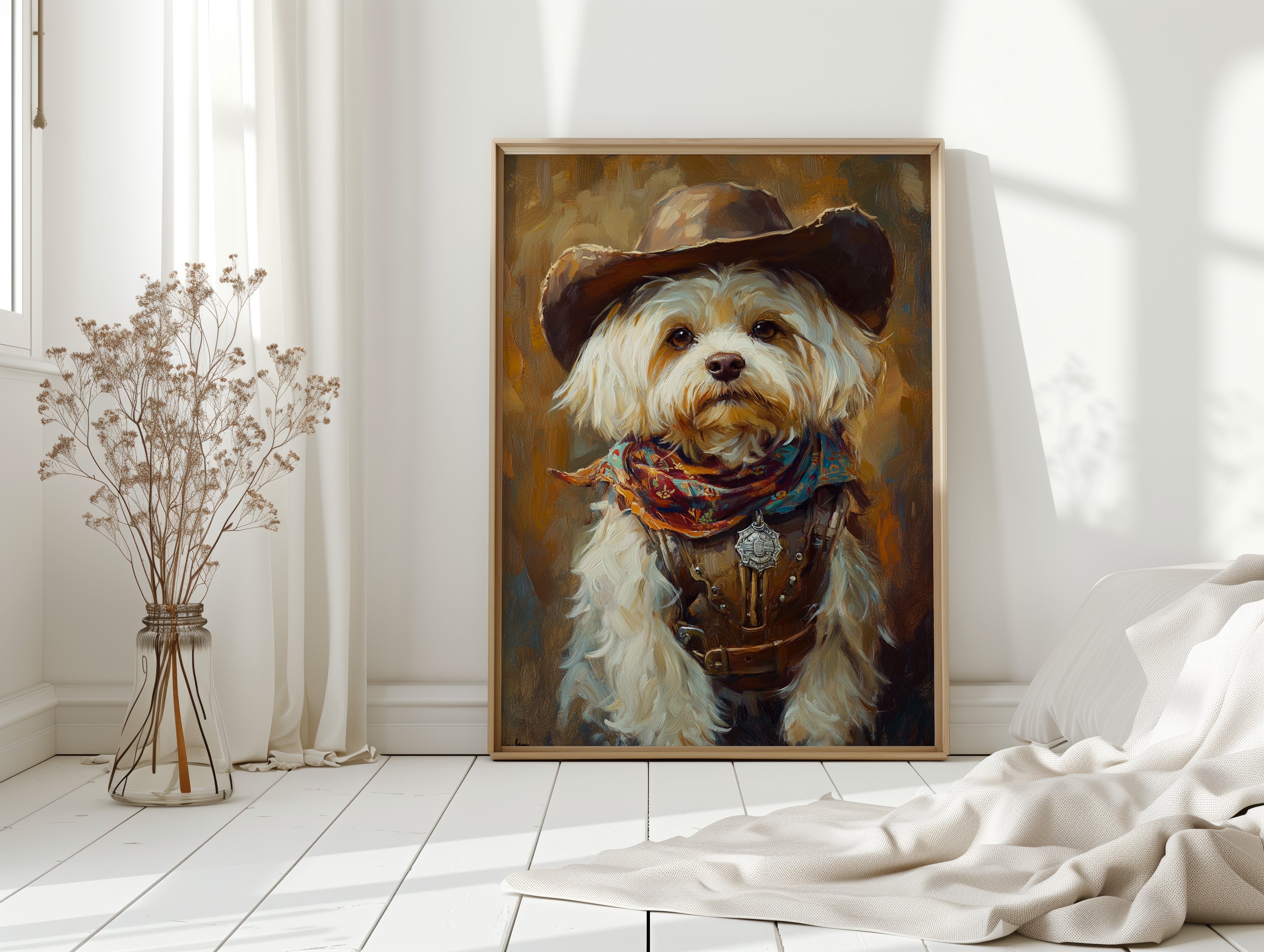Fluffy but fearless, this Havanese dons a bandana and badge, channeling rustic cowboy charm in a textured oil-painted style.