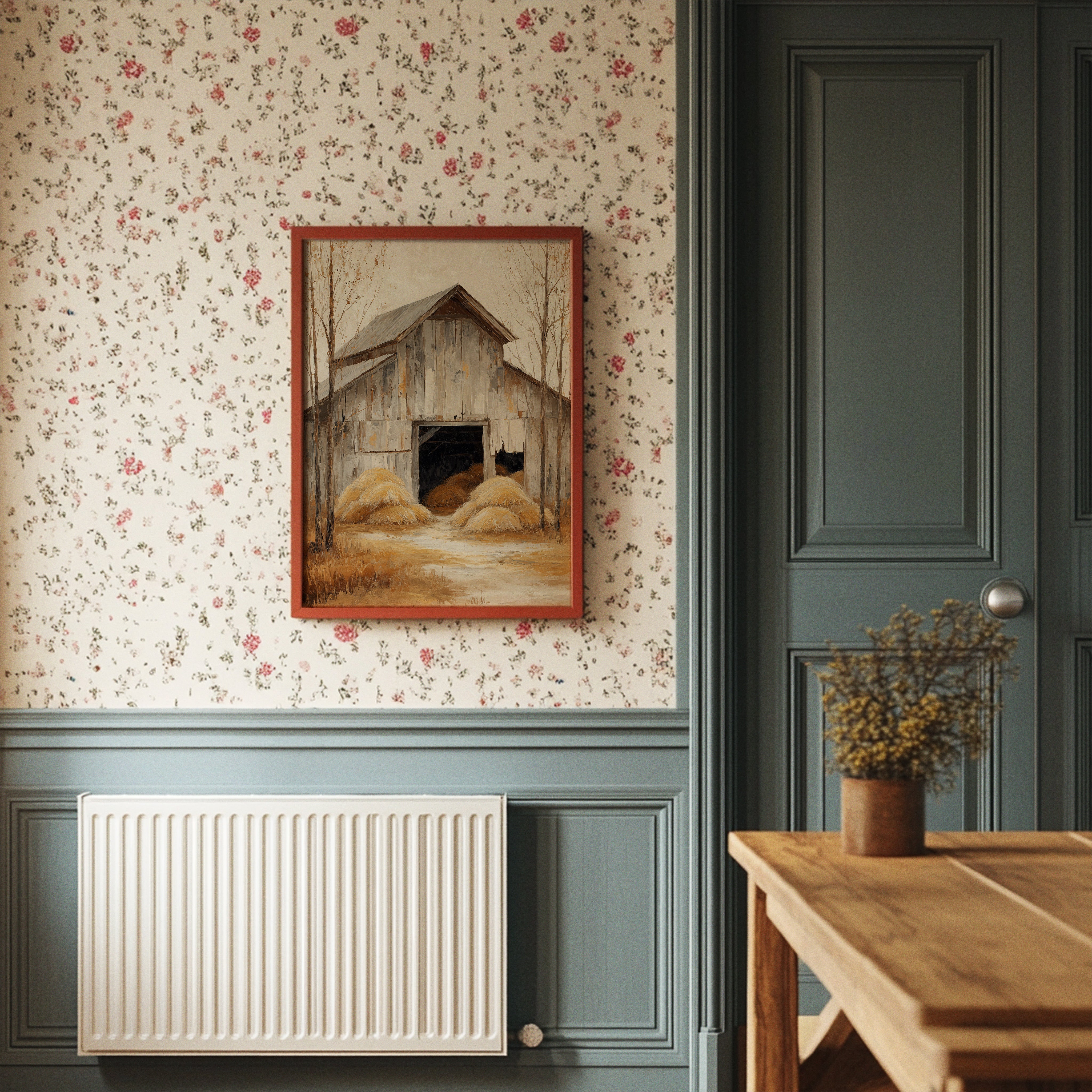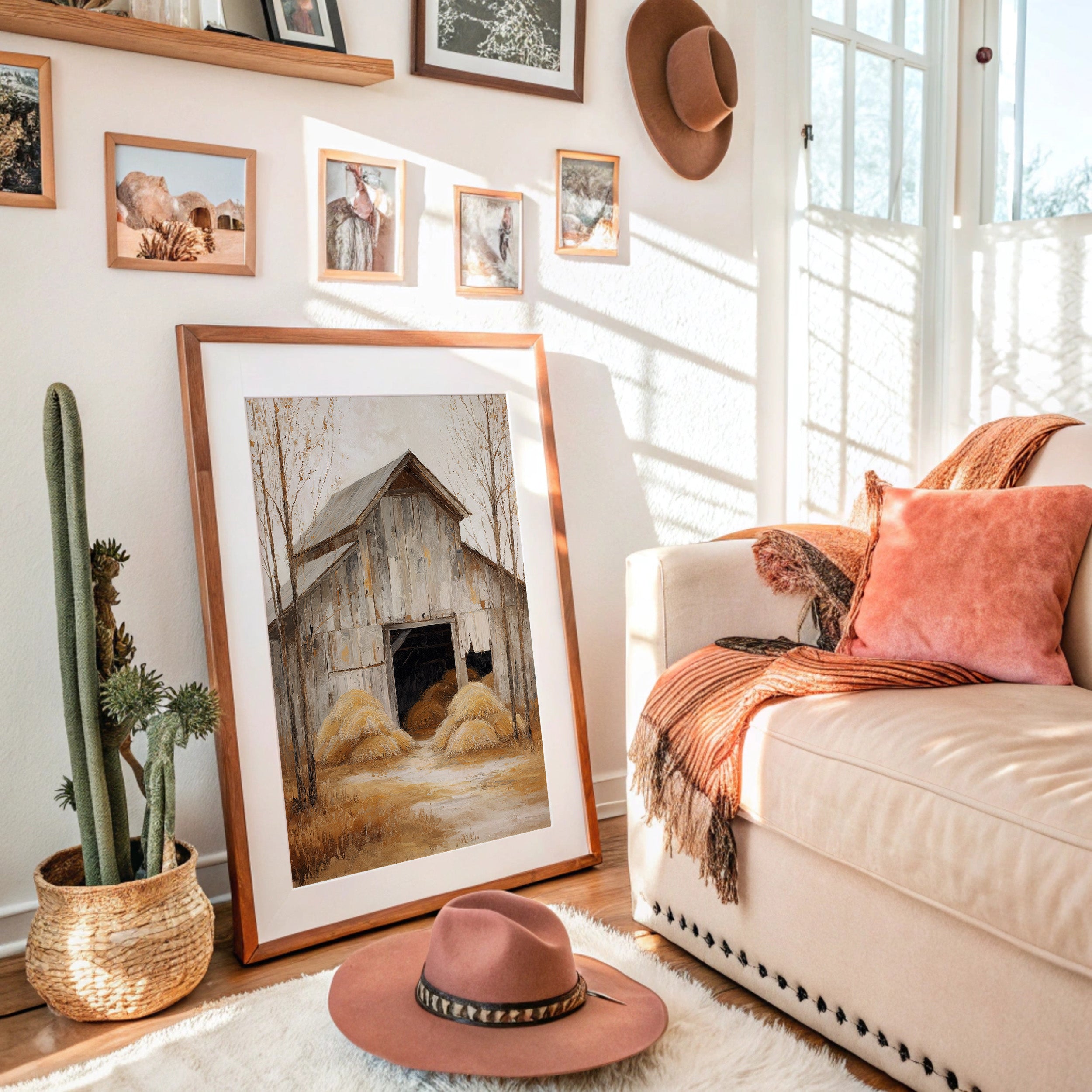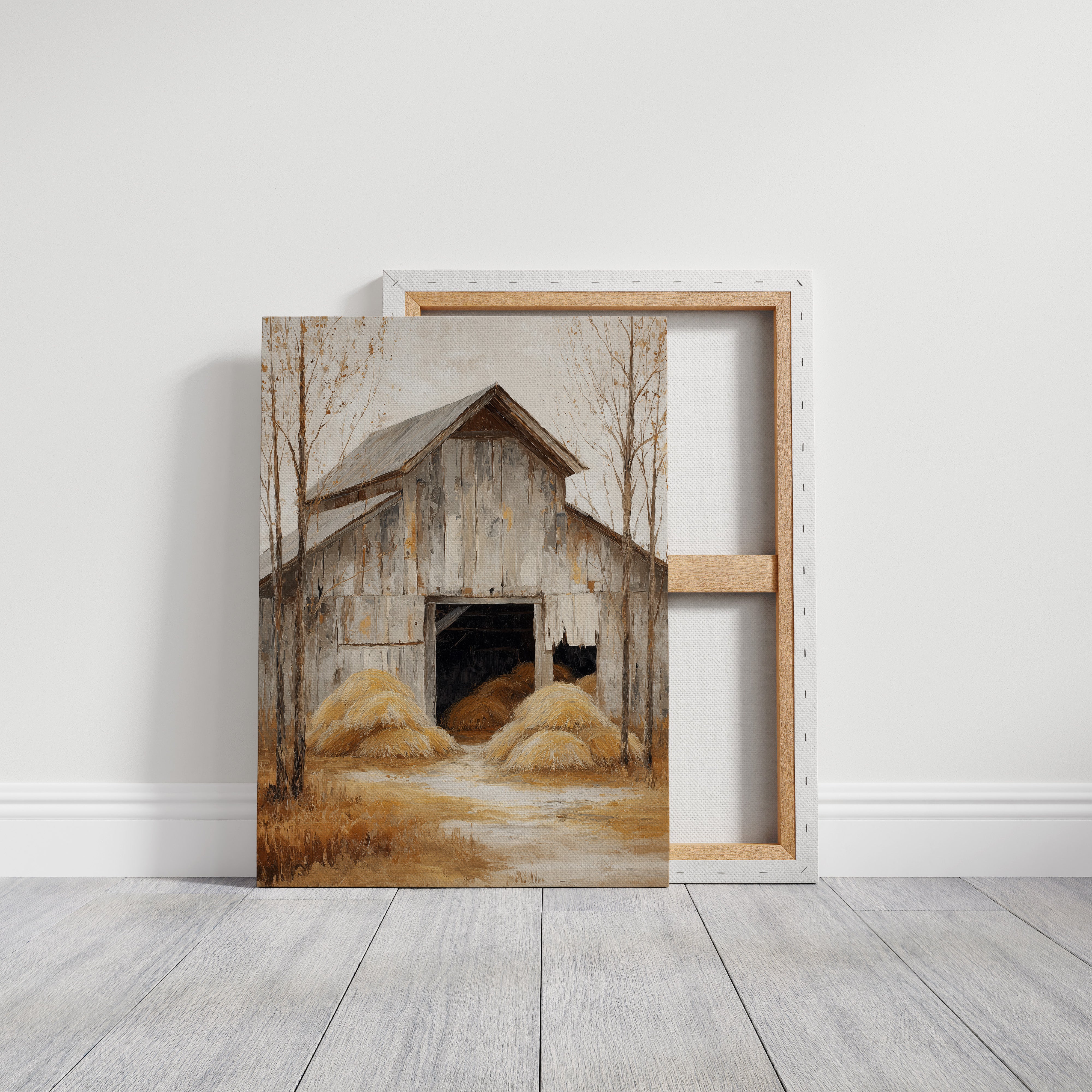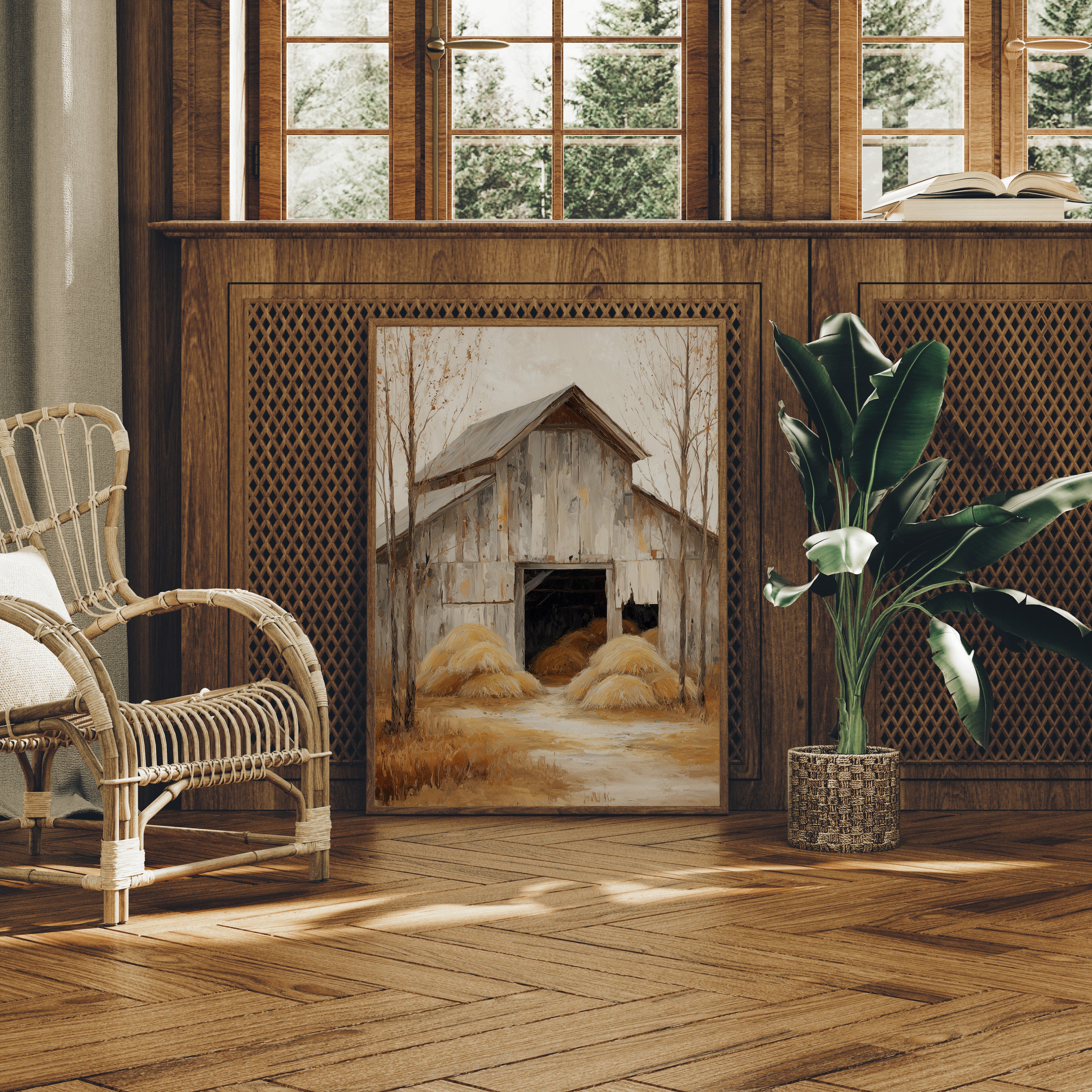 Weathered wood and golden hay create a nostalgic scene, where time seems to pause in the gentle embrace of dusk. The rustic barn stands sentinel among bare trees, its aged boards telling tales of countless harvests and changing seasons. Warm earth tones and subtle textures evoke memories of simpler times, while hints of amber light suggest stories yet untold. This piece brings rustic charm and pastoral poetry to modern living spaces, perfect for adding character to a contemporary farmhouse kitchen or bringing warmth to an industrial-style loft.
