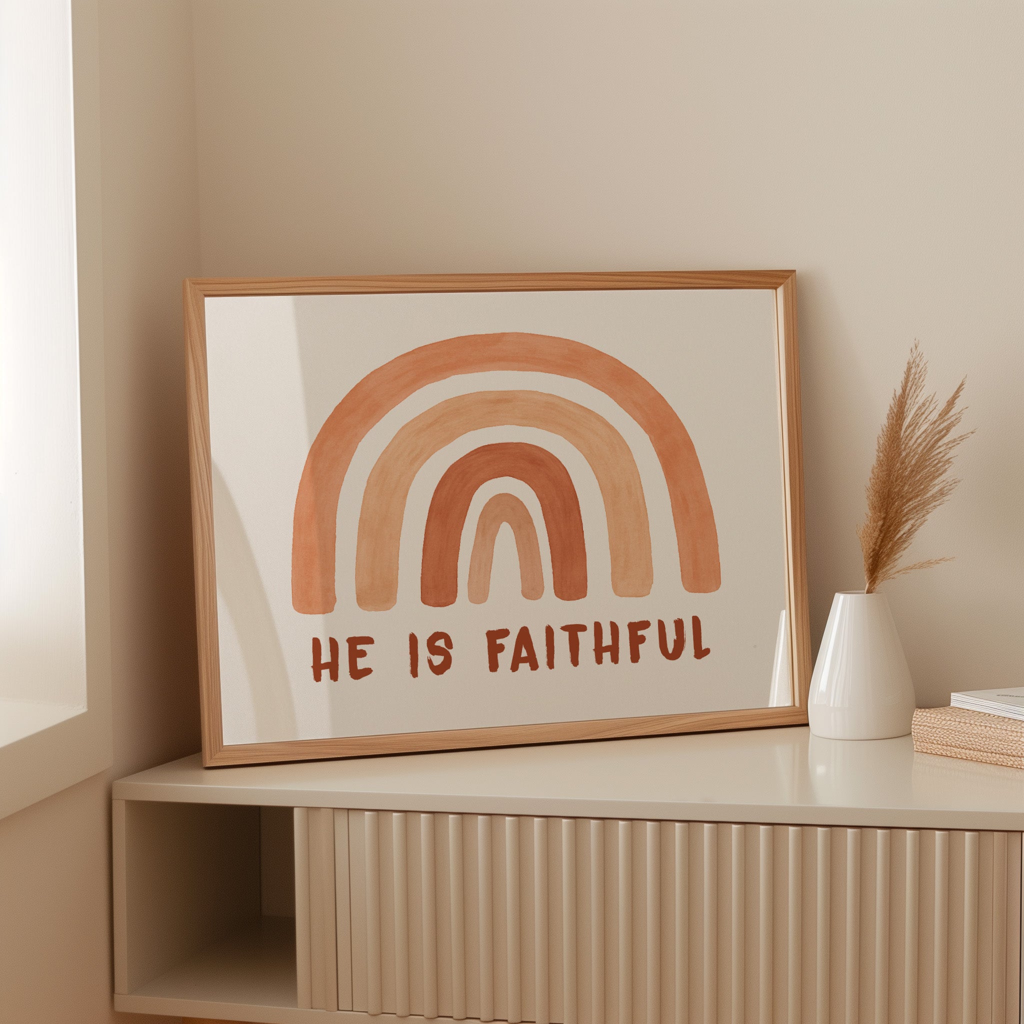 Earthy rainbow arches and a bold reminder of trust—this piece radiates warmth, hope, and the unwavering faithfulness of God in a modern boho style.