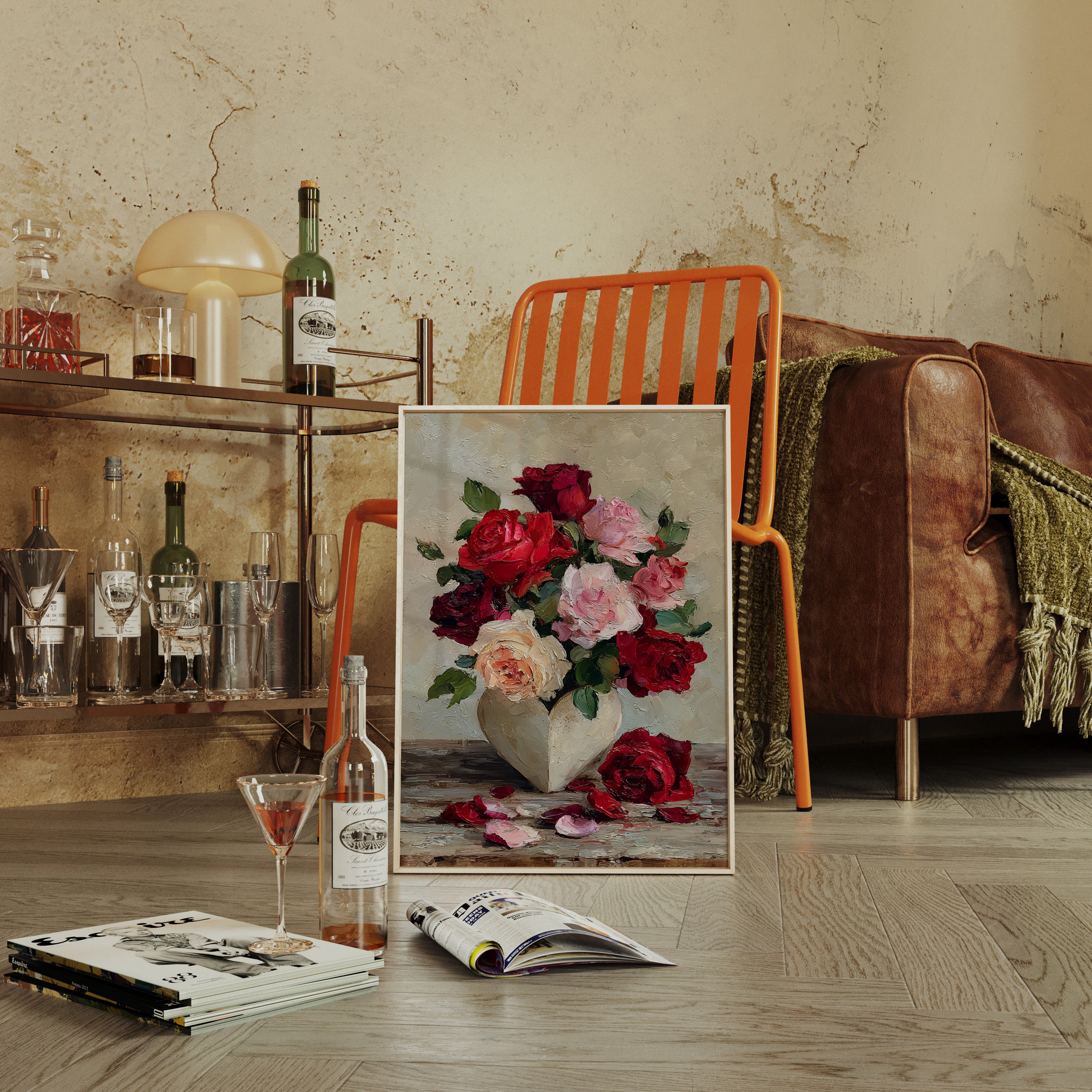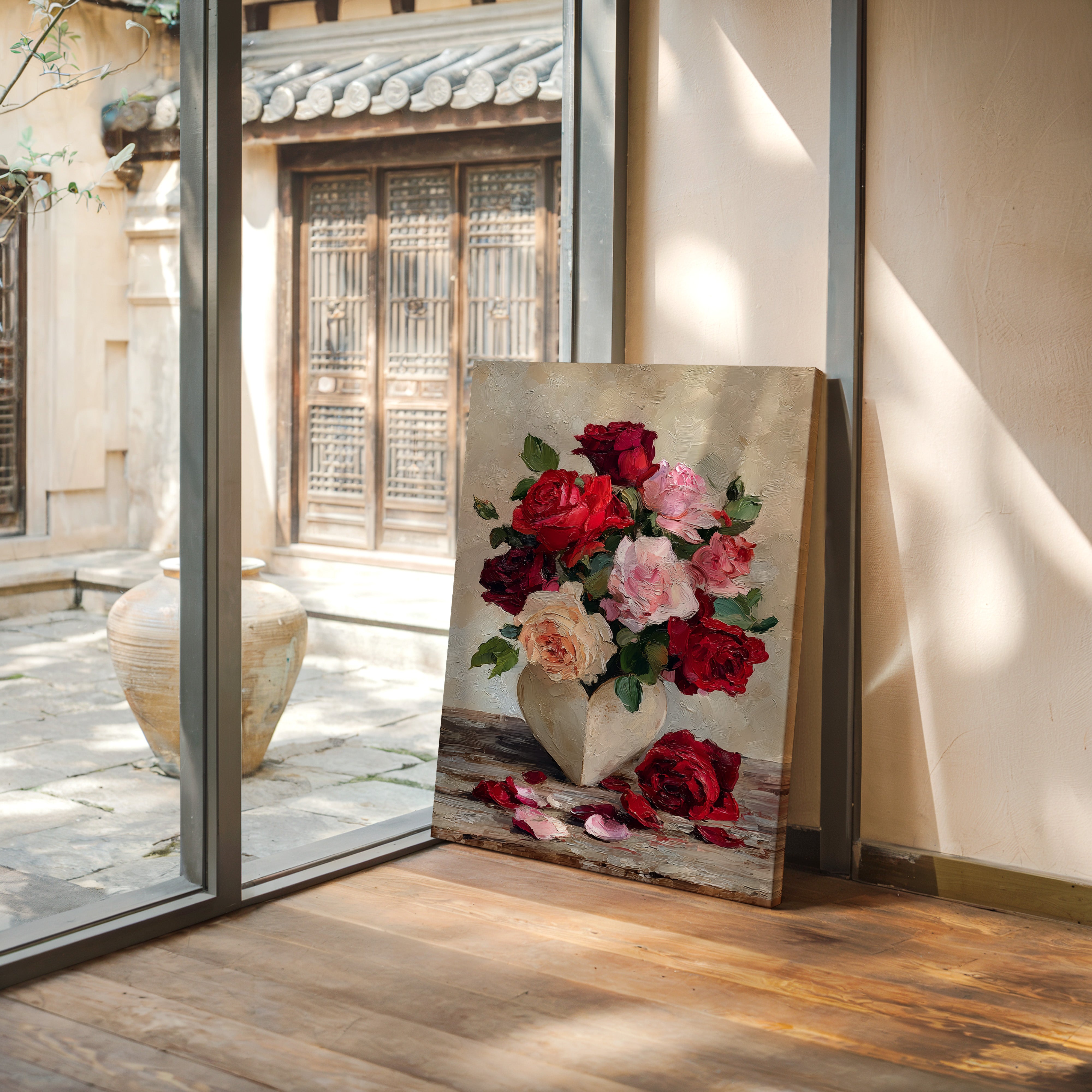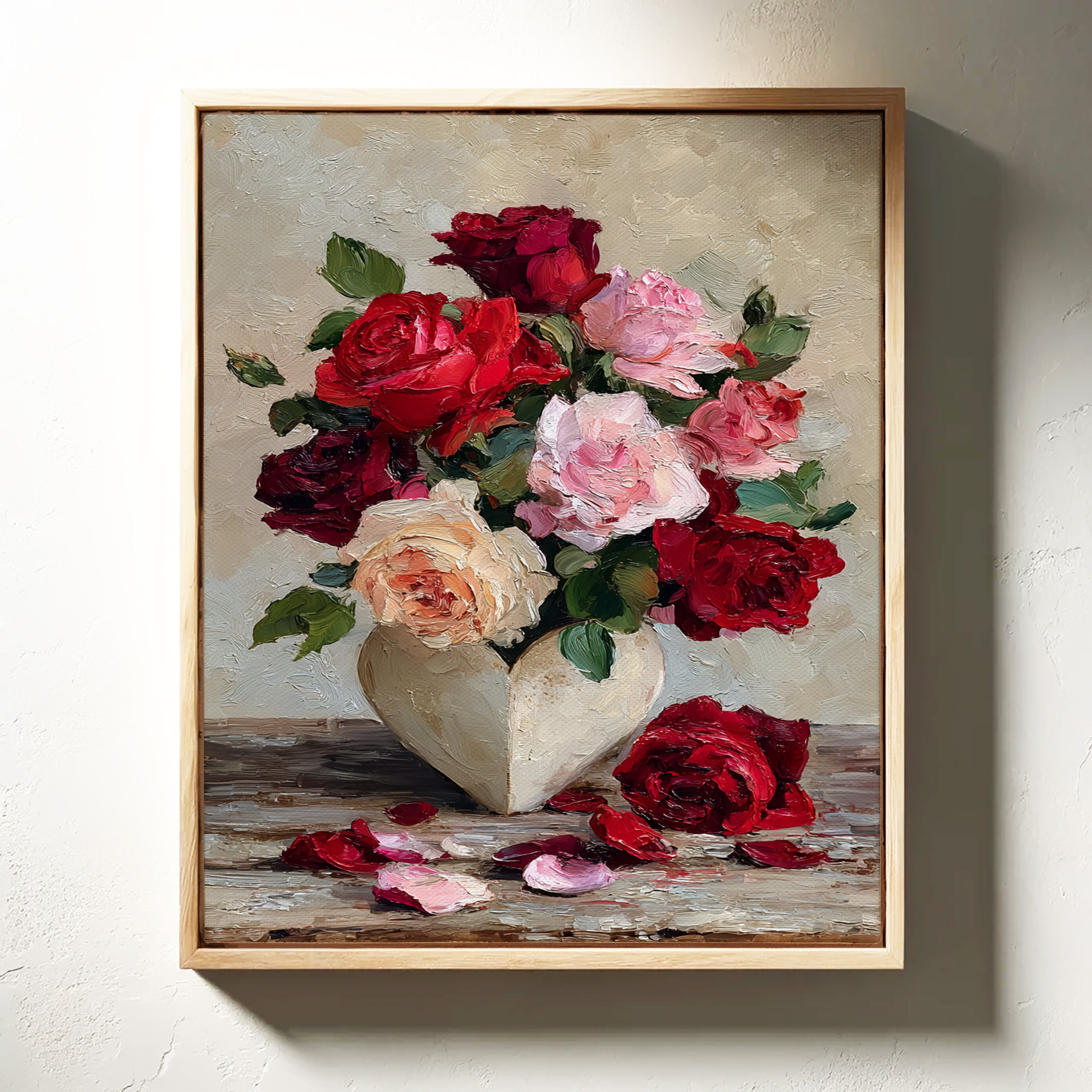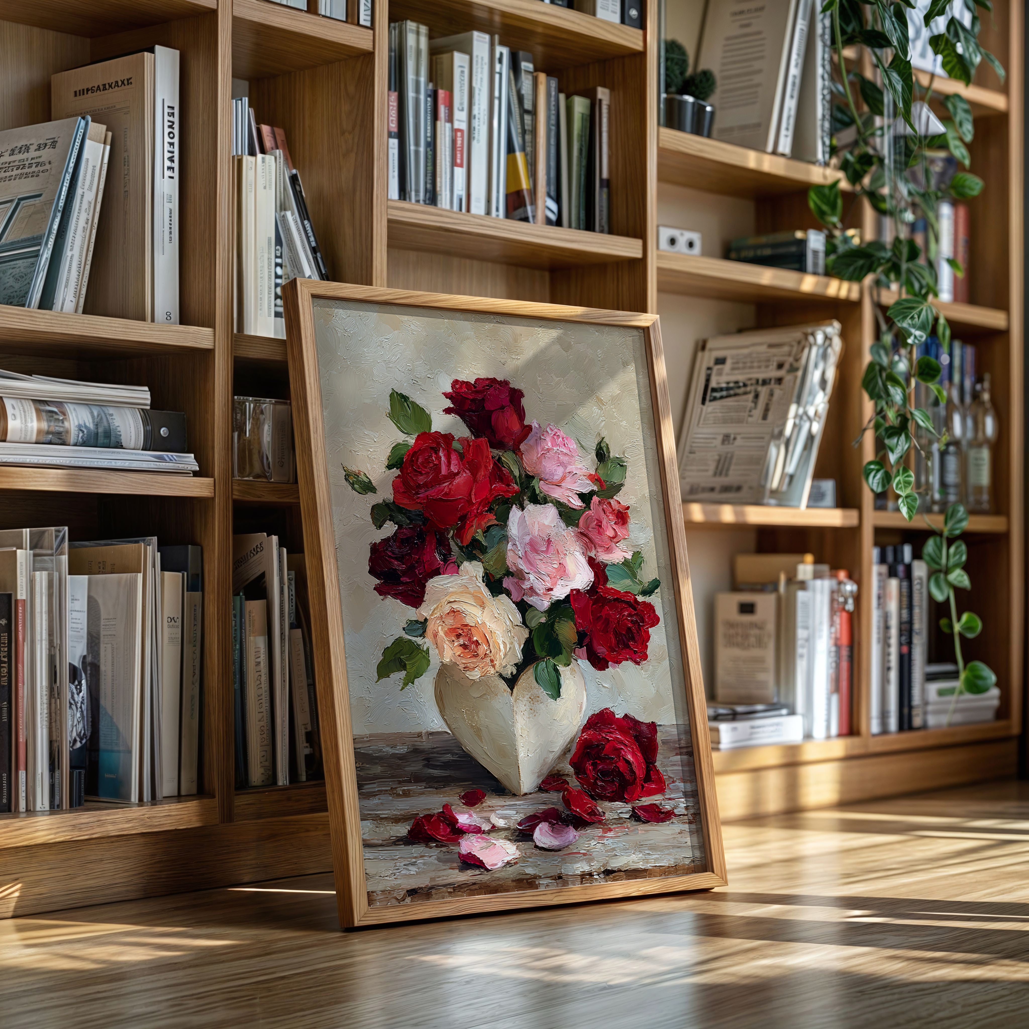 A soft afternoon light pours over a vase of blooming roses, each petal a tender testament to love and beauty. This piece embodies the artisanal spirit, celebrating the craftsmanship of nature's finest blooms. Rich reds and delicate pinks intertwine, while the textured brushstrokes evoke a sense of warmth and intimacy, inviting the viewer to linger in this floral embrace. Perfect for a cozy nook or a romantic dining space, this artwork brings life to any corner of your home.