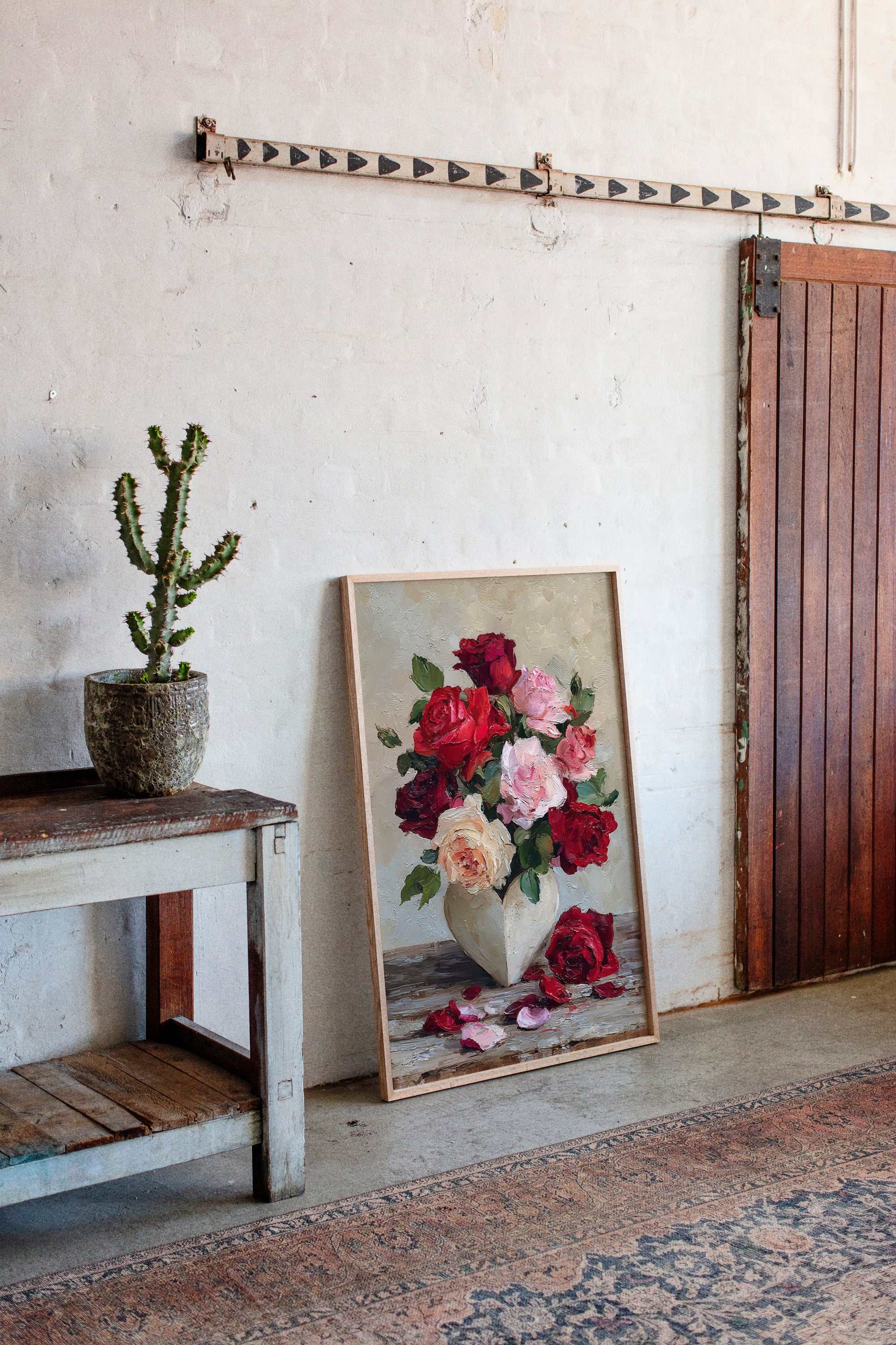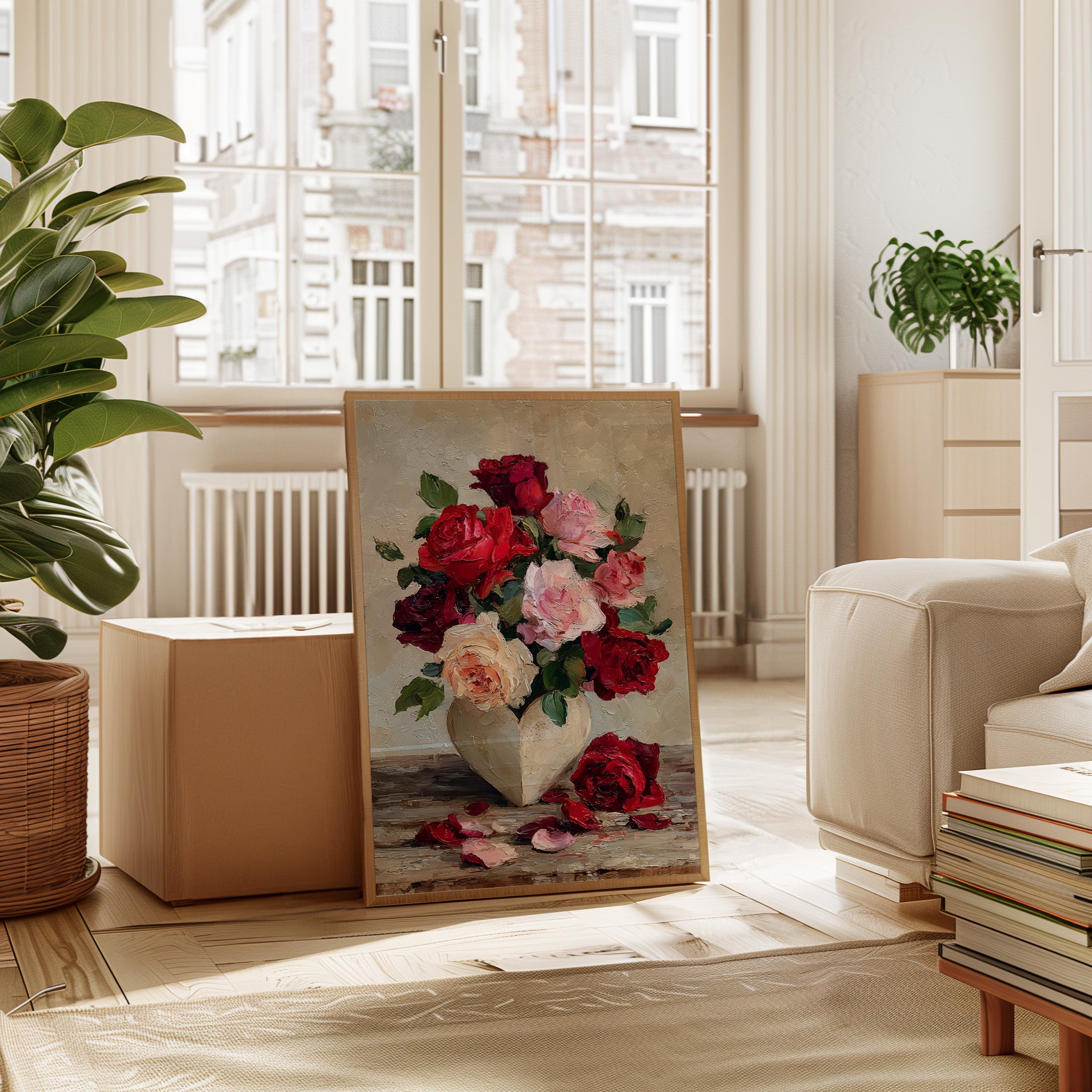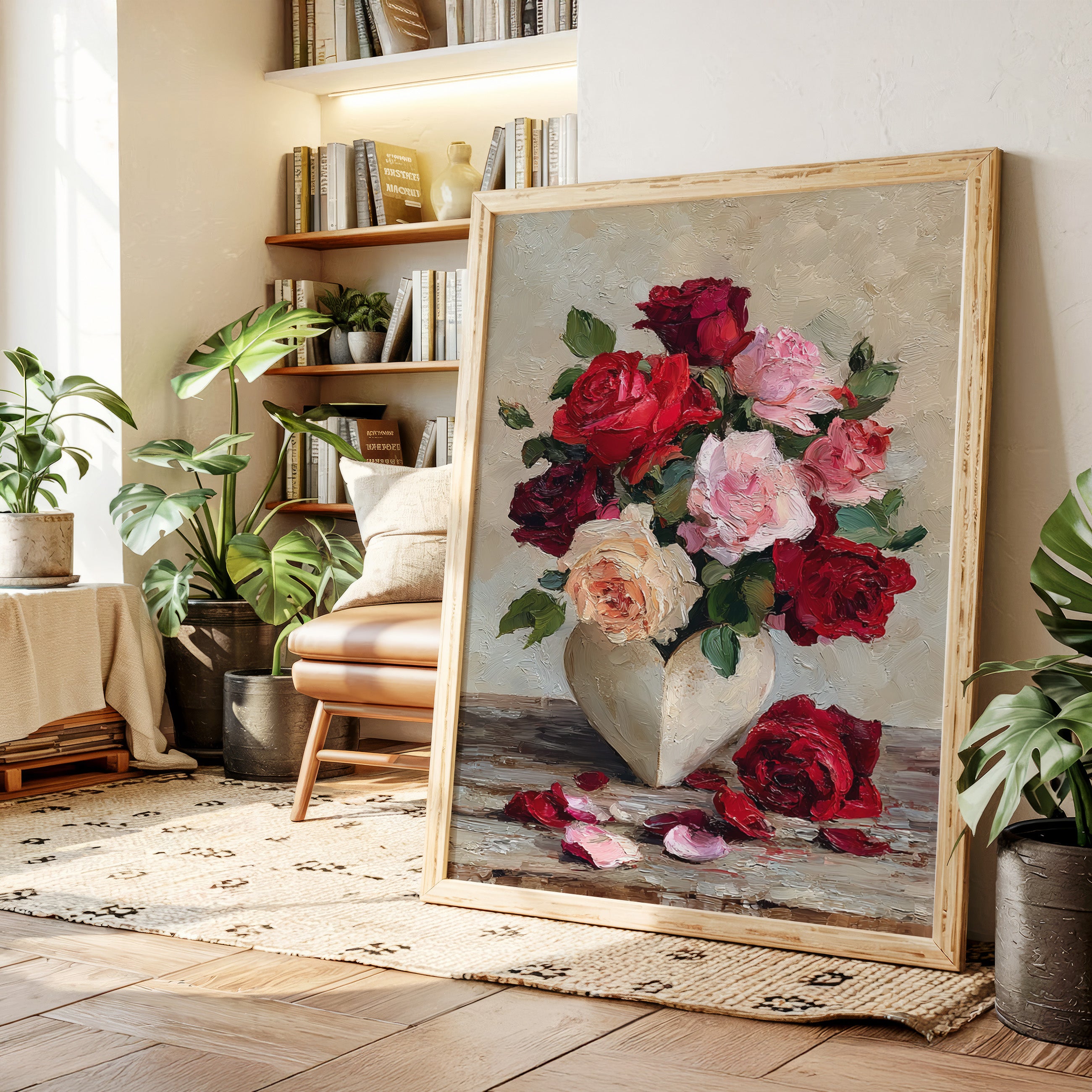 A soft afternoon light pours over a vase of blooming roses, each petal a tender testament to love and beauty. This piece embodies the artisanal spirit, celebrating the craftsmanship of nature's finest blooms. Rich reds and delicate pinks intertwine, while the textured brushstrokes evoke a sense of warmth and intimacy, inviting the viewer to linger in this floral embrace. Perfect for a cozy nook or a romantic dining space, this artwork brings life to any corner of your home.