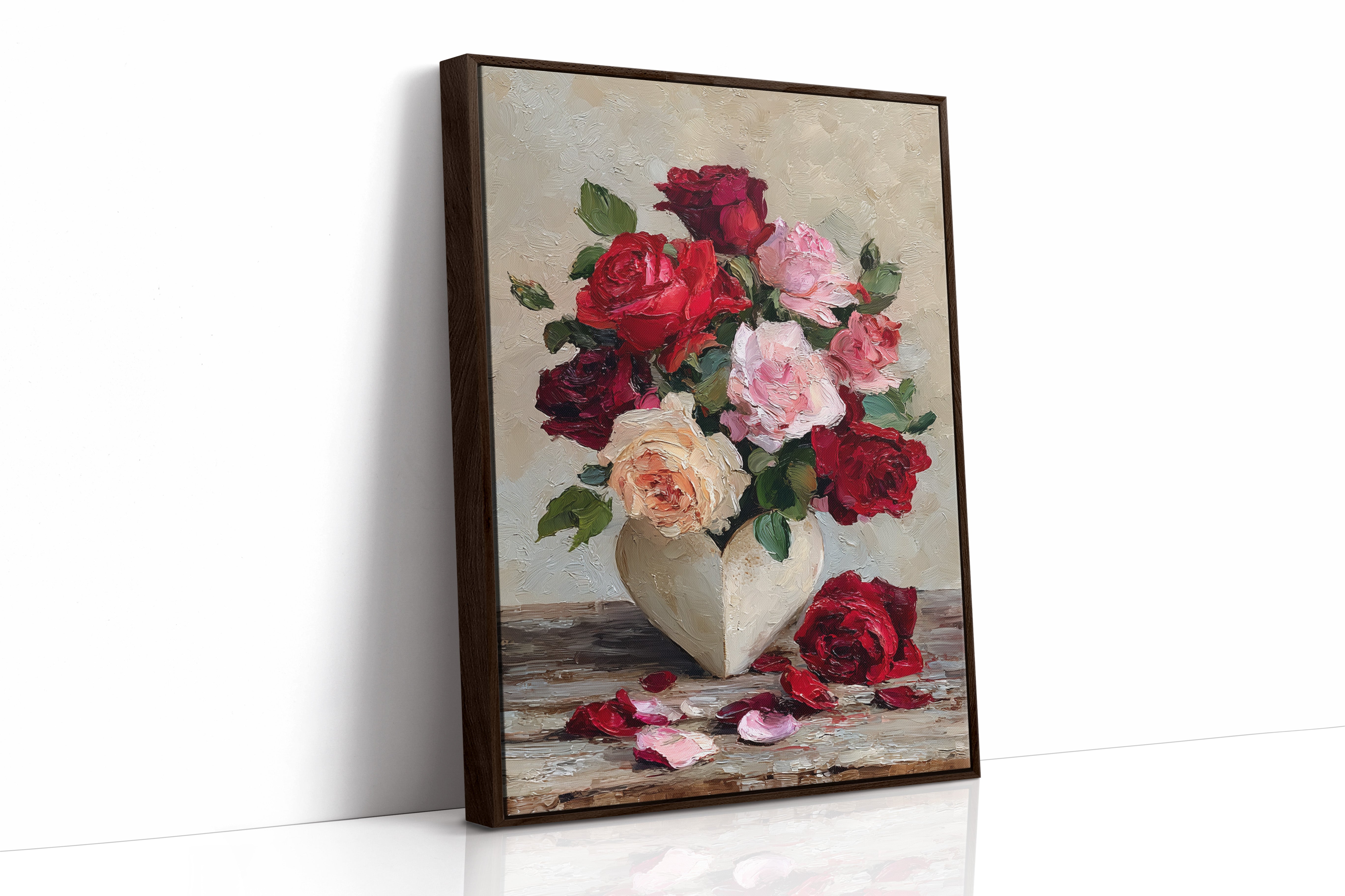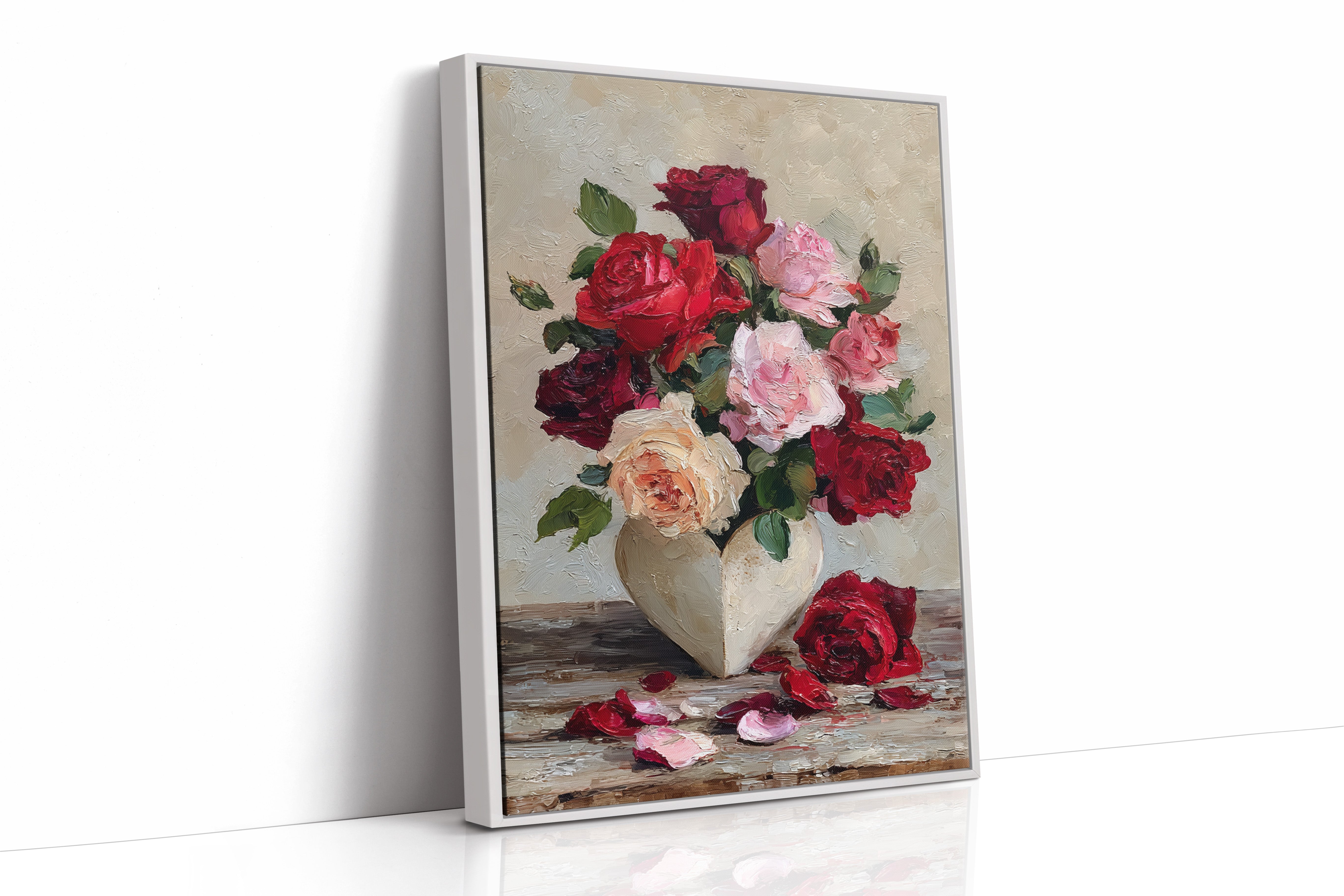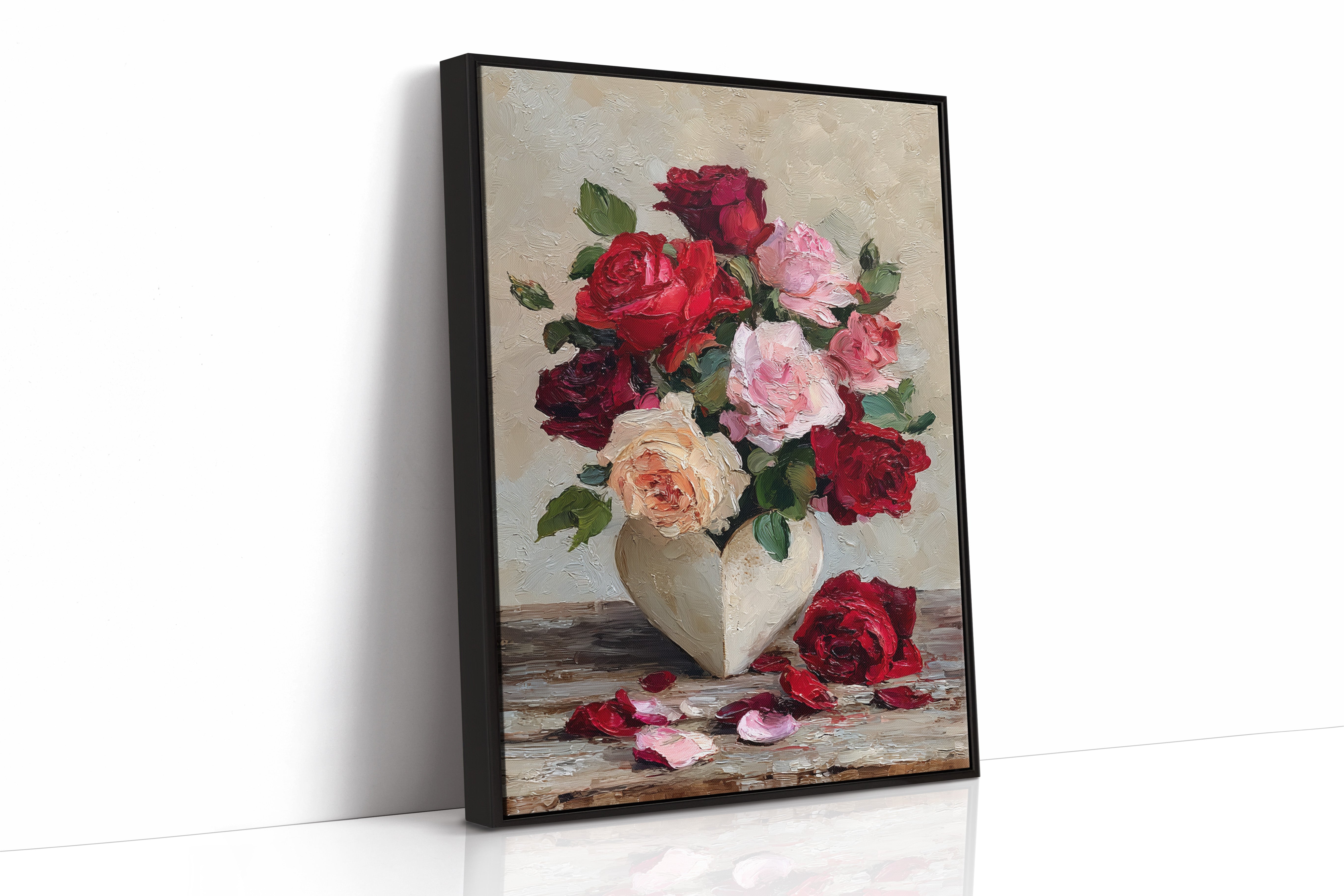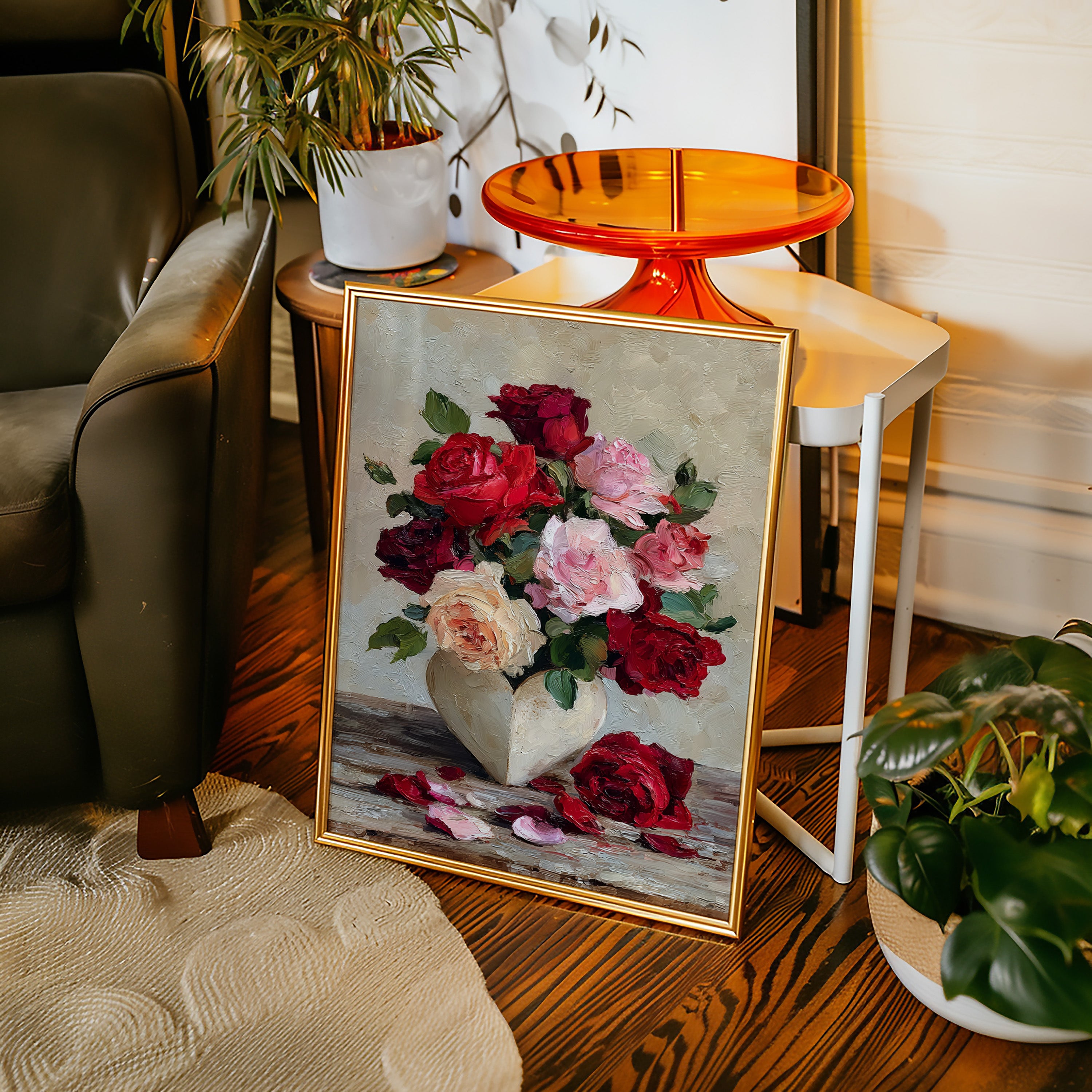 A soft afternoon light pours over a vase of blooming roses, each petal a tender testament to love and beauty. This piece embodies the artisanal spirit, celebrating the craftsmanship of nature's finest blooms. Rich reds and delicate pinks intertwine, while the textured brushstrokes evoke a sense of warmth and intimacy, inviting the viewer to linger in this floral embrace. Perfect for a cozy nook or a romantic dining space, this artwork brings life to any corner of your home.