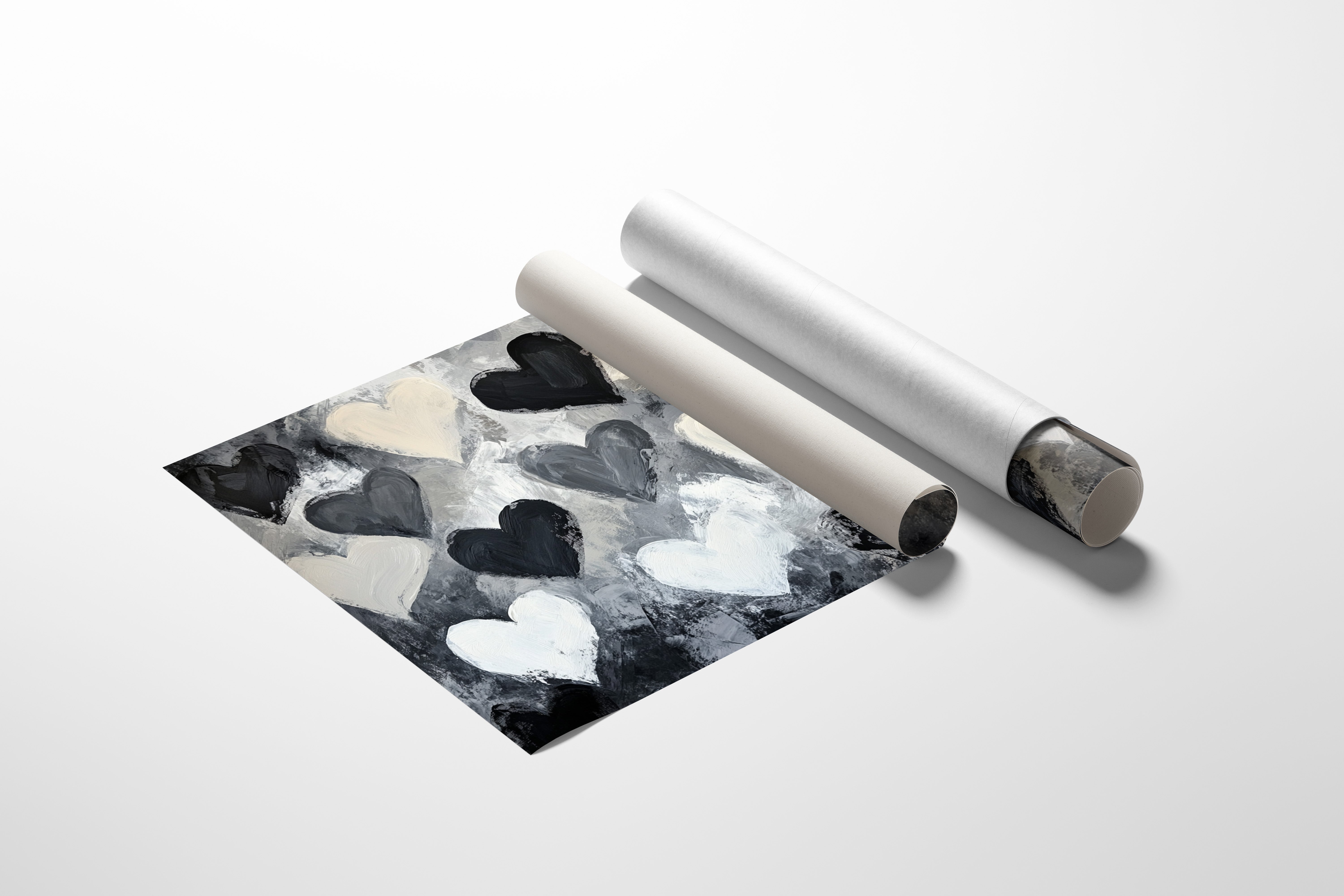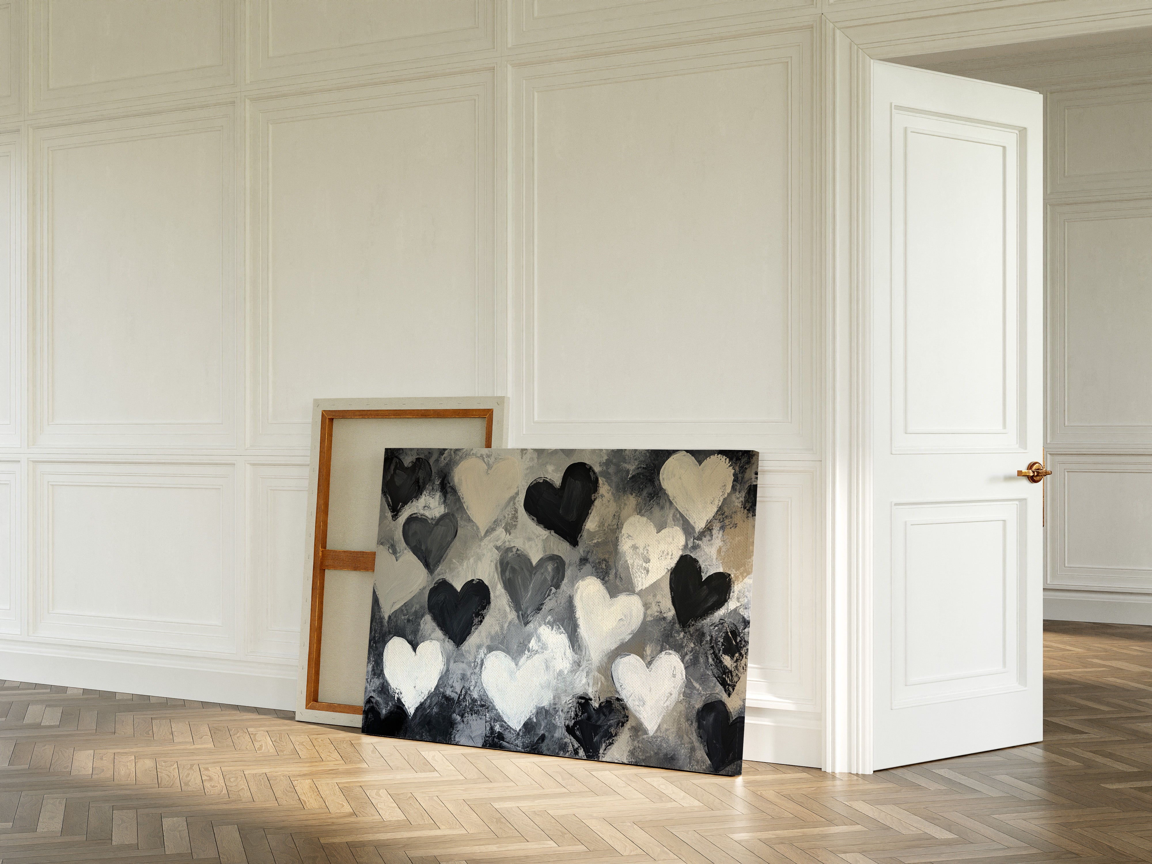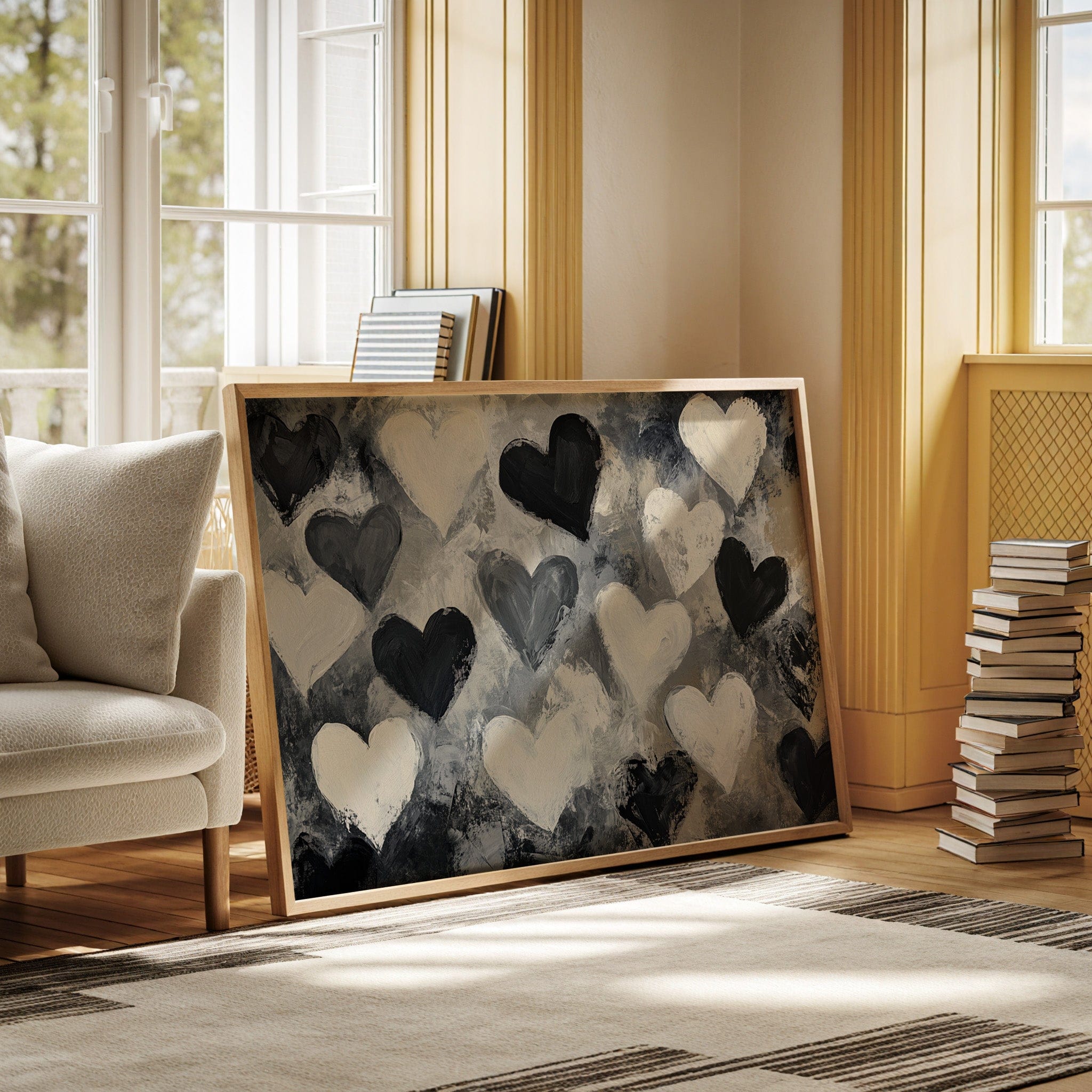 Brushstrokes sweep across the canvas in a delicate dance of black and white hearts, each one telling its own story through texture and shadow. The hearts float like scattered memories against a stormy grey backdrop, their edges soft yet deliberate, creating a symphony of emotion in neutral tones. The contrast between light and dark hearts creates a compelling visual rhythm, while textured overlays add depth and movement to each shape. This piece would bring sophisticated romance to a modern bedroom or add artistic flair to a minimalist living space.
