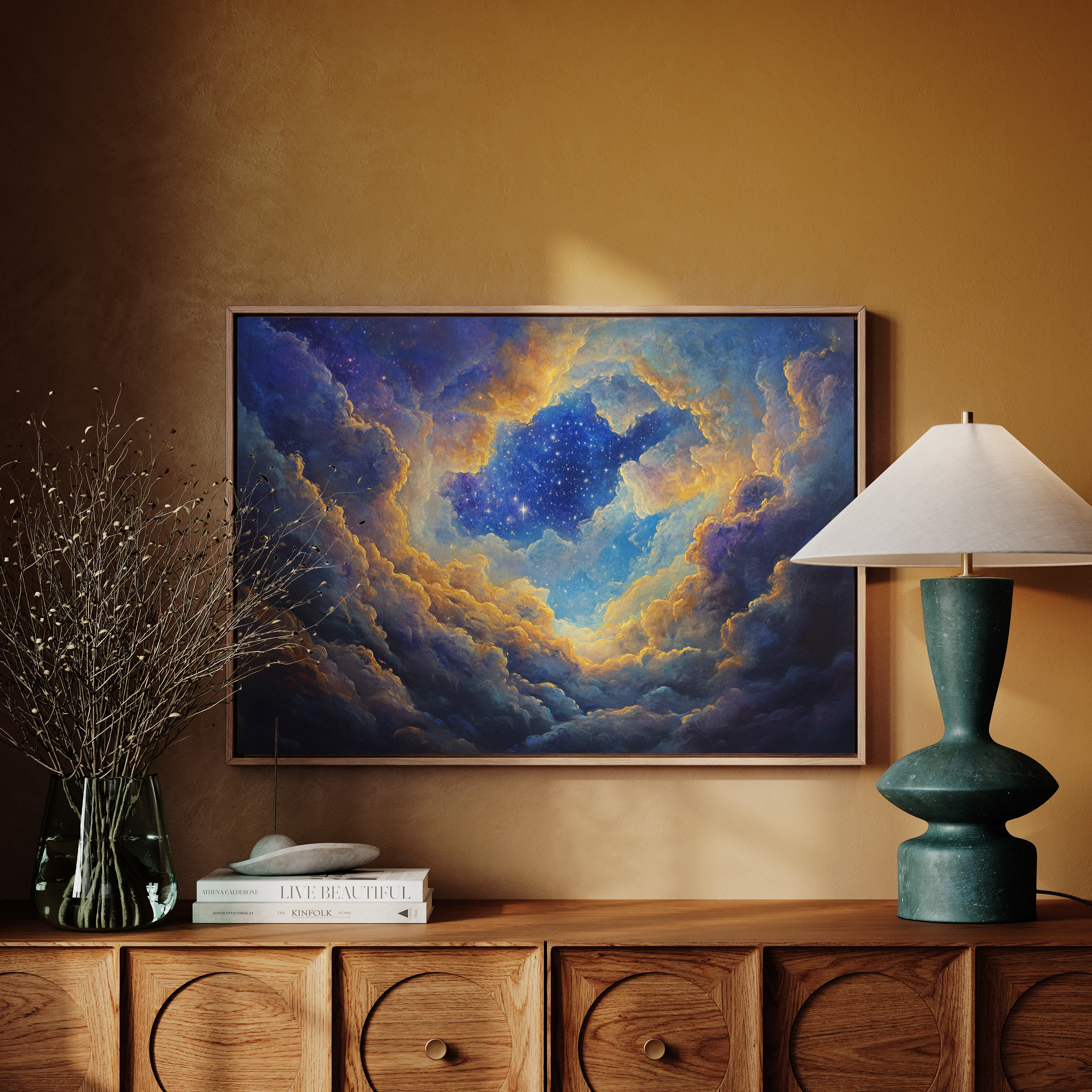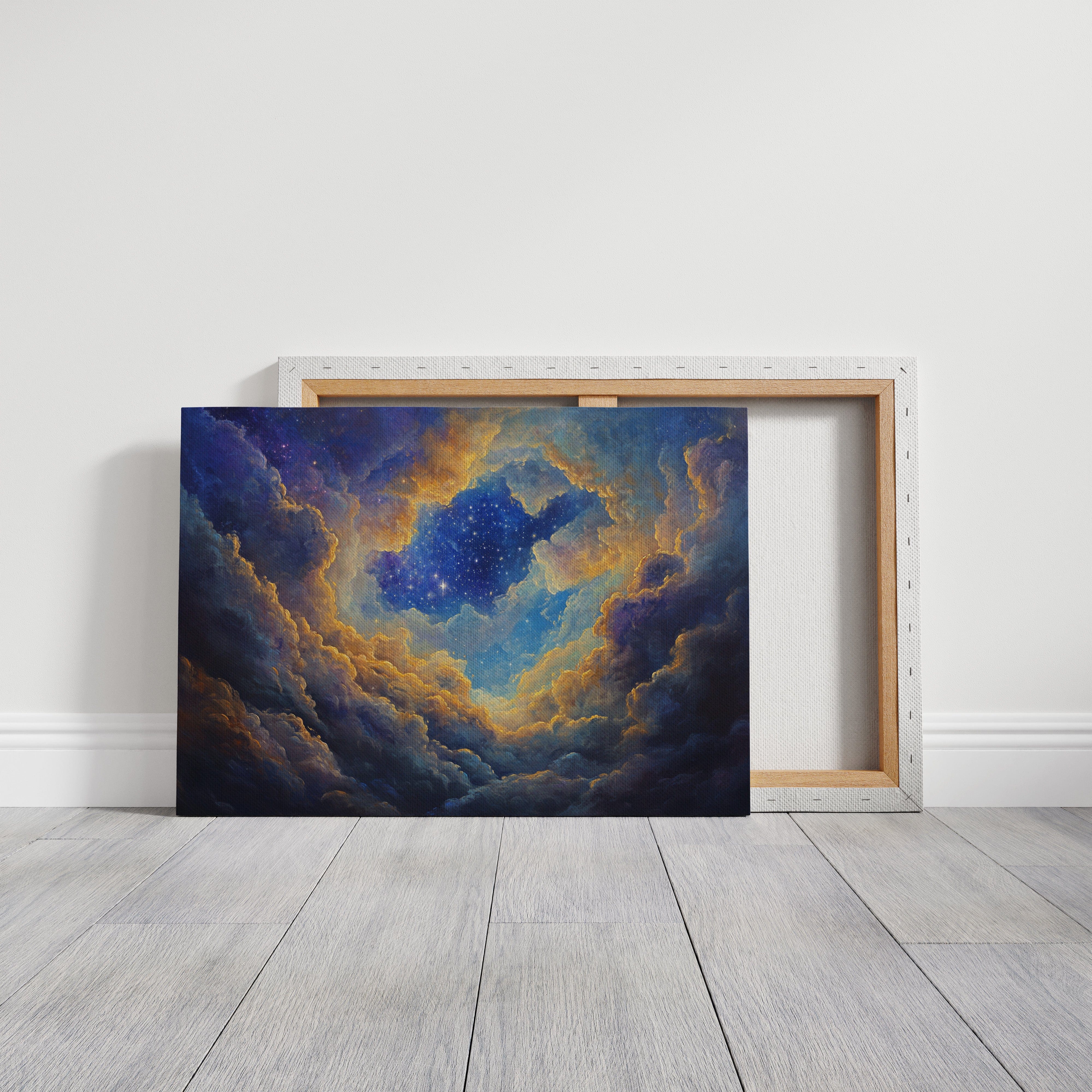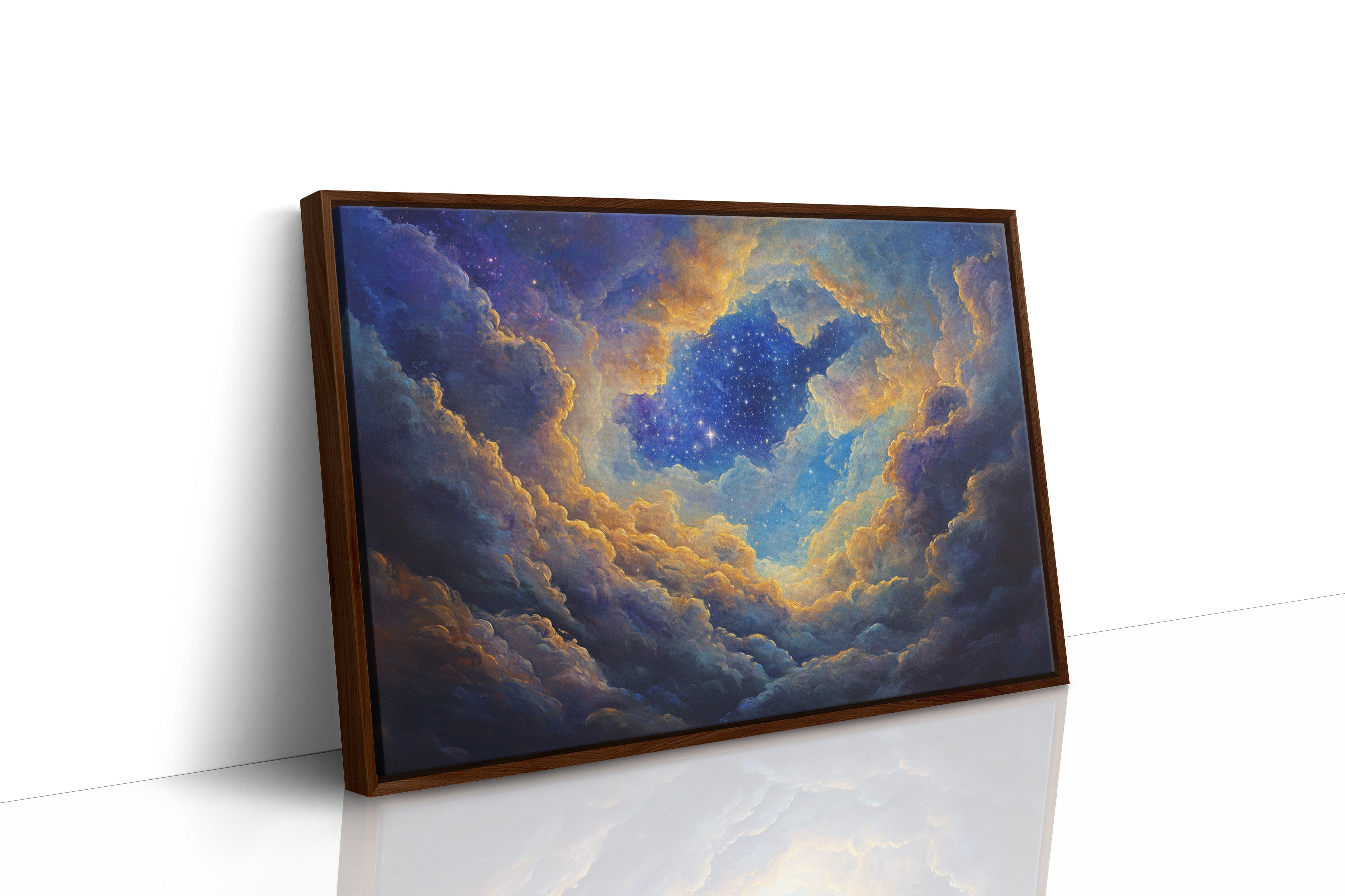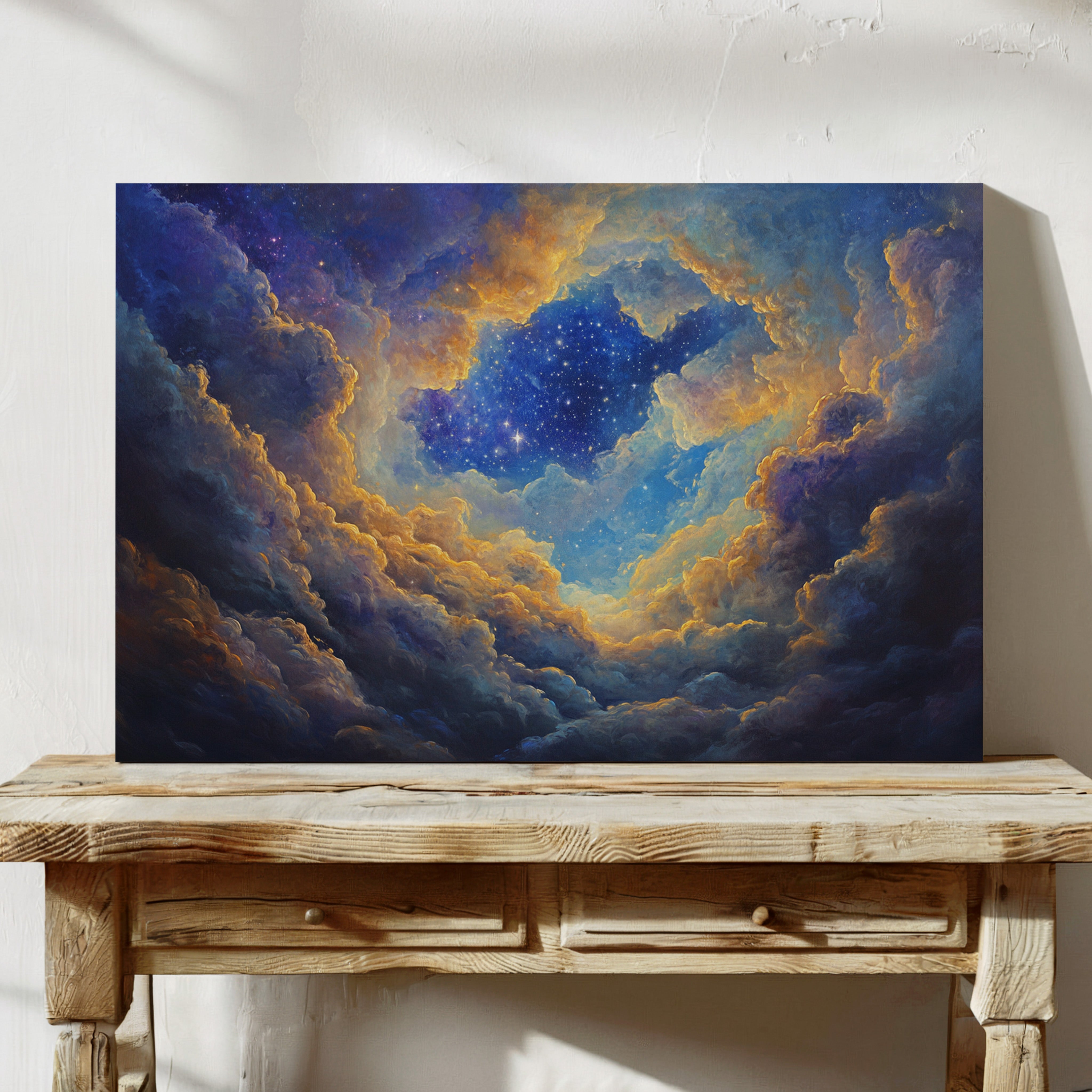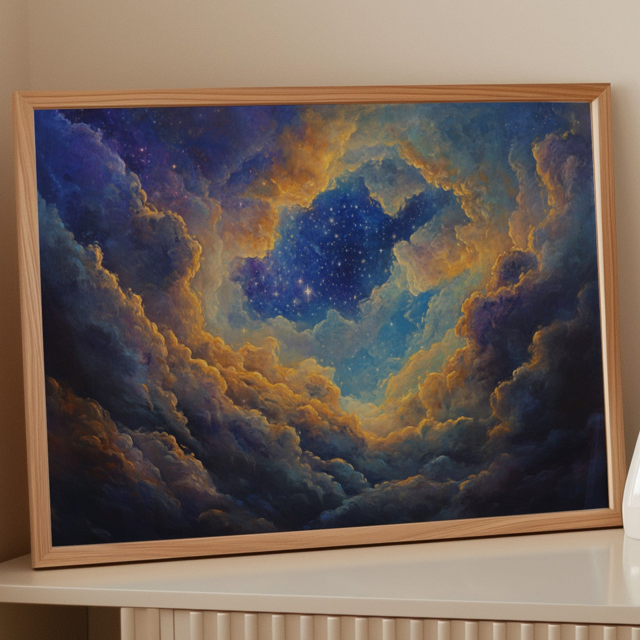 Billowing clouds part to reveal a celestial window, where golden light spills across the evening sky. Majestic storm clouds frame a heart-shaped opening, offering a glimpse into the infinite cosmos dotted with brilliant stars. Deep blues melt into warm amber hues, creating a dramatic dance between light and shadow, while delicate wisps of clouds catch the last rays of sunlight. This ethereal scene captures the moment where earthly boundaries dissolve into celestial wonder. Perfect for meditation rooms or bedroom spaces where dreams take flight, this piece invites contemplation of life's greater mysteries.
