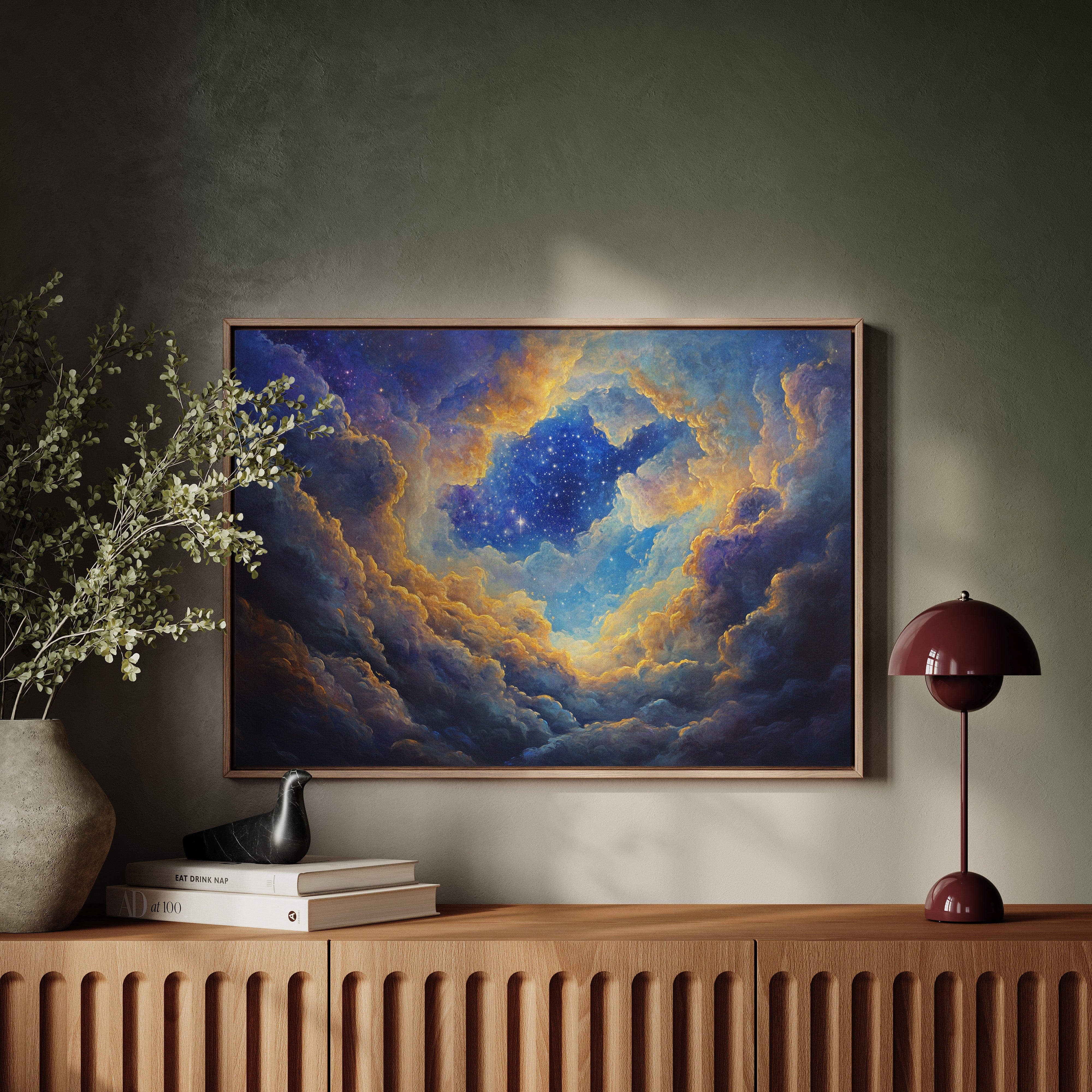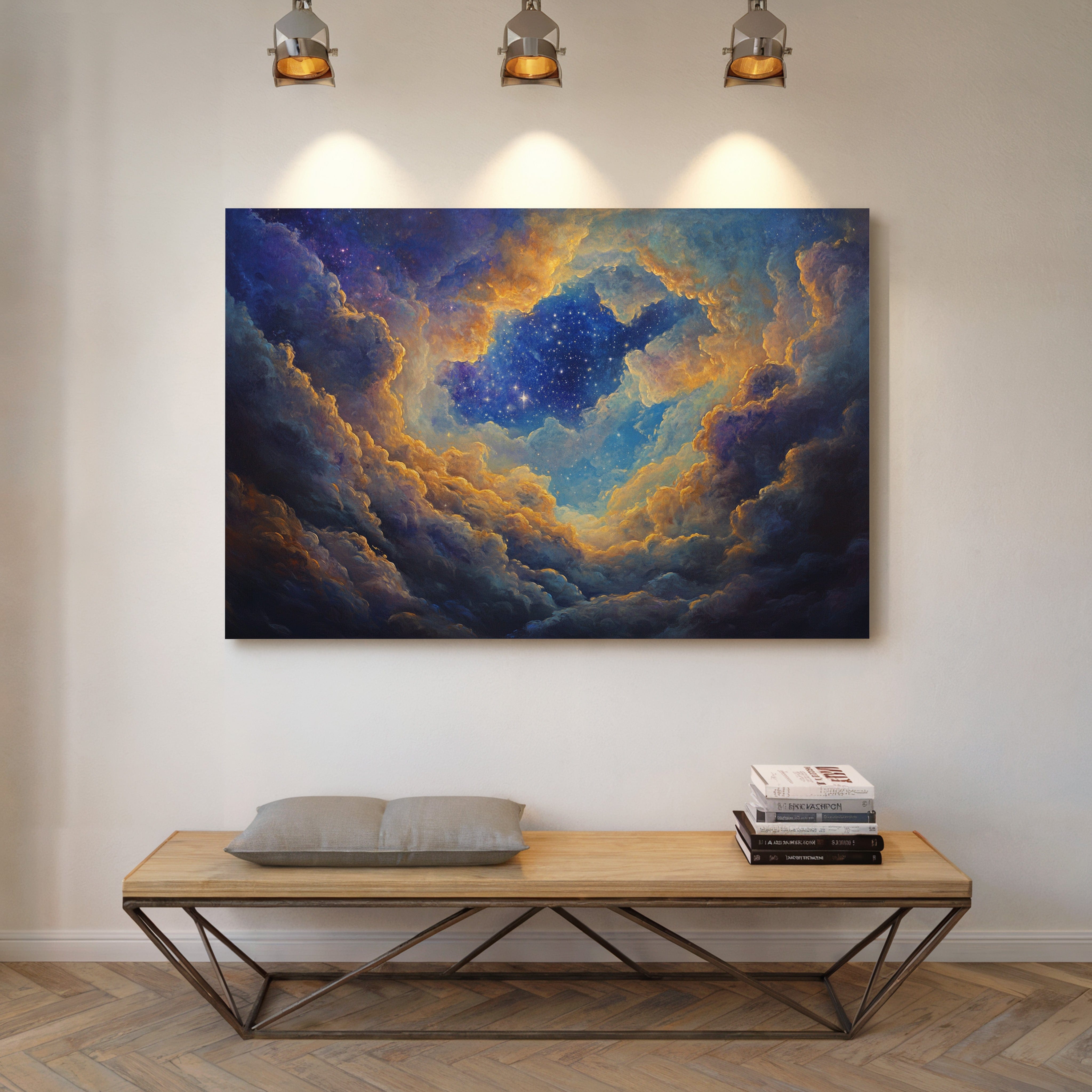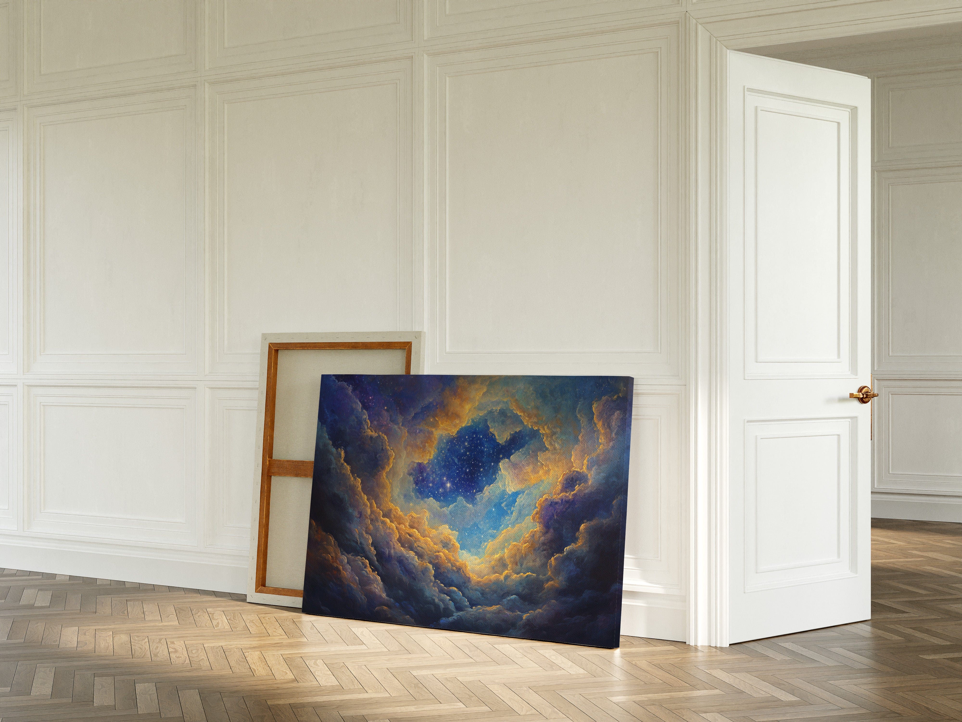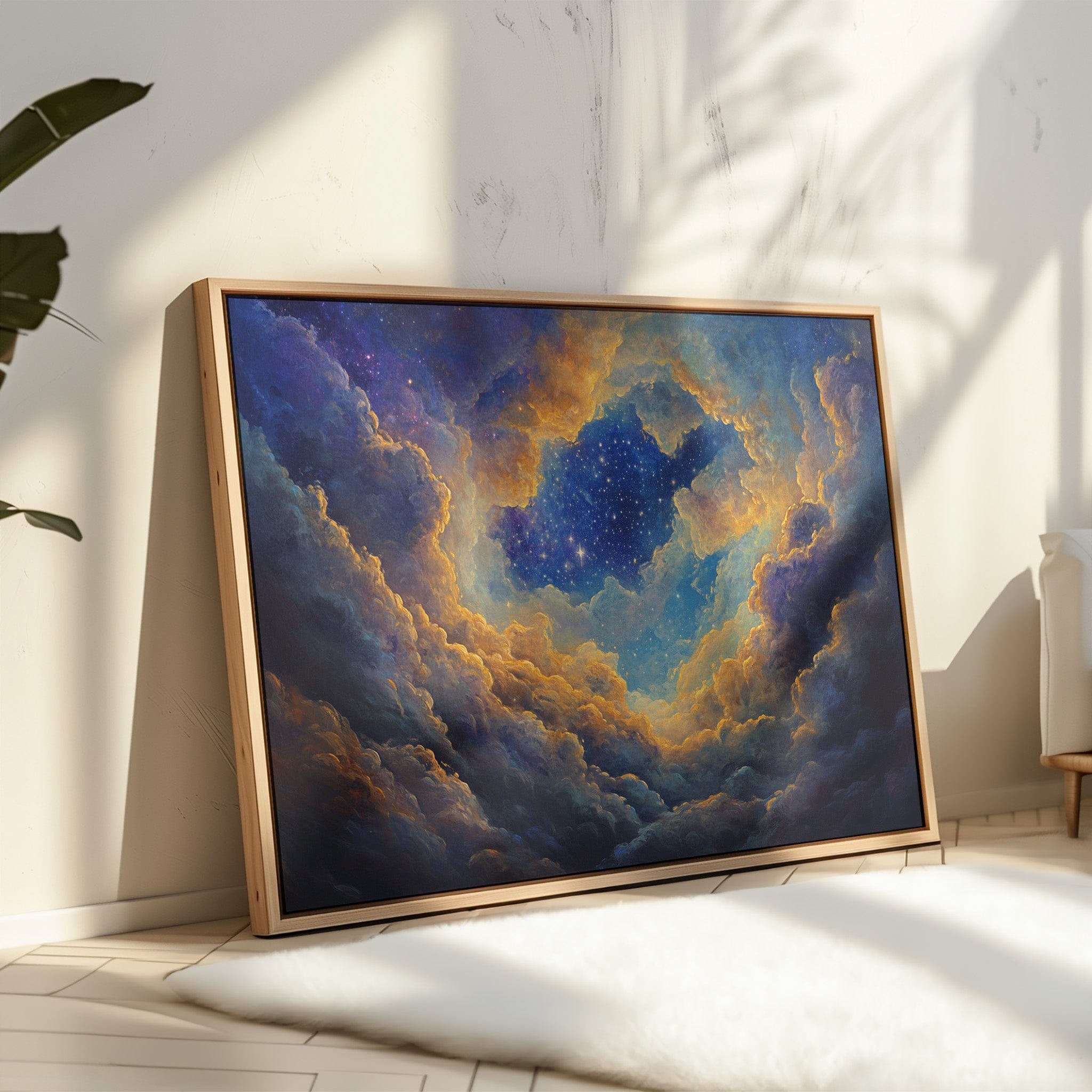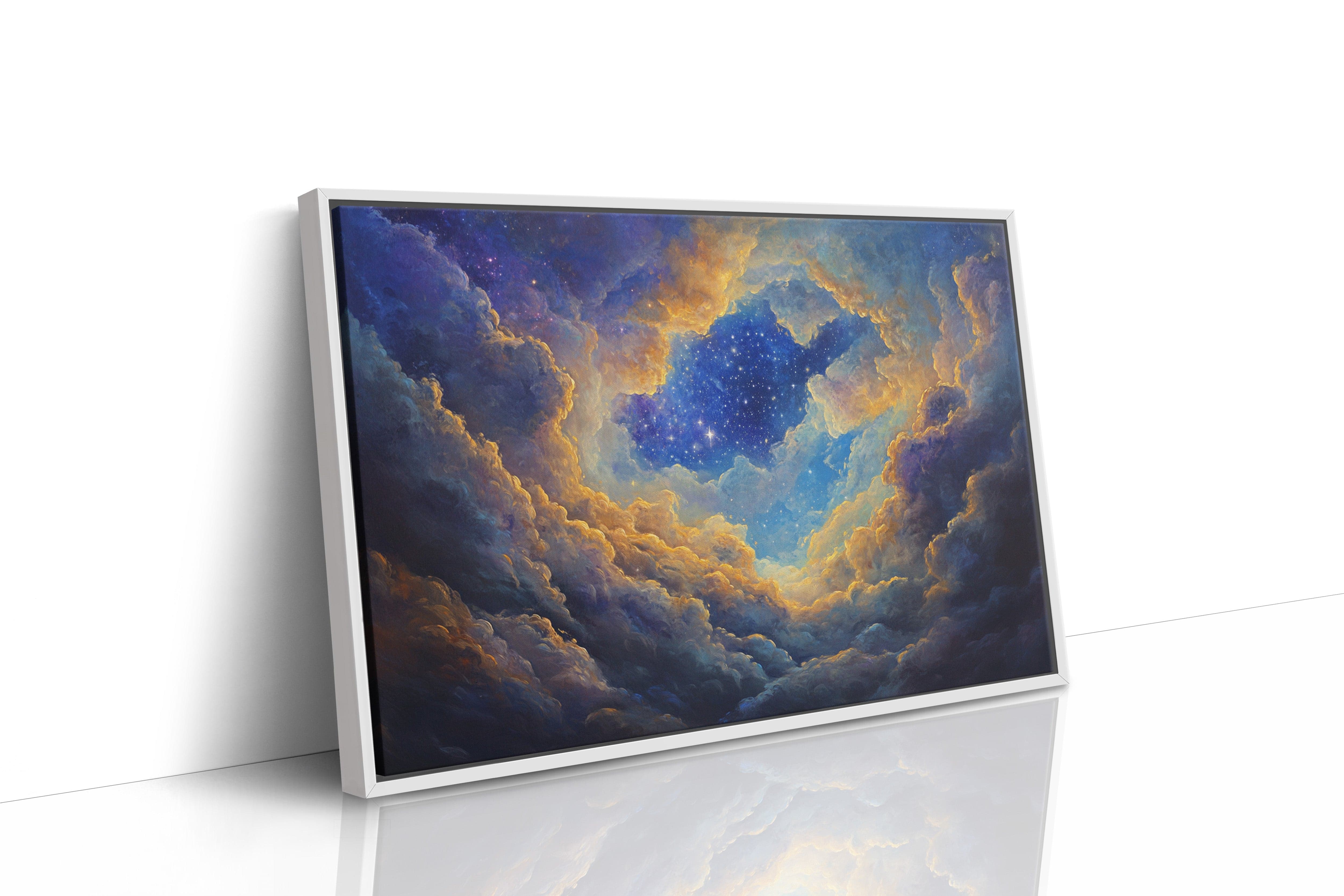 Billowing clouds part to reveal a celestial window, where golden light spills across the evening sky. Majestic storm clouds frame a heart-shaped opening, offering a glimpse into the infinite cosmos dotted with brilliant stars. Deep blues melt into warm amber hues, creating a dramatic dance between light and shadow, while delicate wisps of clouds catch the last rays of sunlight. This ethereal scene captures the moment where earthly boundaries dissolve into celestial wonder. Perfect for meditation rooms or bedroom spaces where dreams take flight, this piece invites contemplation of life's greater mysteries.