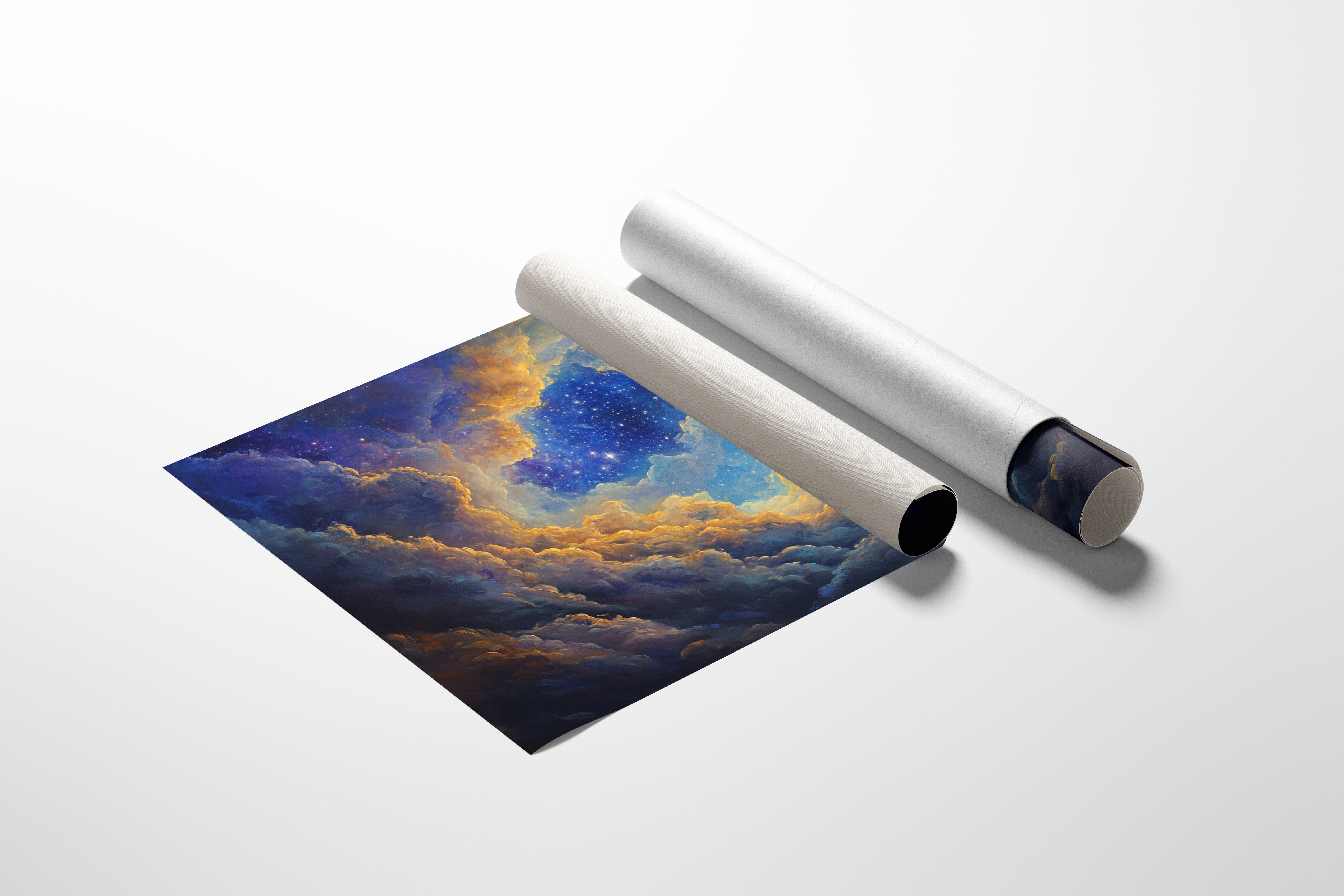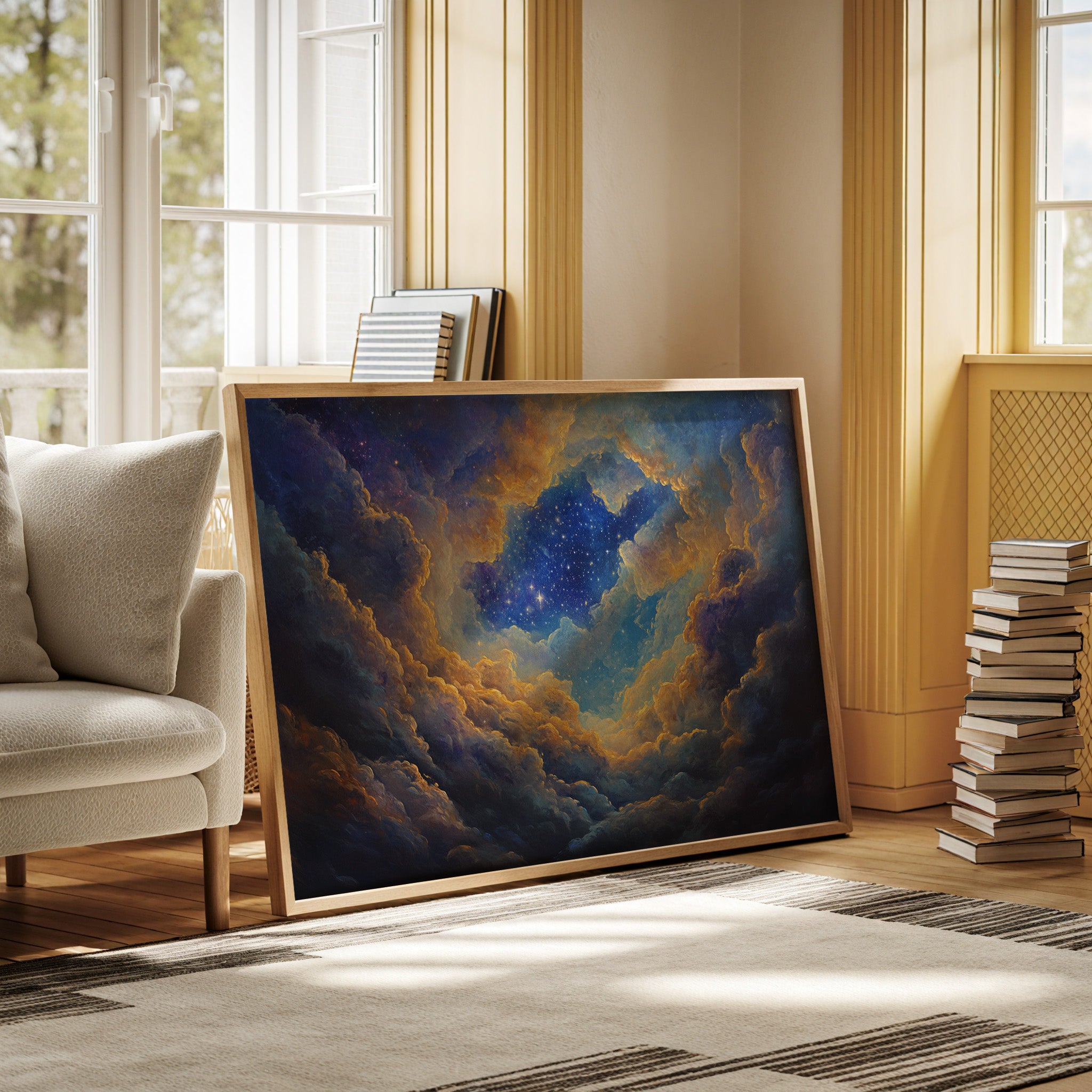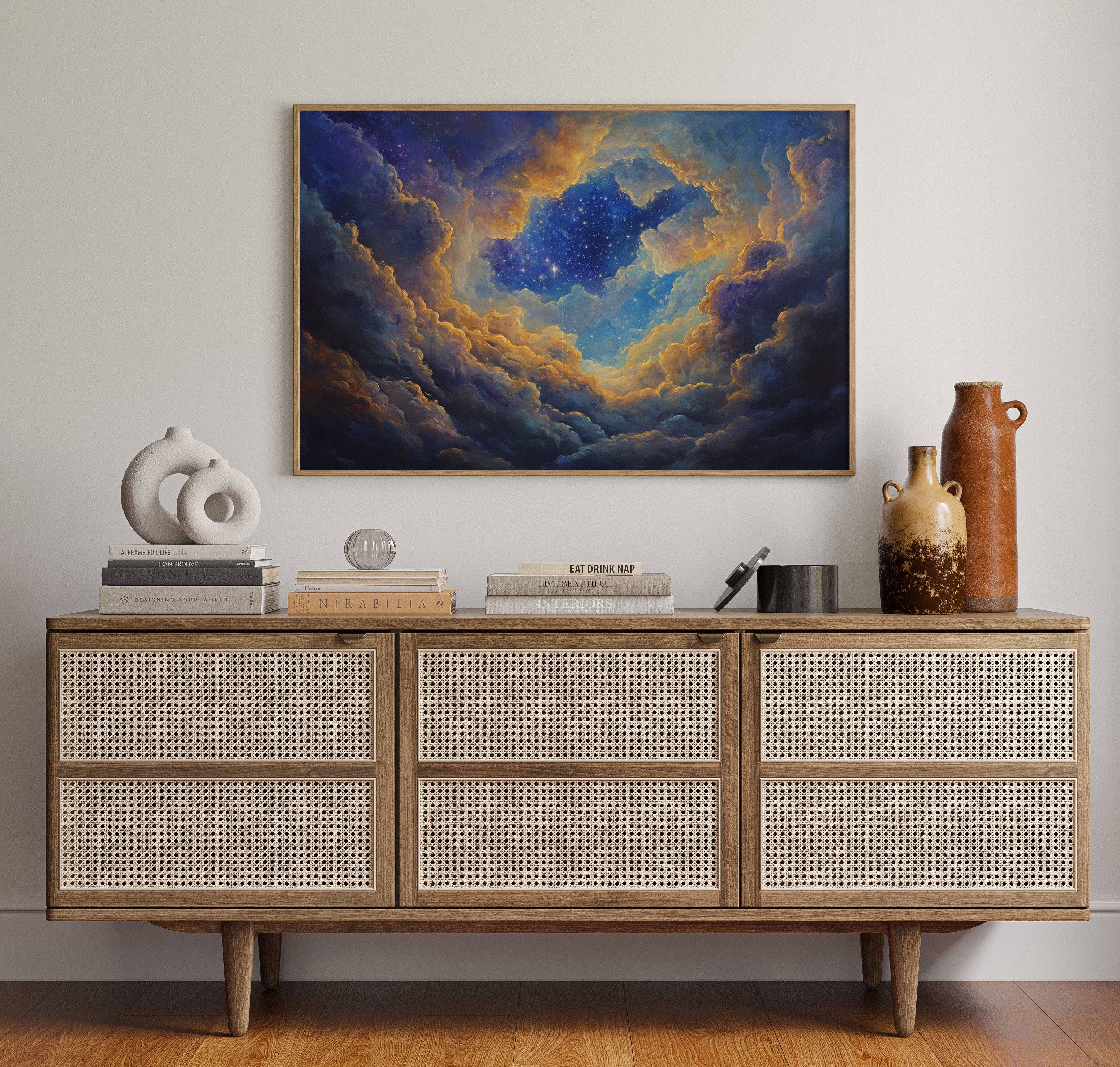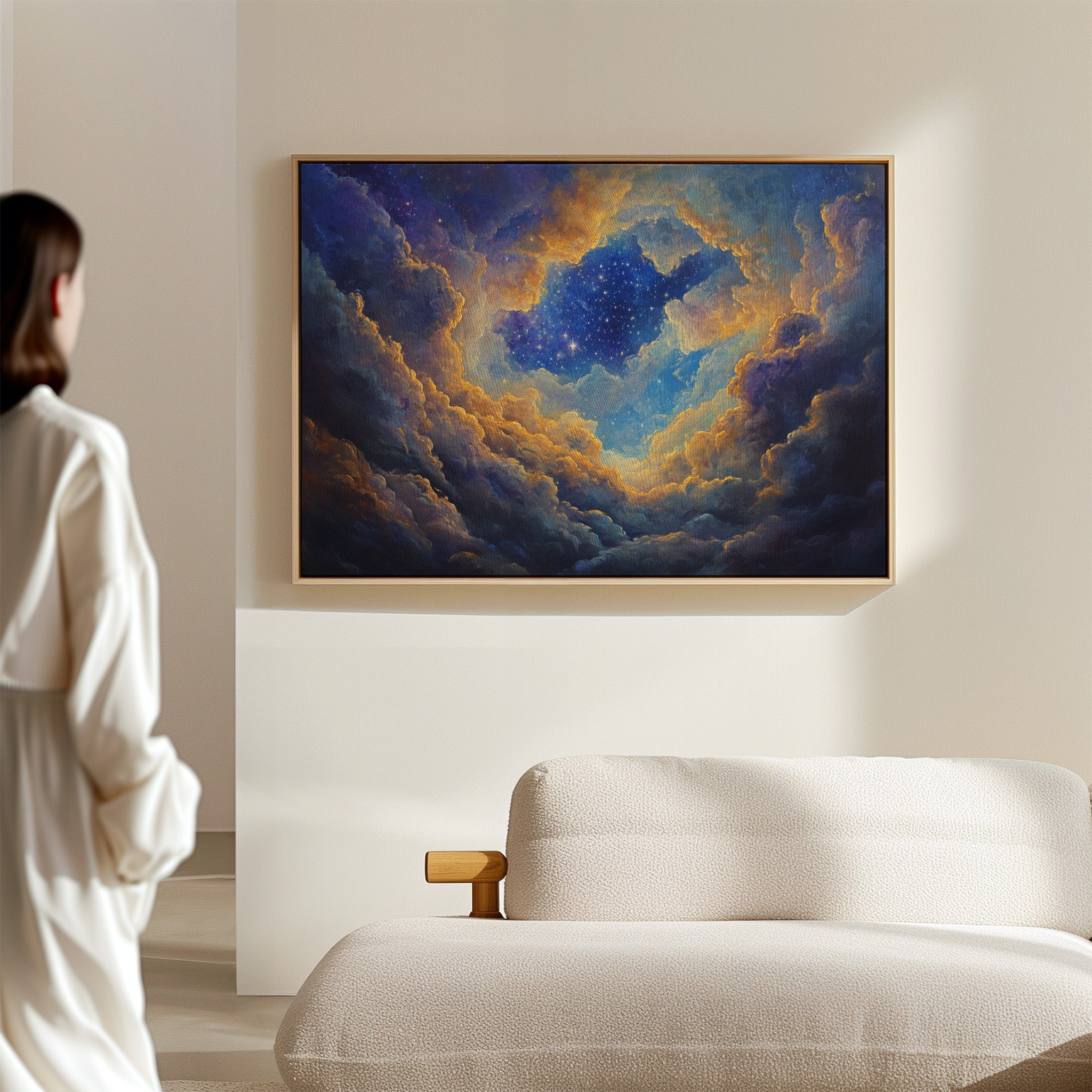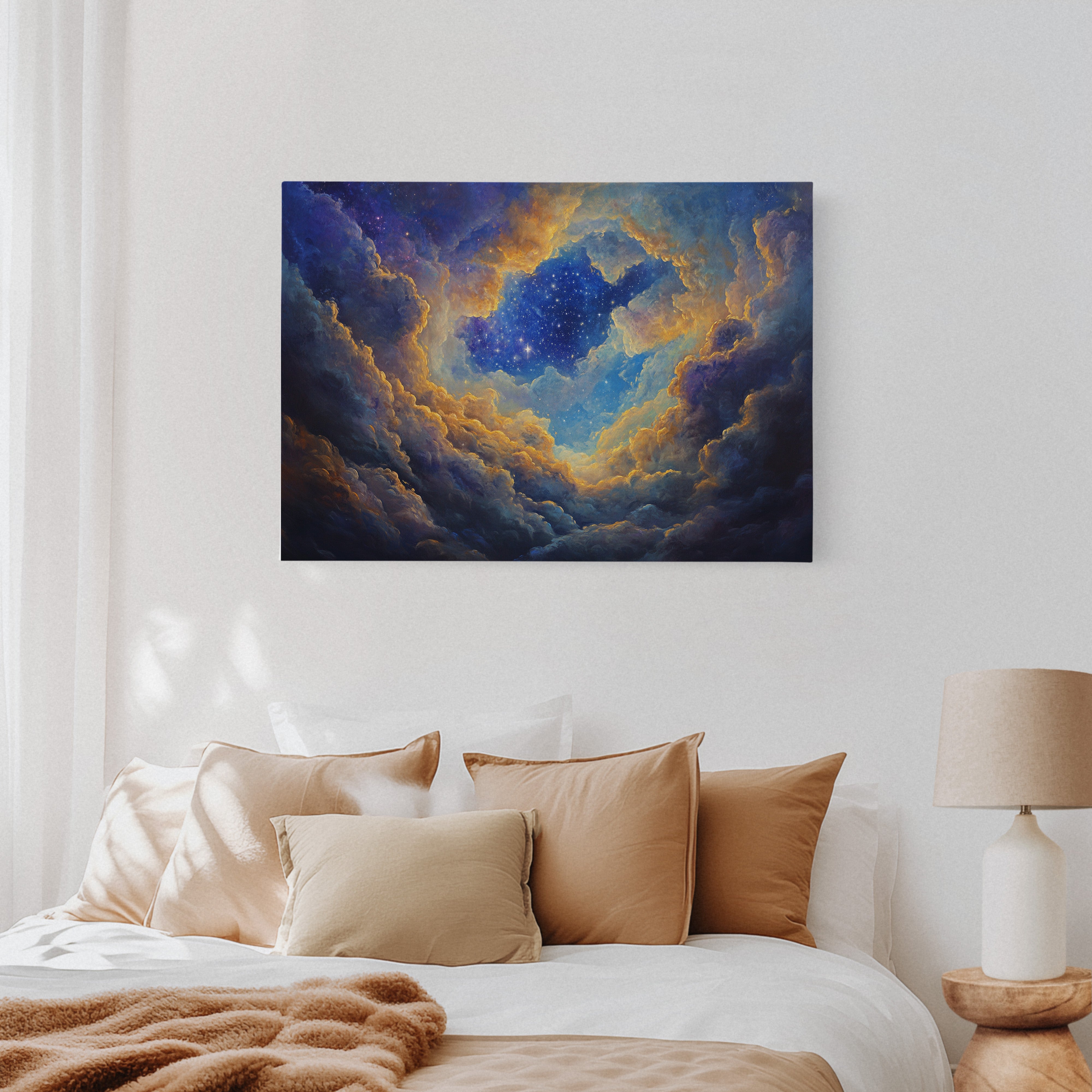 Billowing clouds part to reveal a celestial window, where golden light spills across the evening sky. Majestic storm clouds frame a heart-shaped opening, offering a glimpse into the infinite cosmos dotted with brilliant stars. Deep blues melt into warm amber hues, creating a dramatic dance between light and shadow, while delicate wisps of clouds catch the last rays of sunlight. This ethereal scene captures the moment where earthly boundaries dissolve into celestial wonder. Perfect for meditation rooms or bedroom spaces where dreams take flight, this piece invites contemplation of life's greater mysteries.