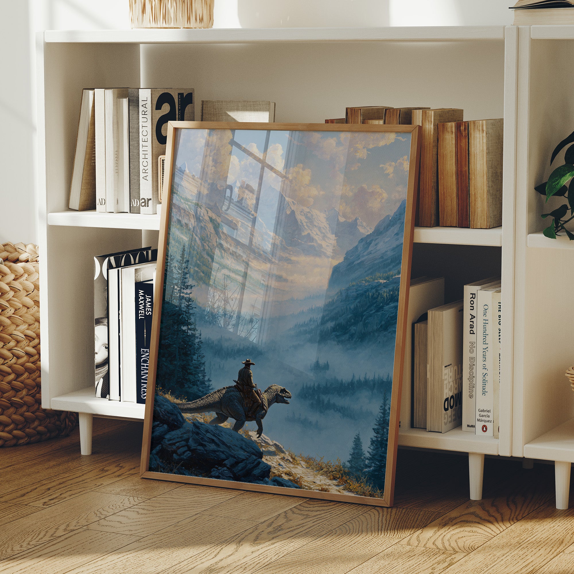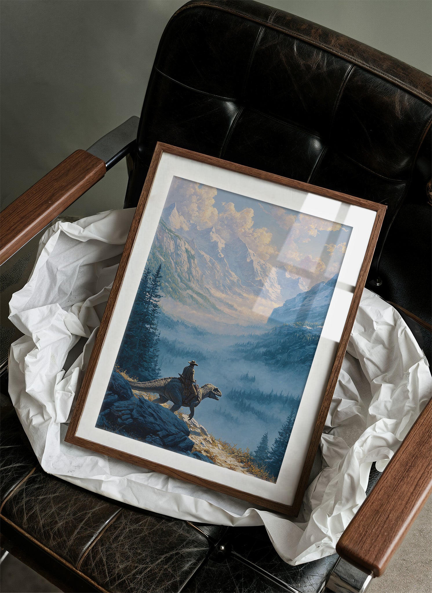 Perched on a rocky ledge above a sea of mist, a lone cowboy surveys snow-capped peaks from the back of a prehistoric companion. This sweeping western fantasy landscape blends rugged frontier spirit with epic mountain drama, rendered in cool alpine blues and golden light. A bold statement piece for offices, cabins, game rooms, or adventure-inspired spaces that celebrate exploration, imagination, and untamed horizons.