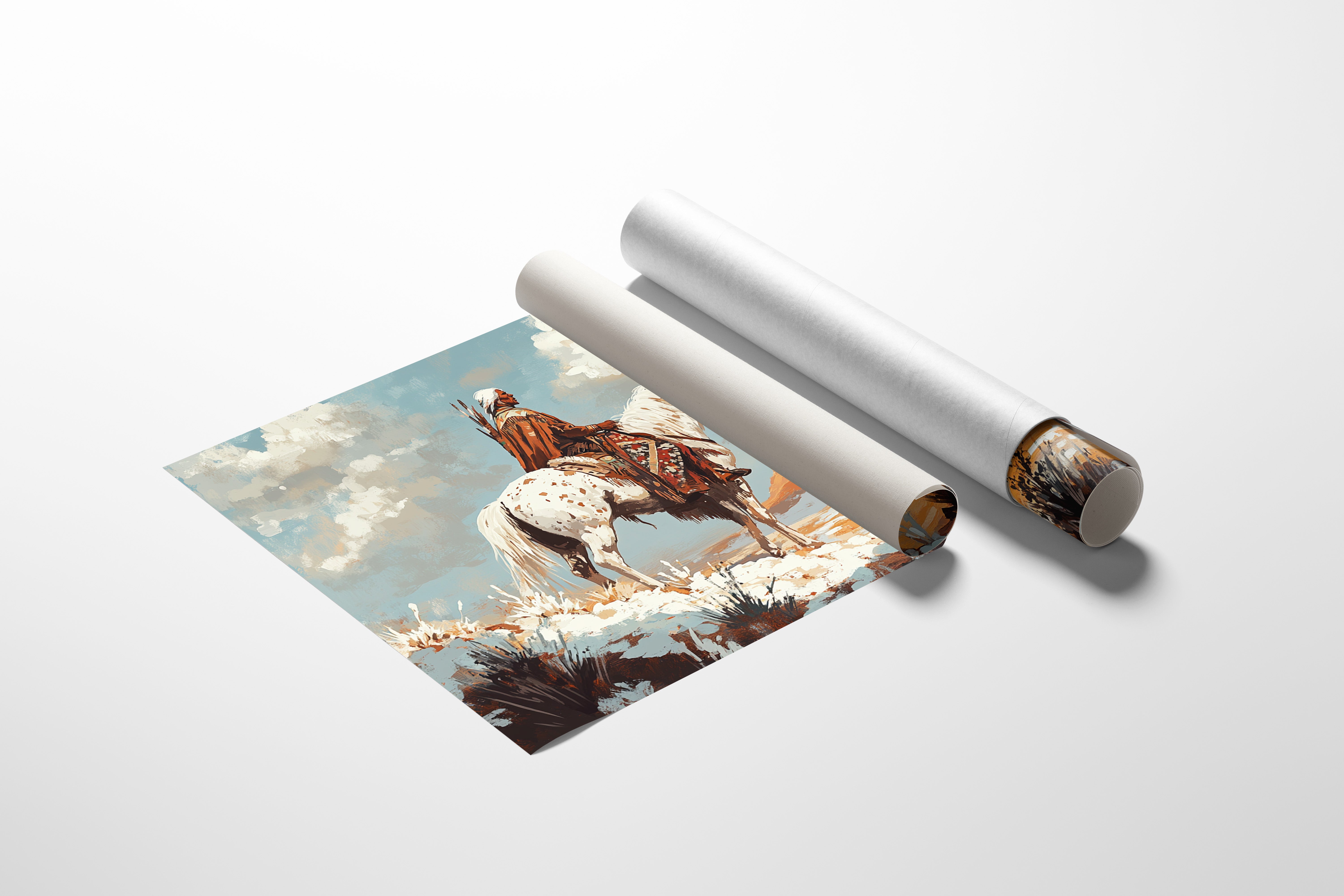 Perched atop a snow-dusted ridge, a lone scout surveys the mesas below from his dappled white horse. This vivid western painting honors strength, stillness, and ancestral ties to the land.