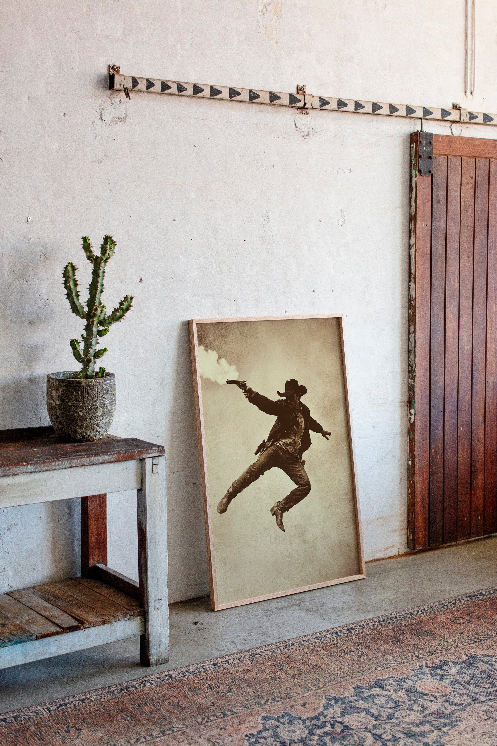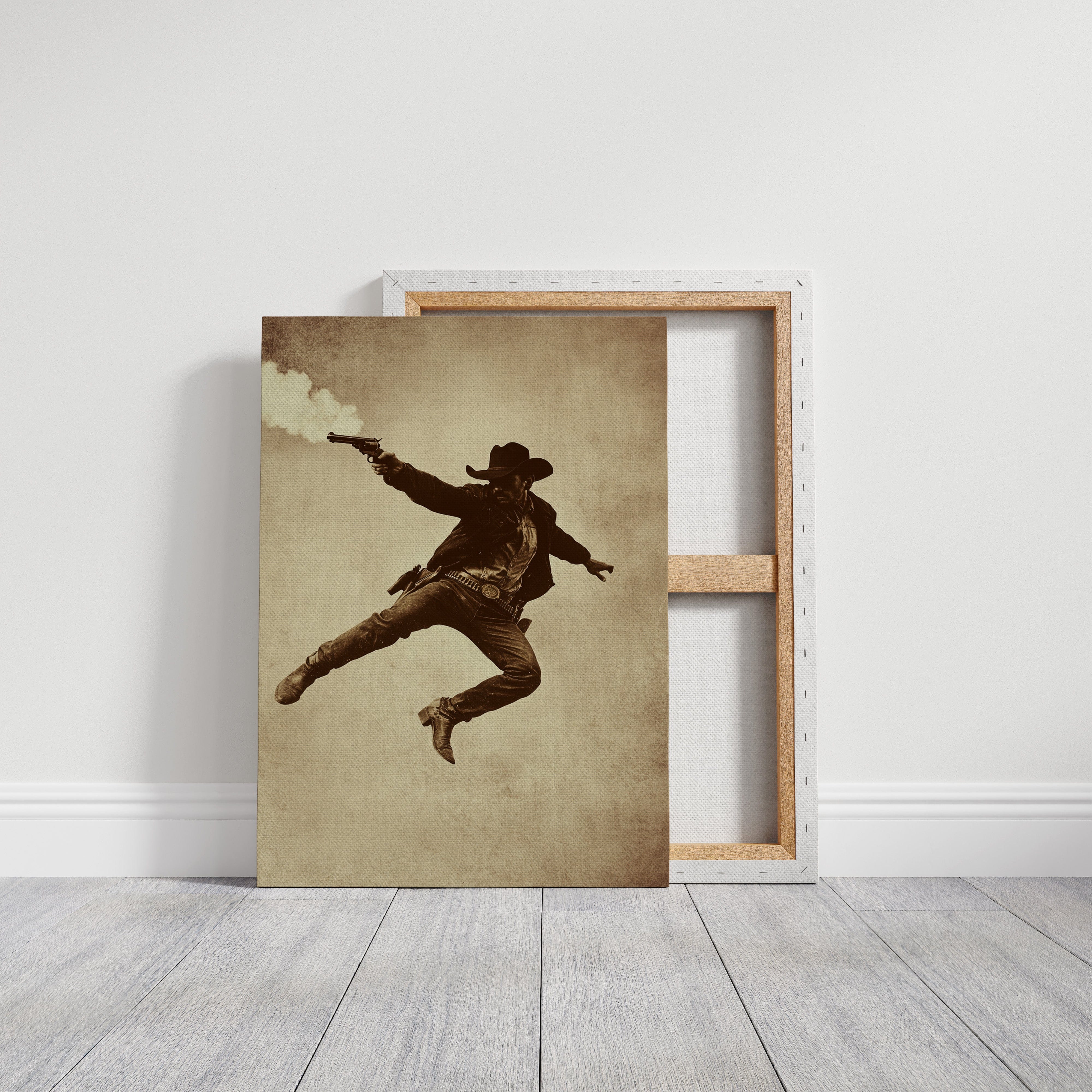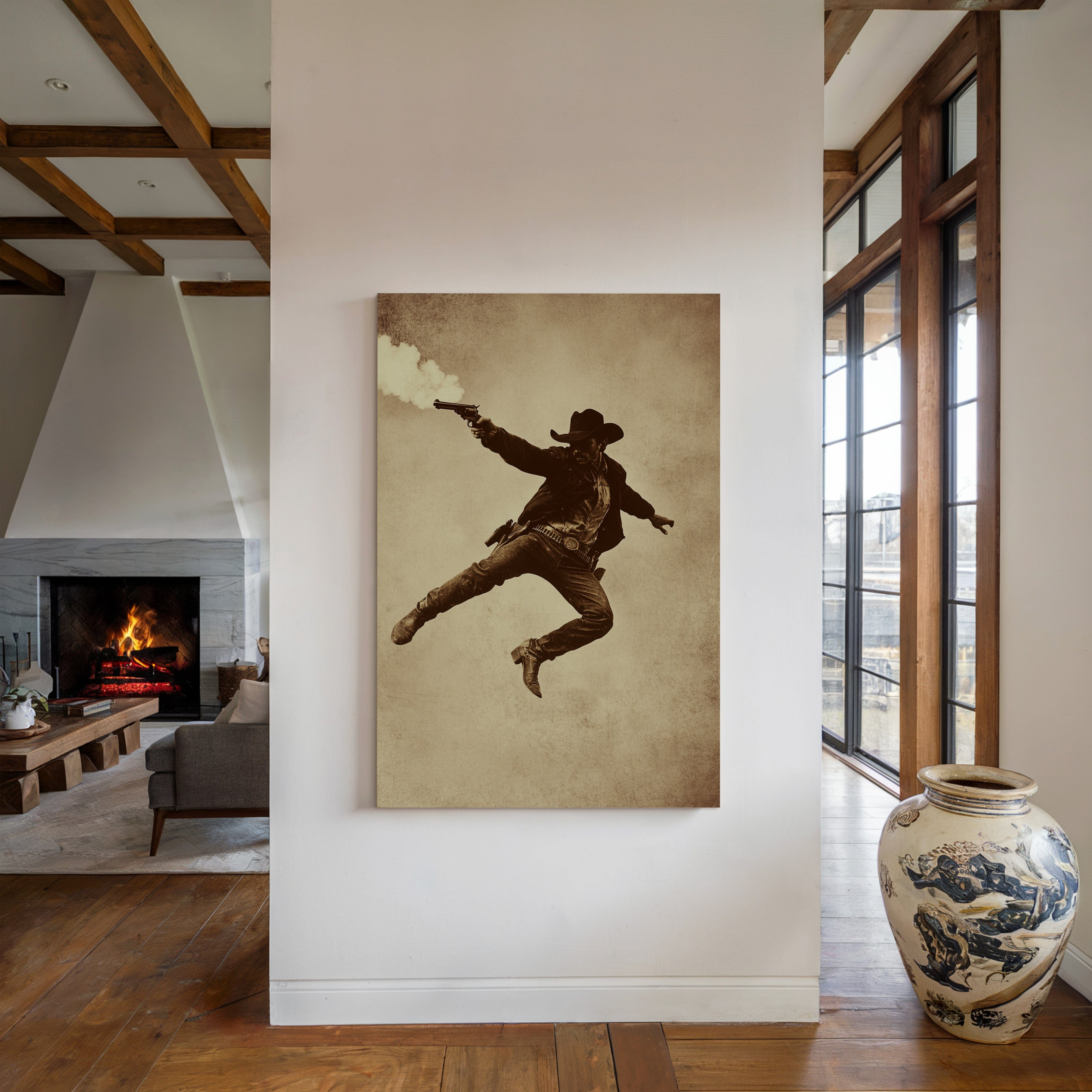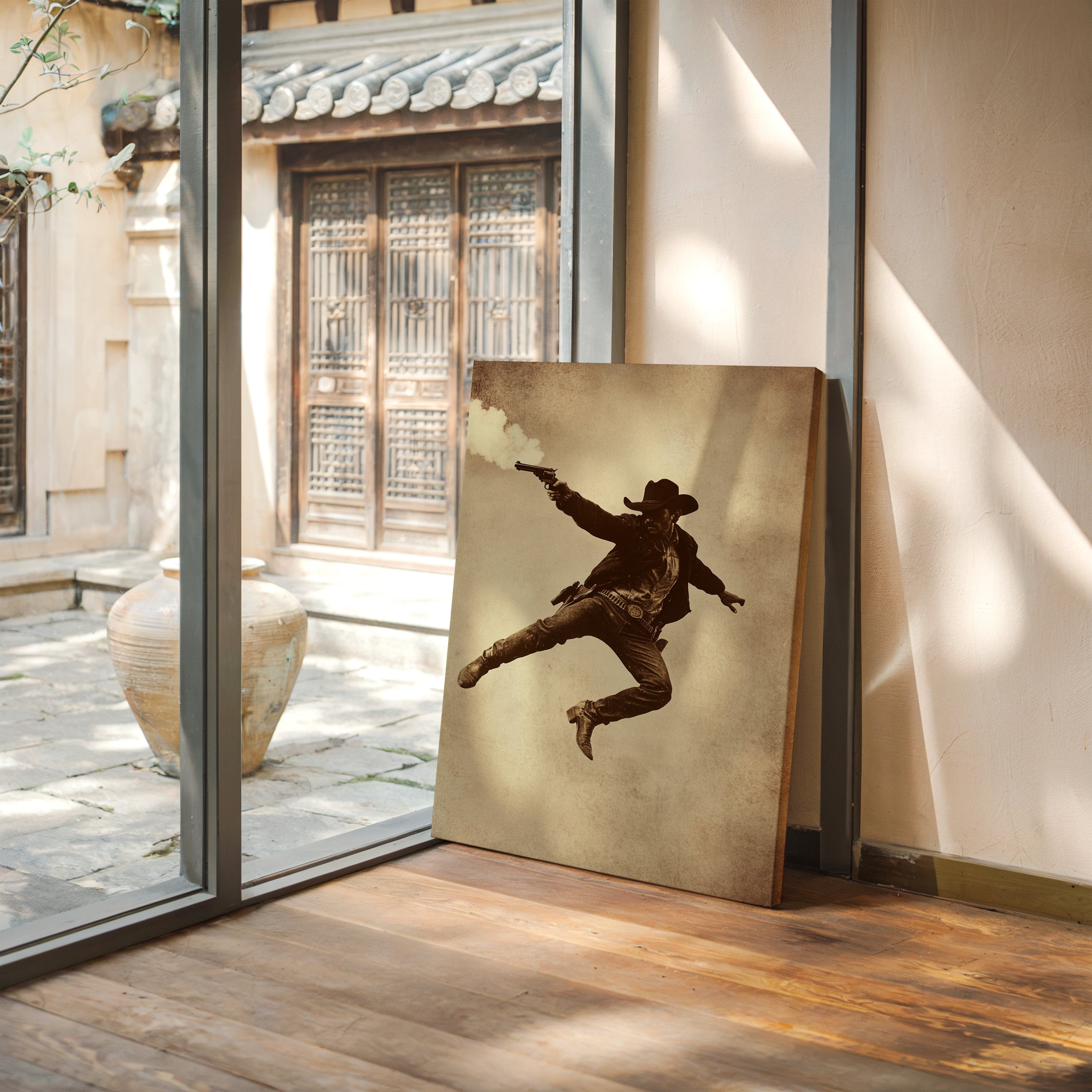 Defy gravity and time with this explosive Western print. Captured mid-leap, this lone cowboy fires his revolver with a trail of smoke cutting through the sepia sky. The vintage texture and dramatic action combine into a cinematic moment frozen in time — raw, rugged, and irresistibly bold. Perfect for fans of Westerns, vintage Americana, or high-octane wall art, this print brings outlaw energy to any space.