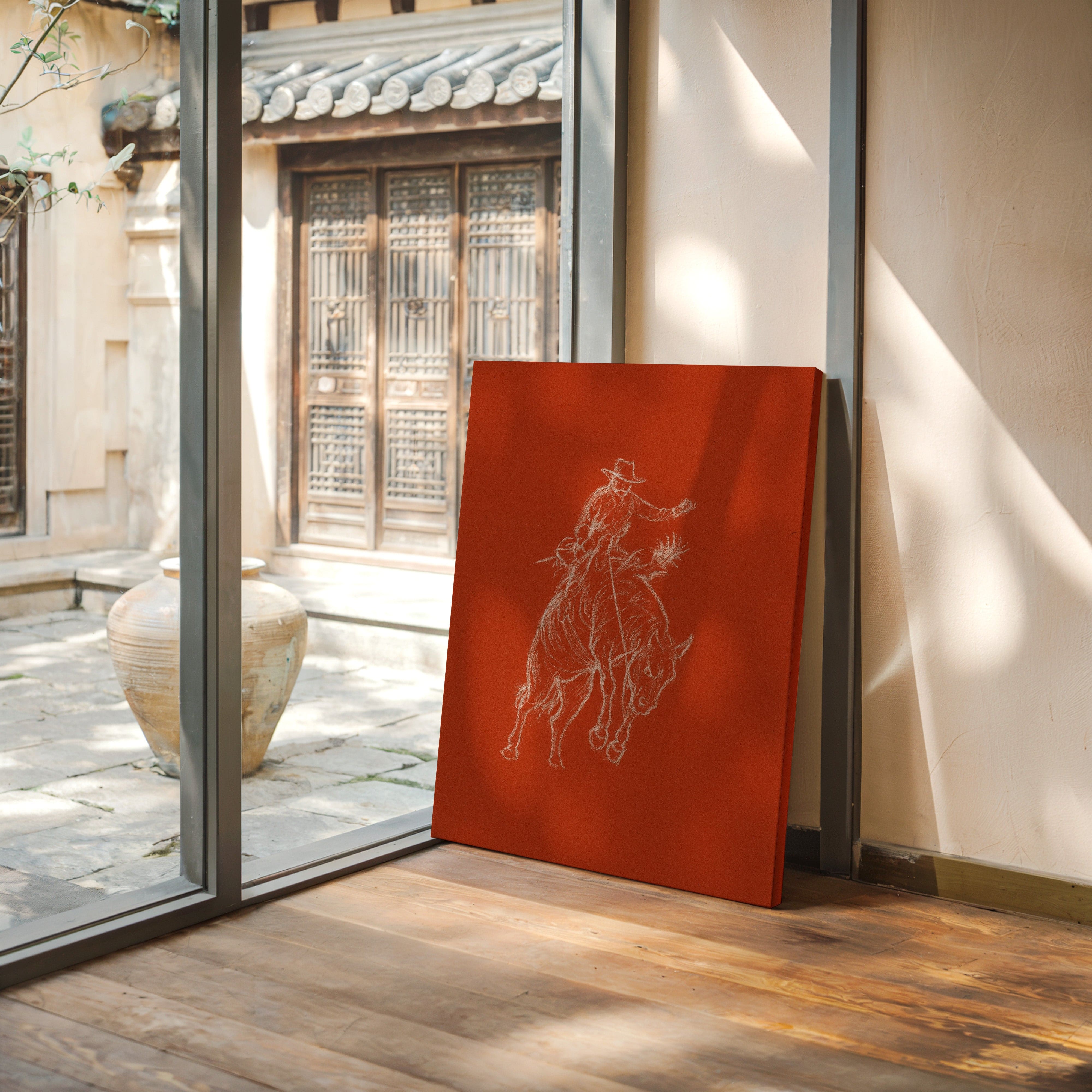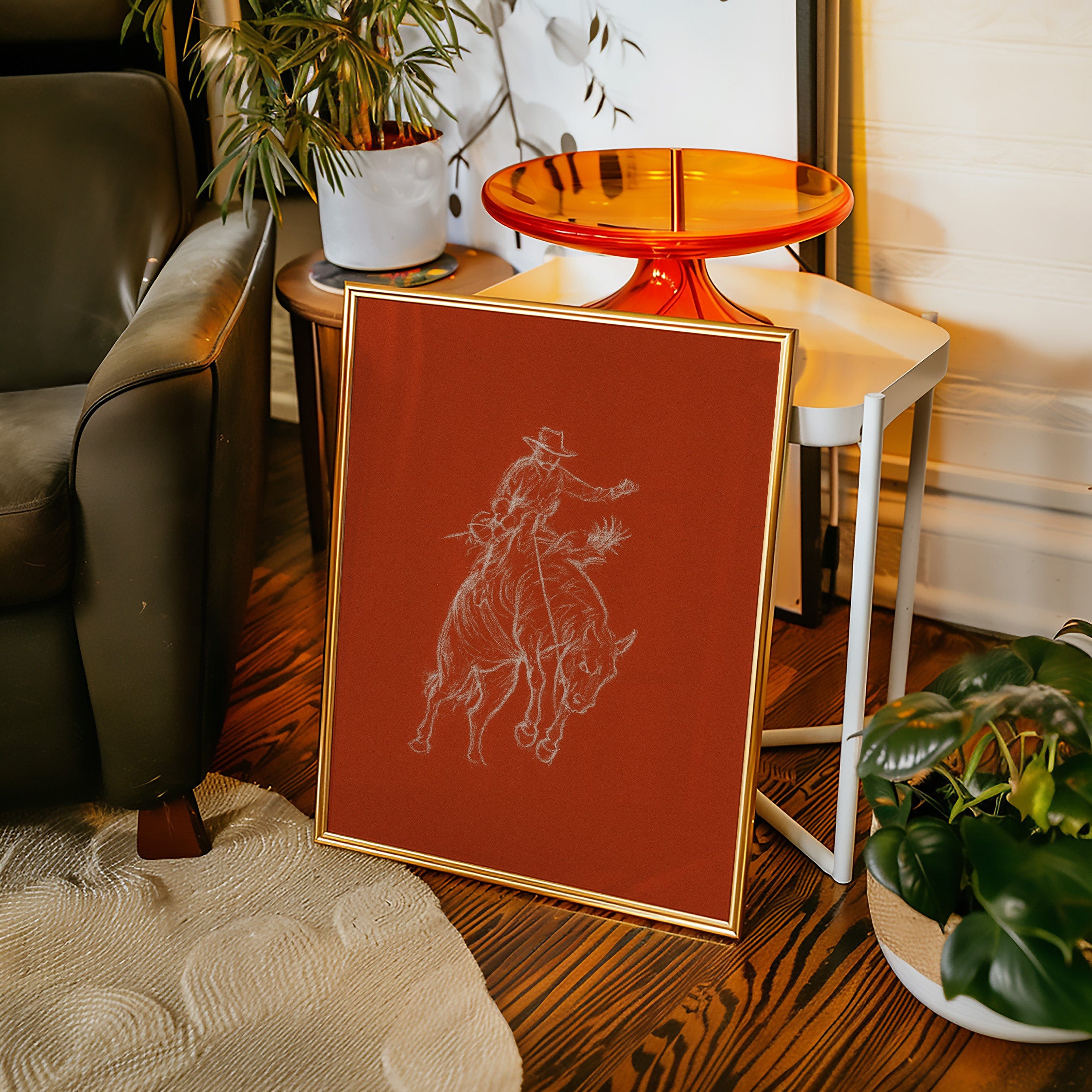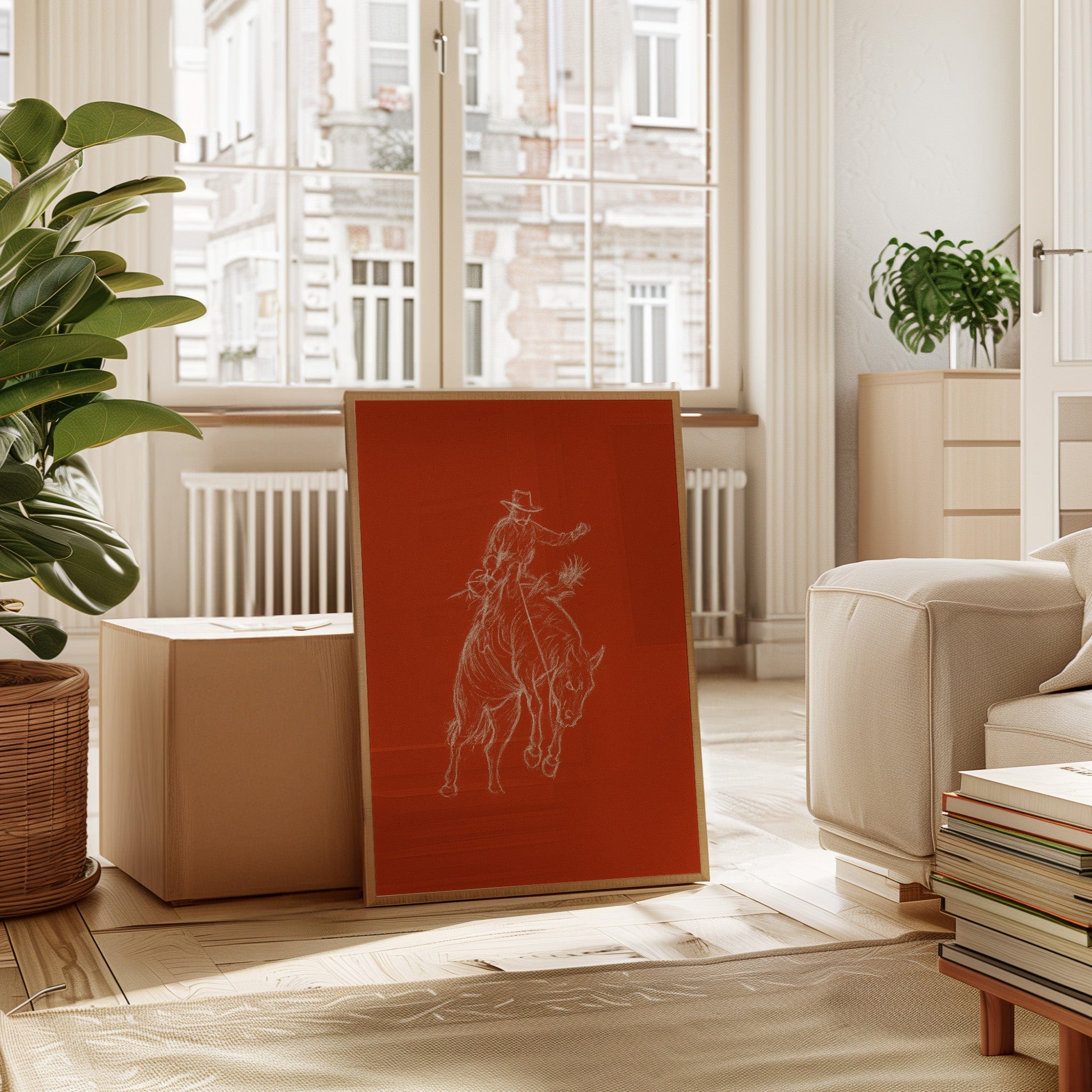 This minimalist chalk-style sketch captures a raw and exhilarating moment of a cowboy mid-ride atop a bucking bronco. Set against a rich red background, the white linework bursts with energy, celebrating Western rodeo tradition with graceful simplicity. Perfect for collectors of equestrian or cowboy art, this print brings rustic grit and artistic elegance to any space.