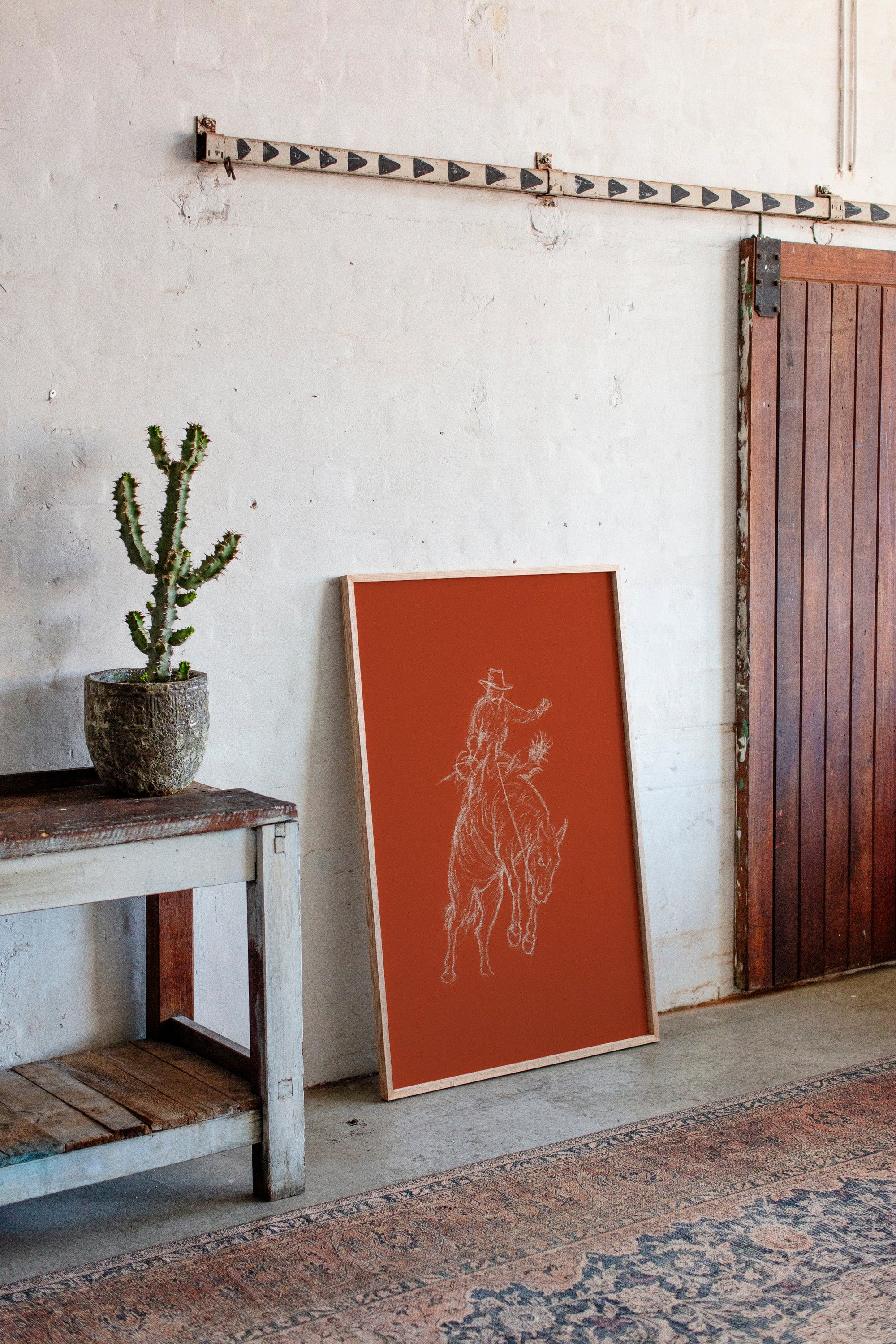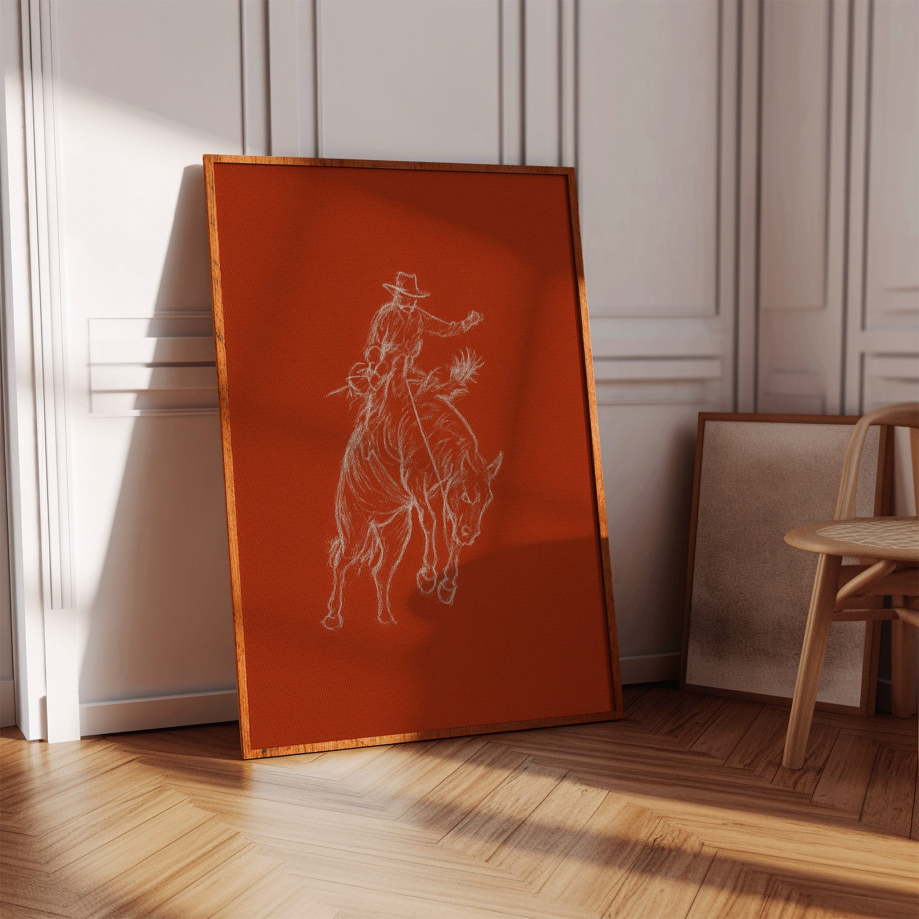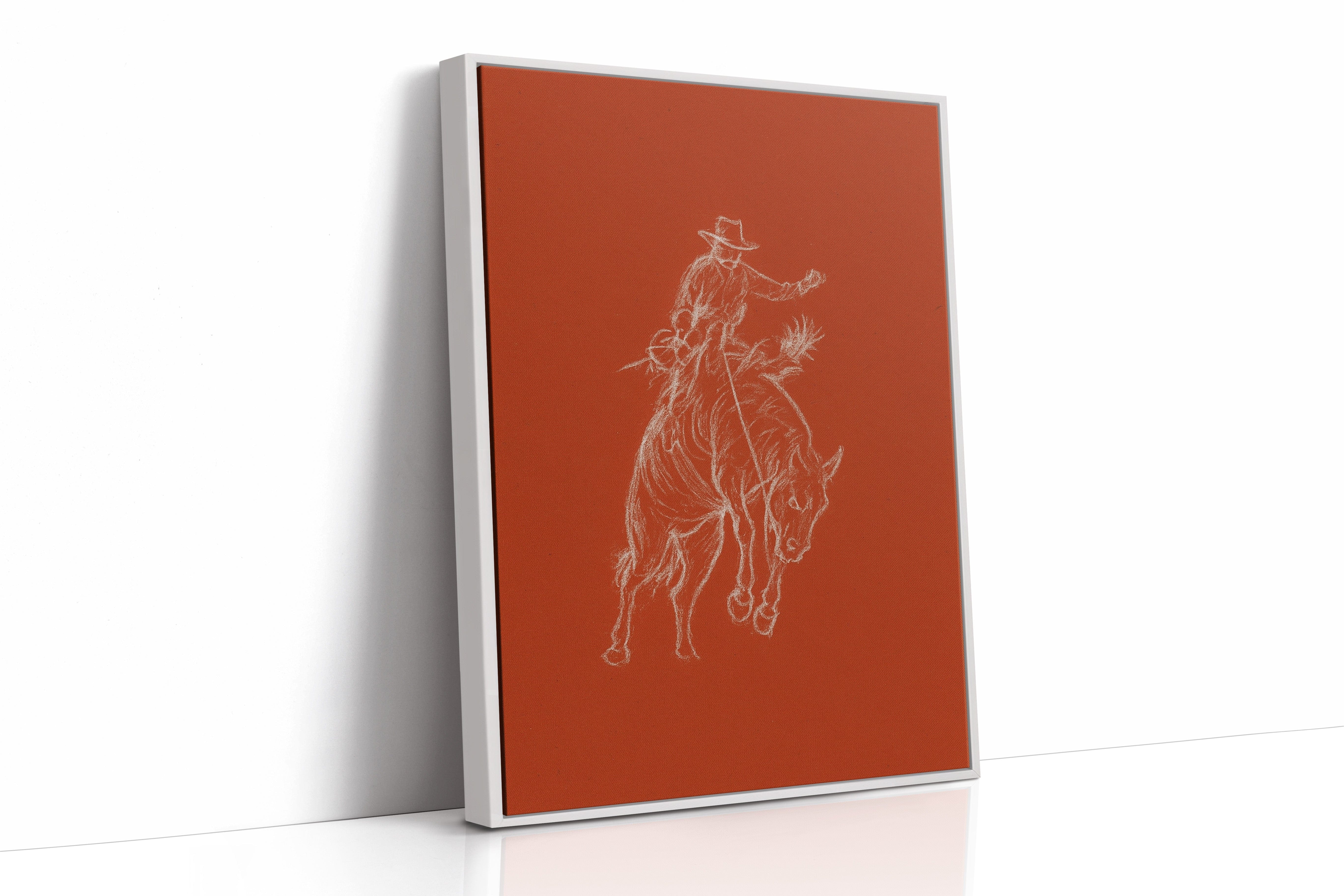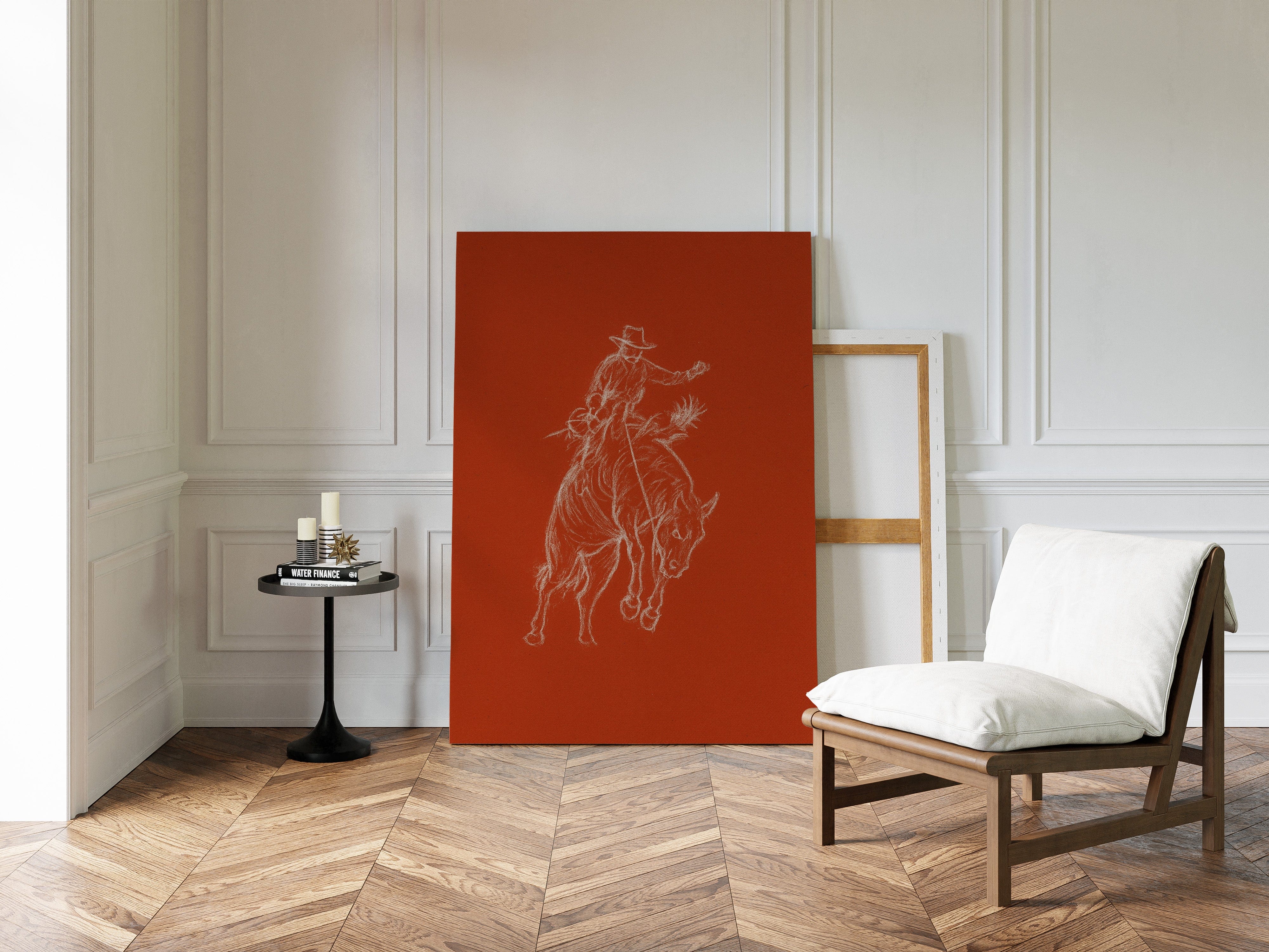 This minimalist chalk-style sketch captures a raw and exhilarating moment of a cowboy mid-ride atop a bucking bronco. Set against a rich red background, the white linework bursts with energy, celebrating Western rodeo tradition with graceful simplicity. Perfect for collectors of equestrian or cowboy art, this print brings rustic grit and artistic elegance to any space.