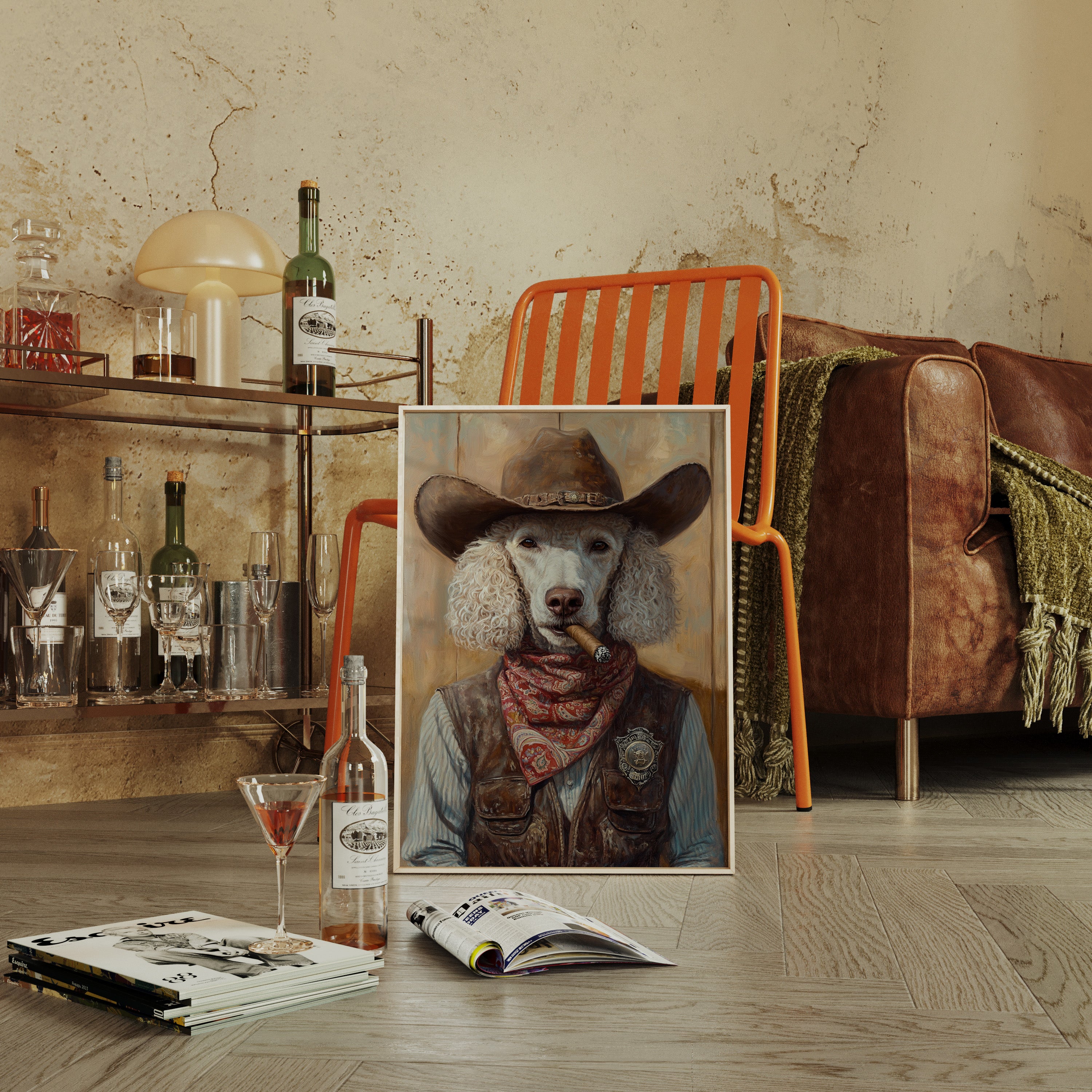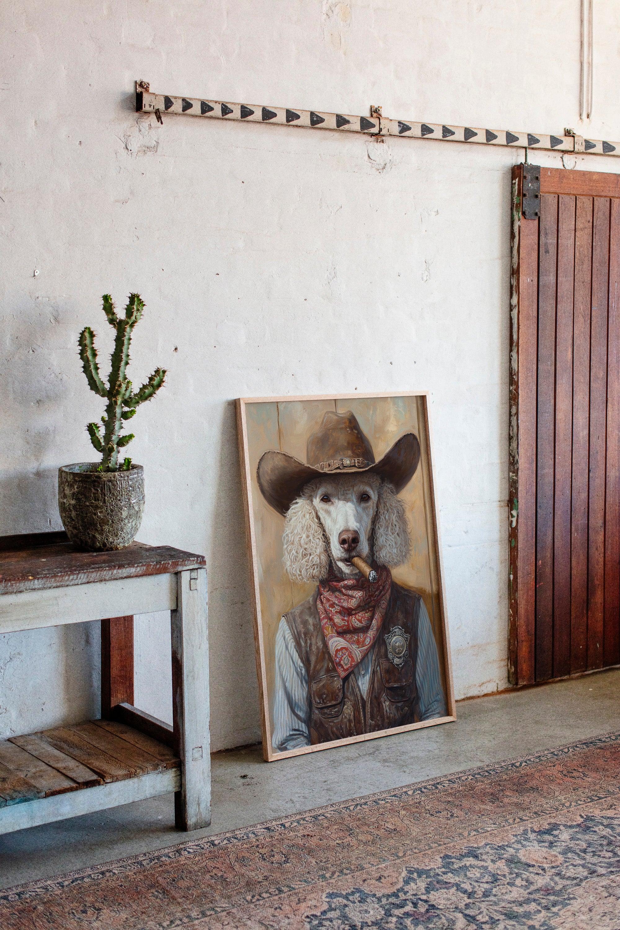Elegant yet rugged, this curly-haired poodle wears a ten-gallon hat, paisley bandana, and sheriff's badge—channeling the perfect blend of sass and lawman charm.
