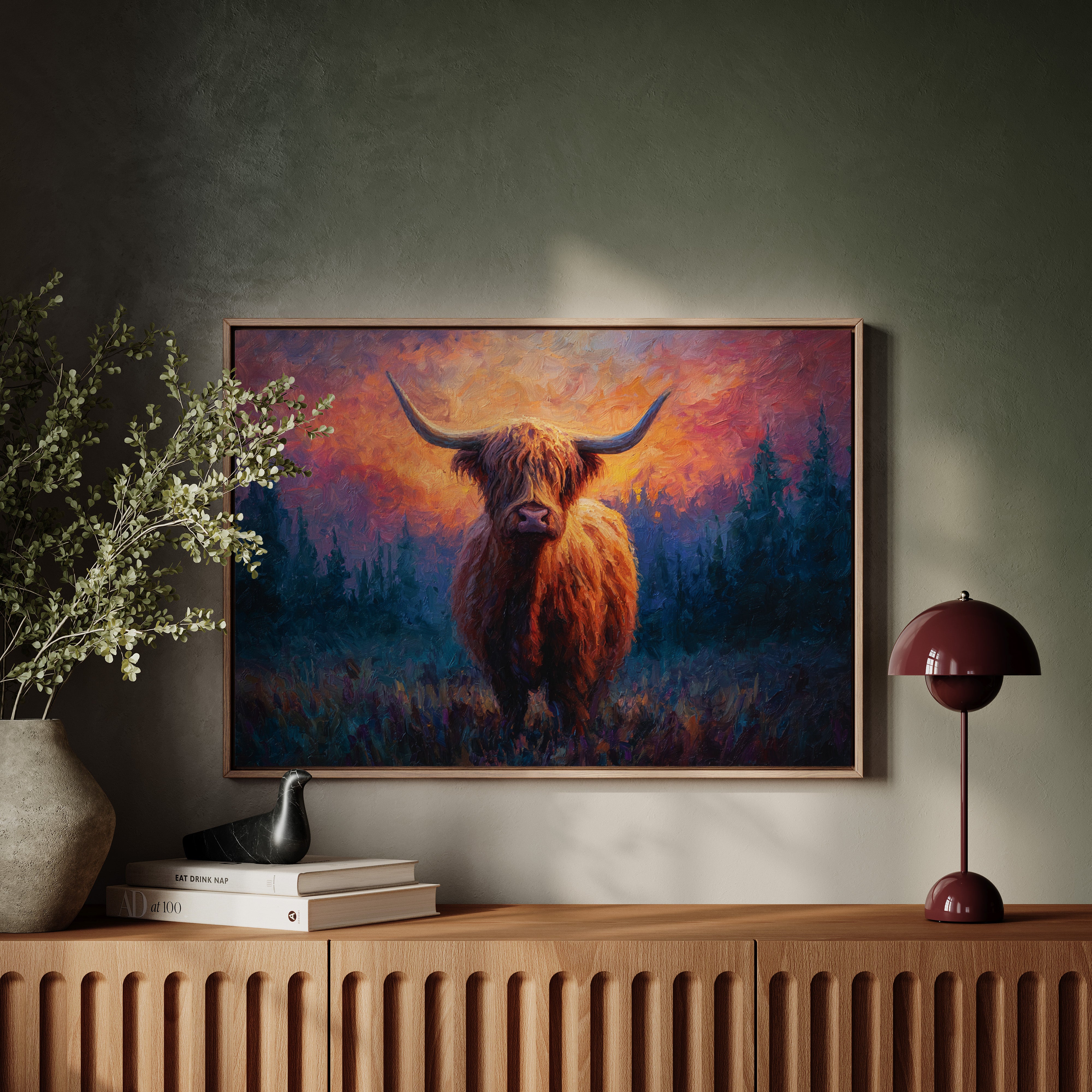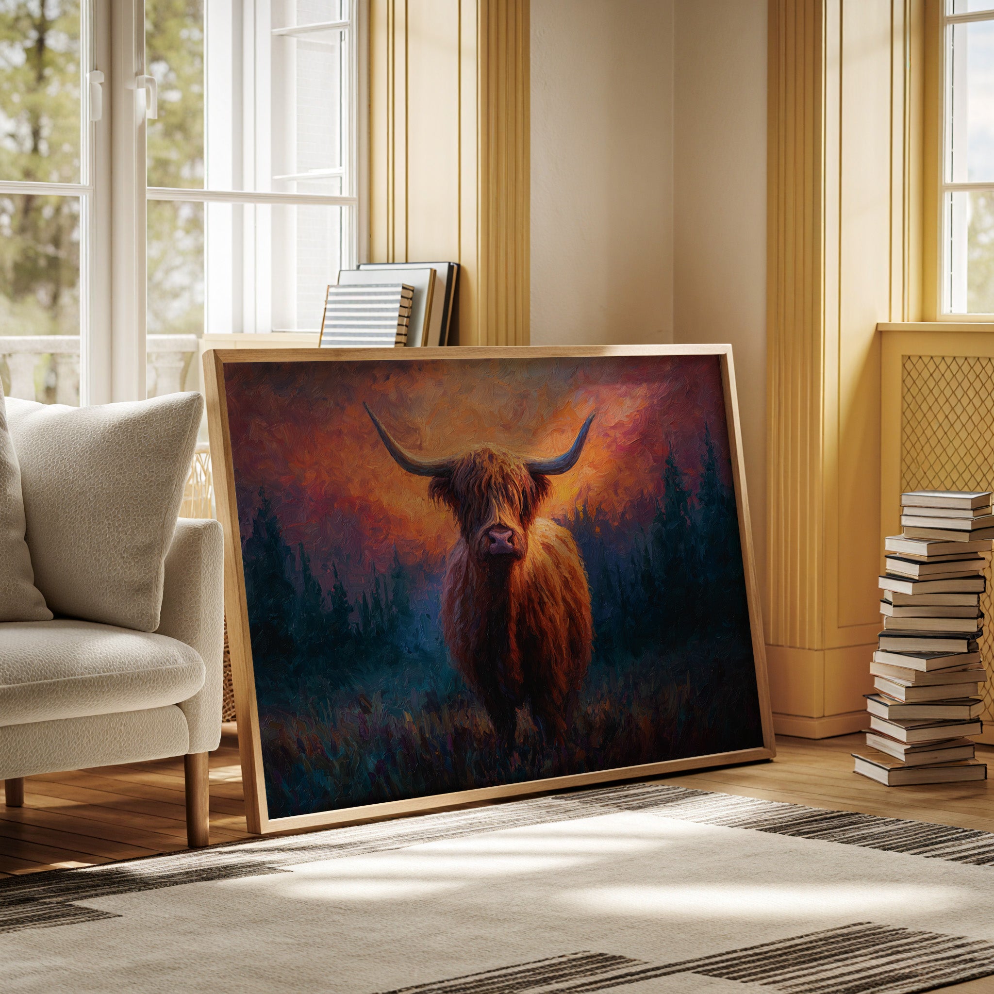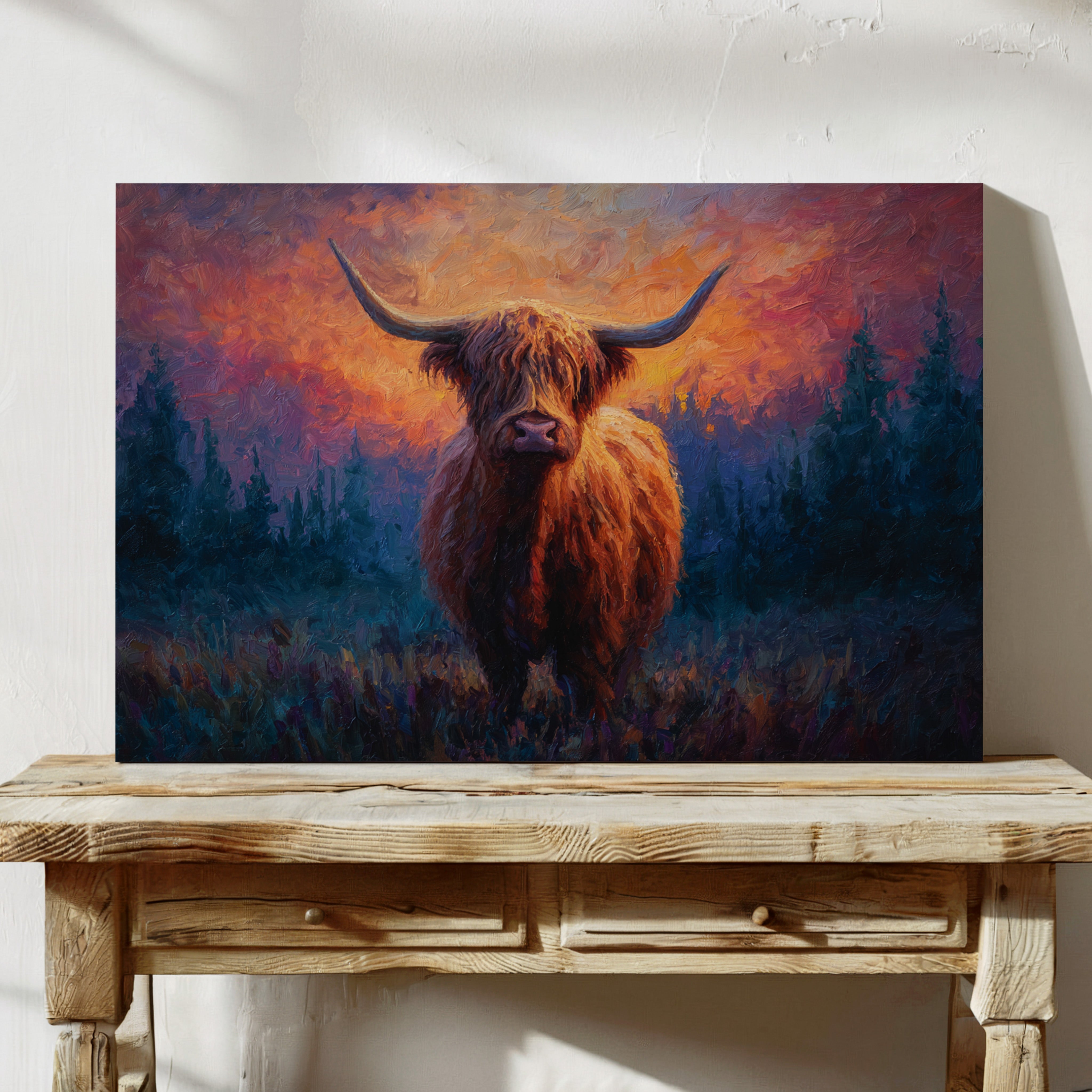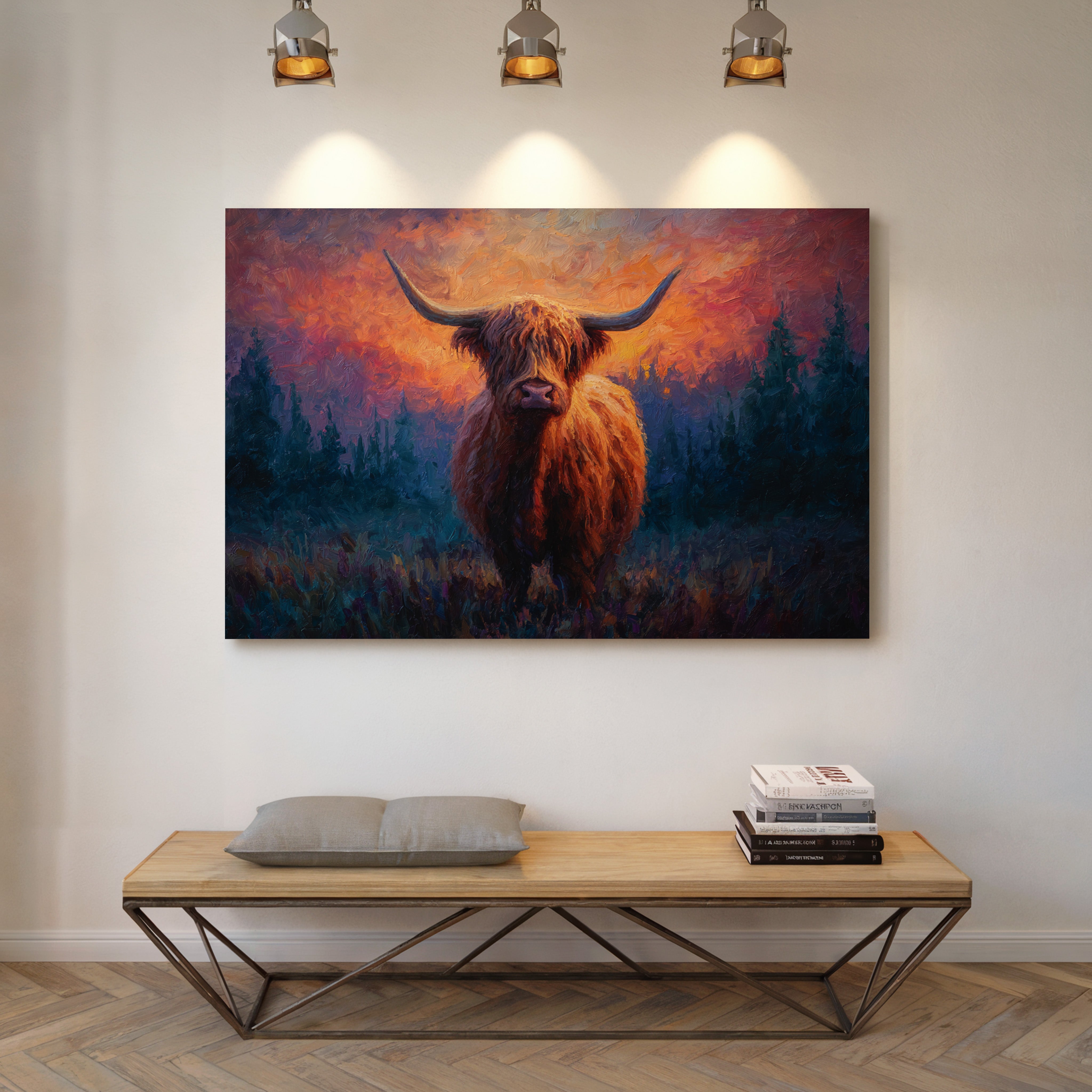 A majestic Highland cow stands bathed in the warm glow of a fiery sunrise, its shaggy coat illuminated like burnished copper against the dawn. Rich impasto brushstrokes capture the texture of its thick fur and commanding horns, while deep blues and purples of the surrounding pine forest create a dramatic contrast. The sky blazes with orange and crimson hues, painting a story of untamed spirit and natural dignity. This striking portrait captures both the raw power and gentle soul of these beloved Scottish creatures. Perfect for adding a bold, rustic elegance to a study, dining room, or any space seeking to evoke the wild beauty of the highlands.