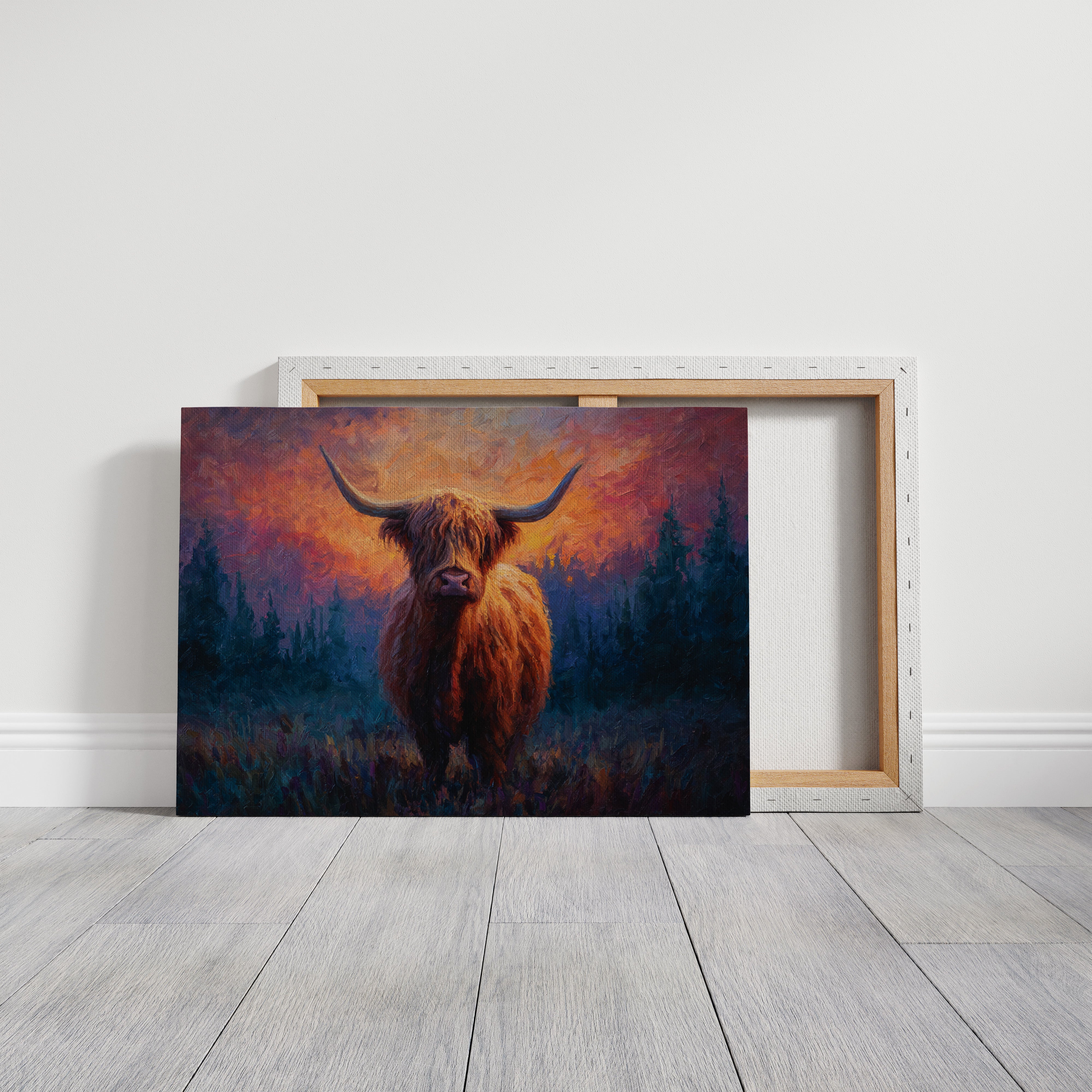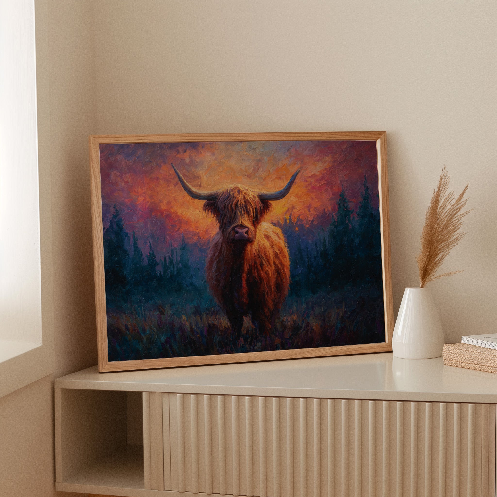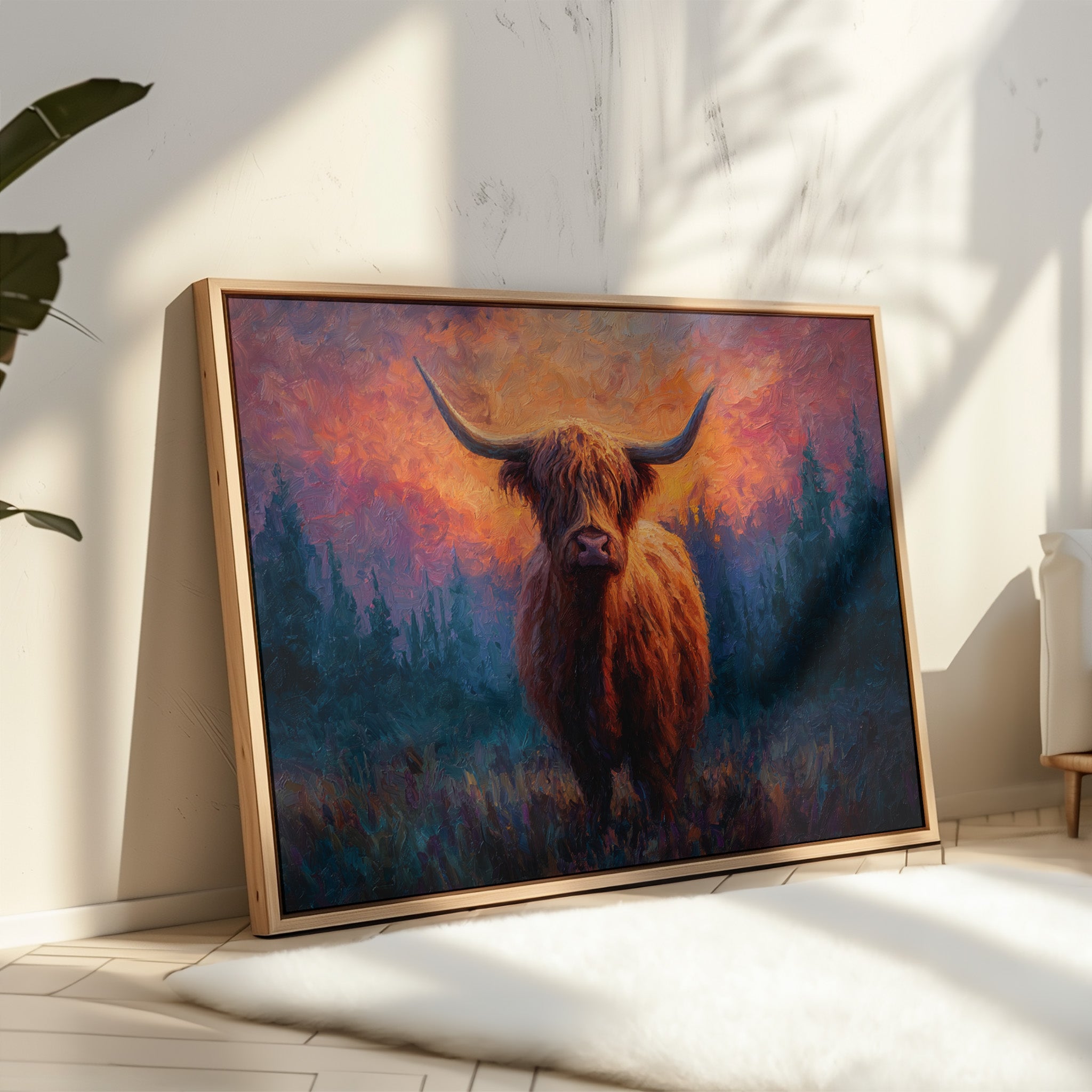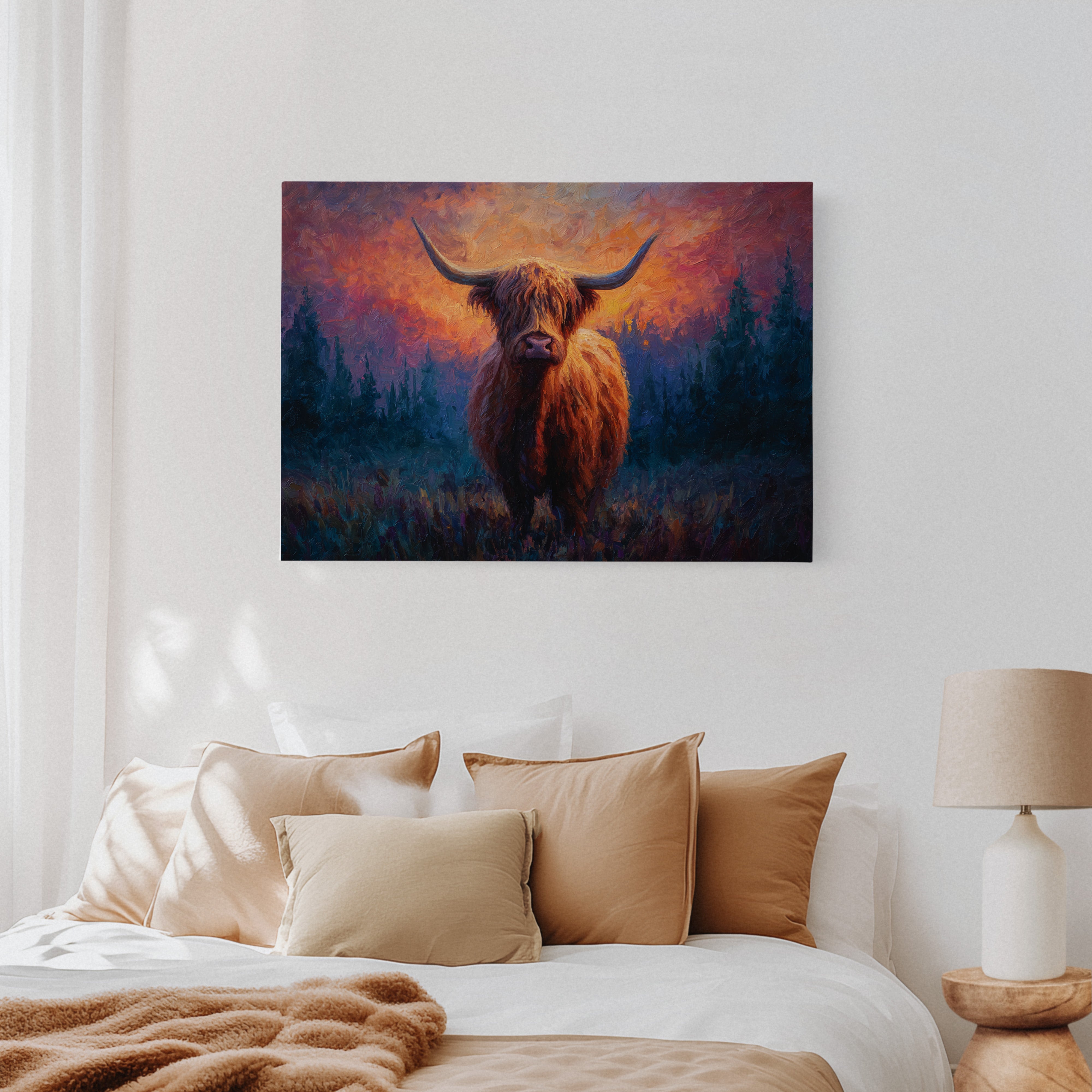A majestic Highland cow stands bathed in the warm glow of a fiery sunrise, its shaggy coat illuminated like burnished copper against the dawn. Rich impasto brushstrokes capture the texture of its thick fur and commanding horns, while deep blues and purples of the surrounding pine forest create a dramatic contrast. The sky blazes with orange and crimson hues, painting a story of untamed spirit and natural dignity. This striking portrait captures both the raw power and gentle soul of these beloved Scottish creatures. Perfect for adding a bold, rustic elegance to a study, dining room, or any space seeking to evoke the wild beauty of the highlands.