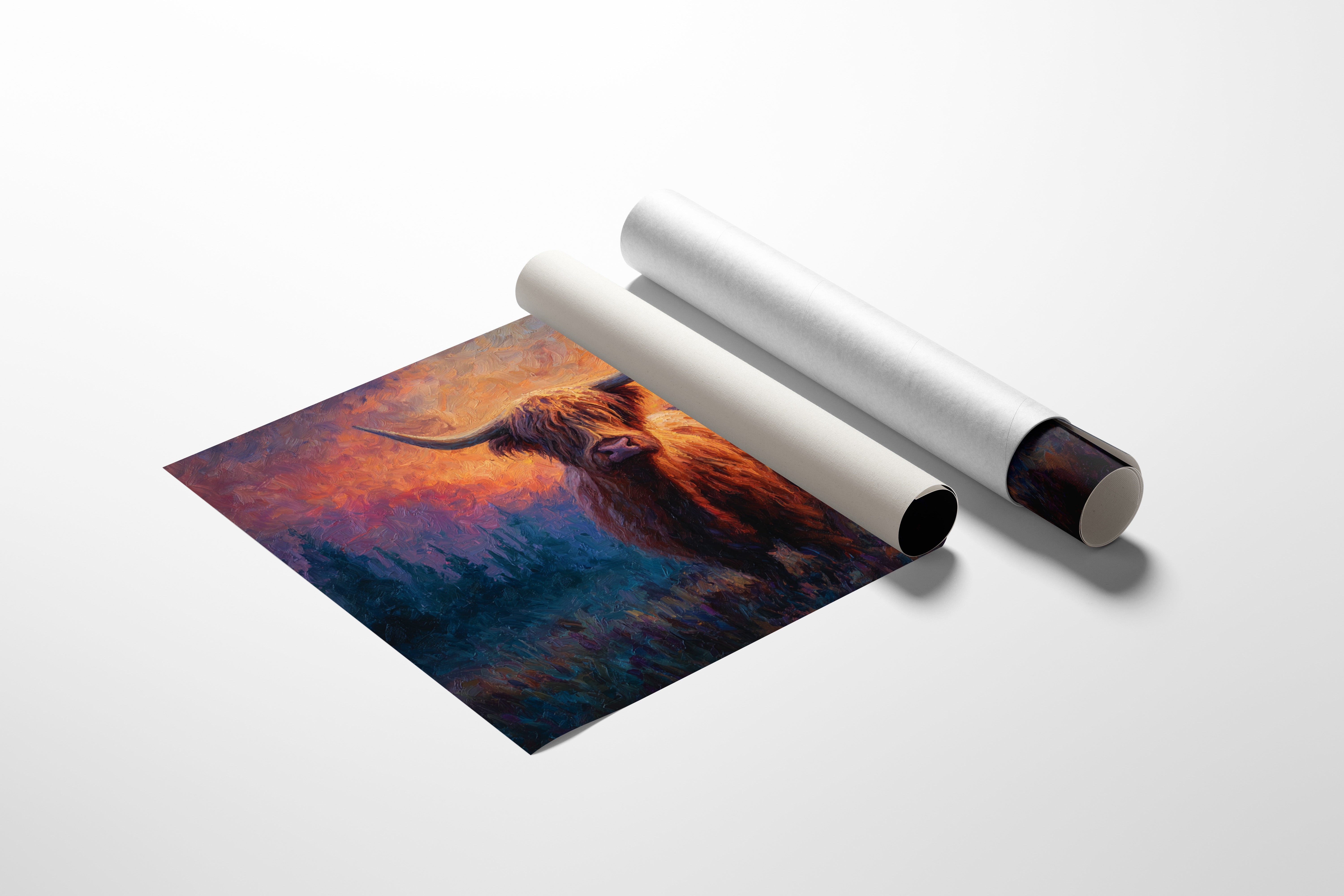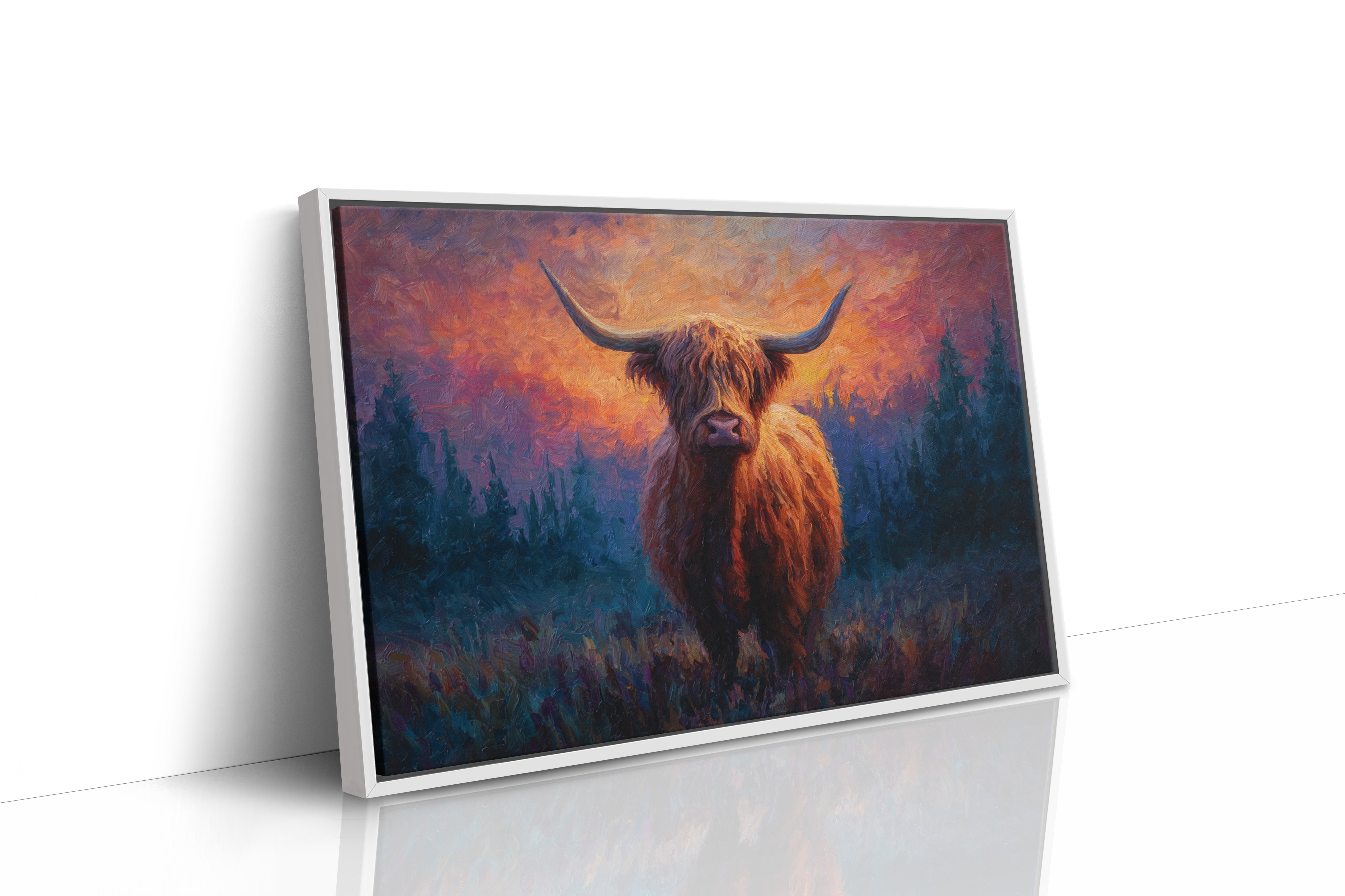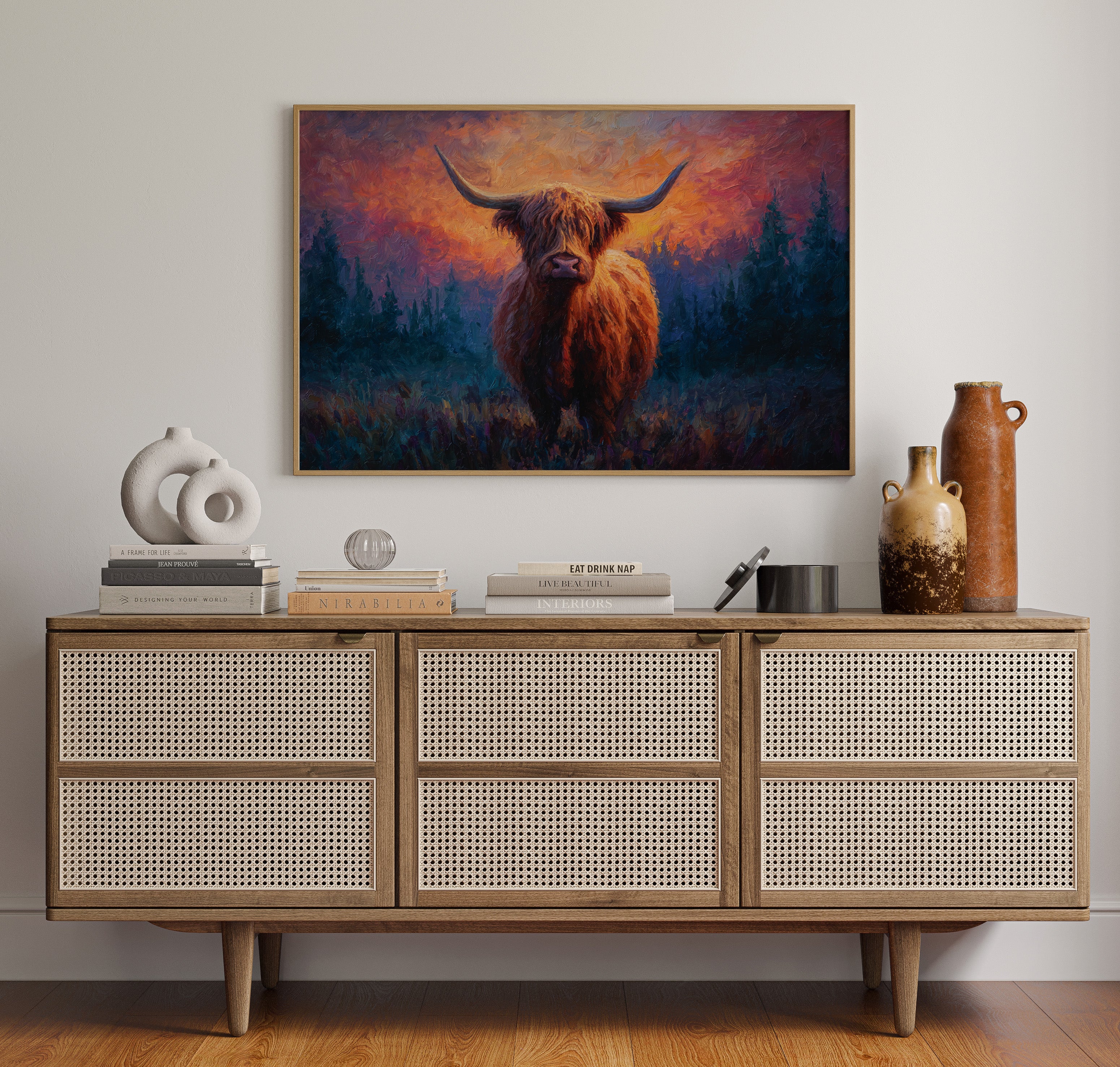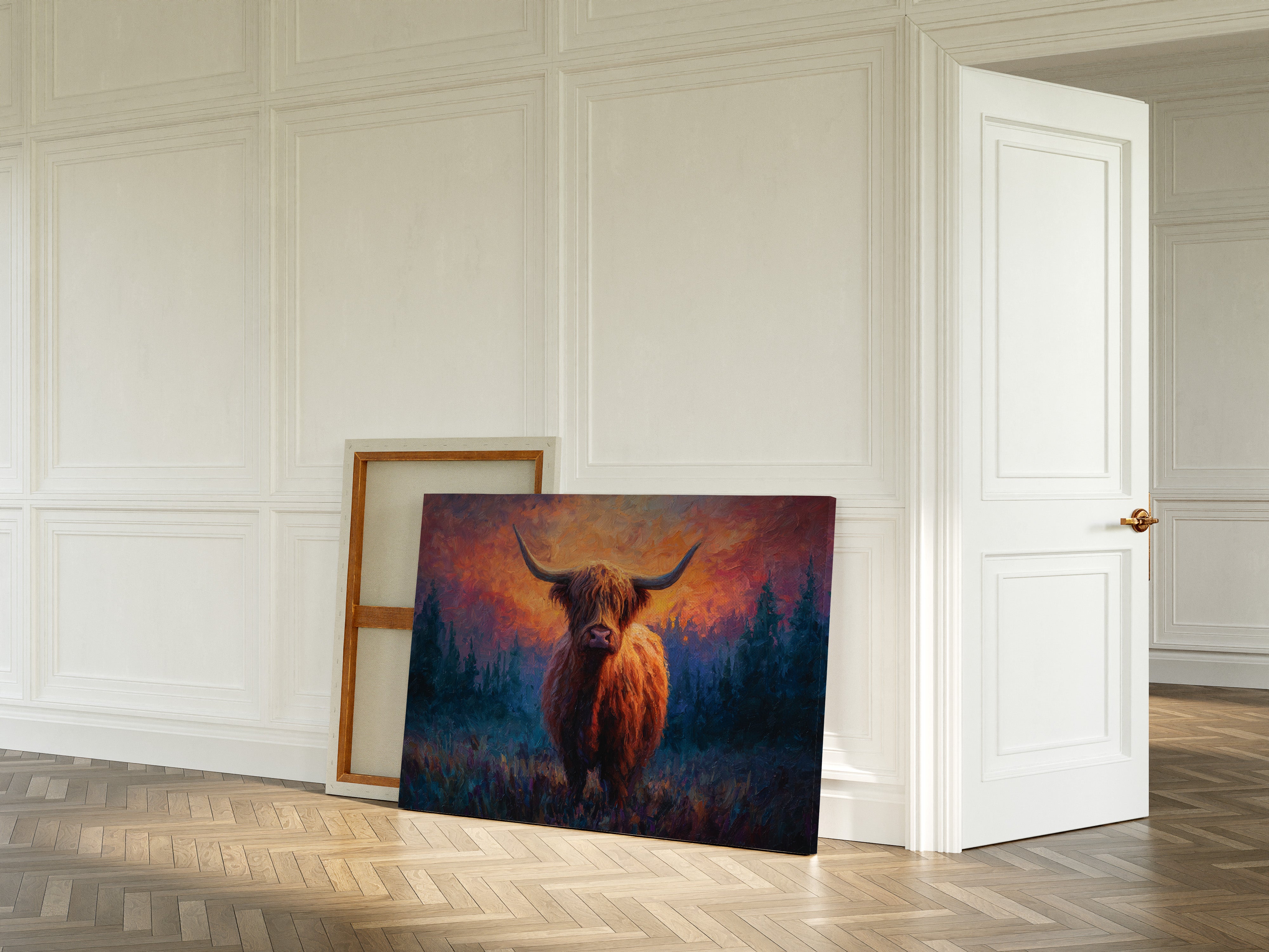 A majestic Highland cow stands bathed in the warm glow of a fiery sunrise, its shaggy coat illuminated like burnished copper against the dawn. Rich impasto brushstrokes capture the texture of its thick fur and commanding horns, while deep blues and purples of the surrounding pine forest create a dramatic contrast. The sky blazes with orange and crimson hues, painting a story of untamed spirit and natural dignity. This striking portrait captures both the raw power and gentle soul of these beloved Scottish creatures. Perfect for adding a bold, rustic elegance to a study, dining room, or any space seeking to evoke the wild beauty of the highlands.