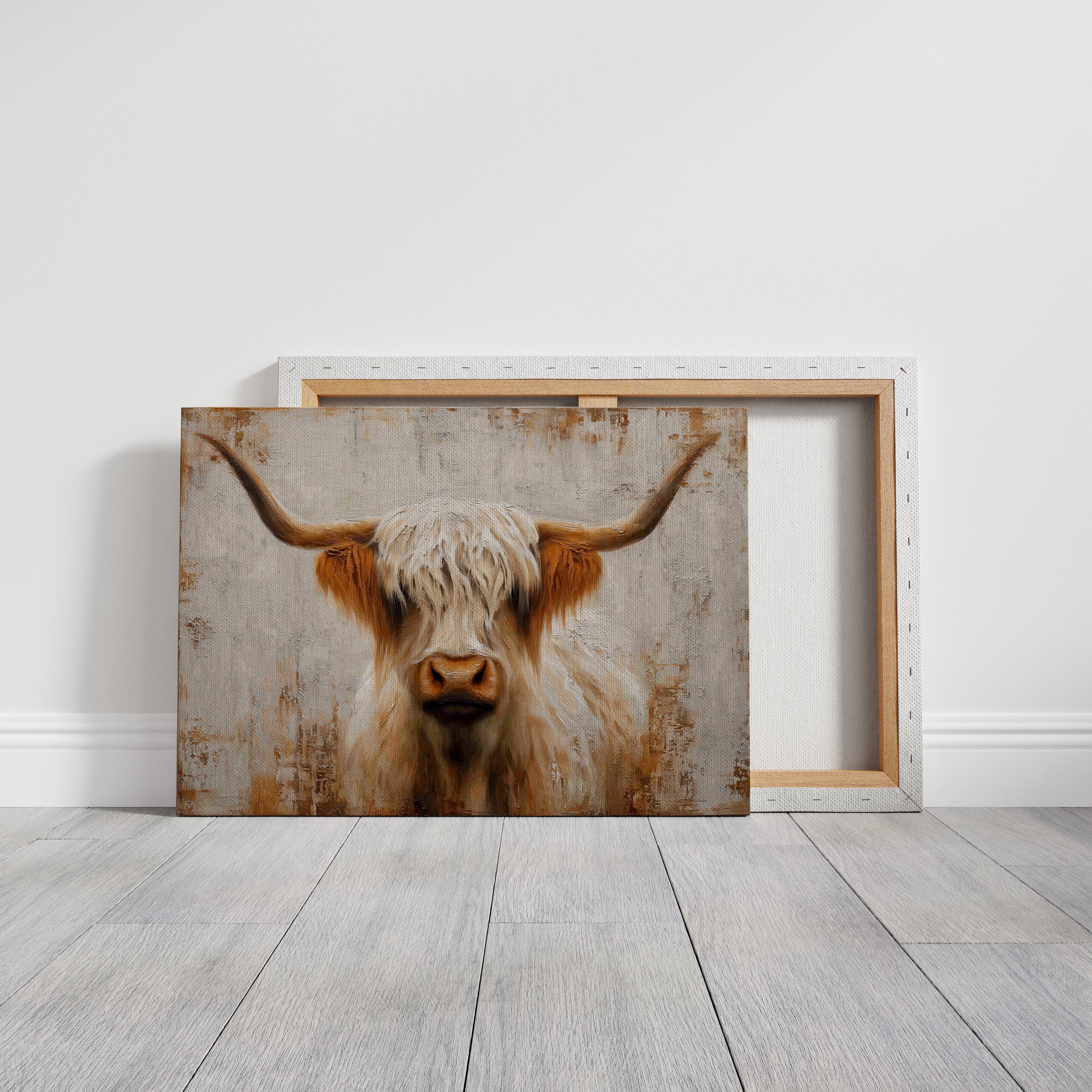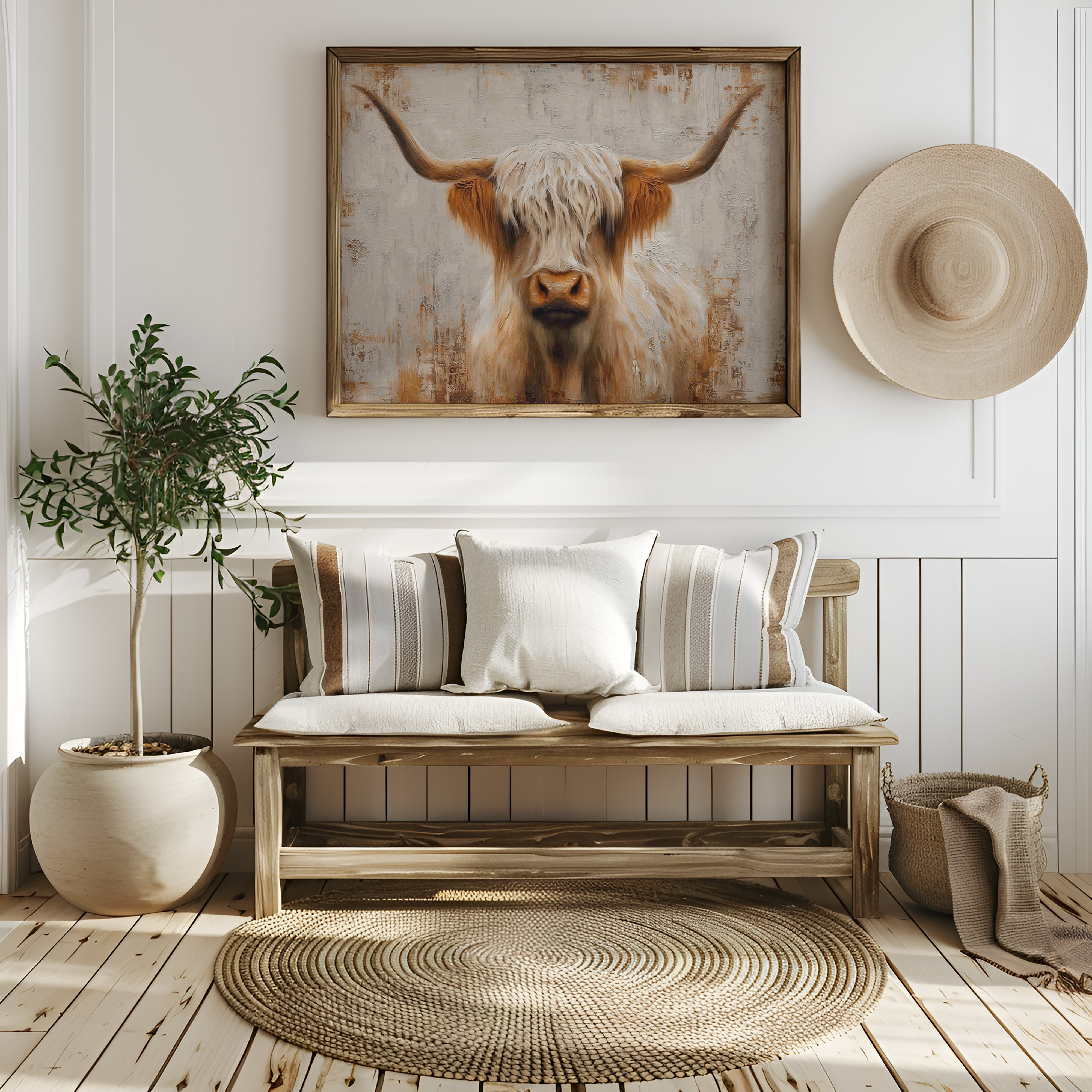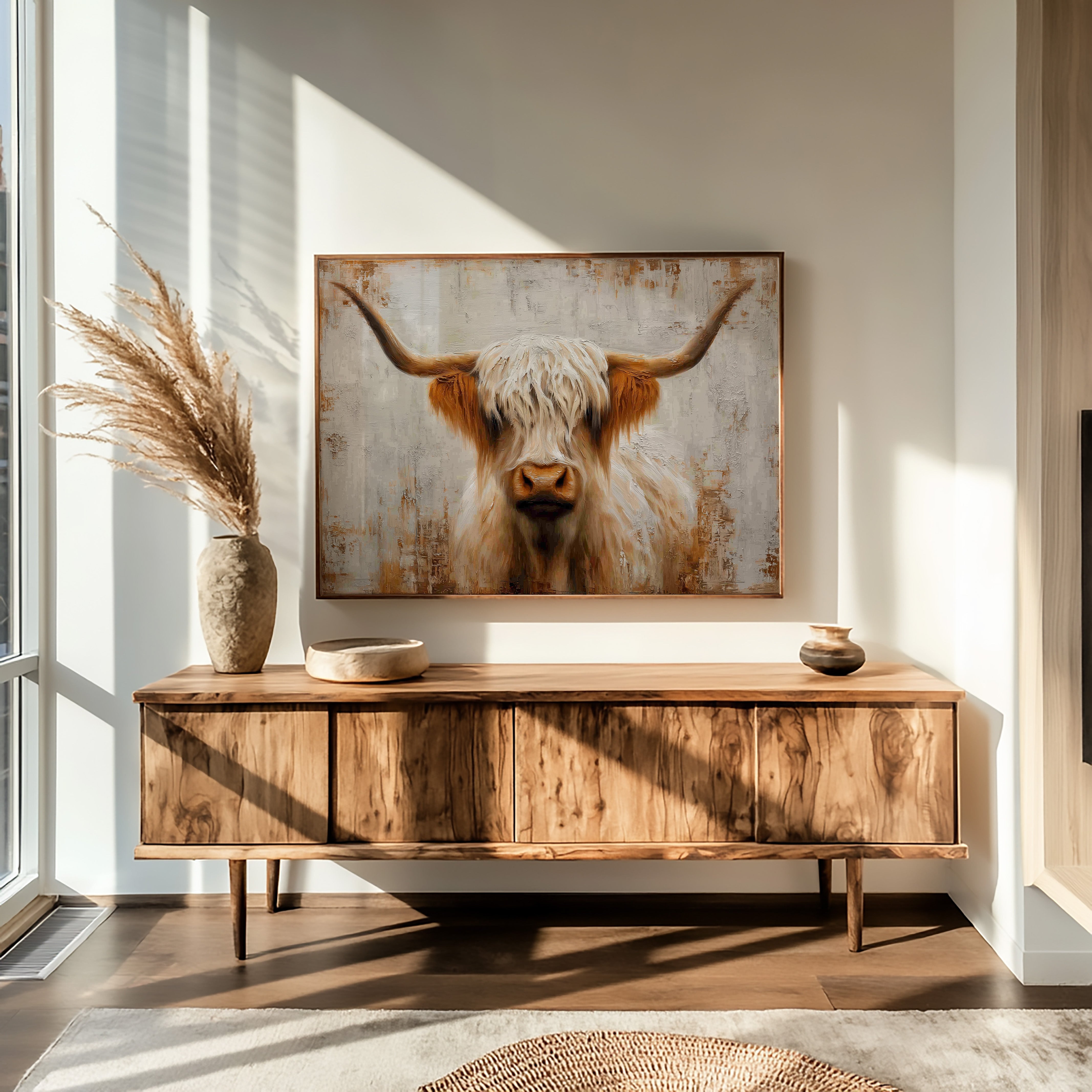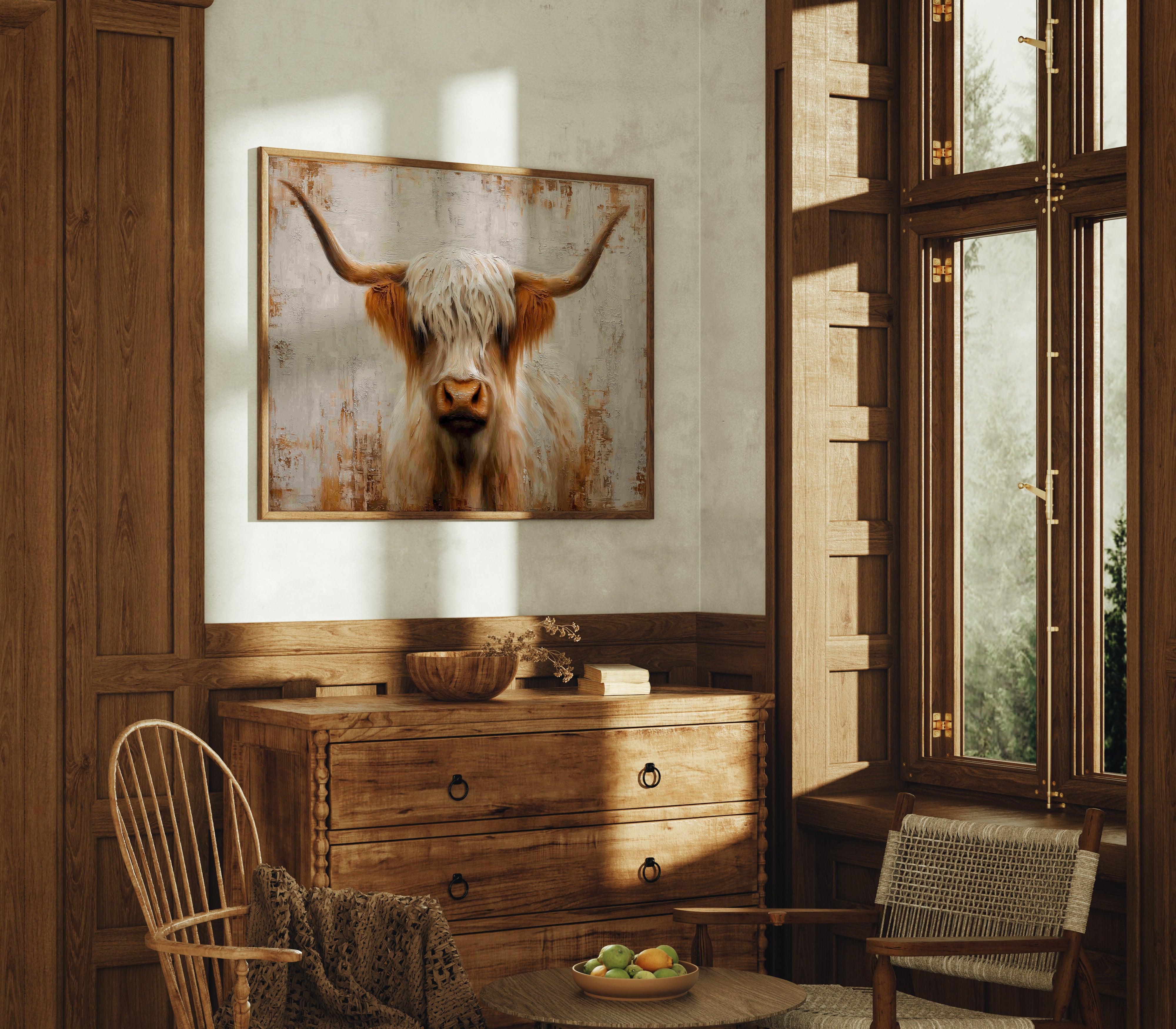 A gentle giant emerges from a misty canvas, his cream-colored mane catching the soft glow of daybreak. The Highland cow's commanding presence is balanced by the tender expression in his eyes, while rustic copper tones dance across the textured background like autumn memories. His magnificent horns sweep outward with quiet confidence, framing a face that seems to hold ancient Scottish stories. Perfect for adding a touch of rustic elegance to modern farmhouse spaces, dining rooms, or any area seeking a blend of strength and serenity.