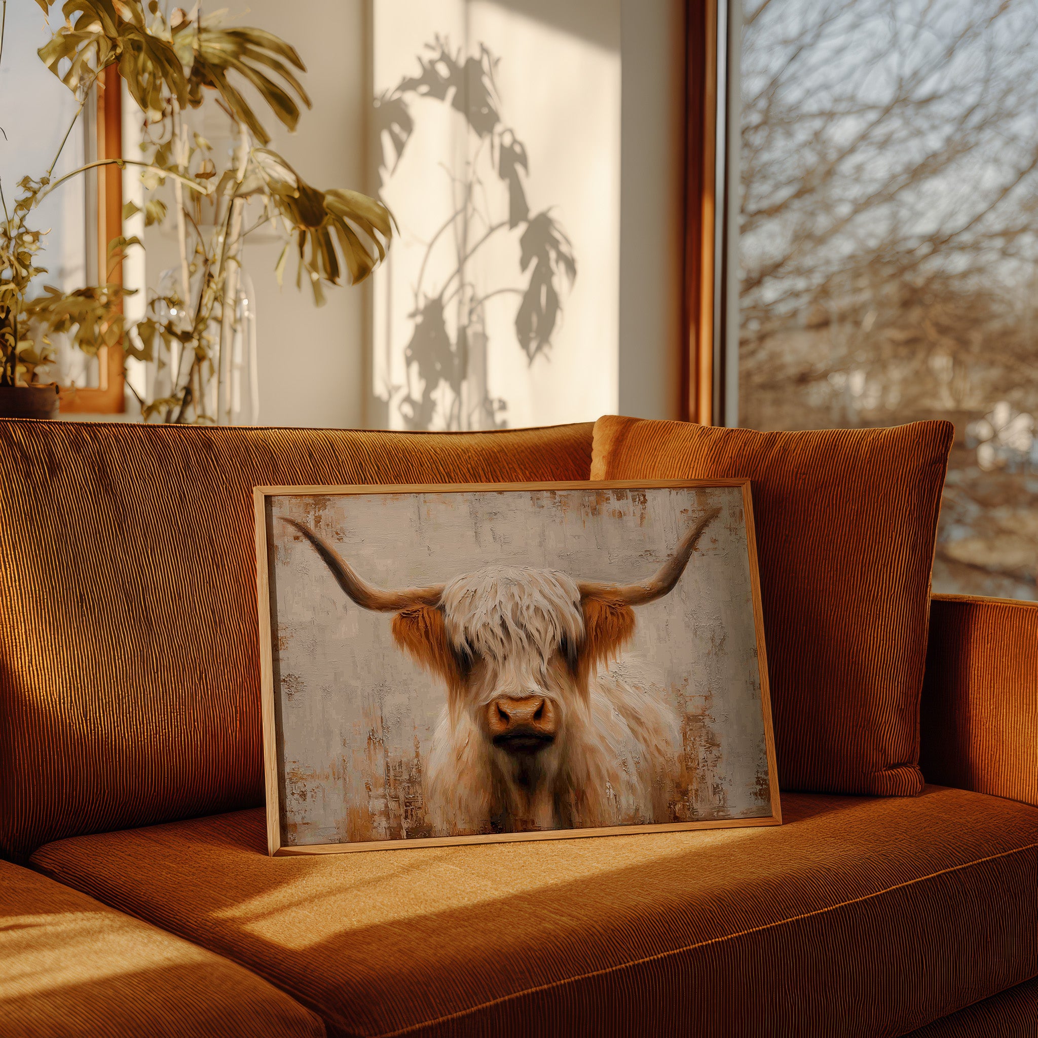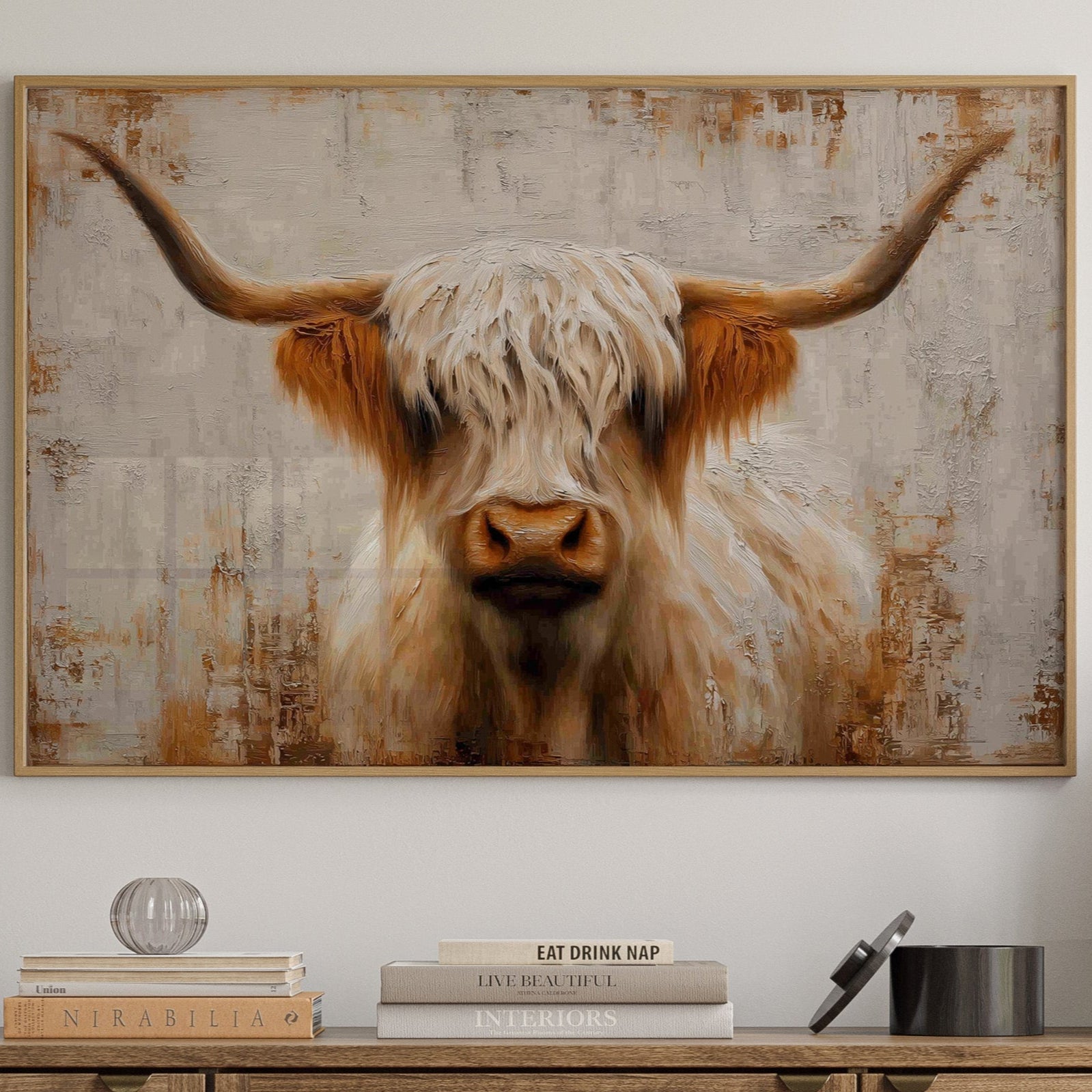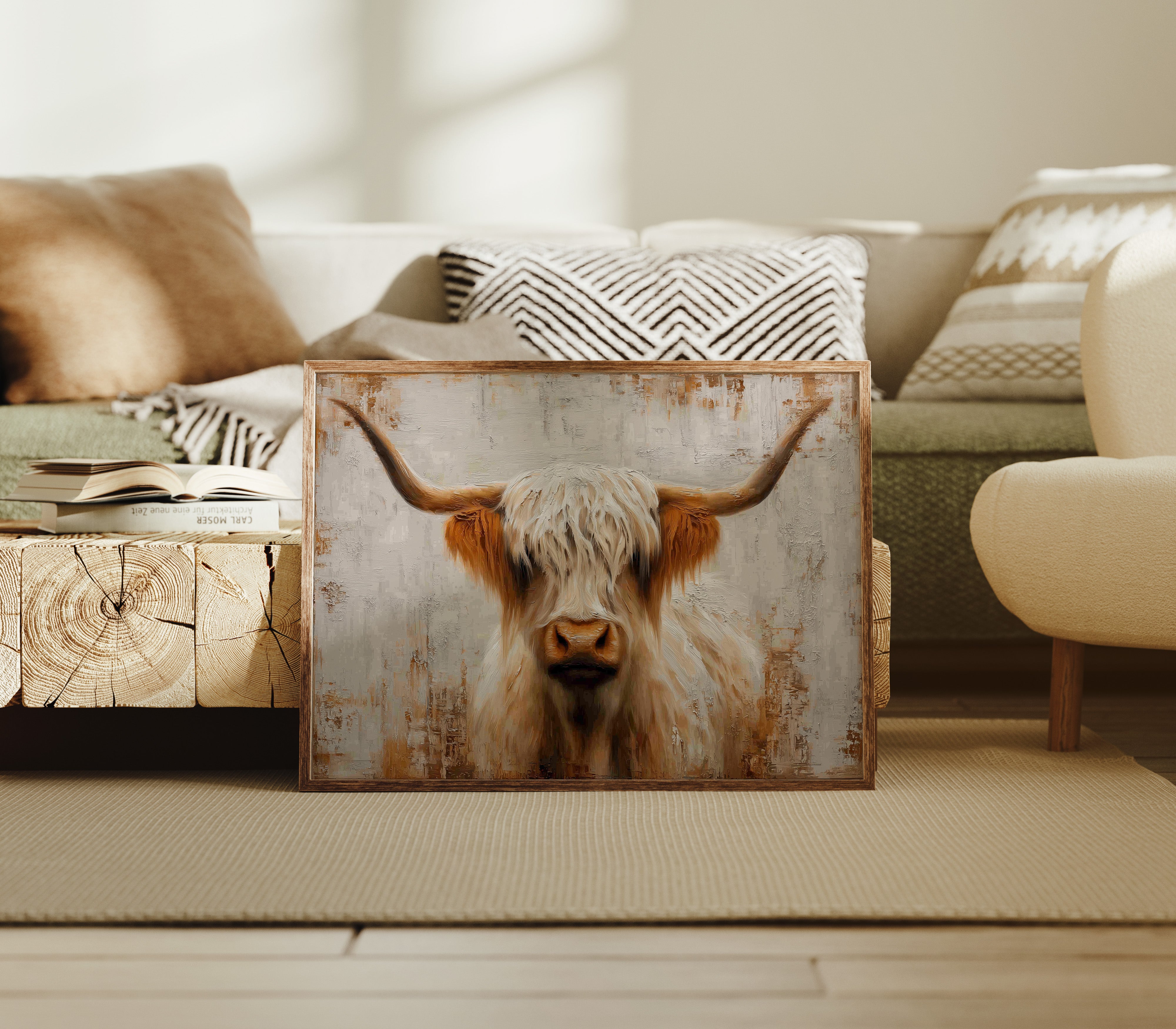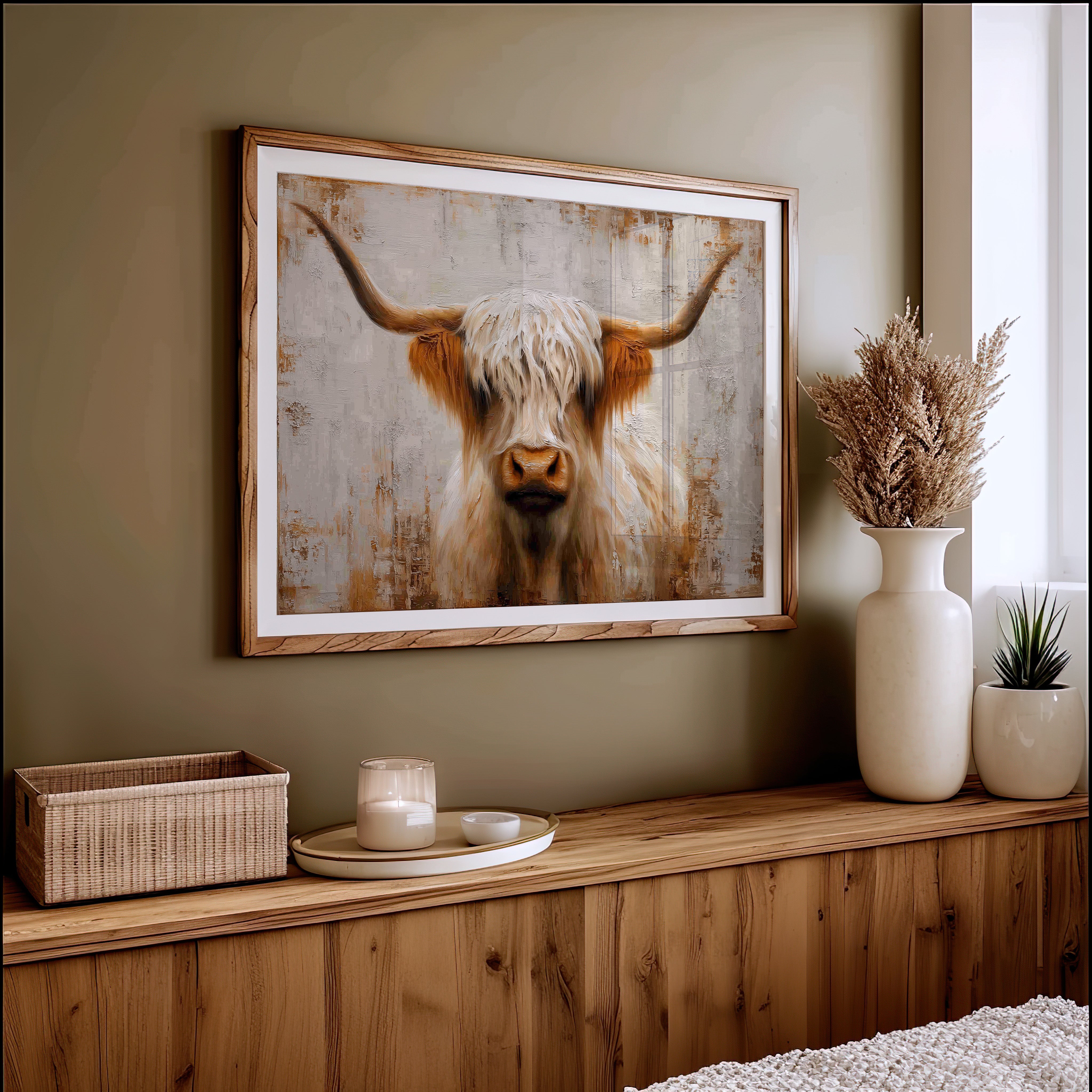 A gentle giant emerges from a misty canvas, his cream-colored mane catching the soft glow of daybreak. The Highland cow's commanding presence is balanced by the tender expression in his eyes, while rustic copper tones dance across the textured background like autumn memories. His magnificent horns sweep outward with quiet confidence, framing a face that seems to hold ancient Scottish stories. Perfect for adding a touch of rustic elegance to modern farmhouse spaces, dining rooms, or any area seeking a blend of strength and serenity.