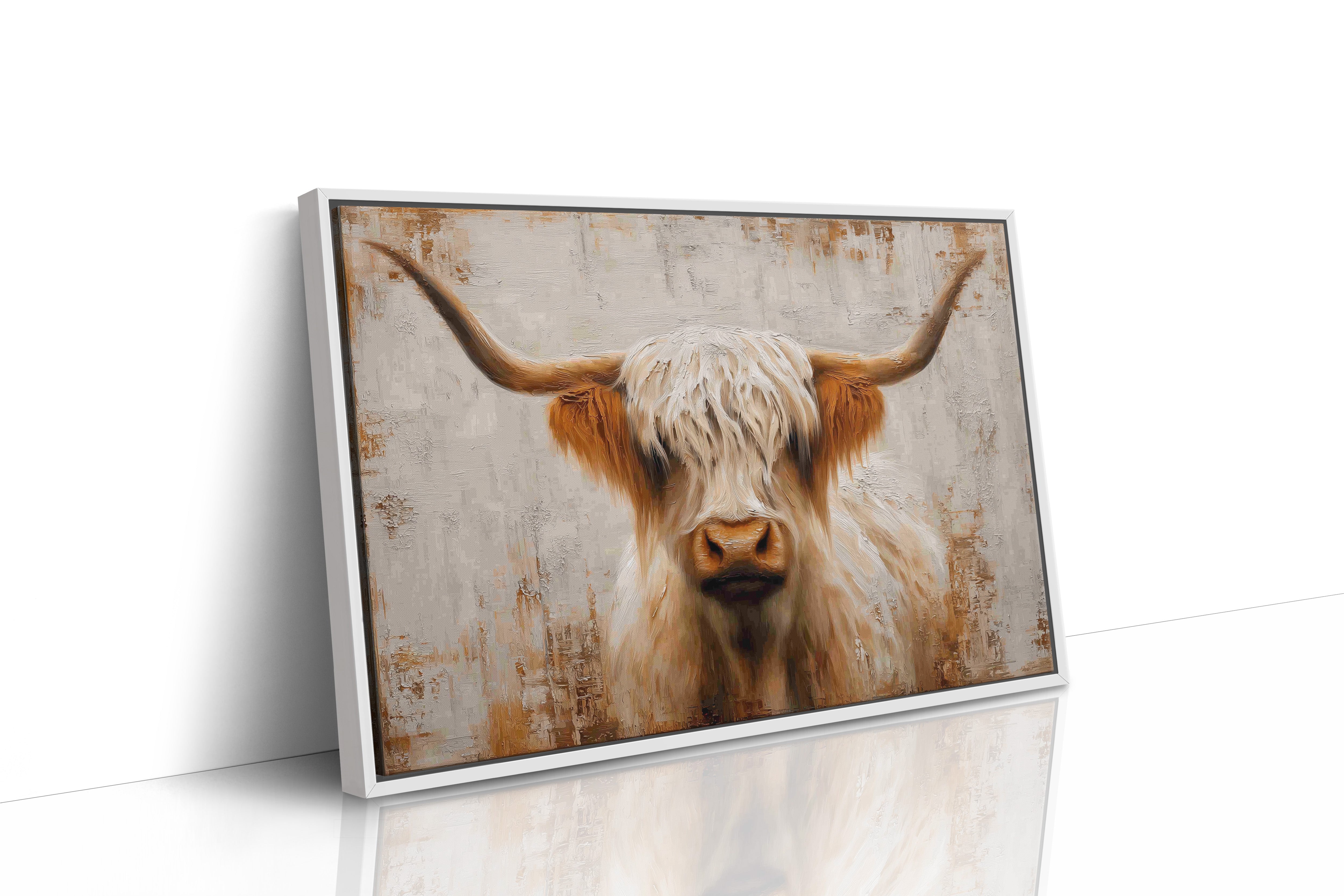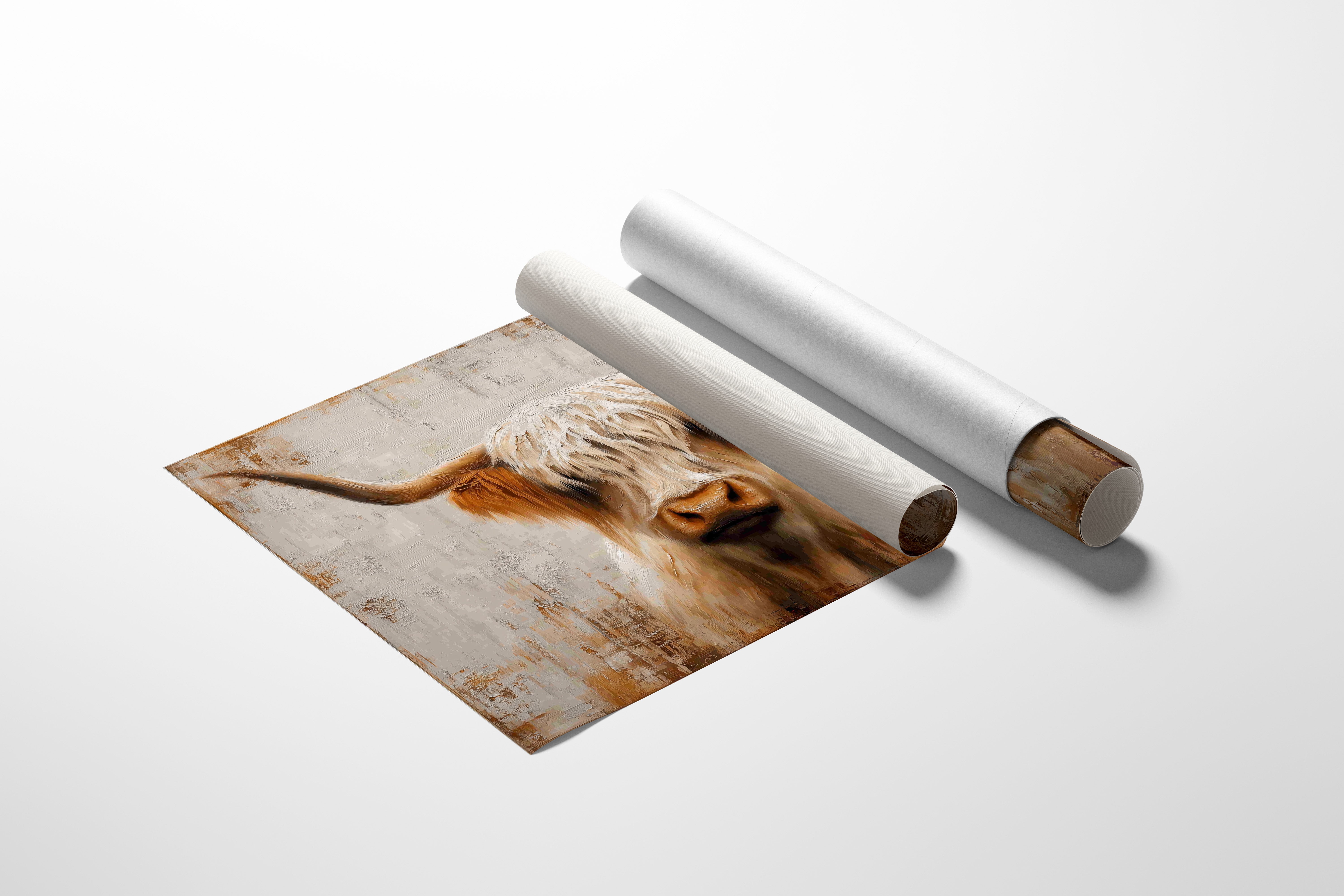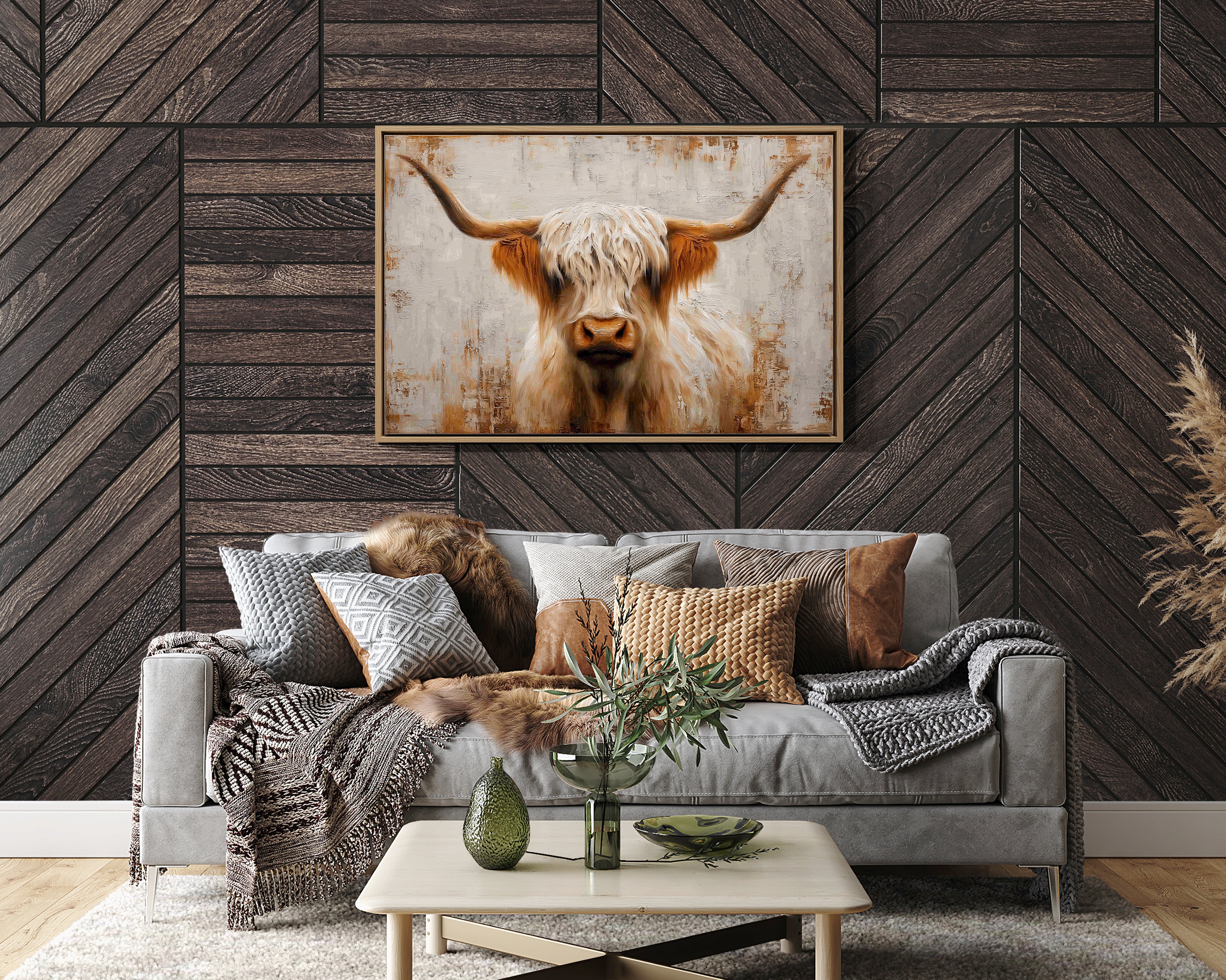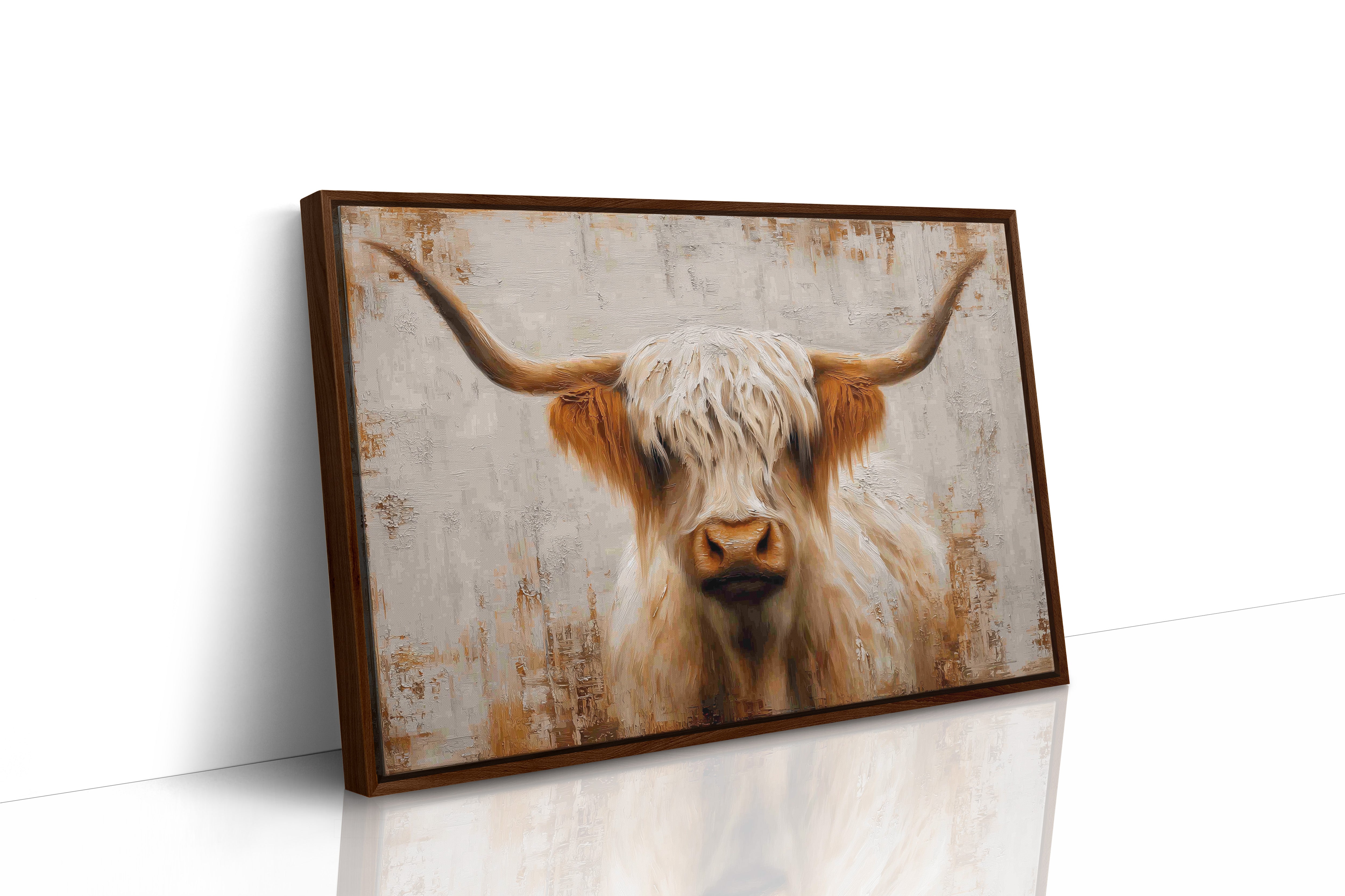 A gentle giant emerges from a misty canvas, his cream-colored mane catching the soft glow of daybreak. The Highland cow's commanding presence is balanced by the tender expression in his eyes, while rustic copper tones dance across the textured background like autumn memories. His magnificent horns sweep outward with quiet confidence, framing a face that seems to hold ancient Scottish stories. Perfect for adding a touch of rustic elegance to modern farmhouse spaces, dining rooms, or any area seeking a blend of strength and serenity.