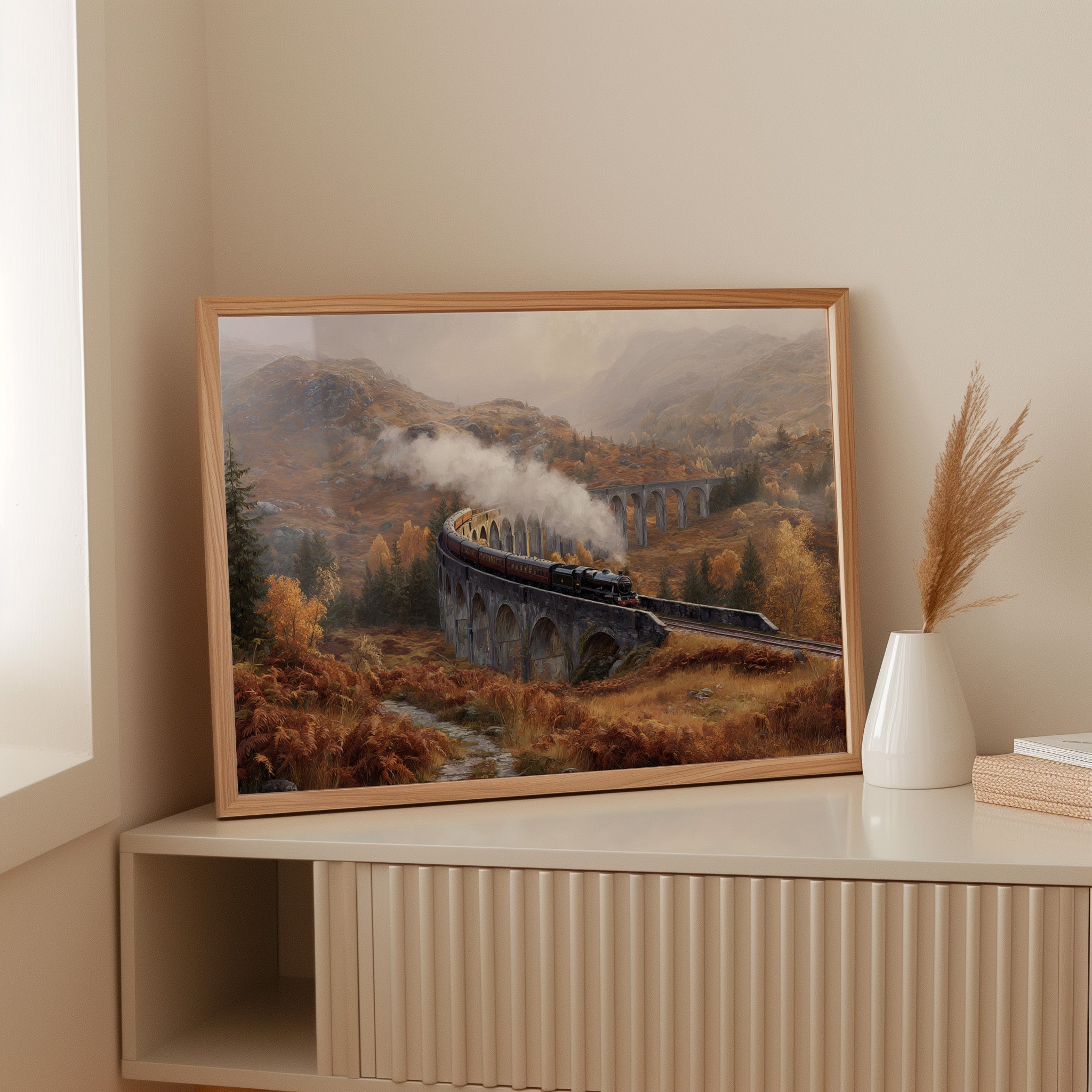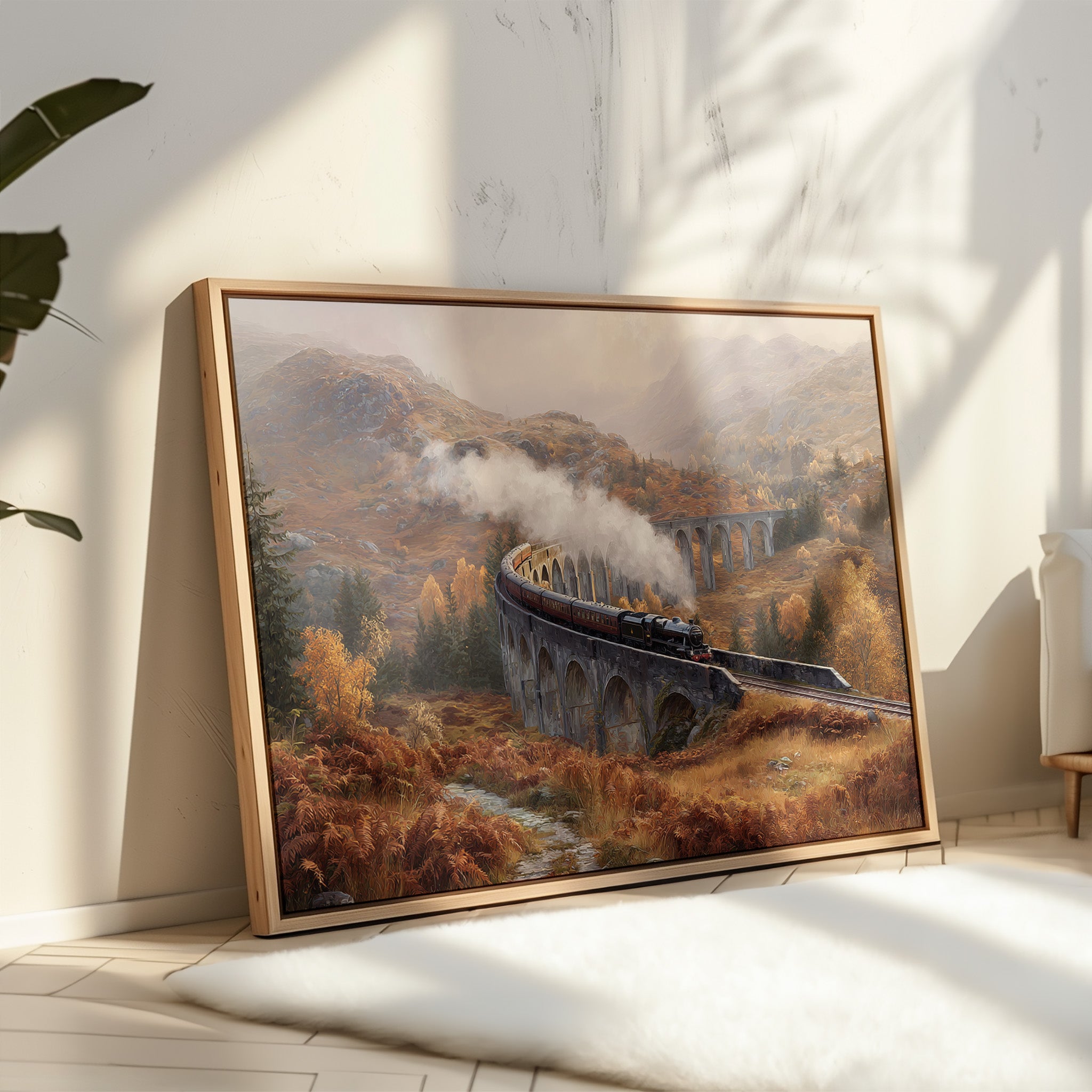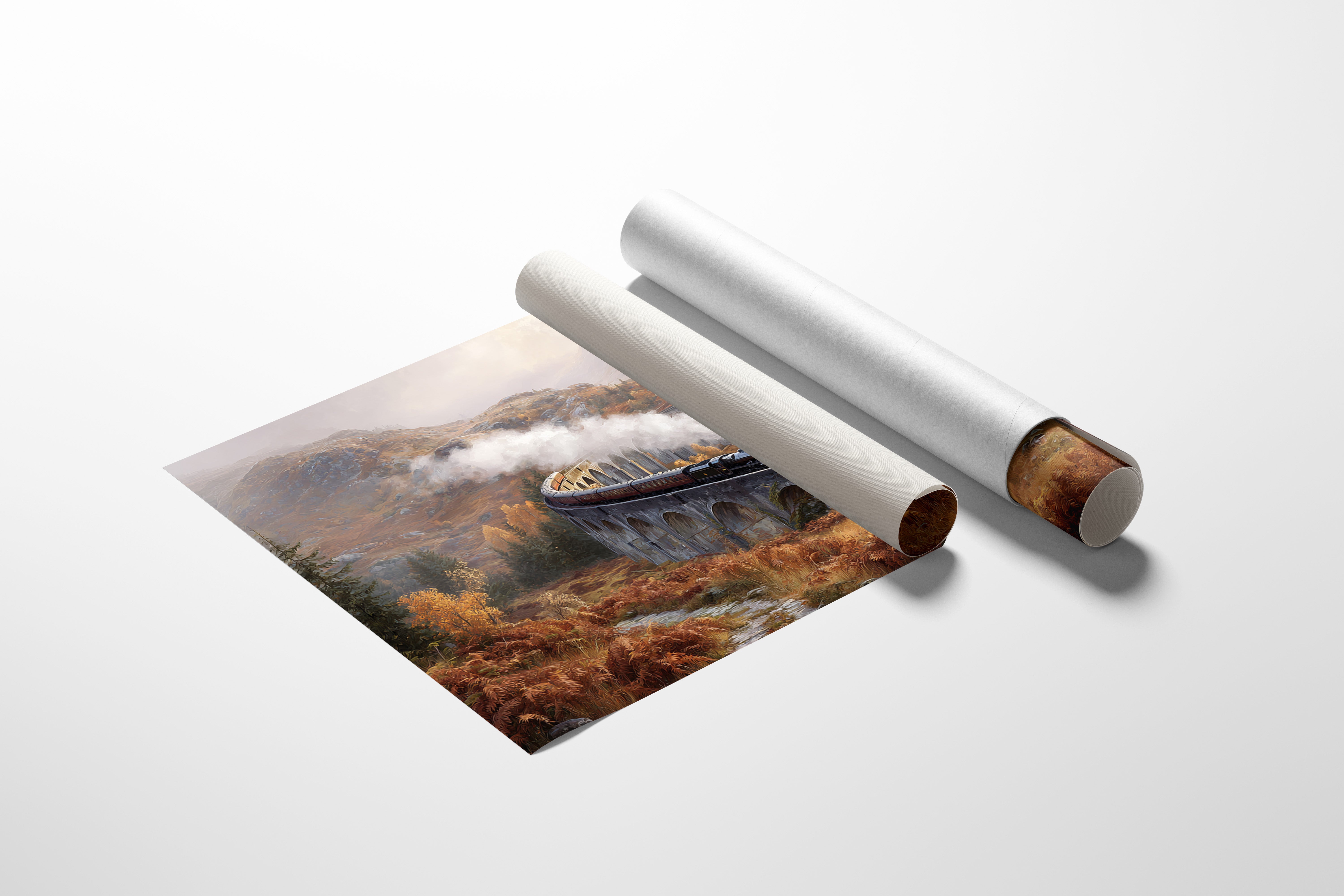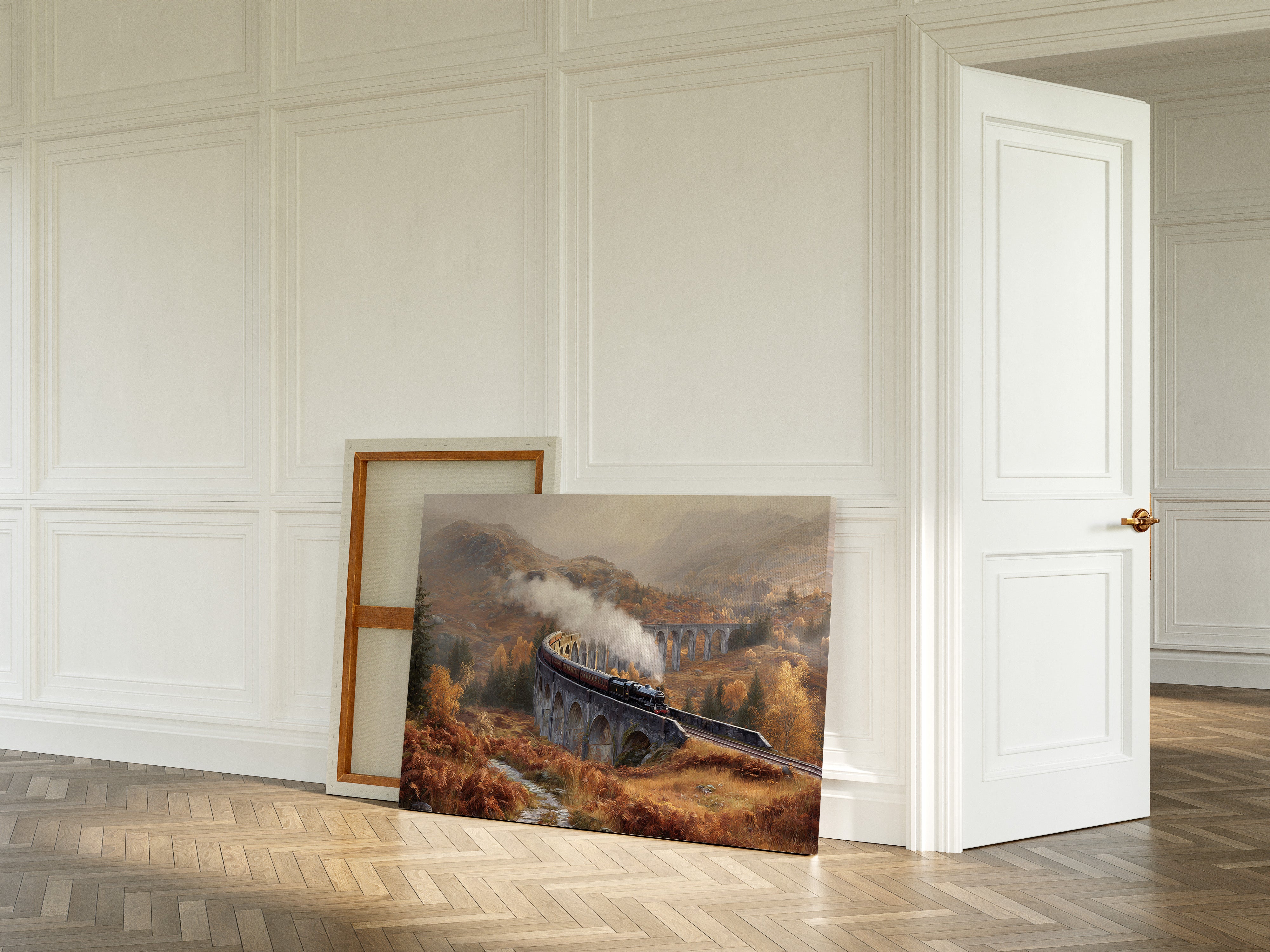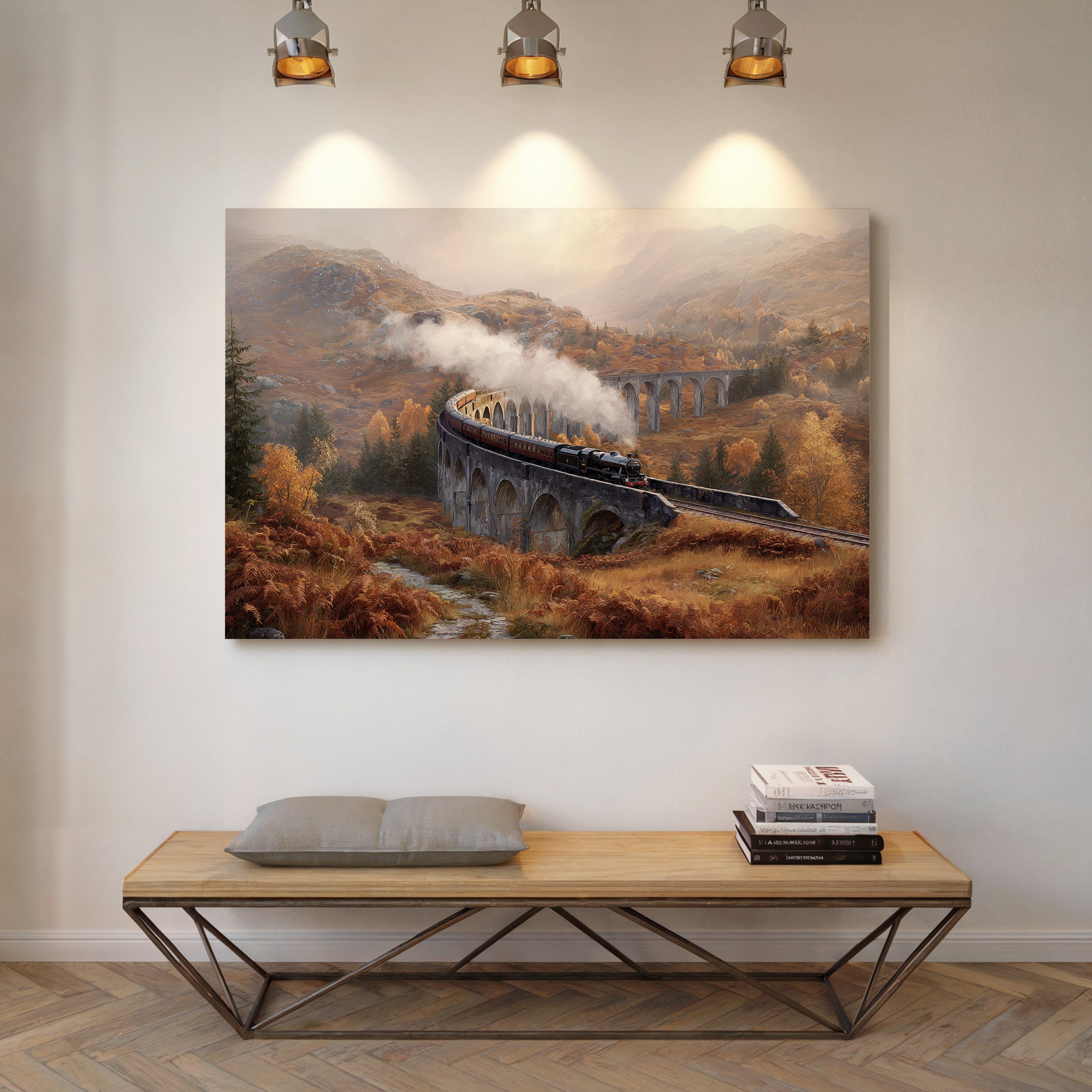 Steam billows against an autumn sky as a vintage locomotive winds its way across a majestic stone viaduct. The scene captures a moment where engineering marvel meets natural splendor, with the curved bridge stretching gracefully through the Scottish highlands. Golden ferns and russet trees frame the scene, while misty mountains fade into the distance, creating layers of amber and grey. This nostalgic vista speaks to both the romance of rail travel and the timeless beauty of highland landscapes.
