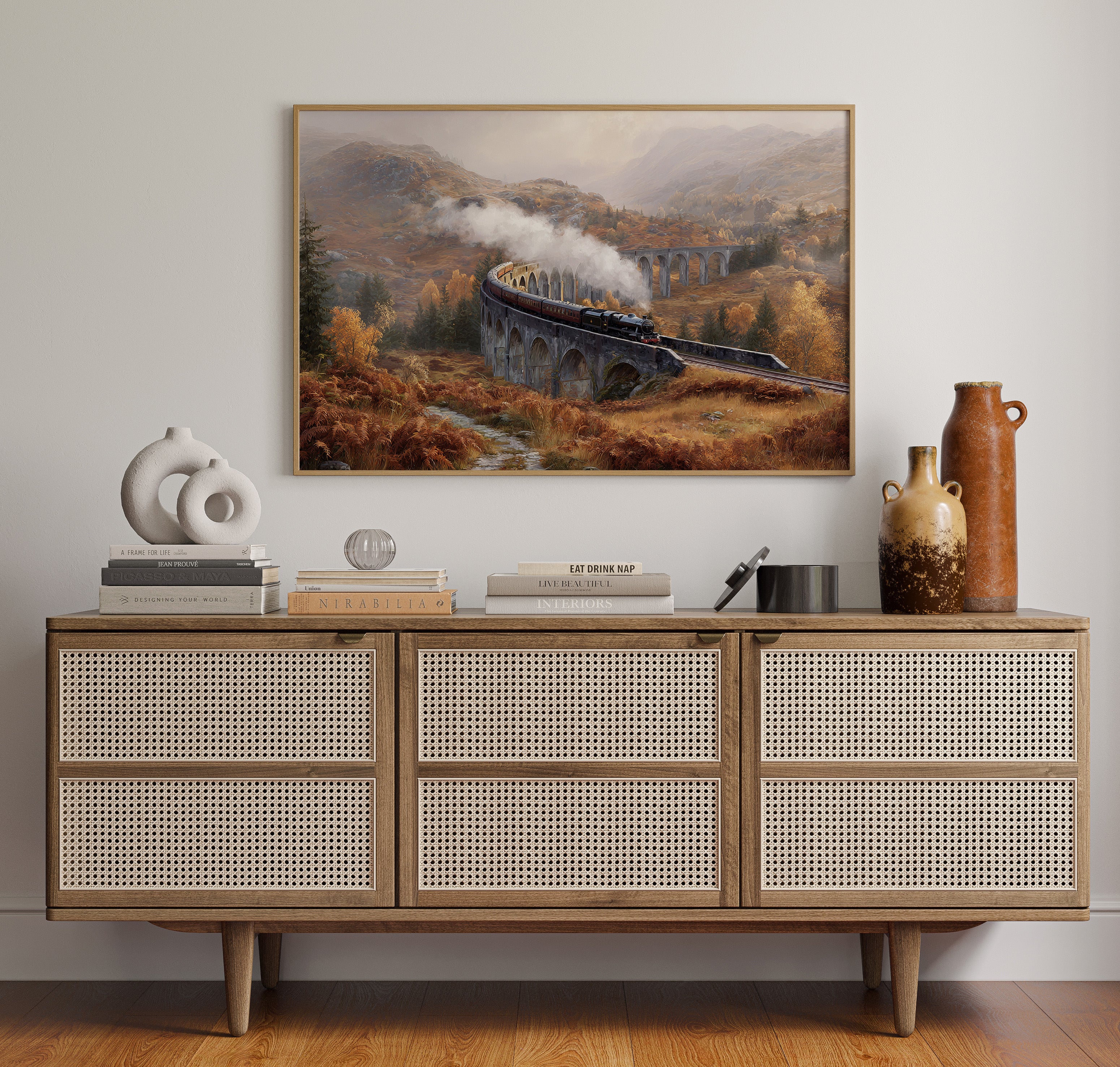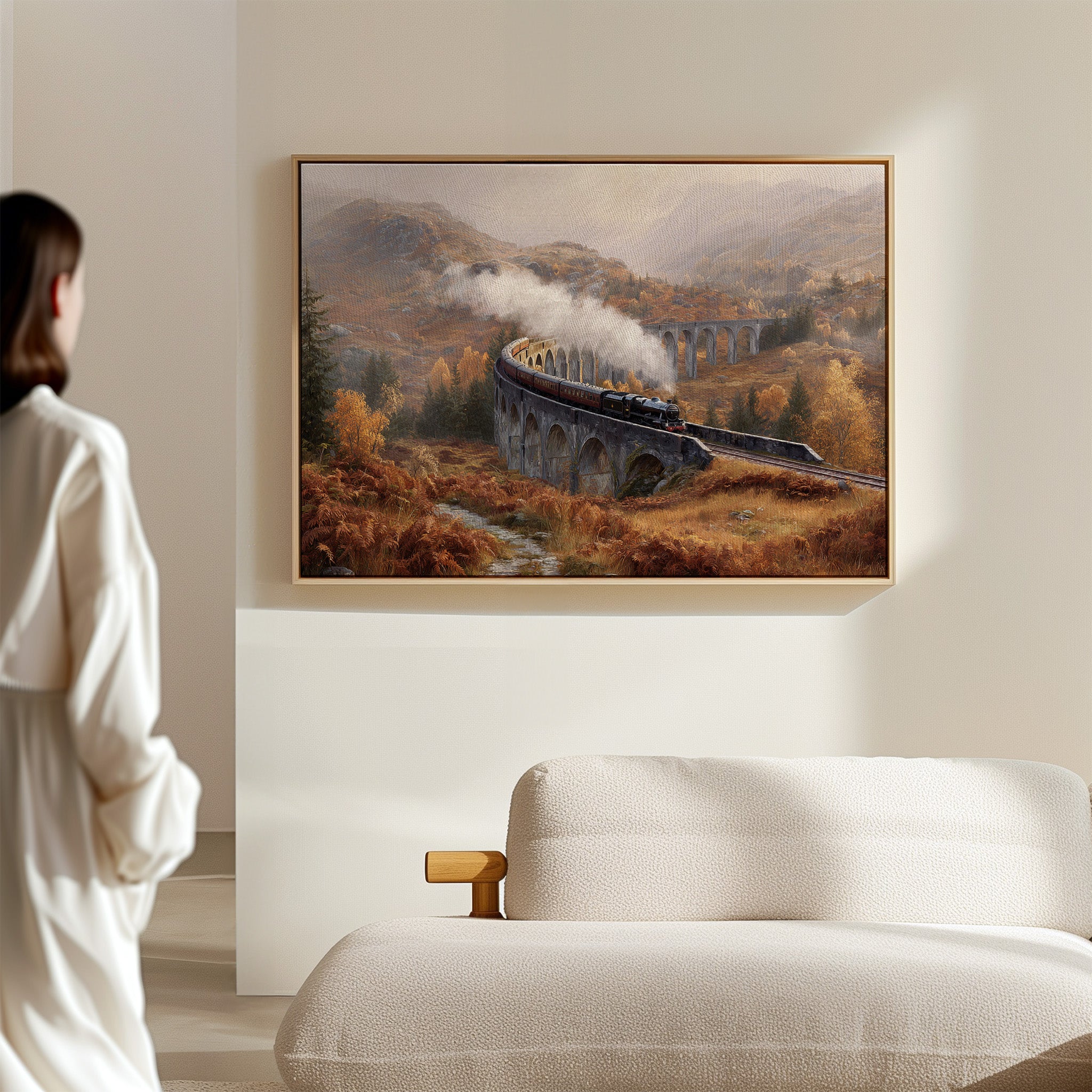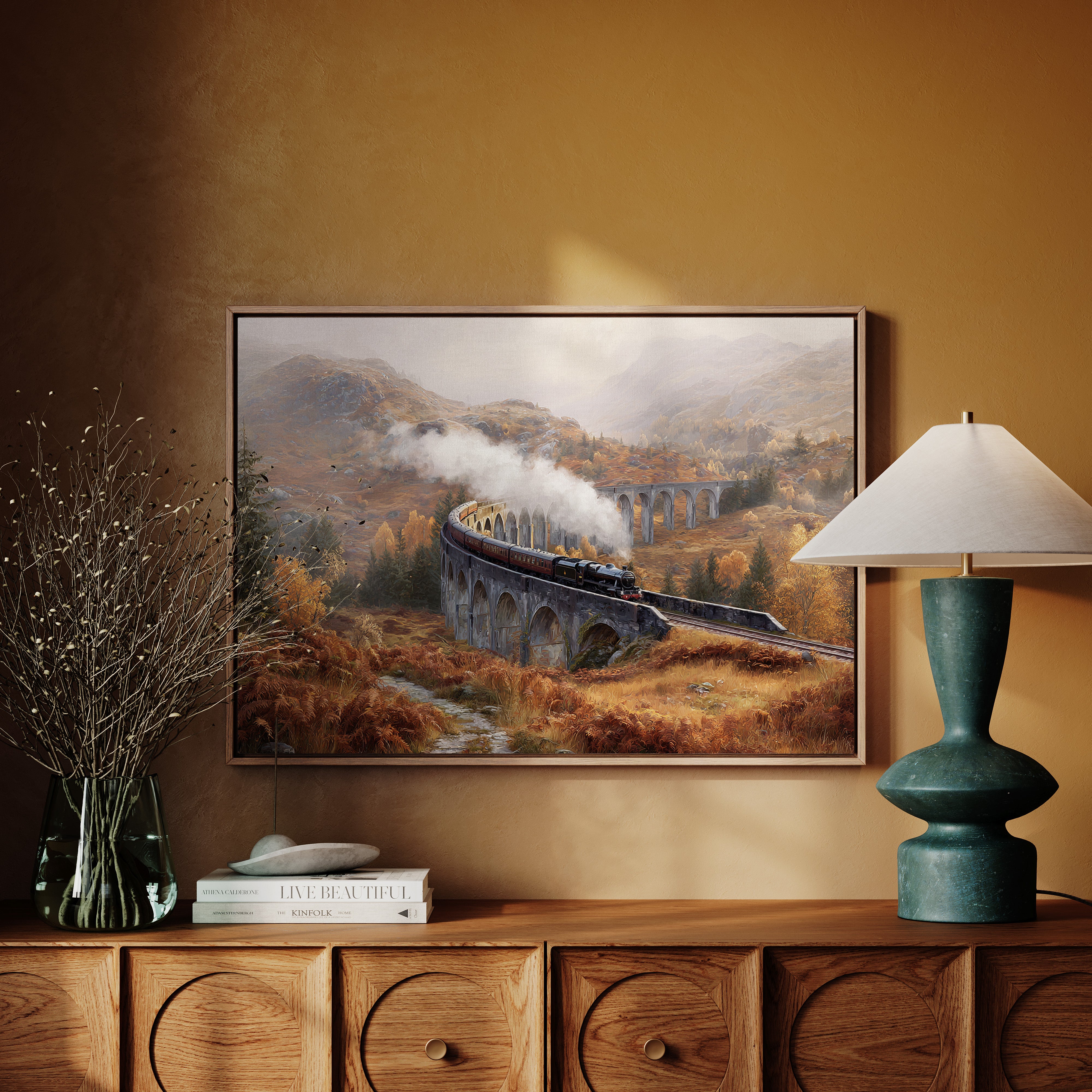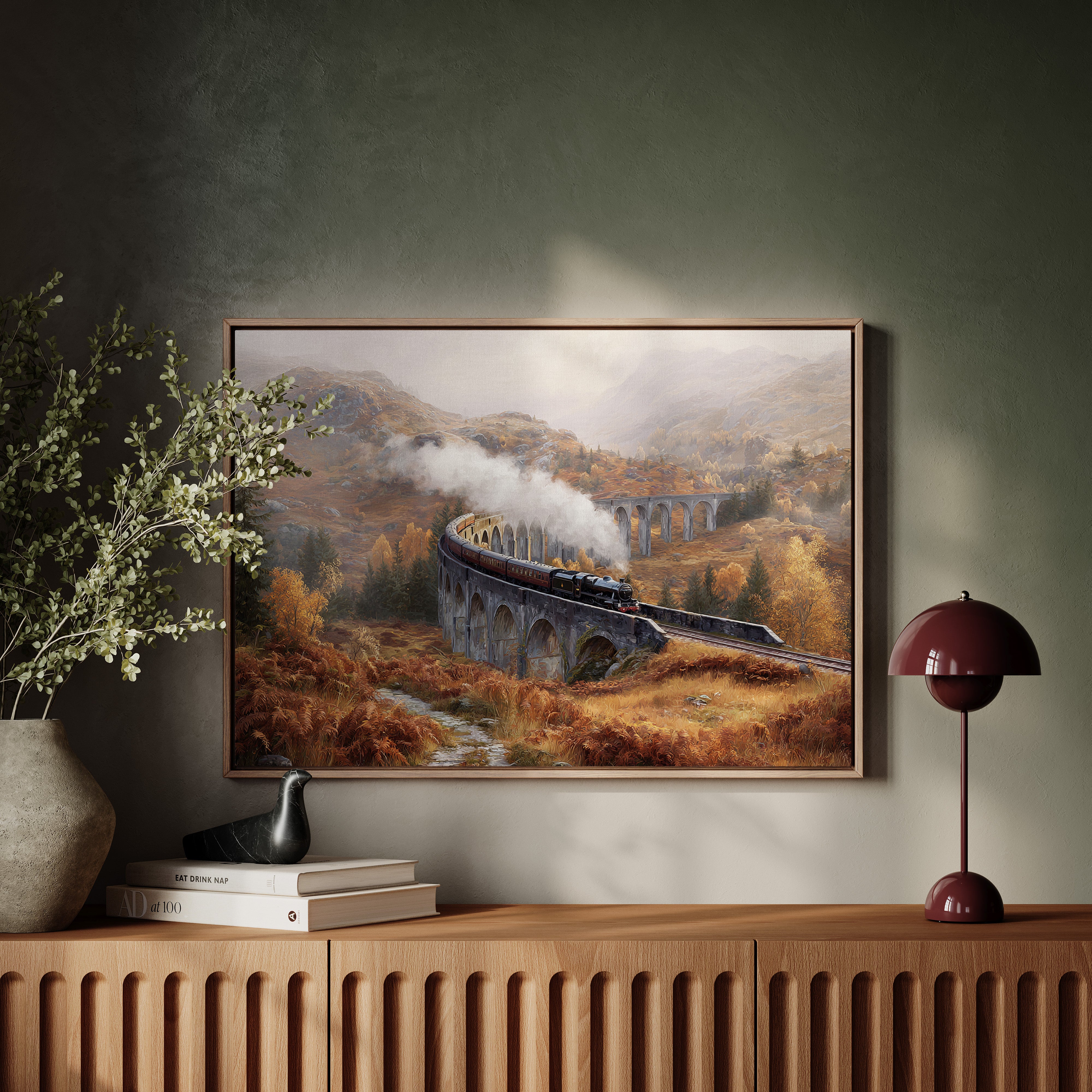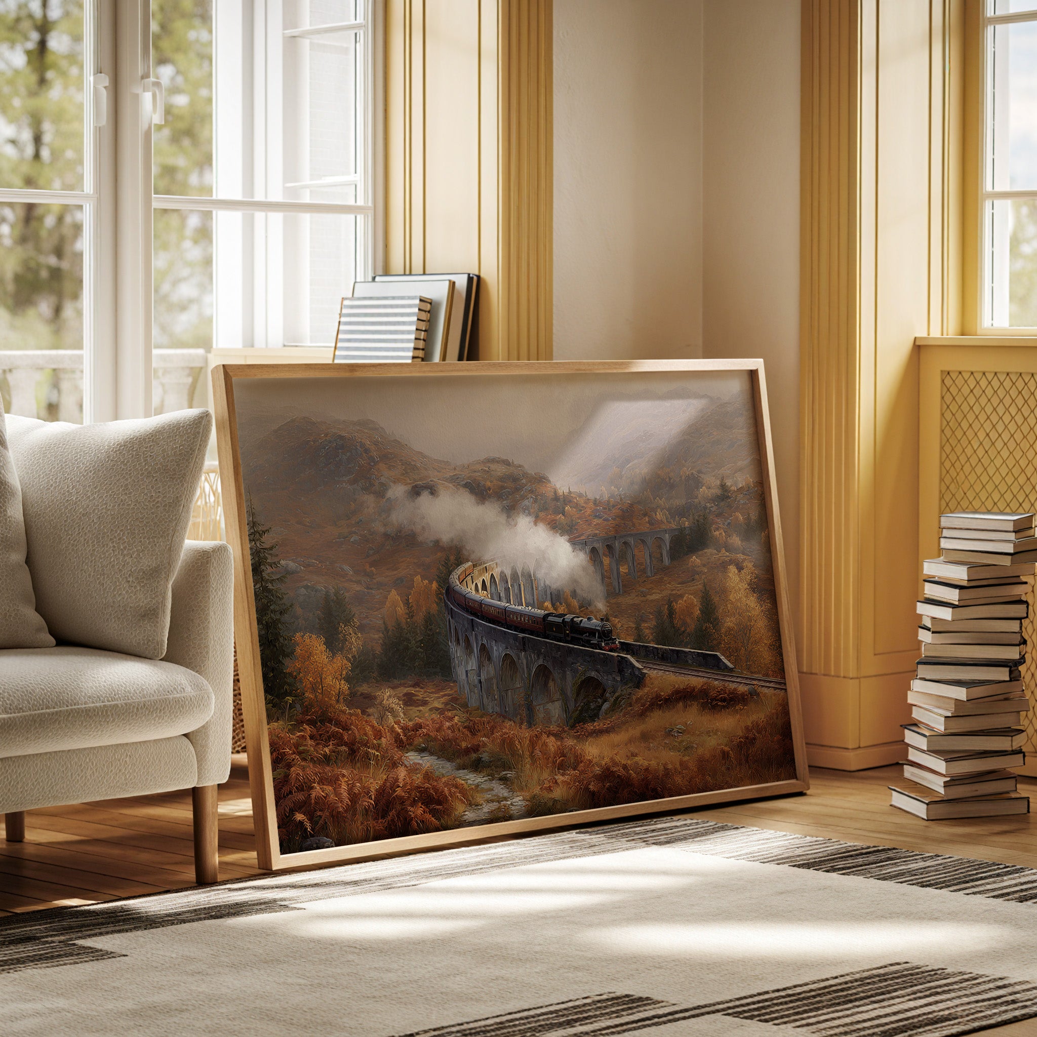 Steam billows against an autumn sky as a vintage locomotive winds its way across a majestic stone viaduct. The scene captures a moment where engineering marvel meets natural splendor, with the curved bridge stretching gracefully through the Scottish highlands. Golden ferns and russet trees frame the scene, while misty mountains fade into the distance, creating layers of amber and grey. This nostalgic vista speaks to both the romance of rail travel and the timeless beauty of highland landscapes.