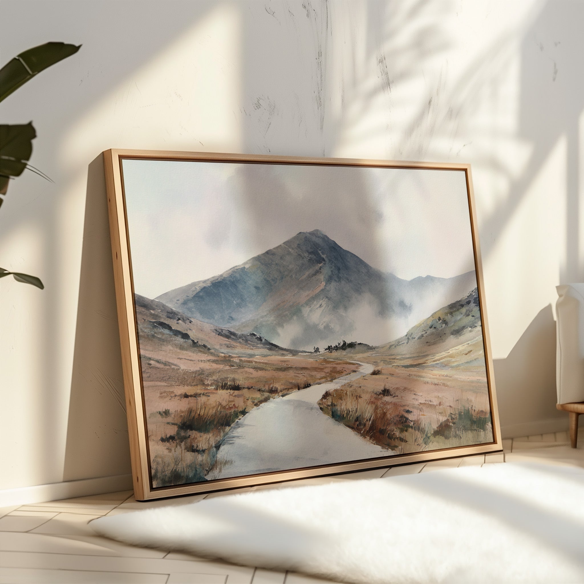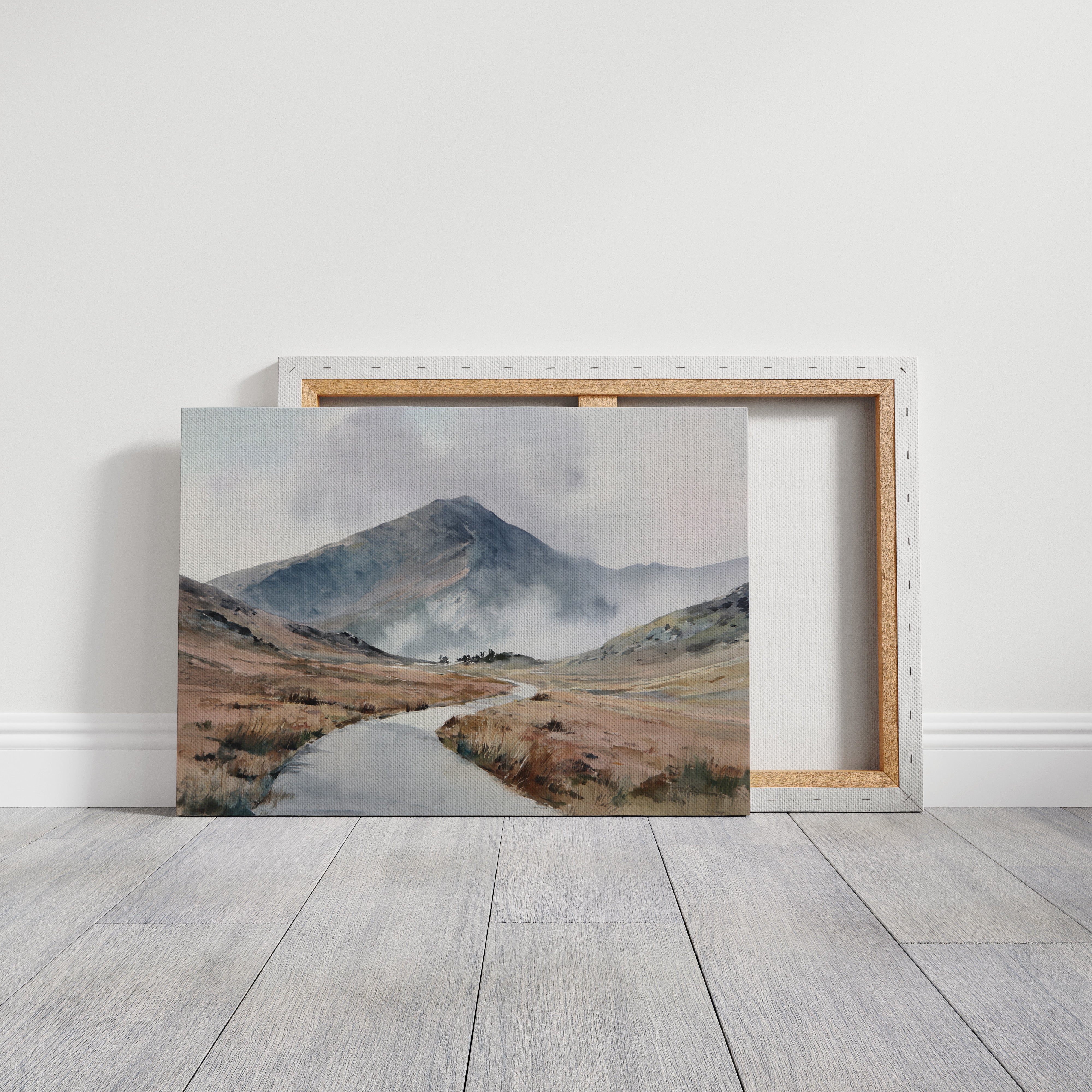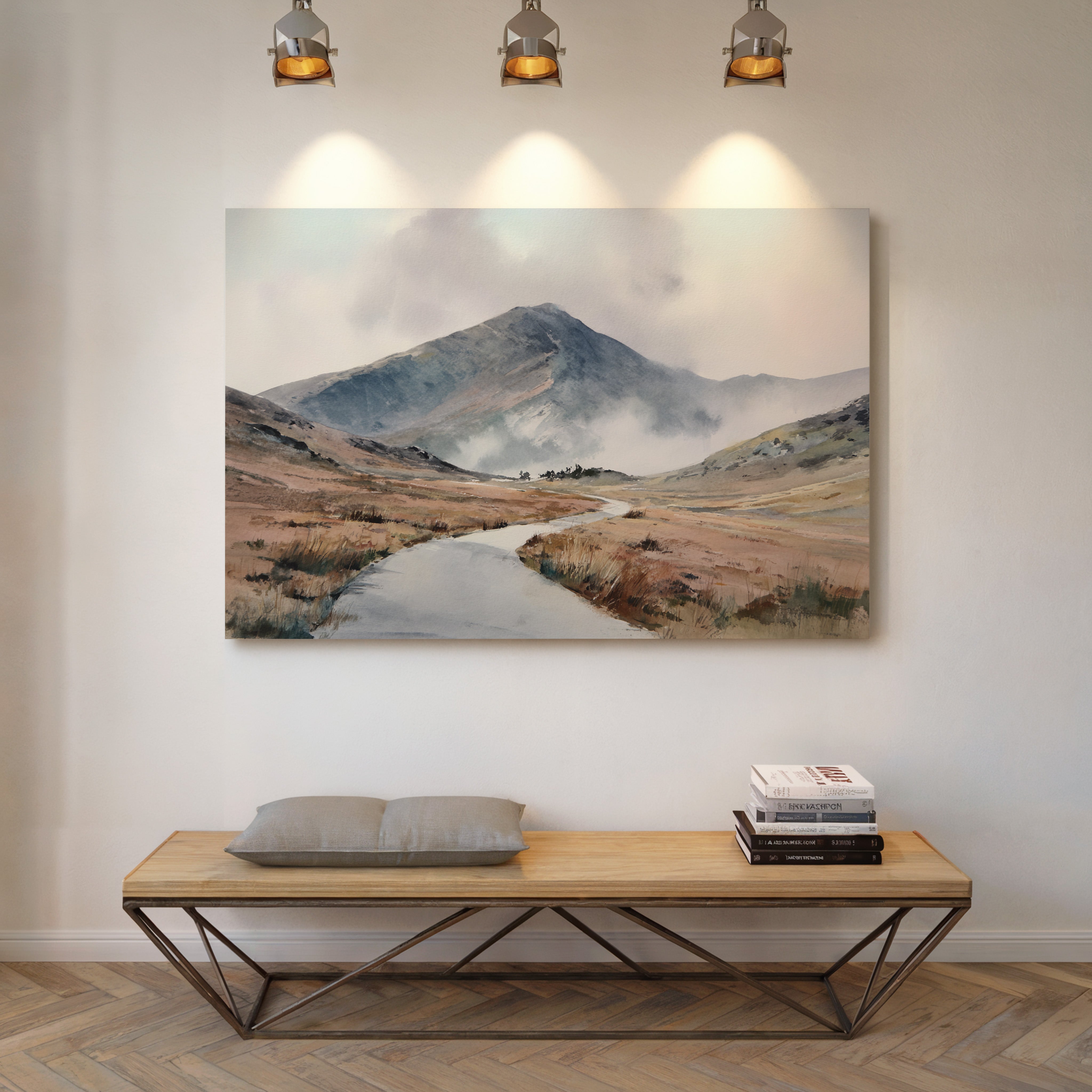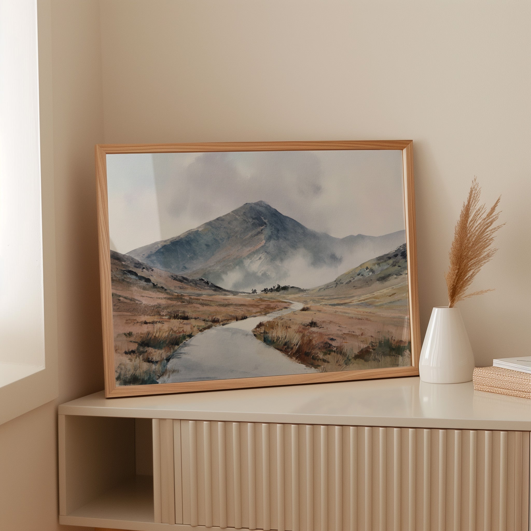 Mist clings to rugged peaks as a silver stream carves its way through the autumn-touched valley. The watercolor landscape captures the raw beauty of highland wilderness, where steel-blue mountains rise dramatically against clouded skies. Earth tones of russet and gold sweep across the moorland, while delicate brushstrokes suggest windswept grasses along the riverbank. This serene yet powerful scene brings the untamed spirit of mountain country into your space, perfect for creating a contemplative focal point in a study or living room where nature's grandeur can be appreciated daily.