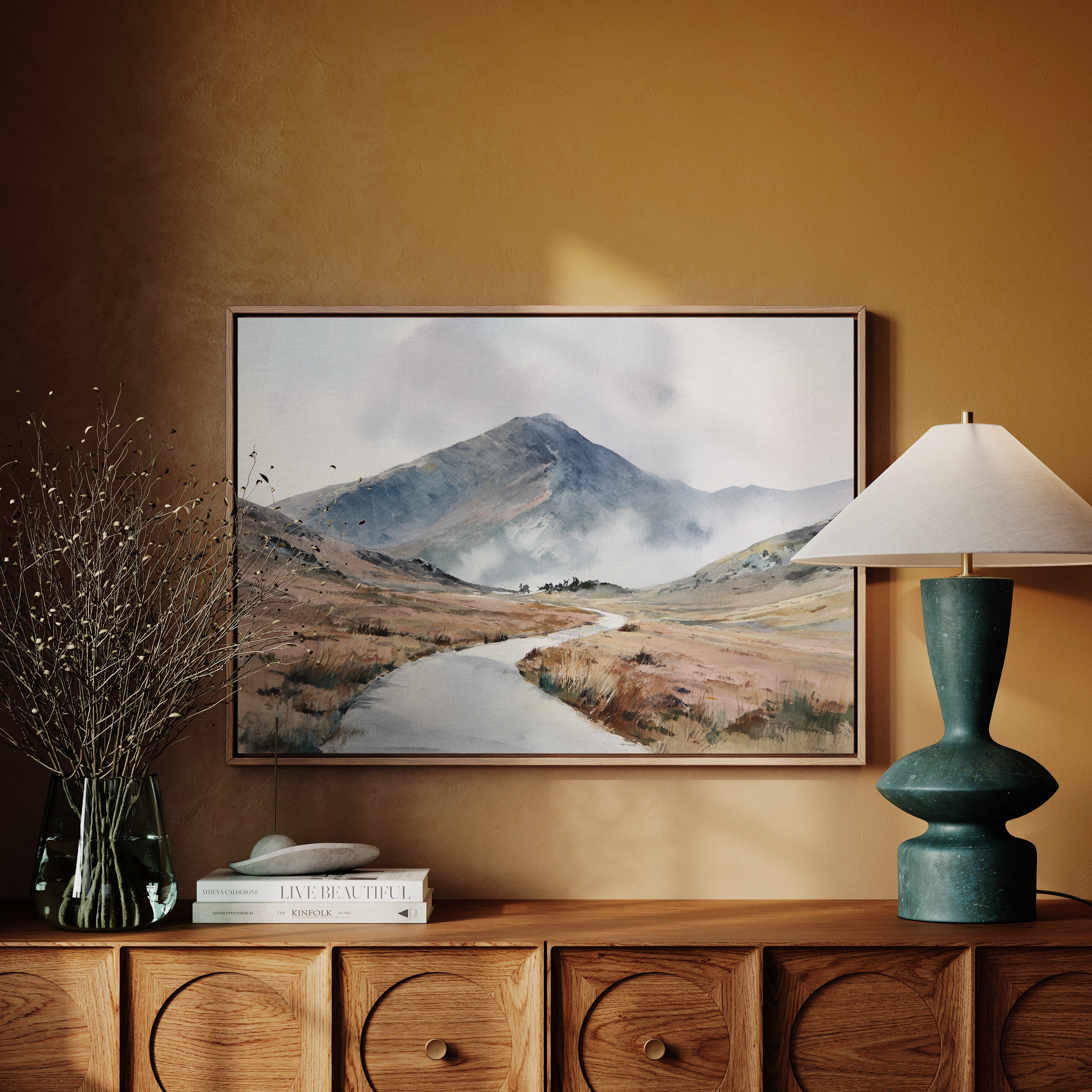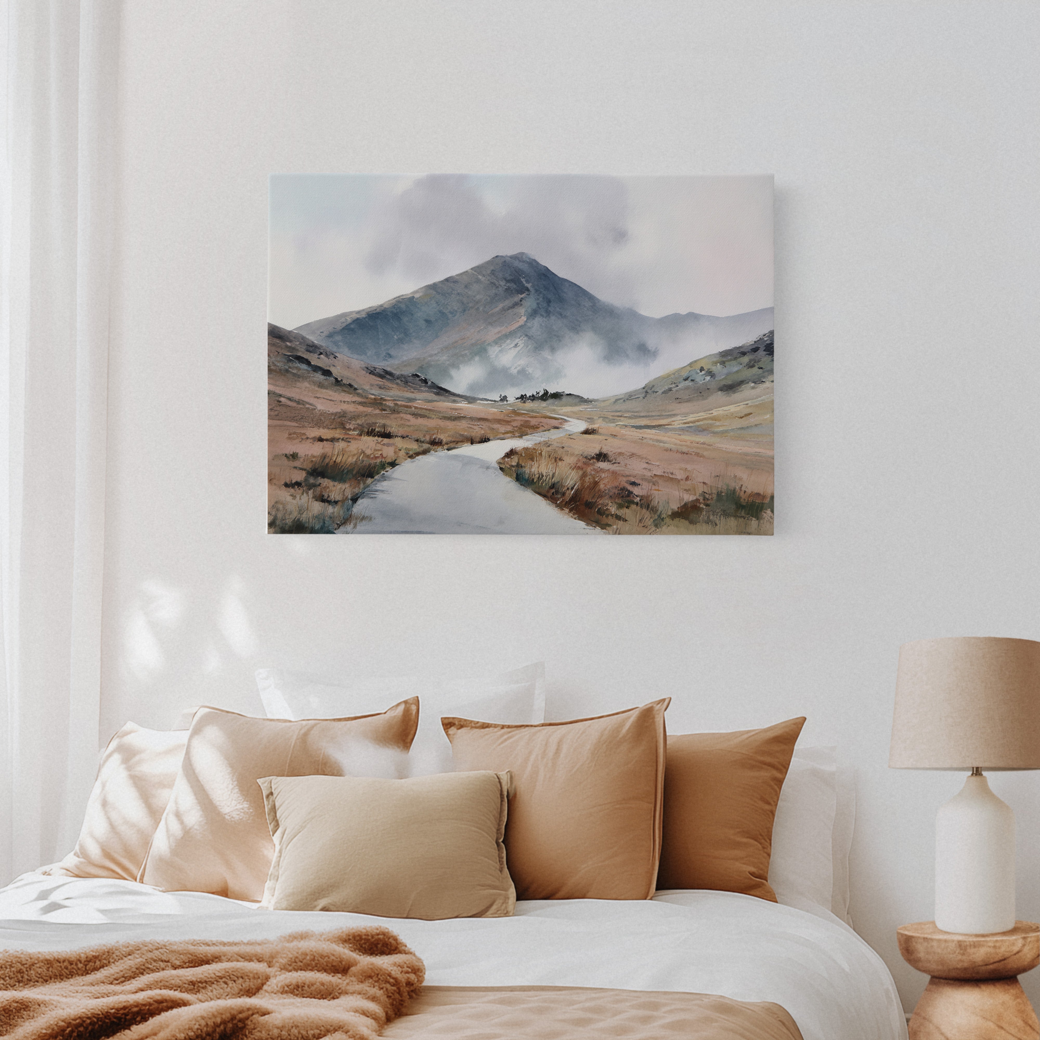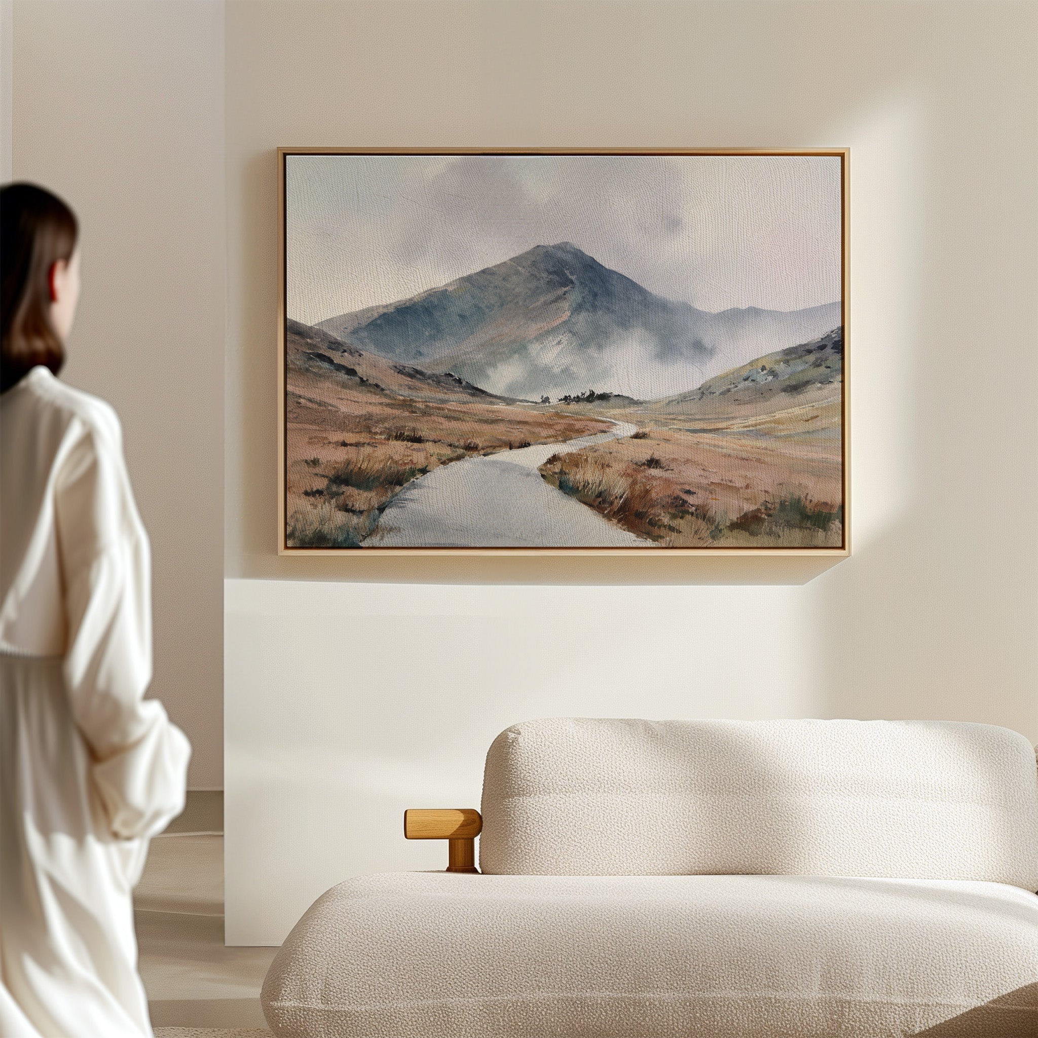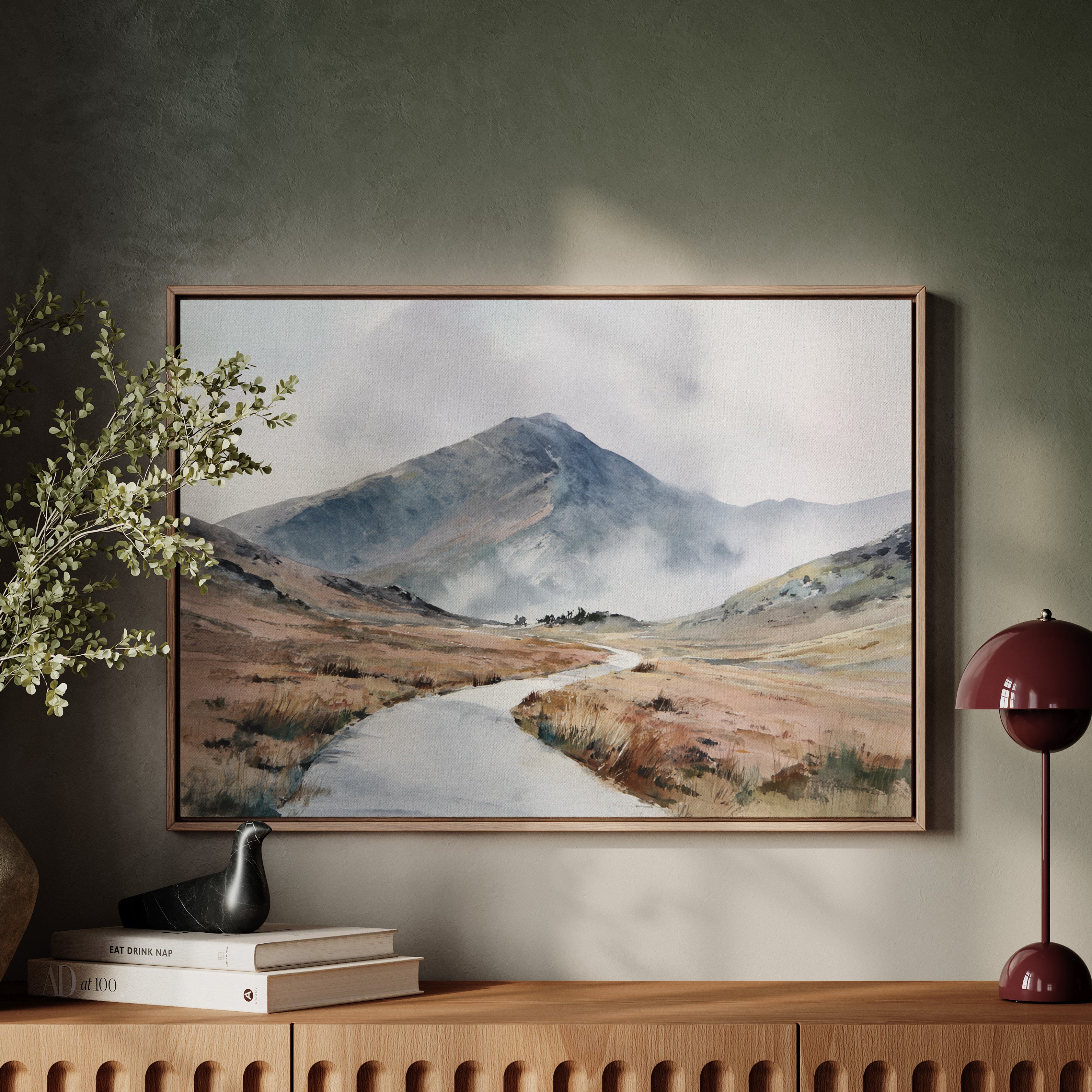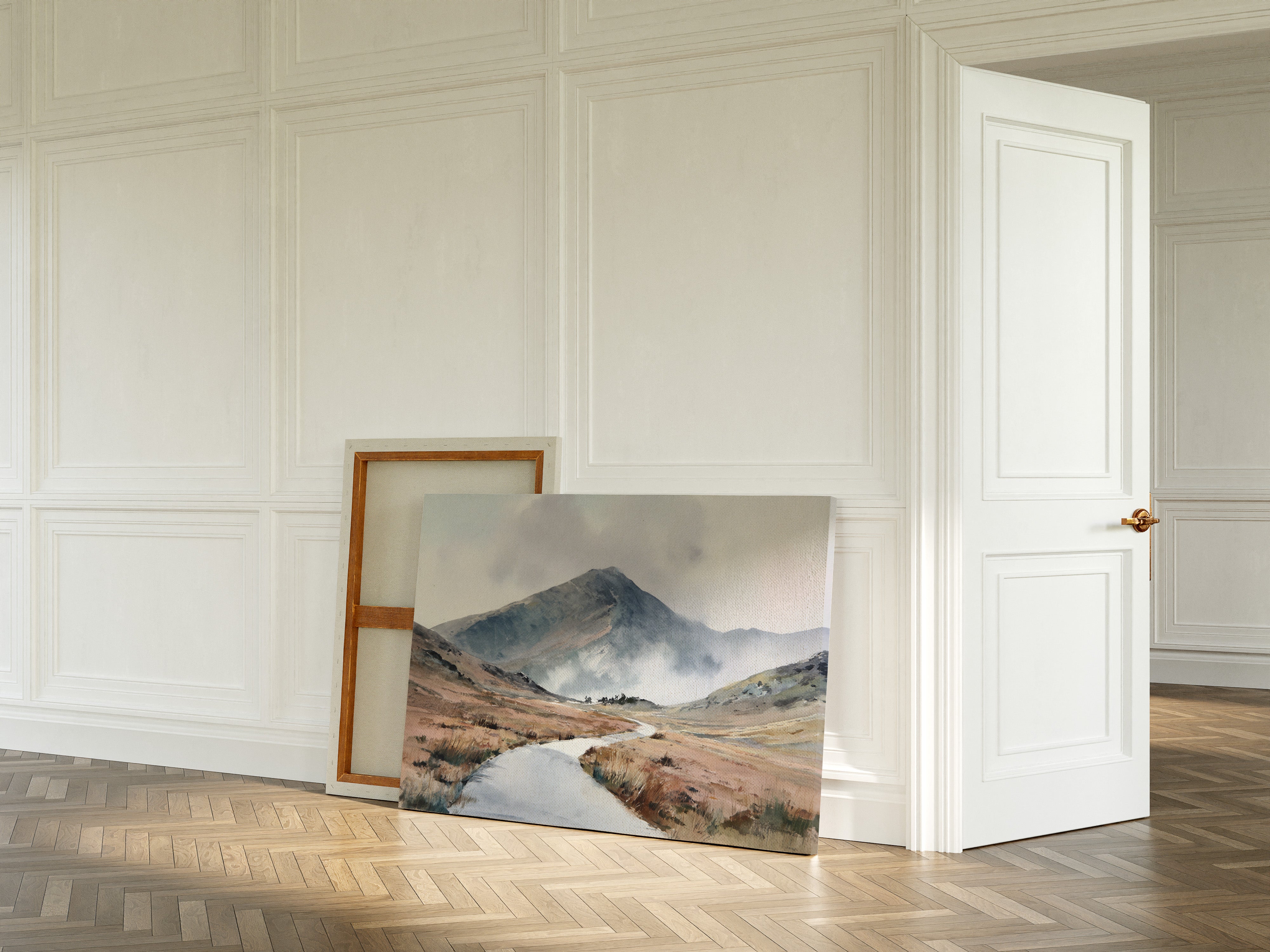 Mist clings to rugged peaks as a silver stream carves its way through the autumn-touched valley. The watercolor landscape captures the raw beauty of highland wilderness, where steel-blue mountains rise dramatically against clouded skies. Earth tones of russet and gold sweep across the moorland, while delicate brushstrokes suggest windswept grasses along the riverbank. This serene yet powerful scene brings the untamed spirit of mountain country into your space, perfect for creating a contemplative focal point in a study or living room where nature's grandeur can be appreciated daily.