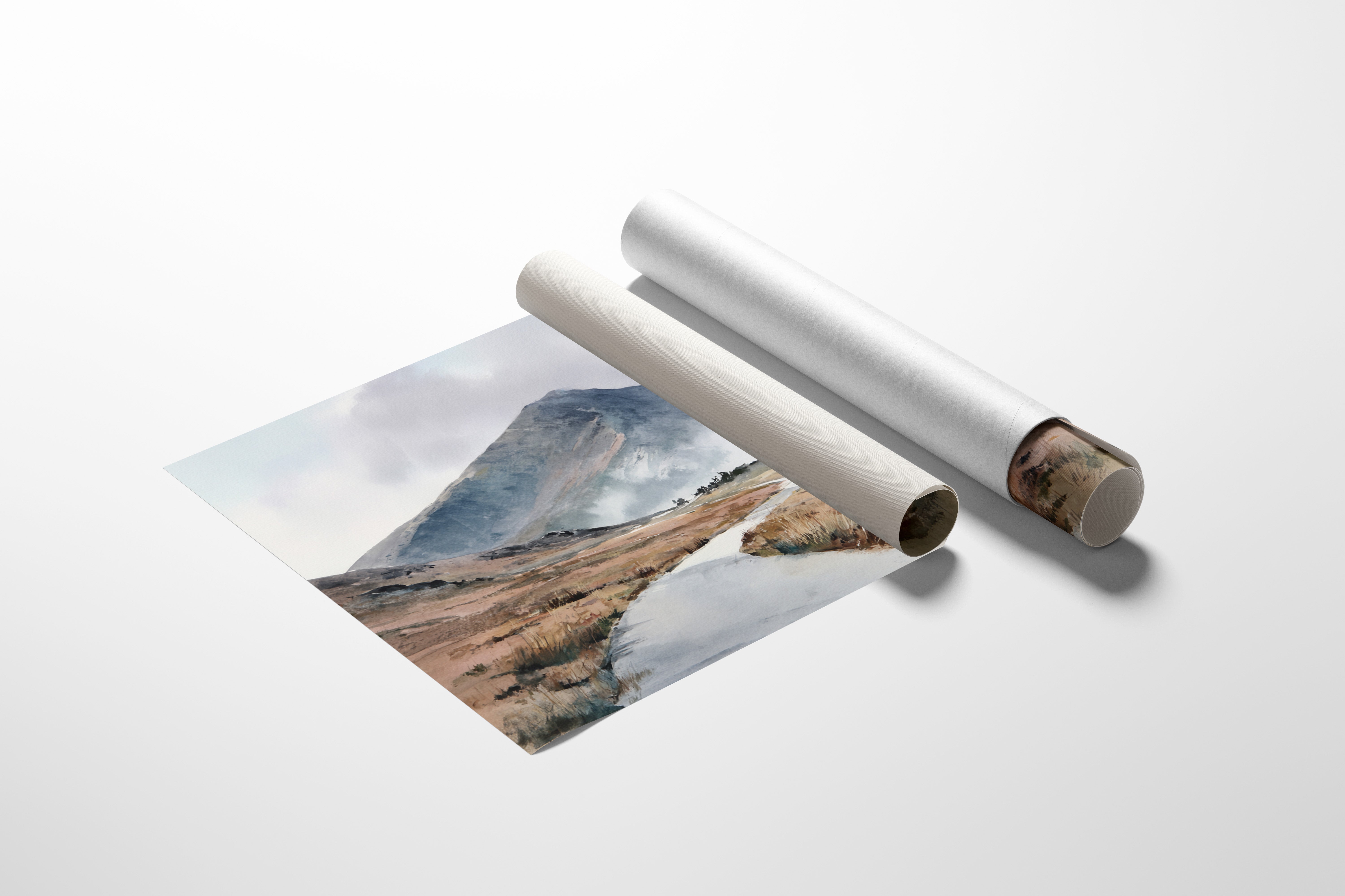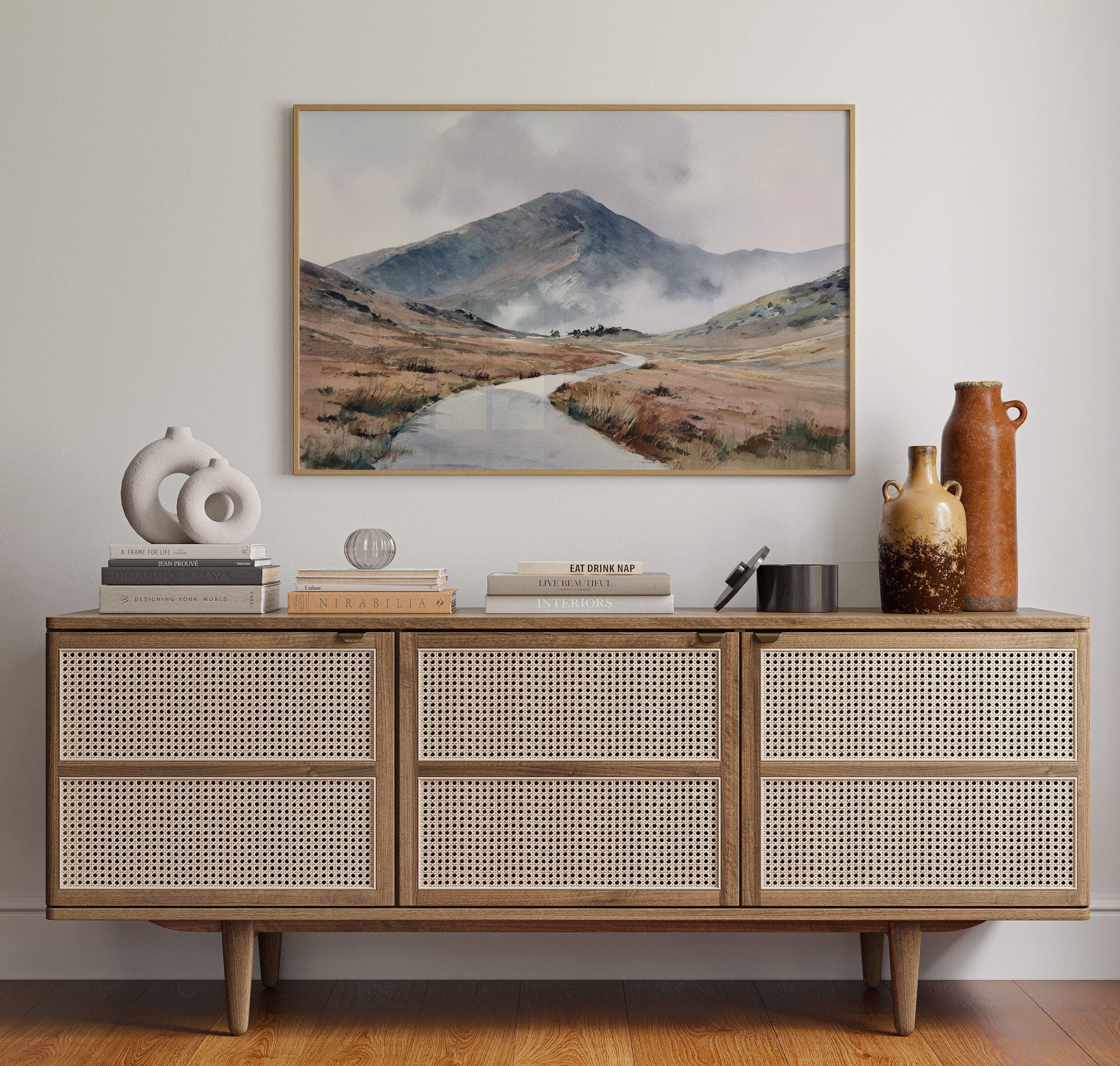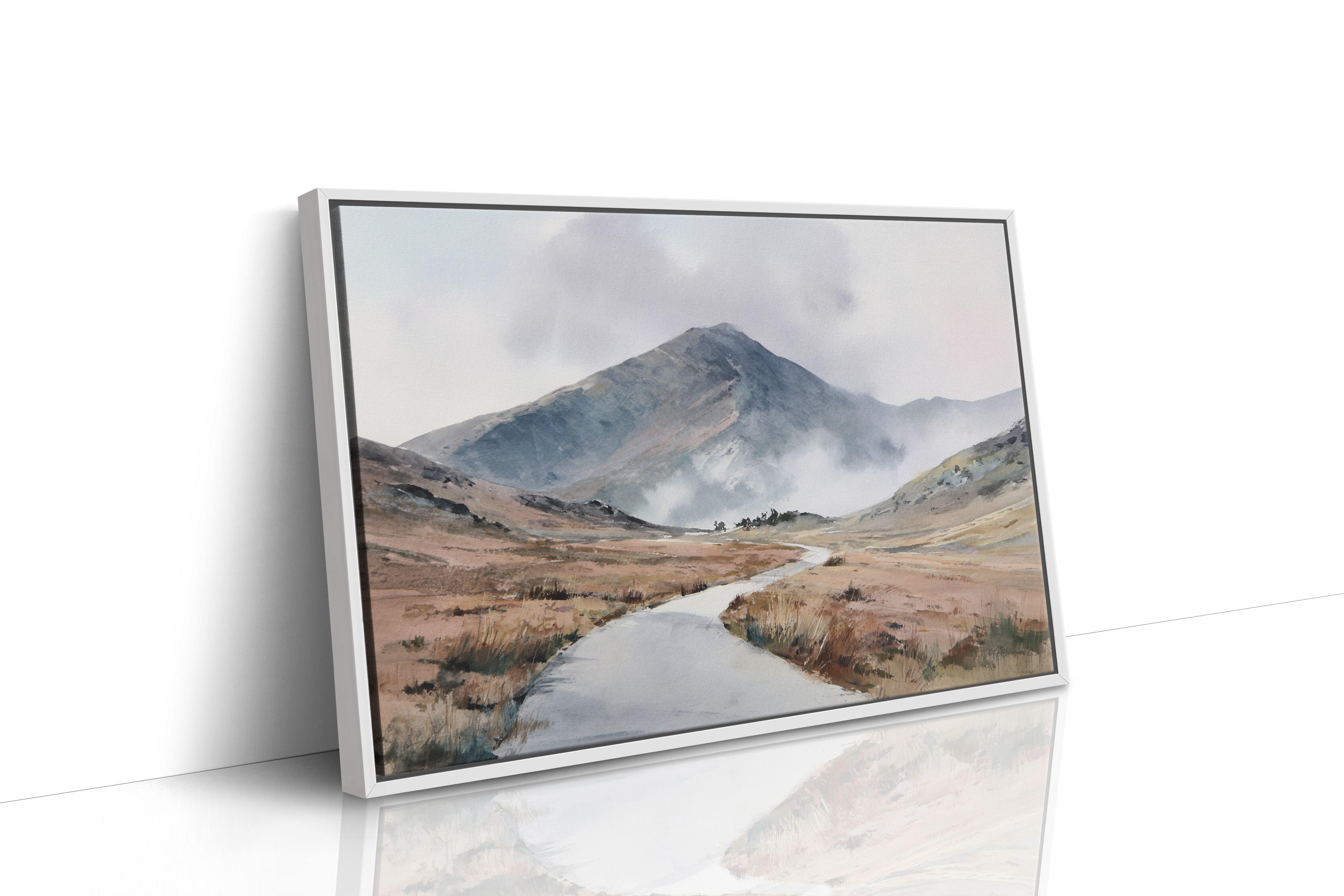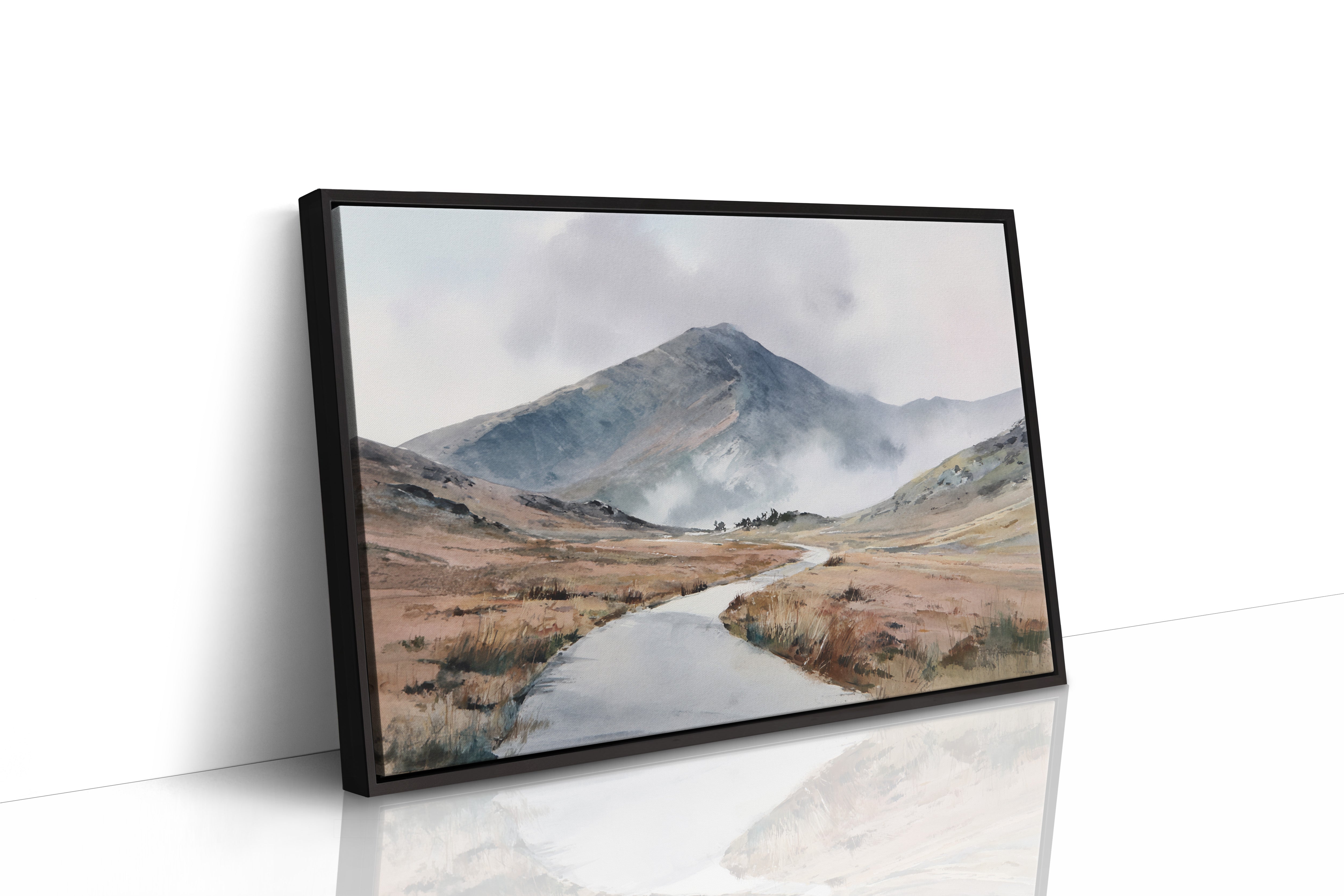 Mist clings to rugged peaks as a silver stream carves its way through the autumn-touched valley. The watercolor landscape captures the raw beauty of highland wilderness, where steel-blue mountains rise dramatically against clouded skies. Earth tones of russet and gold sweep across the moorland, while delicate brushstrokes suggest windswept grasses along the riverbank. This serene yet powerful scene brings the untamed spirit of mountain country into your space, perfect for creating a contemplative focal point in a study or living room where nature's grandeur can be appreciated daily.