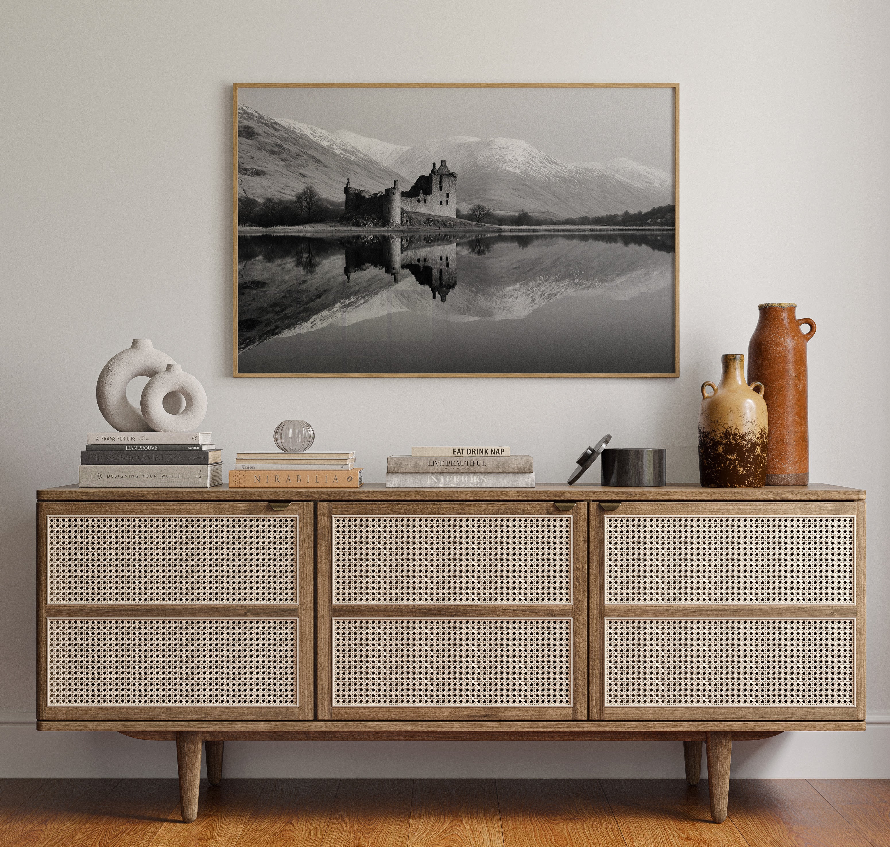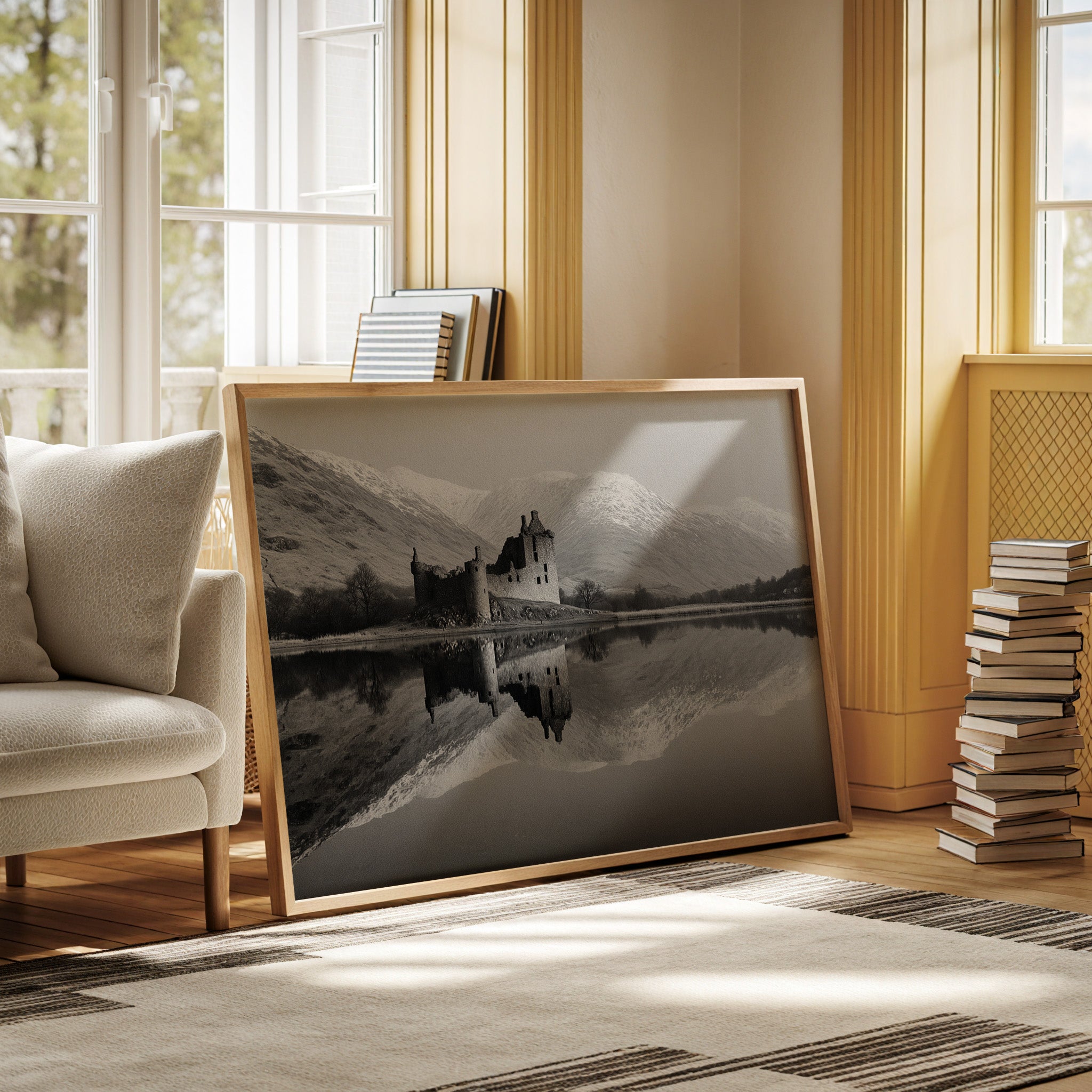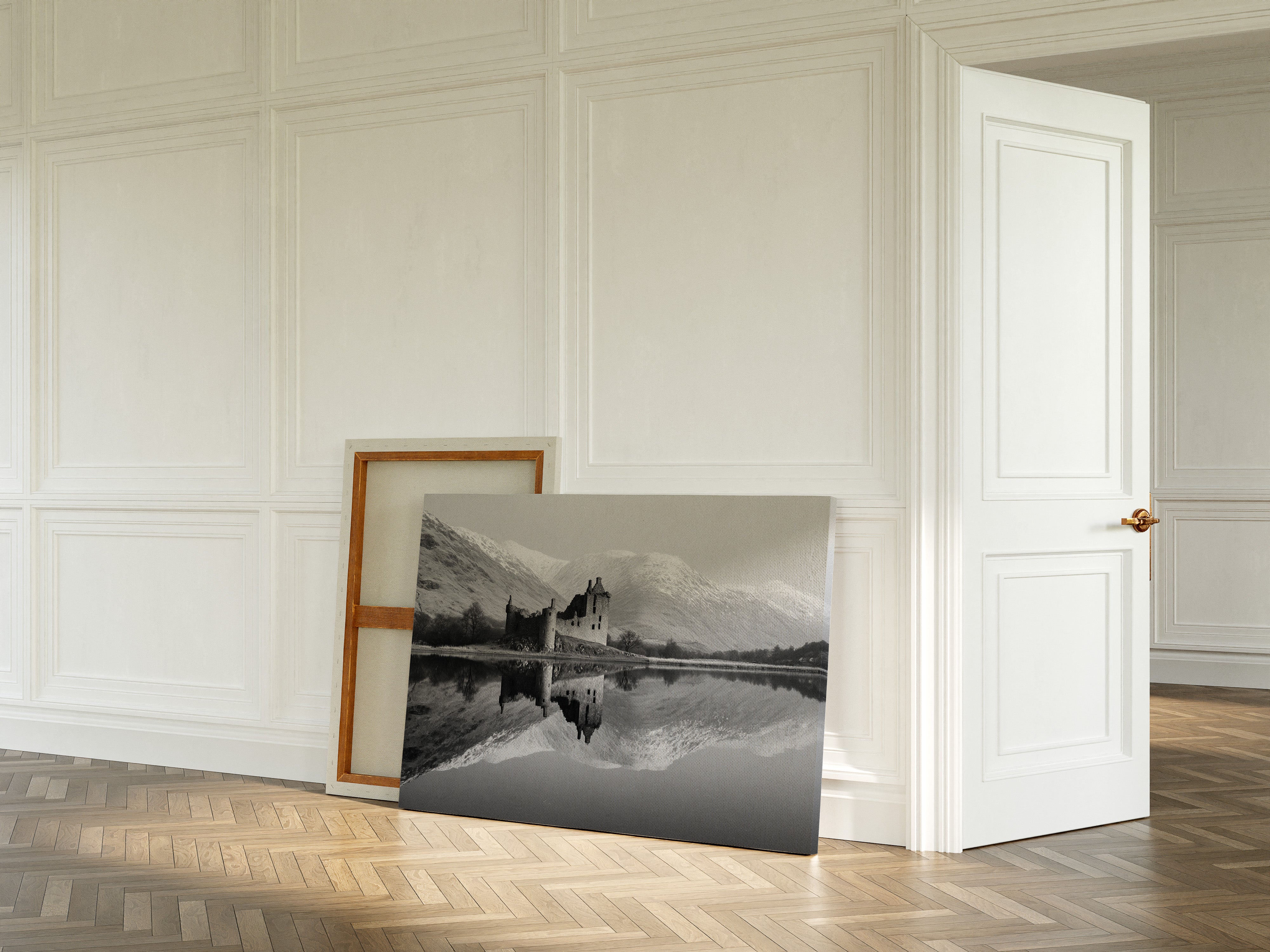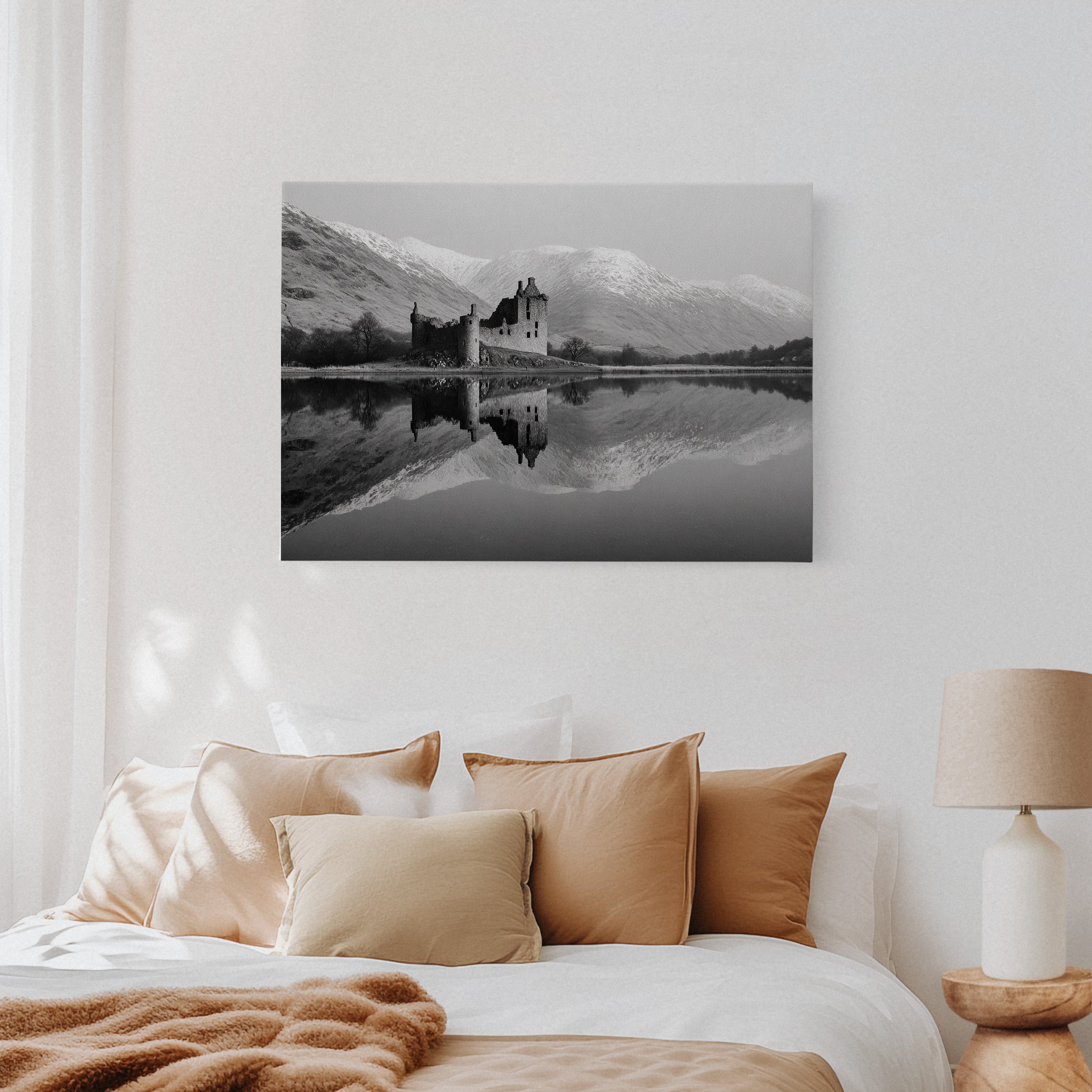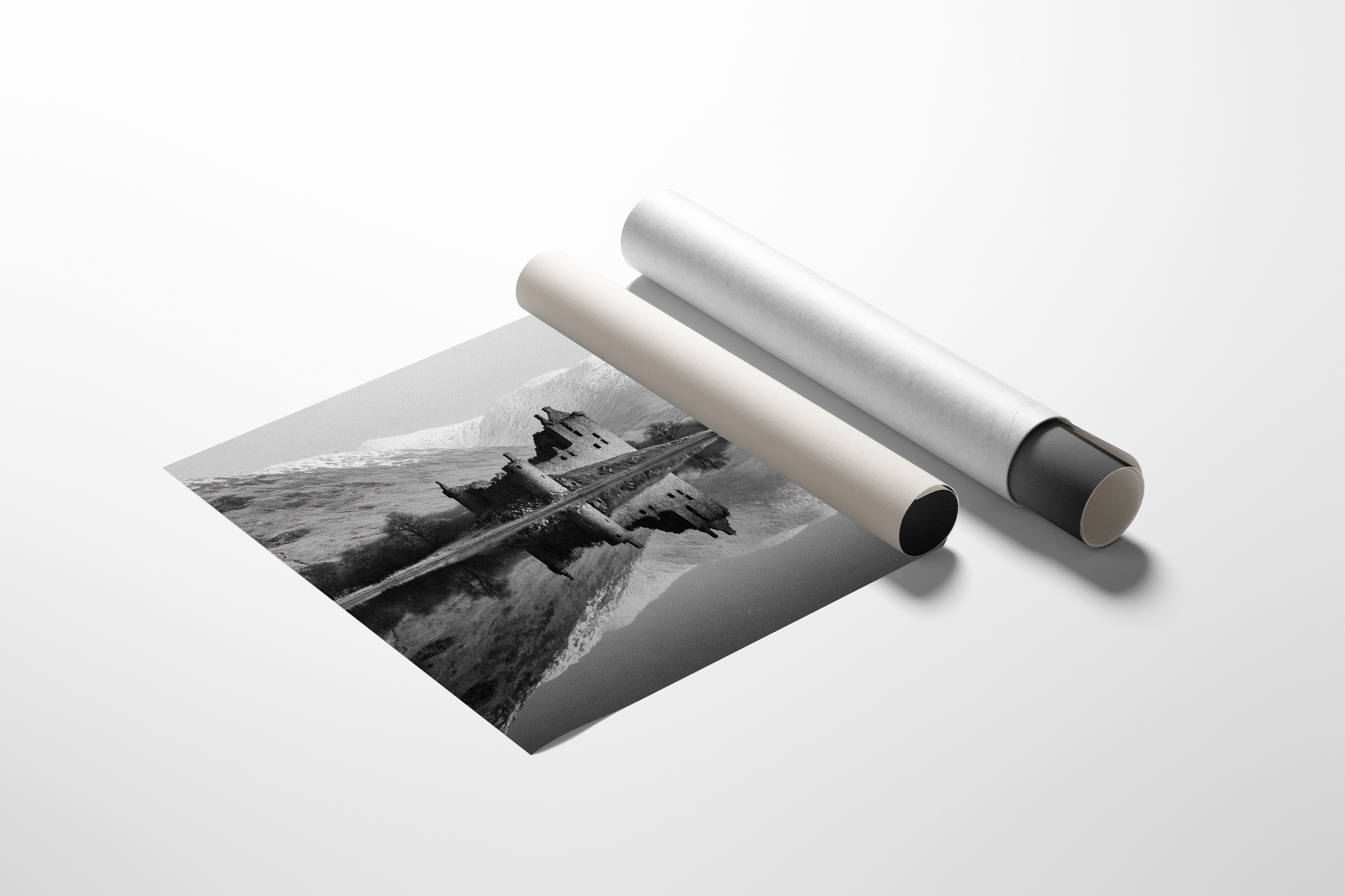 Time stands still where weathered stone meets pristine water, creating a perfect mirror of Scotland's storied past. The ruined castle rises from the shoreline like a memory made solid, its broken towers and empty windows telling tales of centuries past. Against the backdrop of snow-dusted mountains, the black and white composition amplifies the dramatic contrast between the dark castle ruins and the bright winter peaks. The loch's surface holds the scene in perfect symmetry, doubling the majesty of both architecture and landscape. This striking piece would create a commanding focal point in a study or great room, where its timeless quality can inspire contemplation and connection to history.