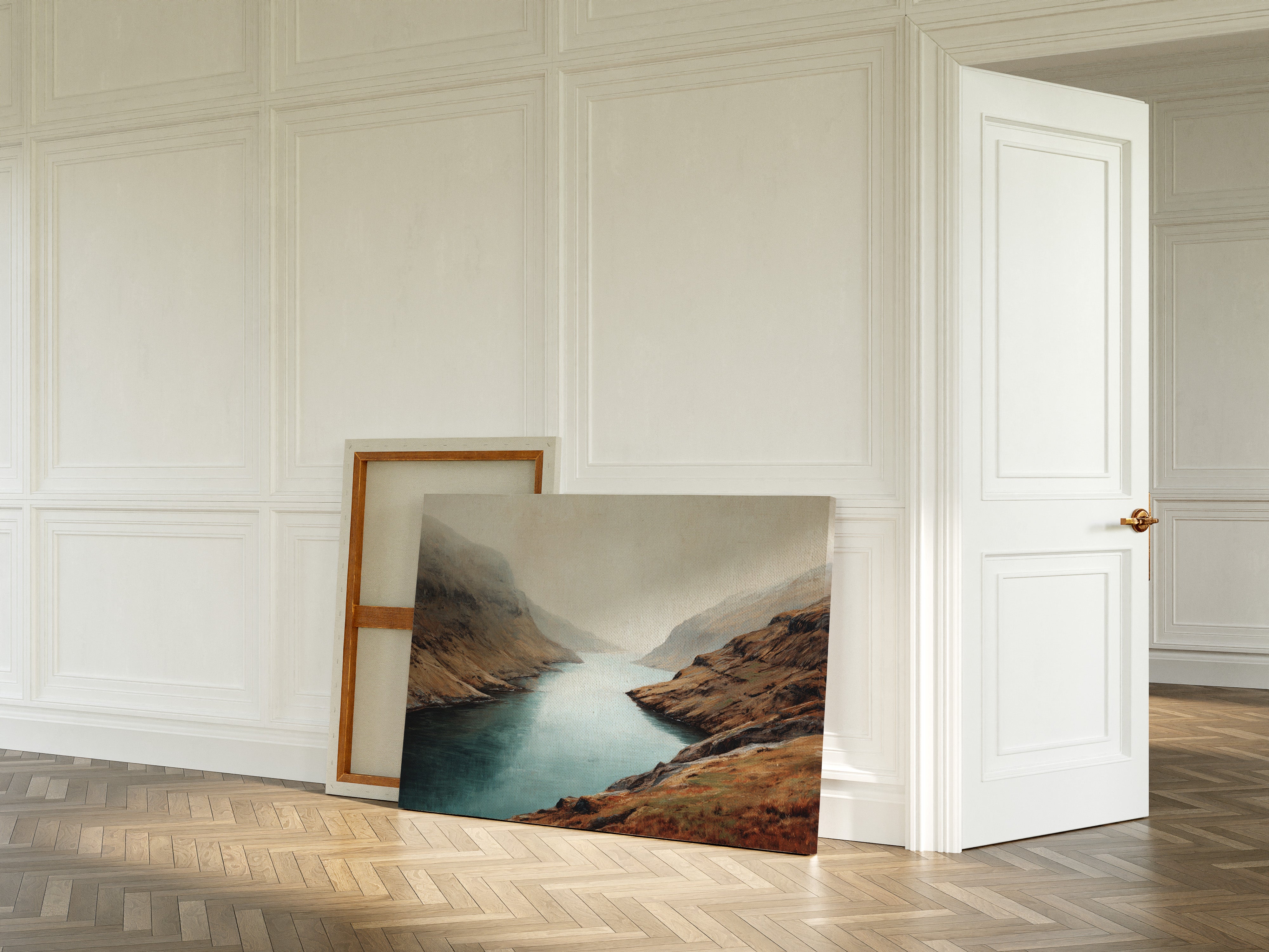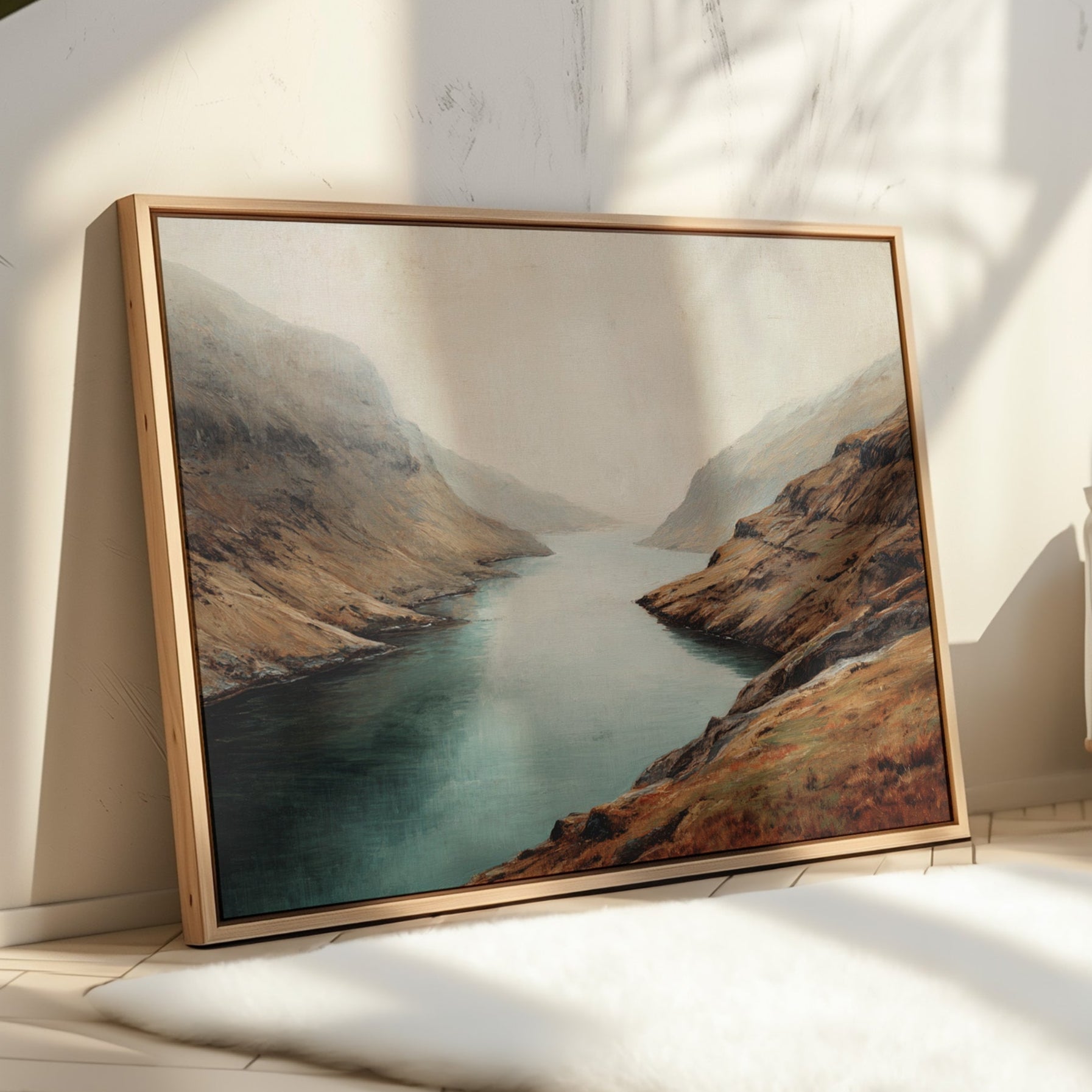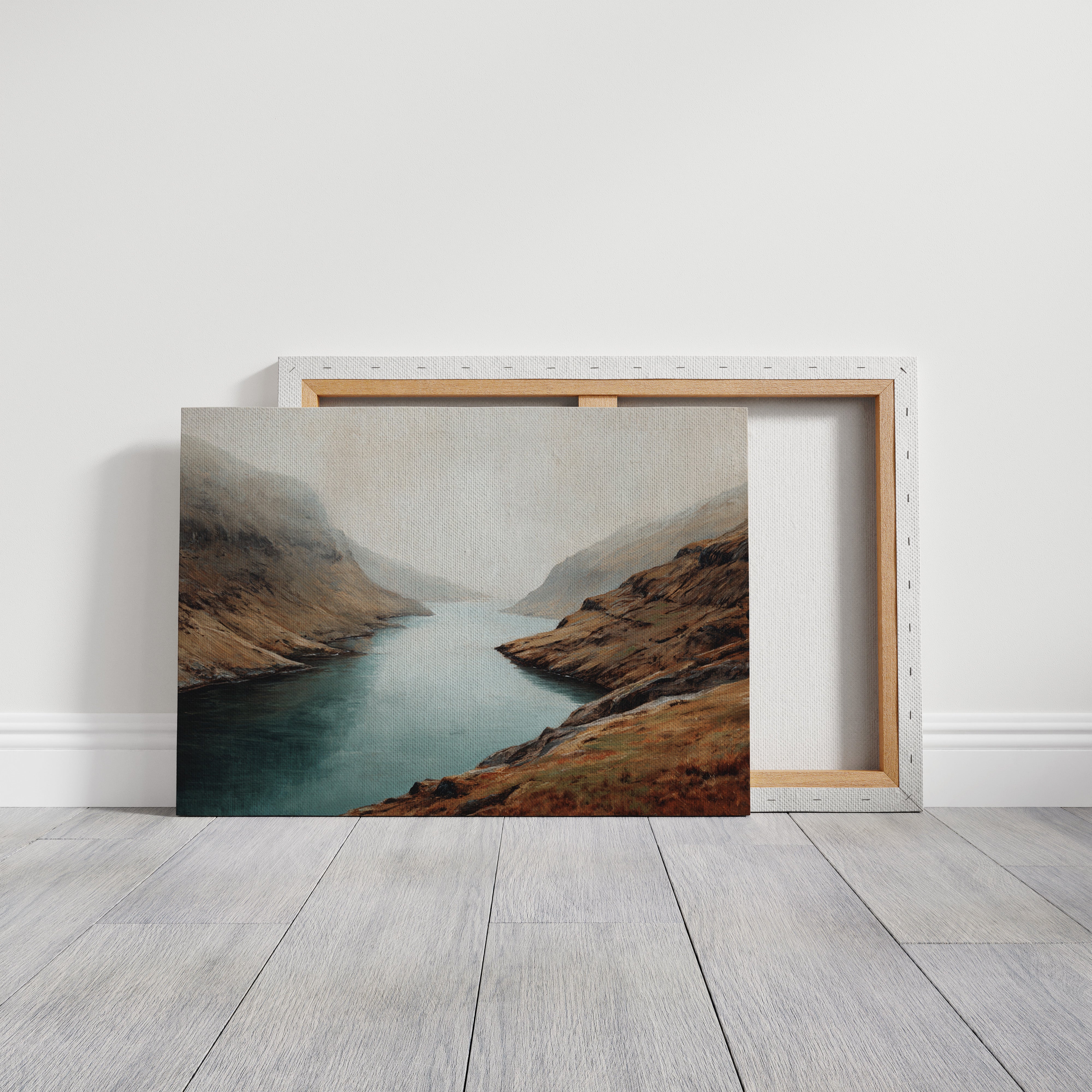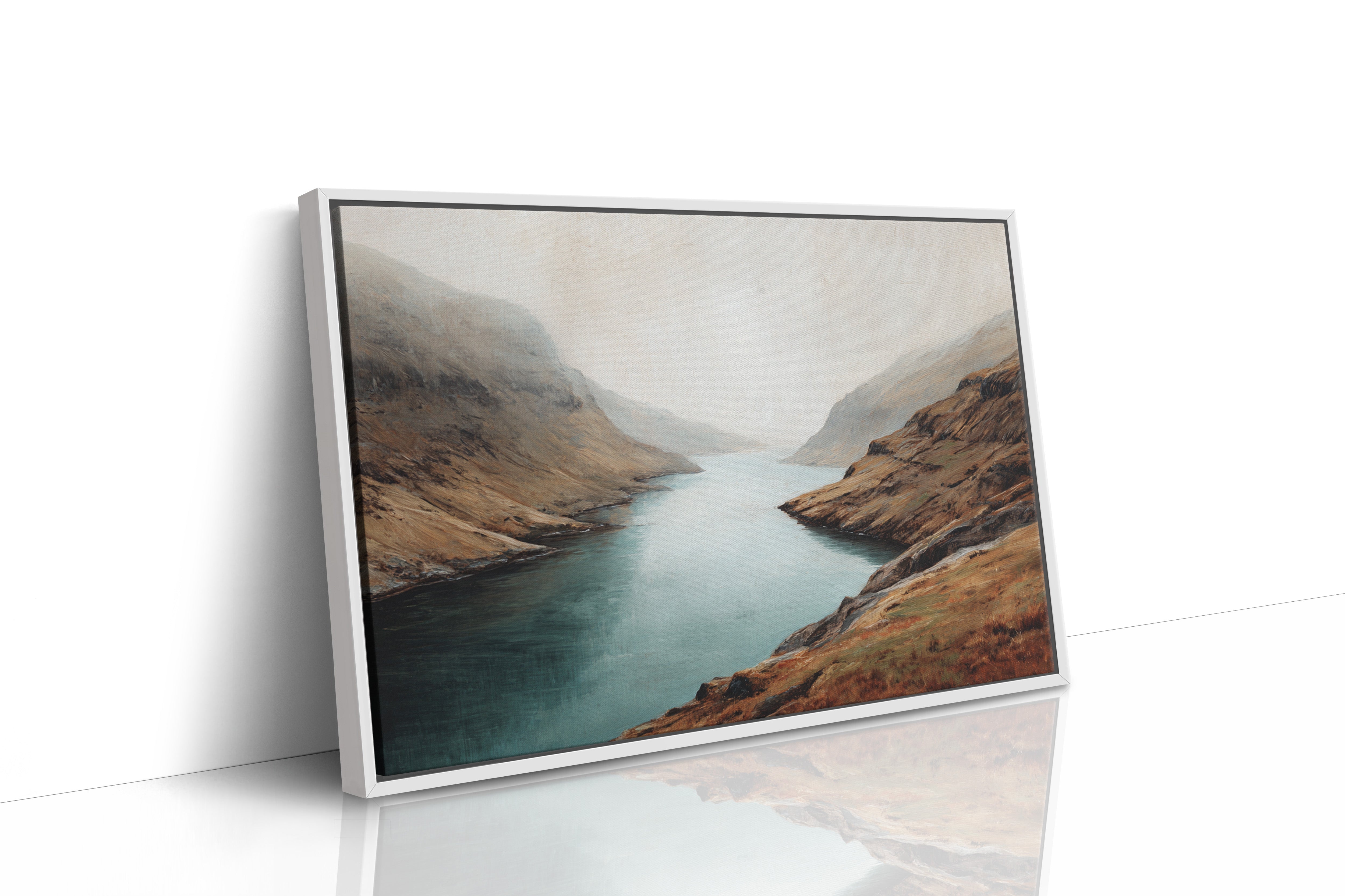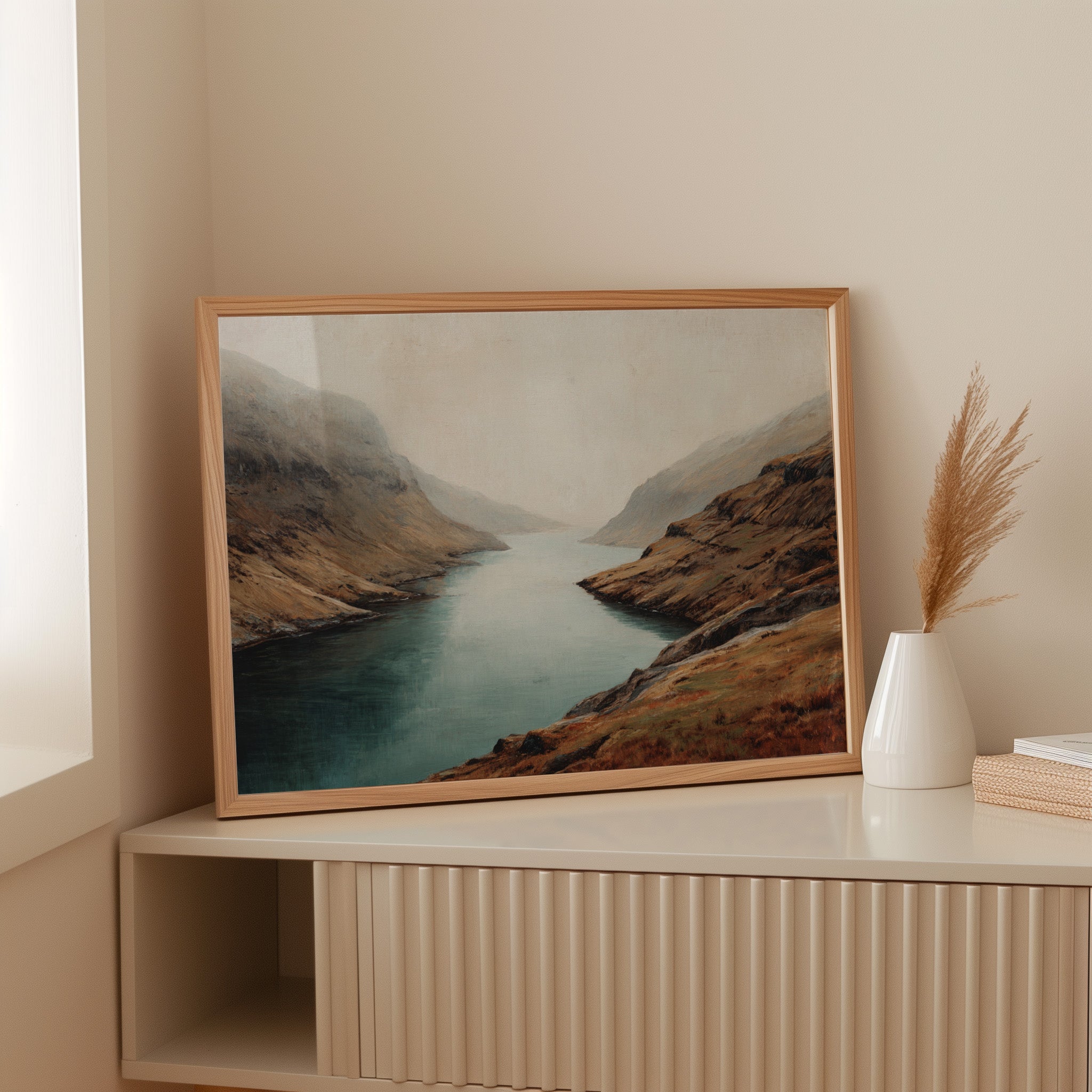 Mist clings to rugged peaks as a glacial lake stretches toward the horizon, its surface a mirror of tranquility. The landscape unfolds in rich autumn tones - weathered browns and rusty oranges embrace the shoreline, while deep teal waters cut through ancient highlands. Dramatic slopes sweep down to meet the water's edge, creating a composition that speaks of isolation and timeless beauty. This scene captures the raw majesty of Scottish highlands, where land and water have danced together for millennia. Perfect for spaces seeking to evoke a sense of solitude and natural grandeur, especially in studies, living rooms, or meditation spaces where one might contemplate life's deeper rhythms.