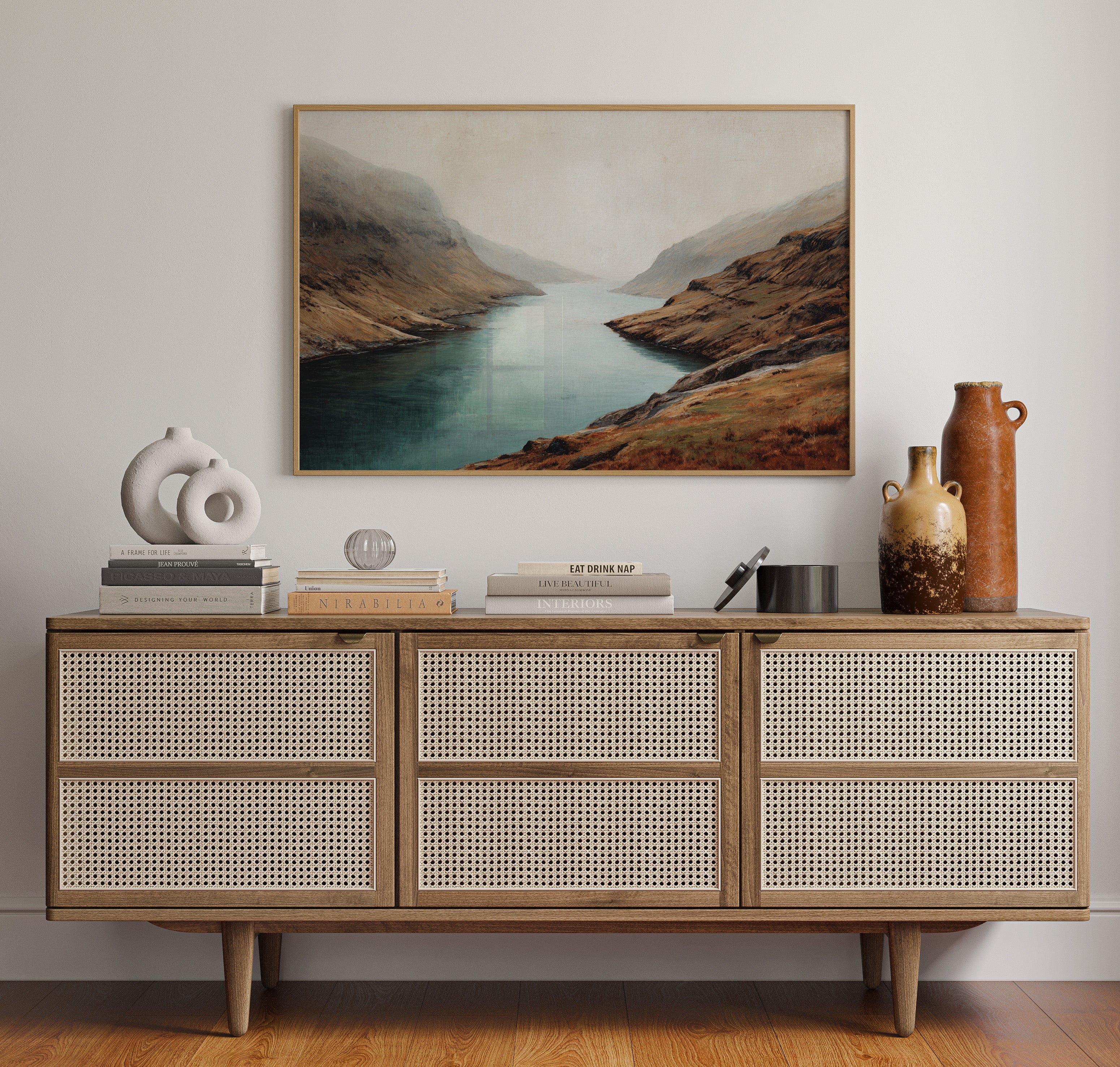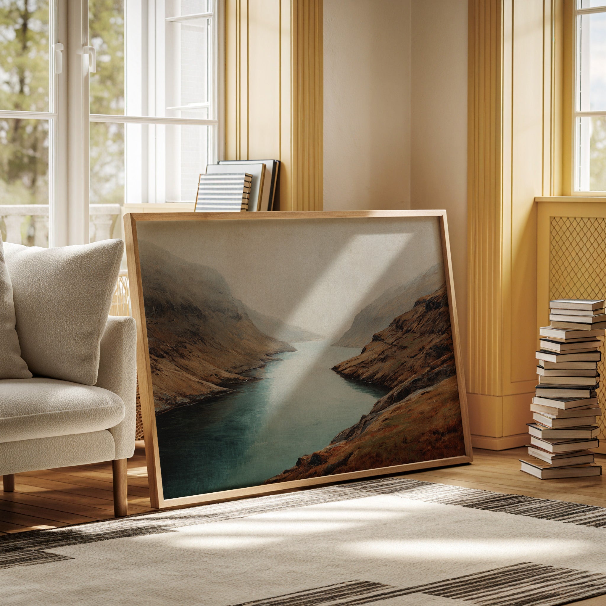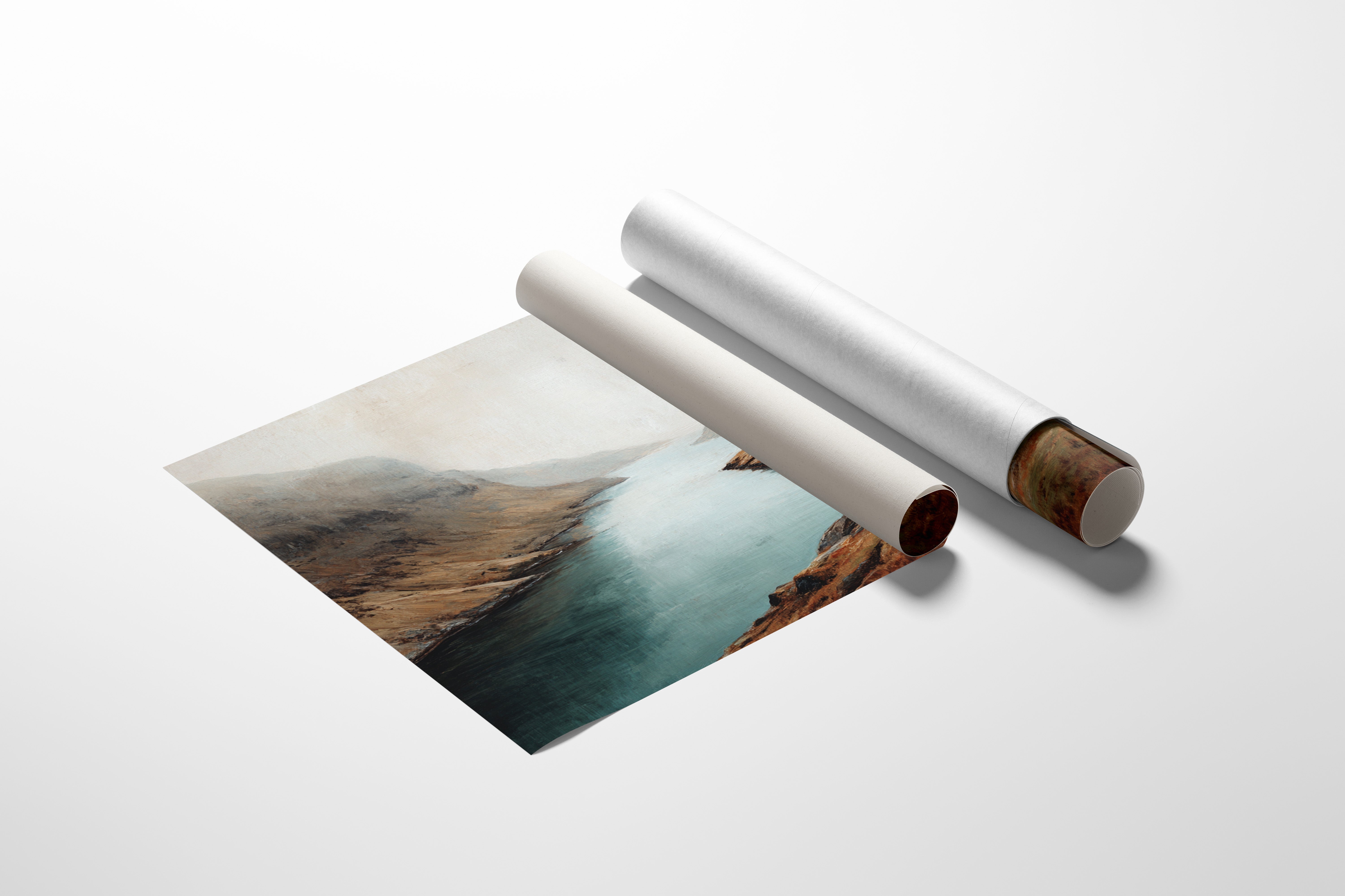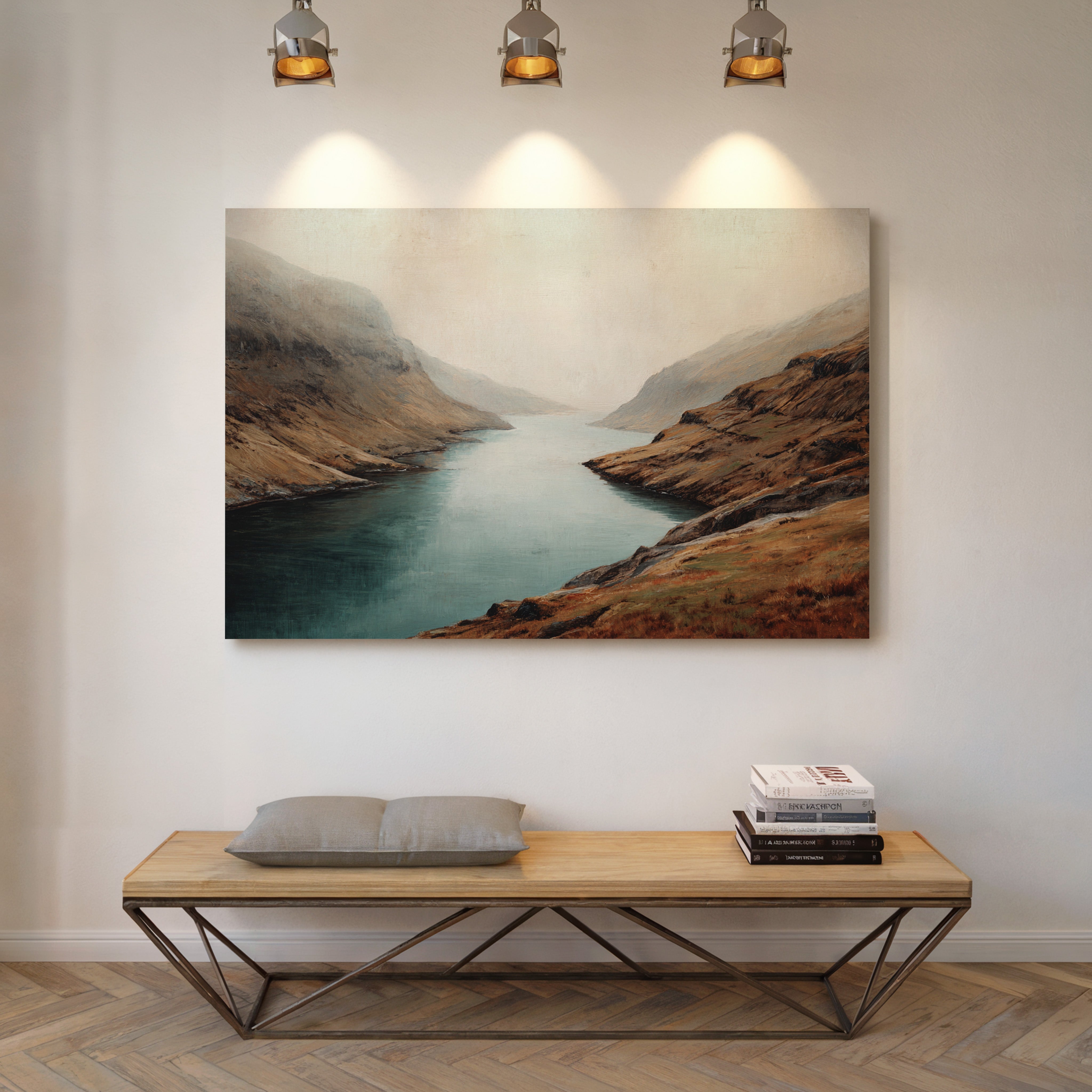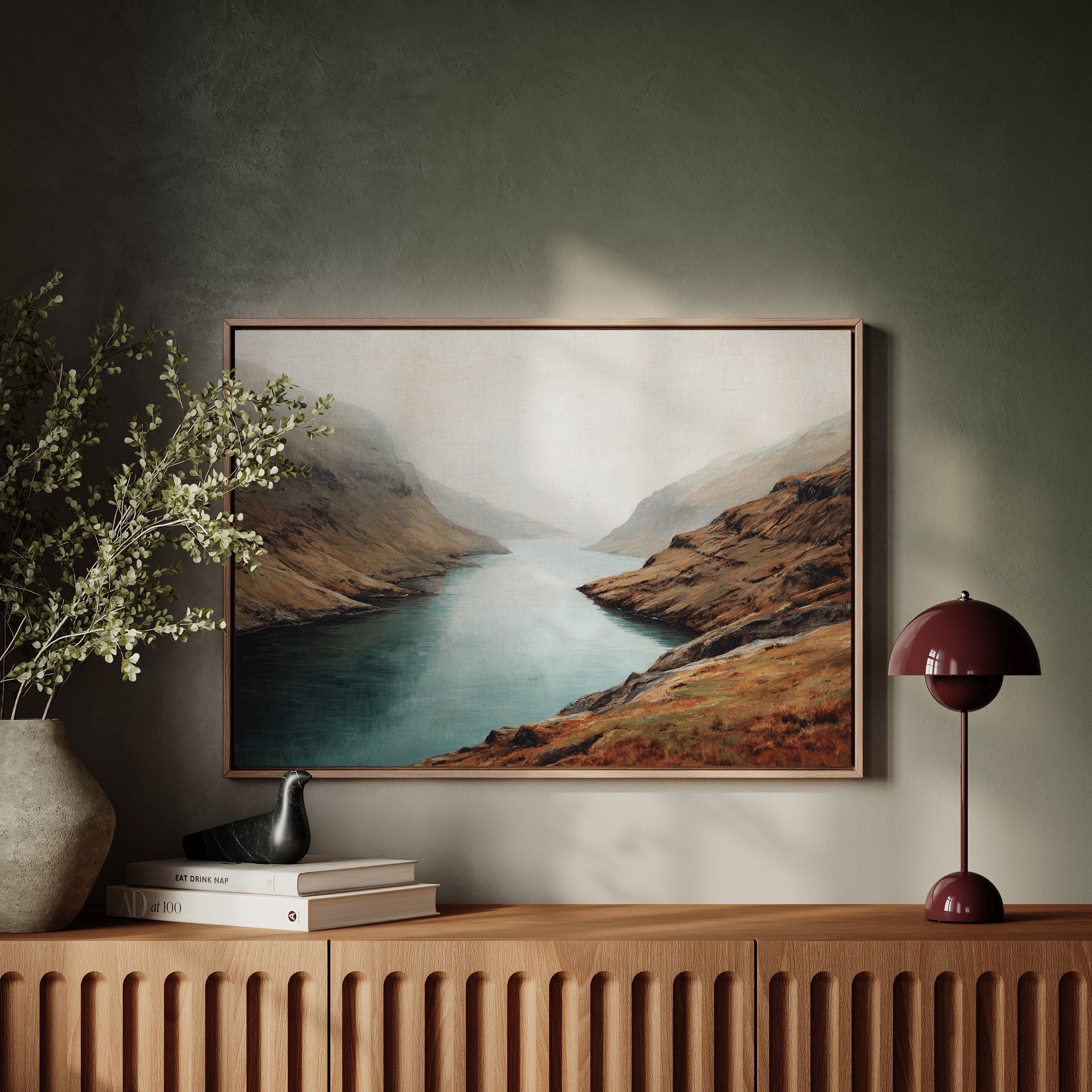 Mist clings to rugged peaks as a glacial lake stretches toward the horizon, its surface a mirror of tranquility. The landscape unfolds in rich autumn tones - weathered browns and rusty oranges embrace the shoreline, while deep teal waters cut through ancient highlands. Dramatic slopes sweep down to meet the water's edge, creating a composition that speaks of isolation and timeless beauty. This scene captures the raw majesty of Scottish highlands, where land and water have danced together for millennia. Perfect for spaces seeking to evoke a sense of solitude and natural grandeur, especially in studies, living rooms, or meditation spaces where one might contemplate life's deeper rhythms.