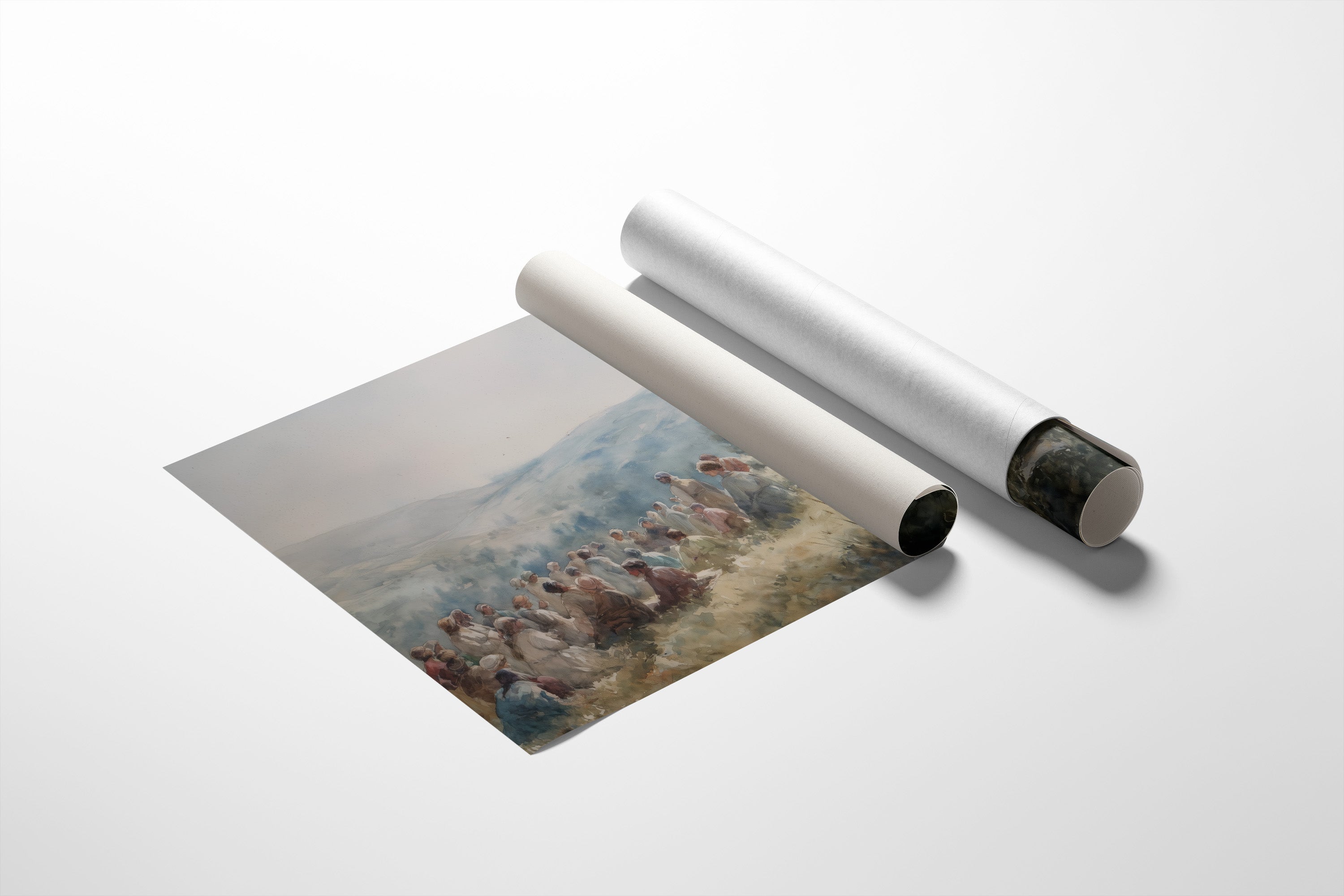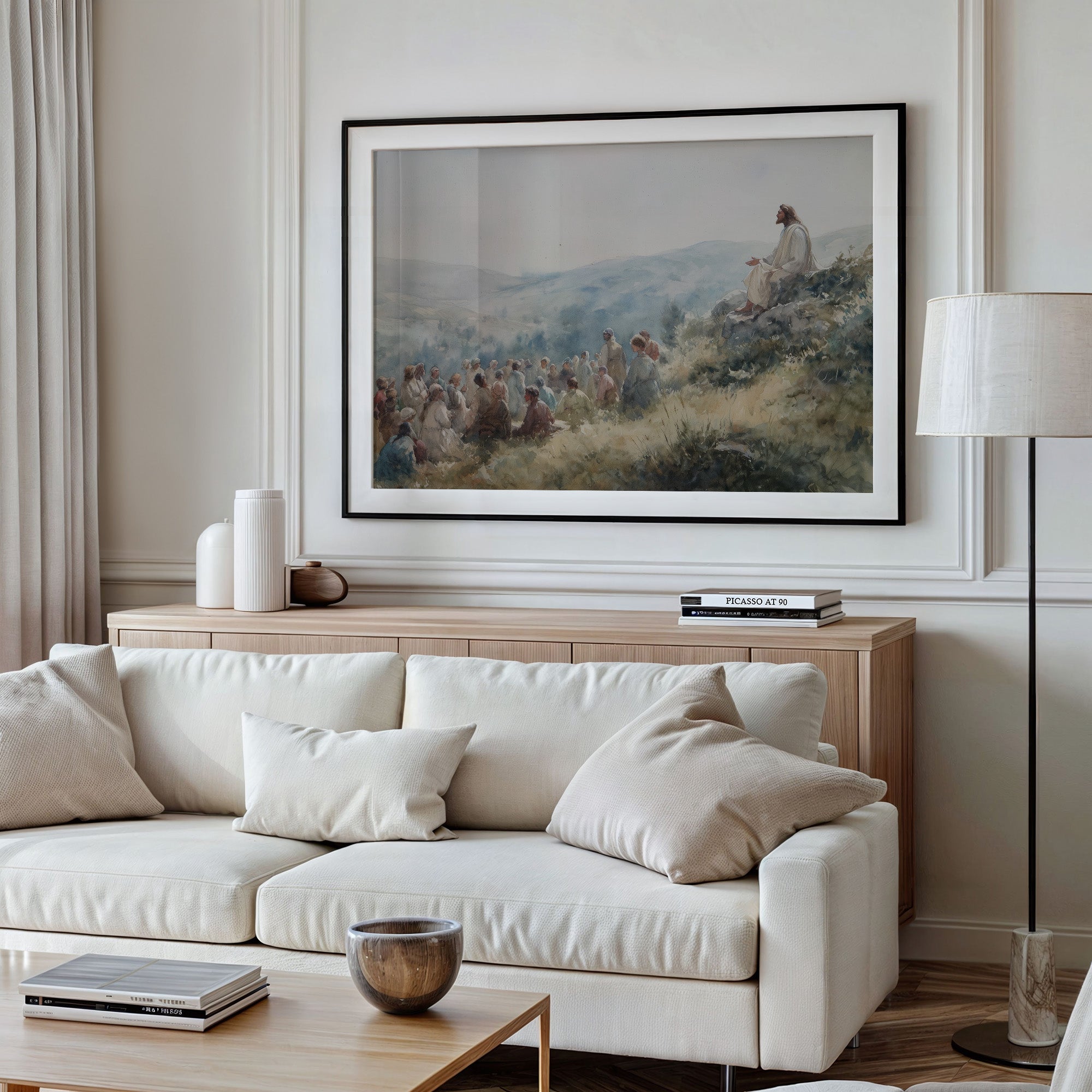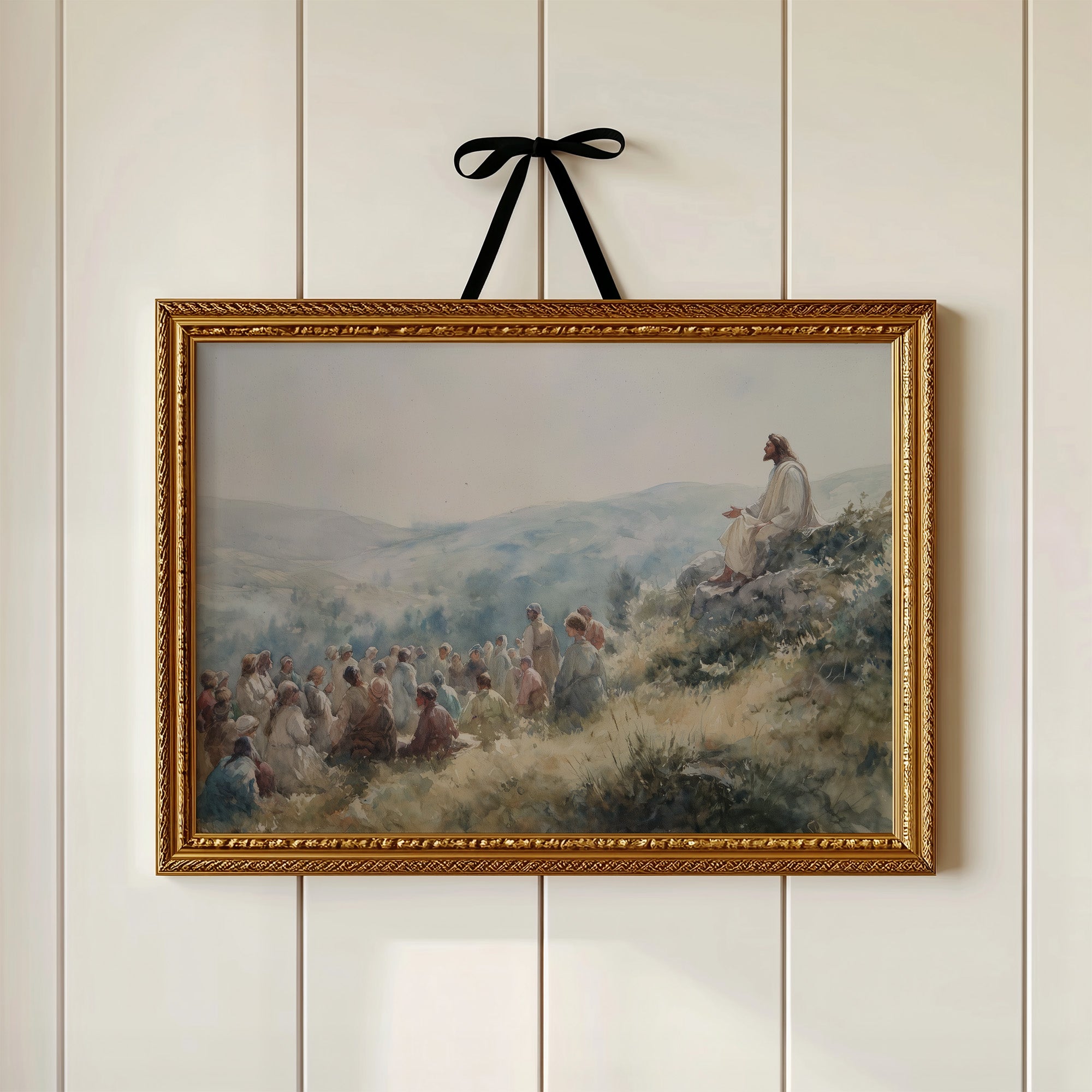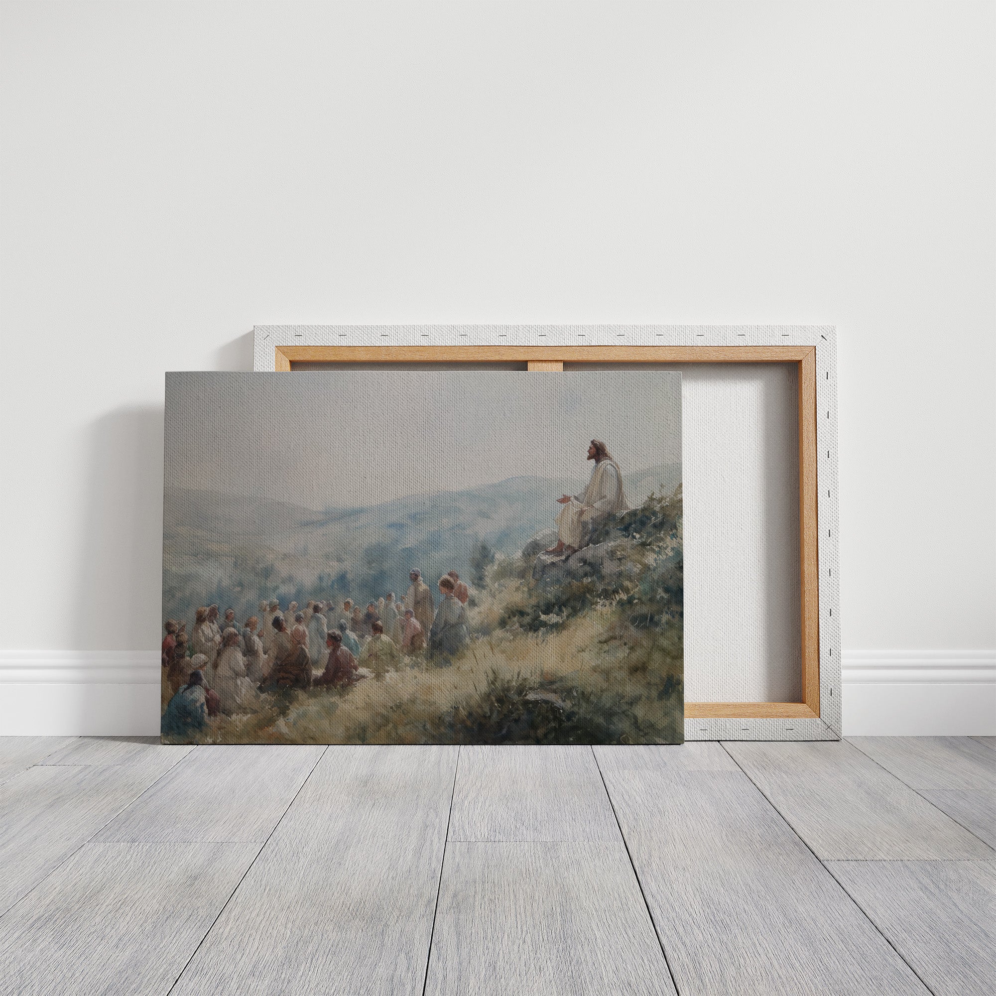 Soft morning light bathes the pastoral scene, where wisdom meets wilderness in quiet reverence. The watercolor painting captures a gathering on rolling hills, delicate brushstrokes revealing figures listening intently to the seated teacher on higher ground. Earth tones blend with muted blues of distant mountains, creating a timeless moment of connection between humanity and landscape. This contemplative piece brings spiritual serenity to a home library, reading nook, or meditation space.