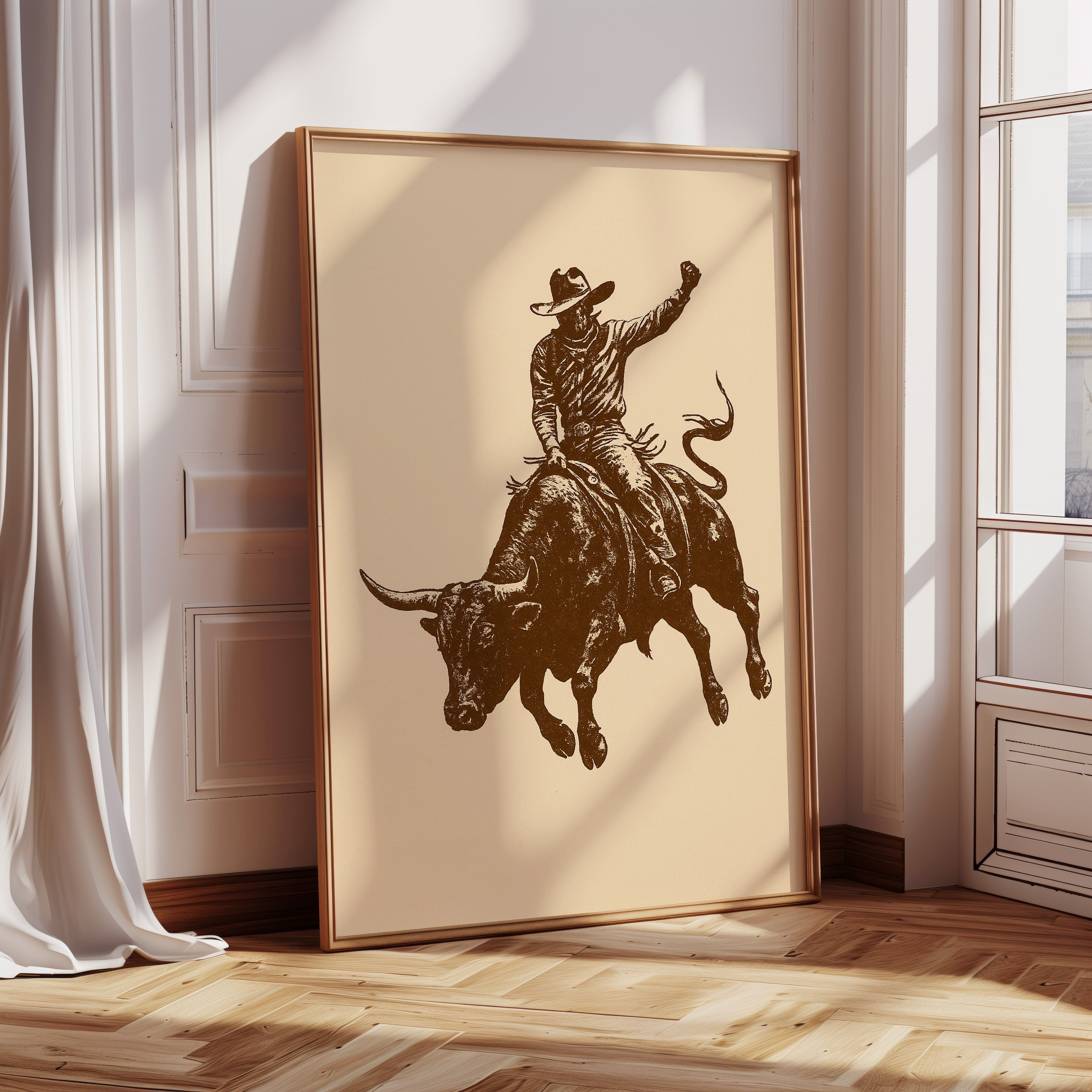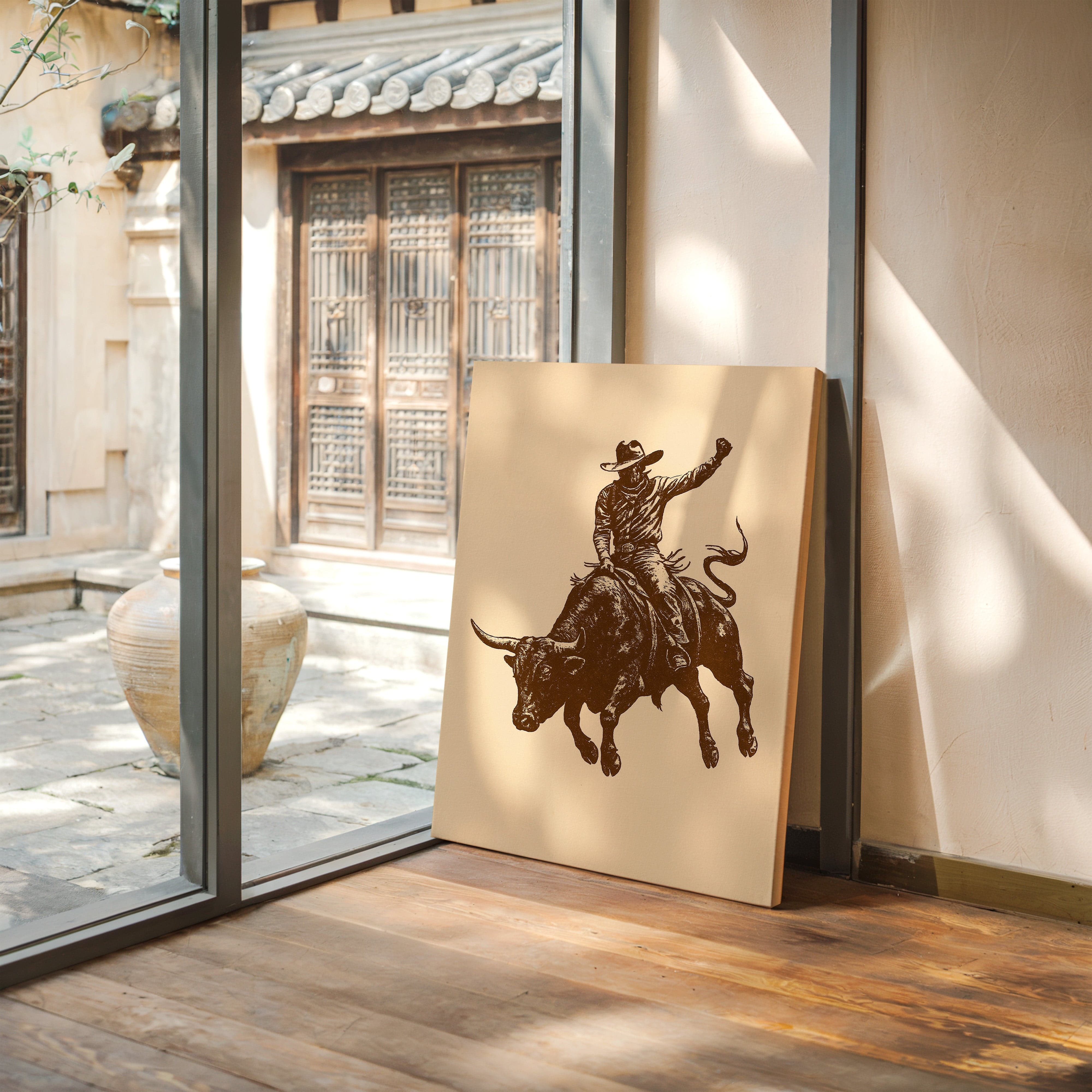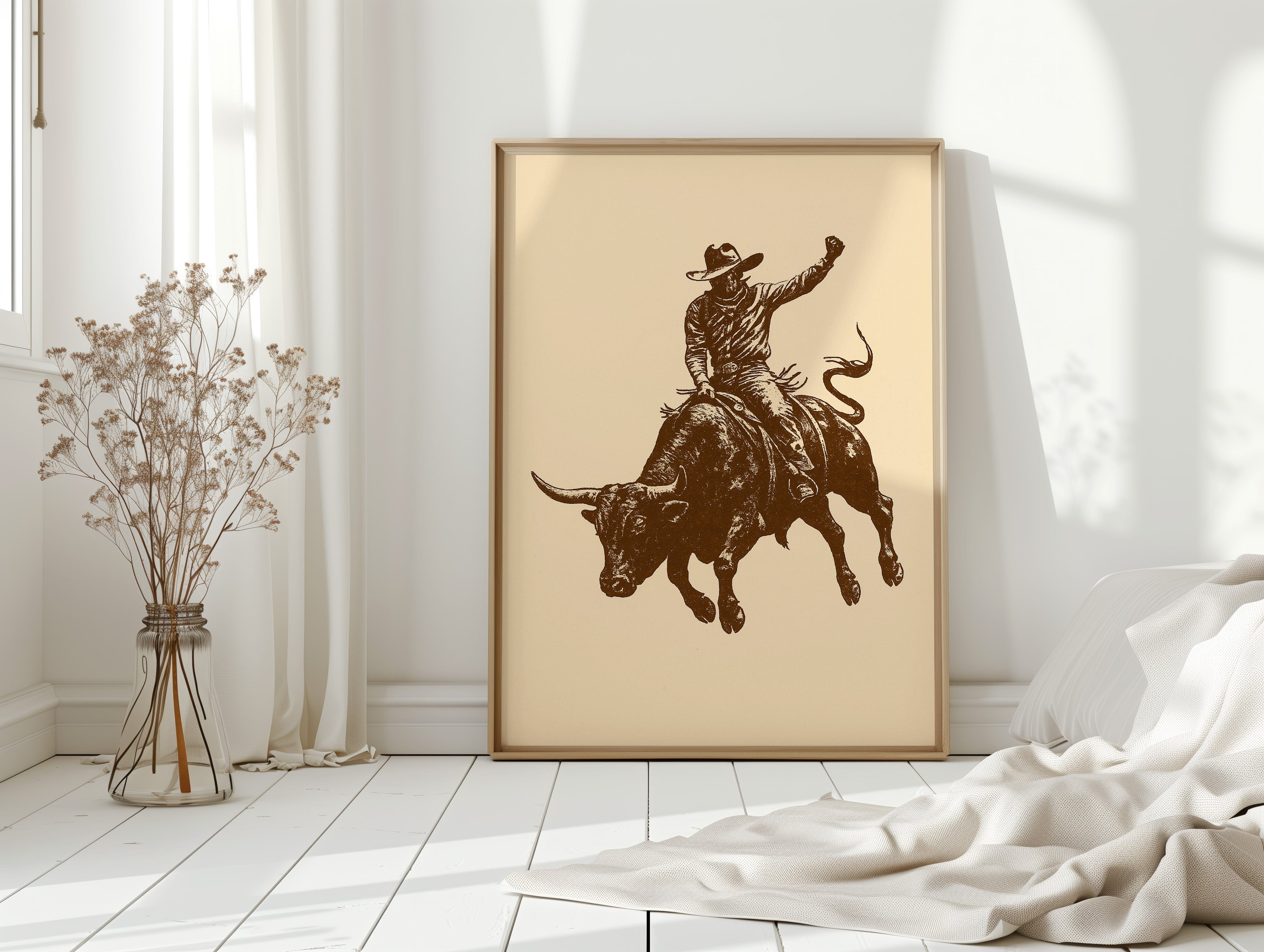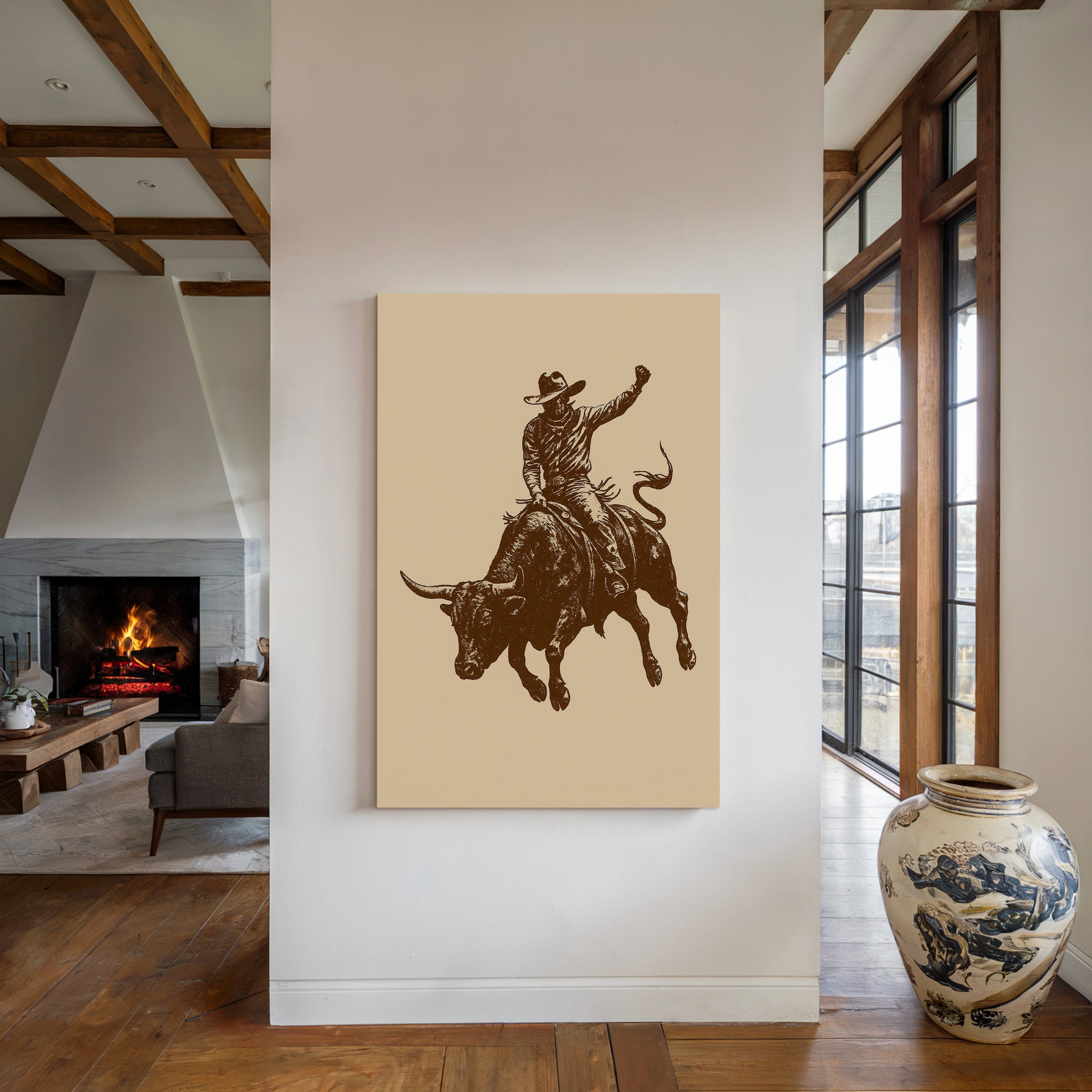 Bold bull riding art in rustic sepia tones, perfect for western lovers and rodeo fans.