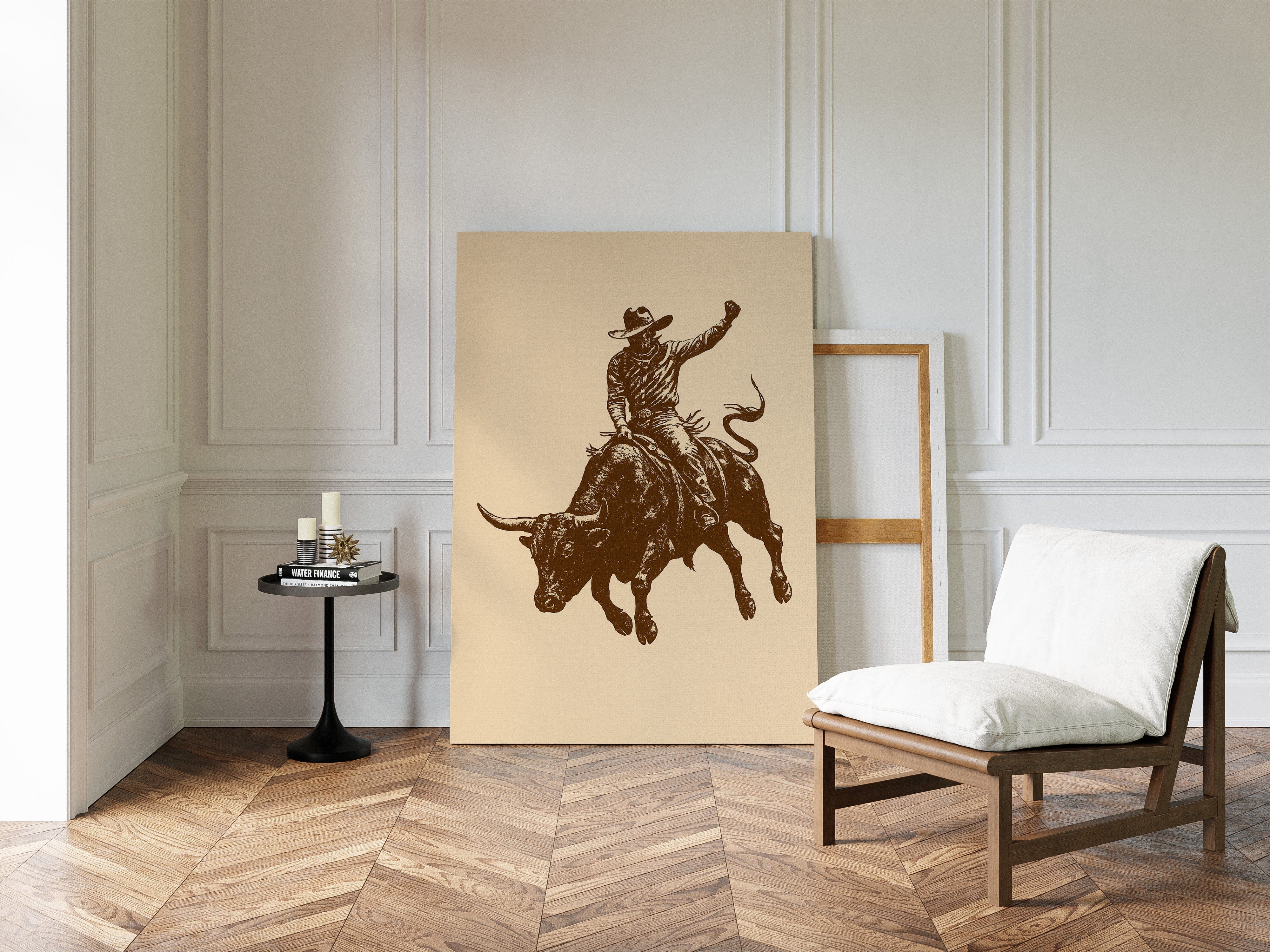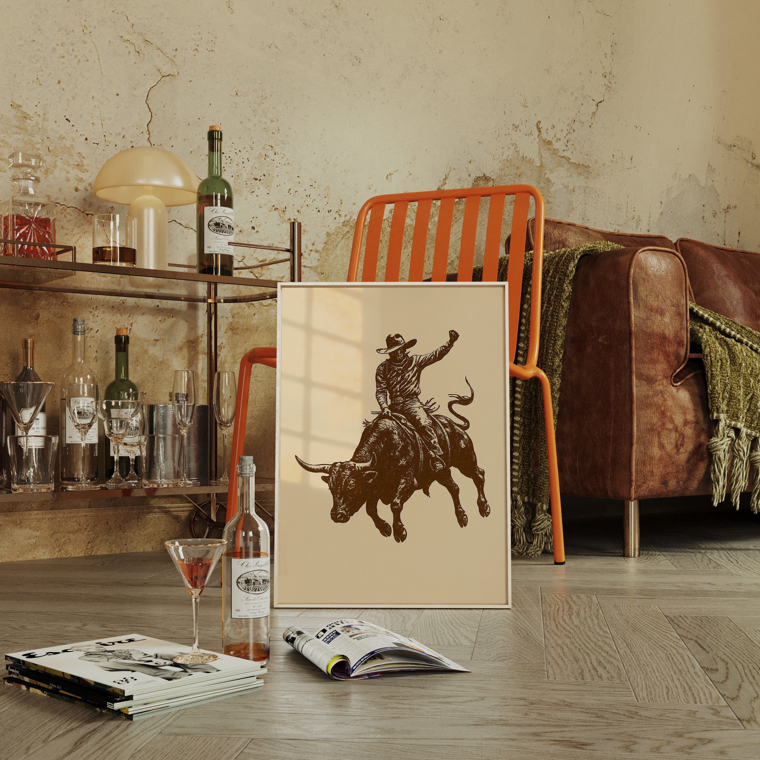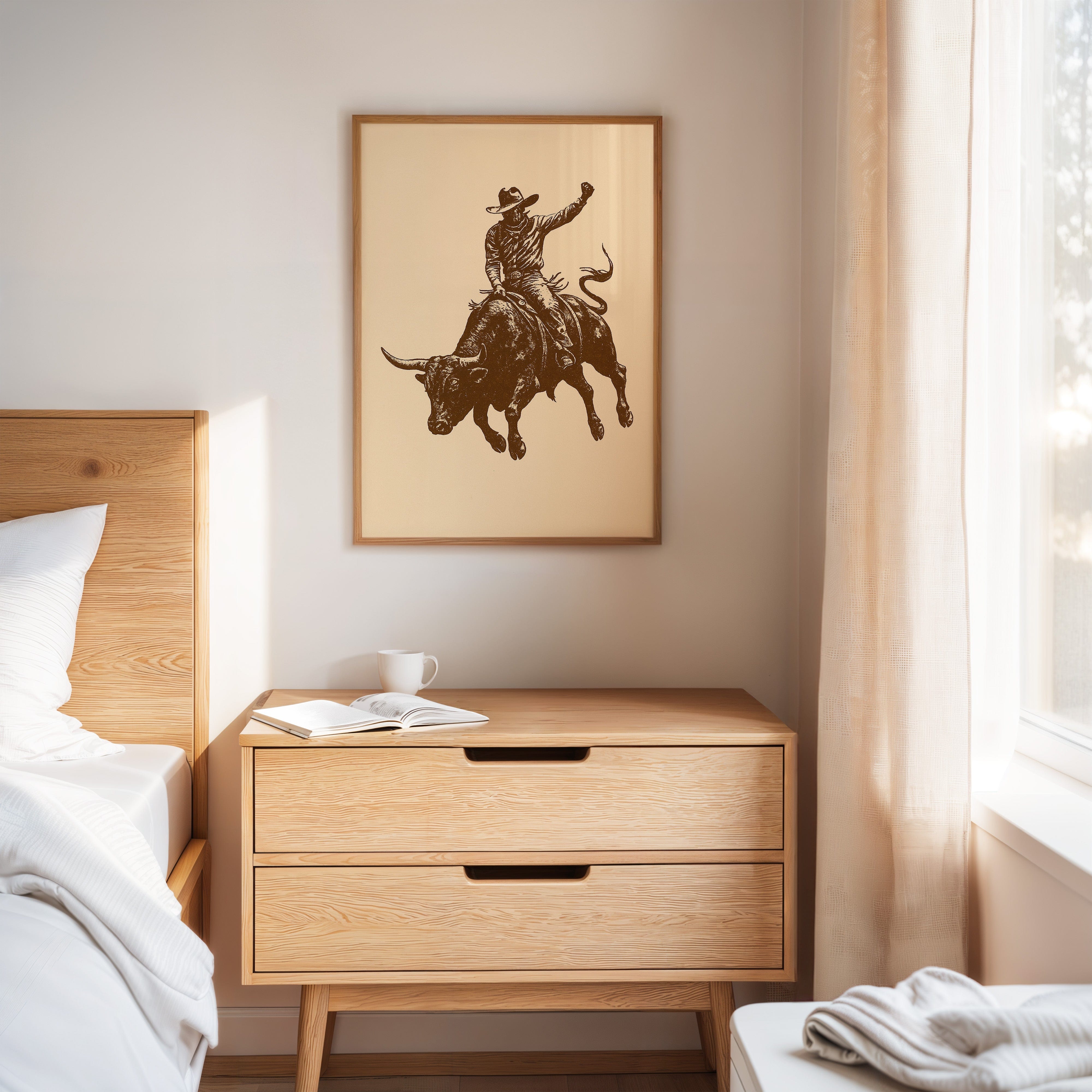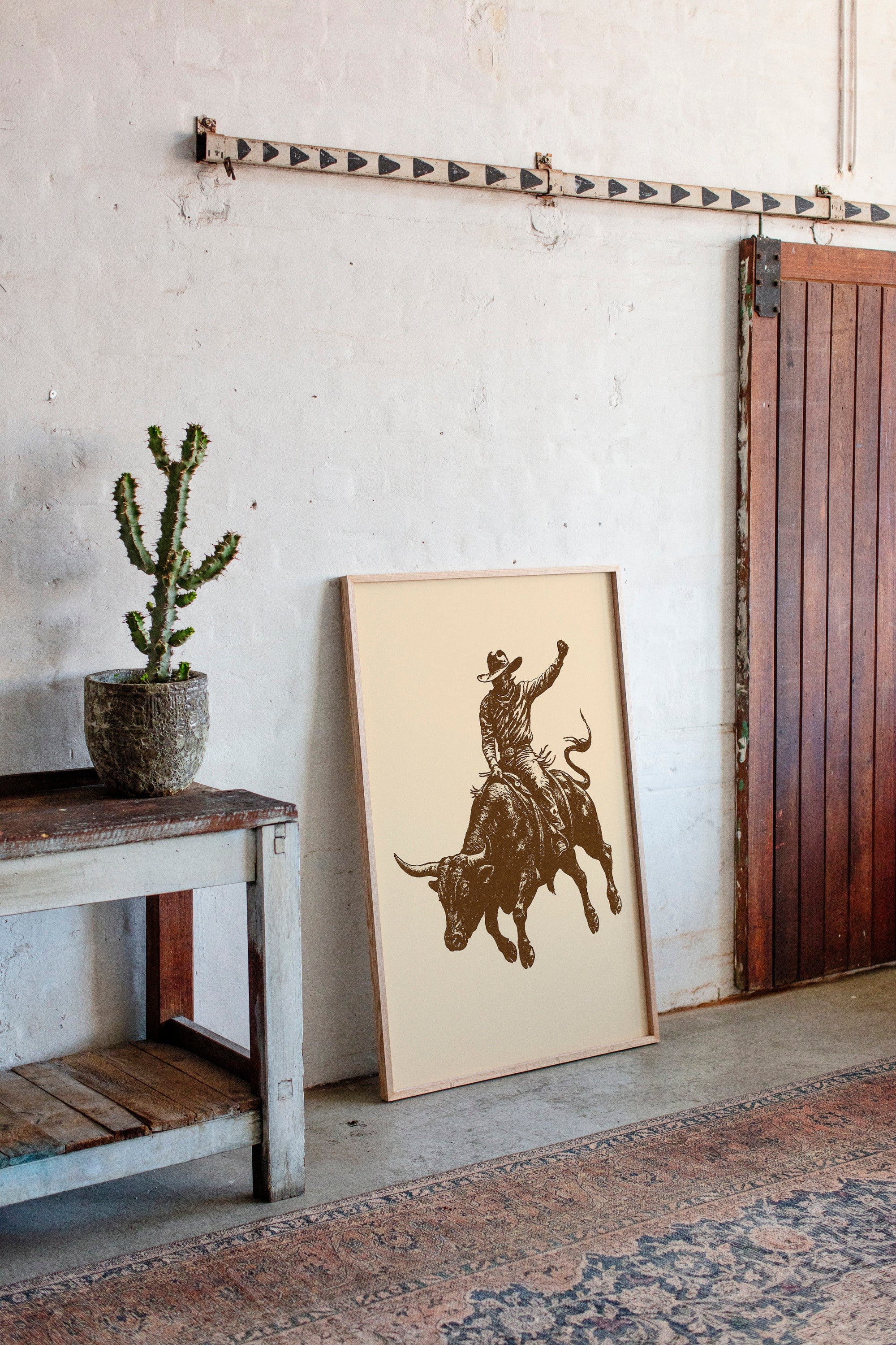 Bold bull riding art in rustic sepia tones, perfect for western lovers and rodeo fans.