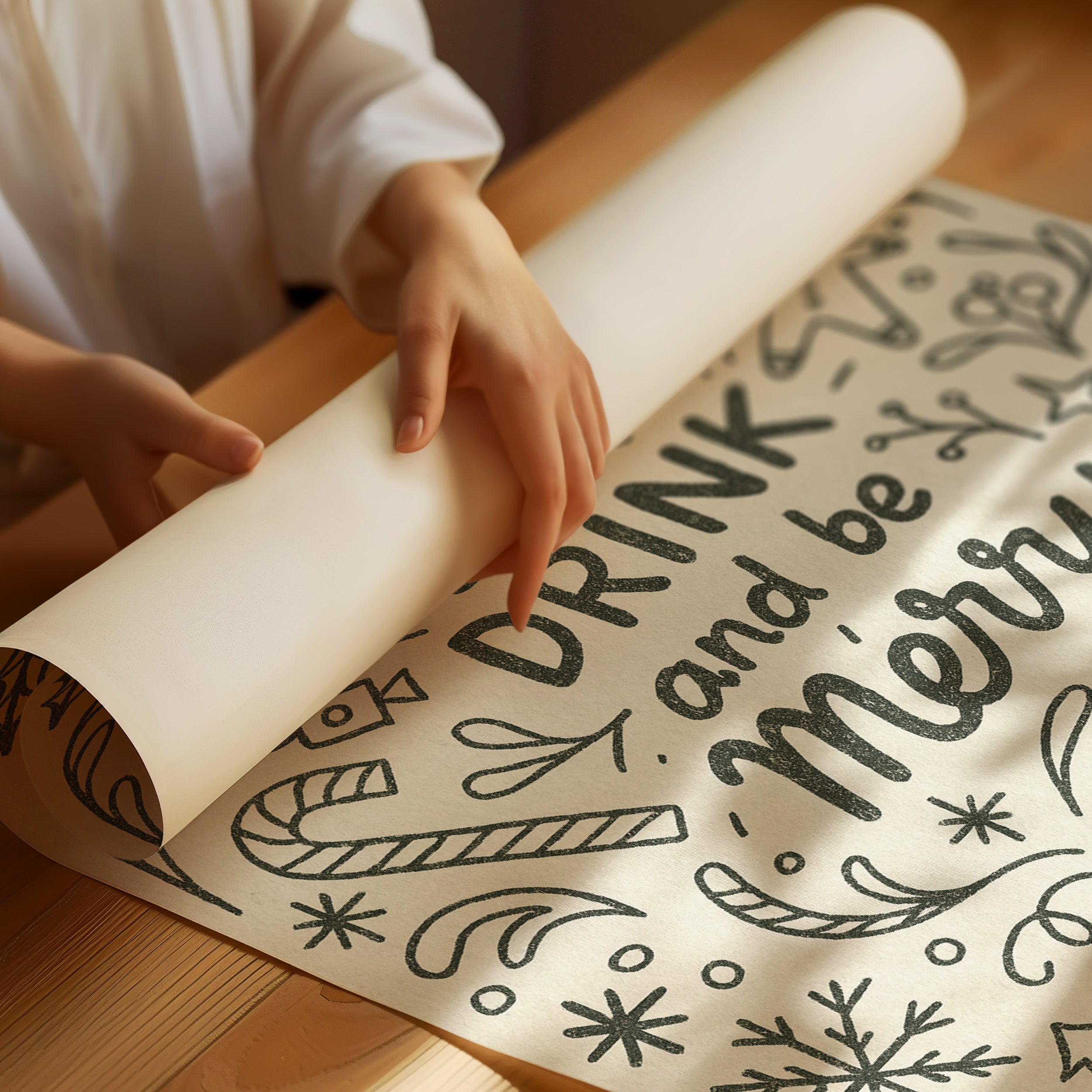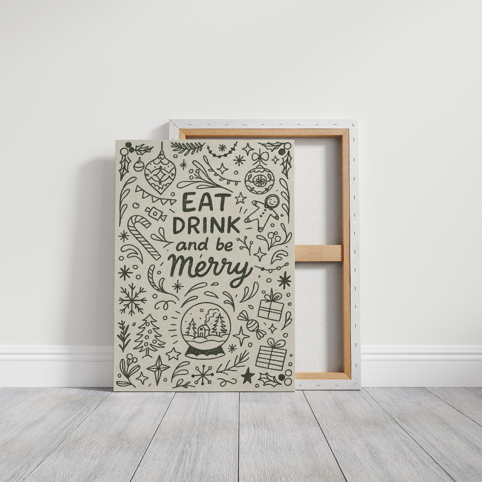 Simple illustrations dance across cream-colored paper, inviting you to celebrate life's festive pleasures. Dark green line art depicts cheerful holiday motifsornaments, candy canes, and snowflakessurrounding the bold reminder to ""EAT DRINK and be Merry."" The print complements the flocked tree adorned with gold and ivory ornaments, creating a harmonious corner of seasonal warmth.