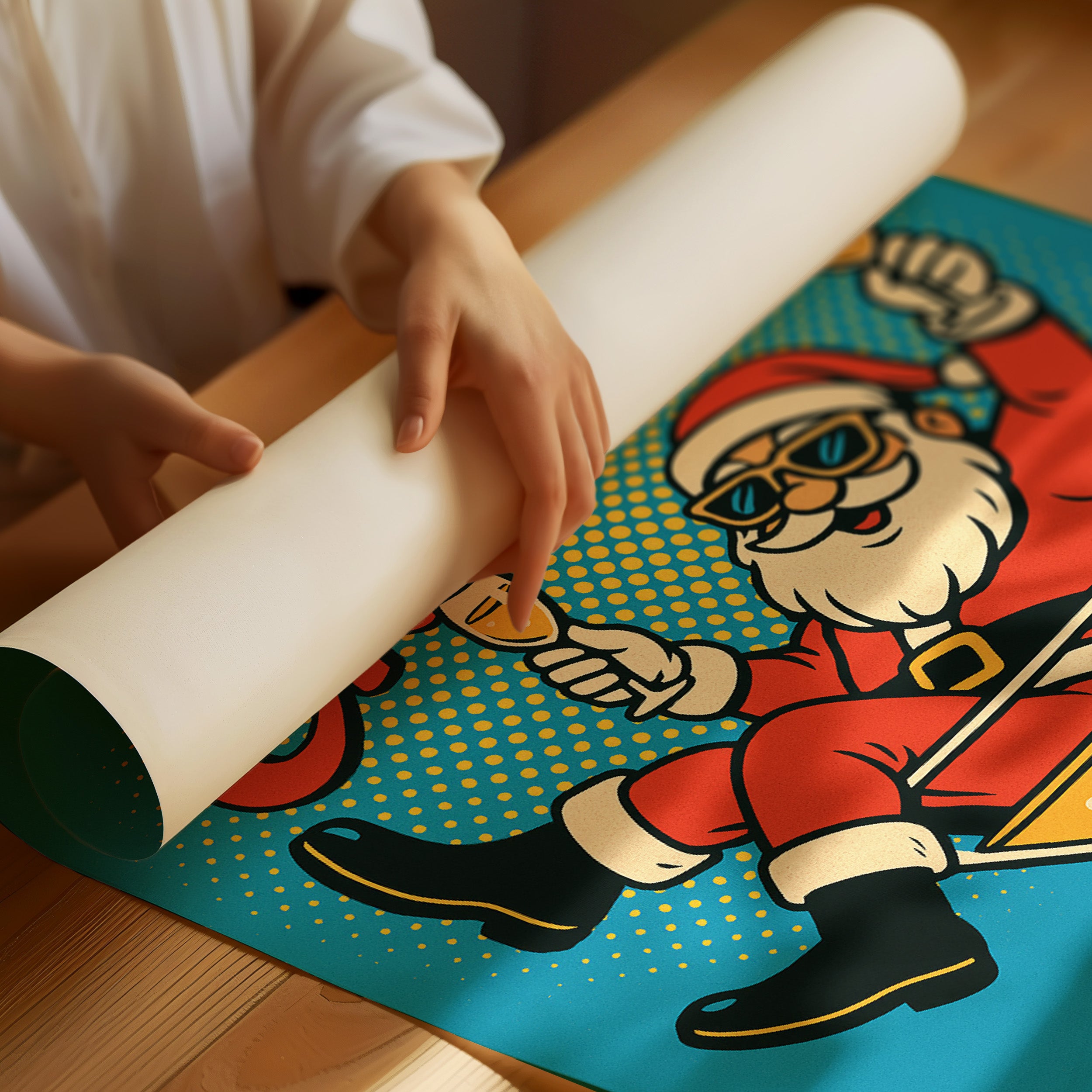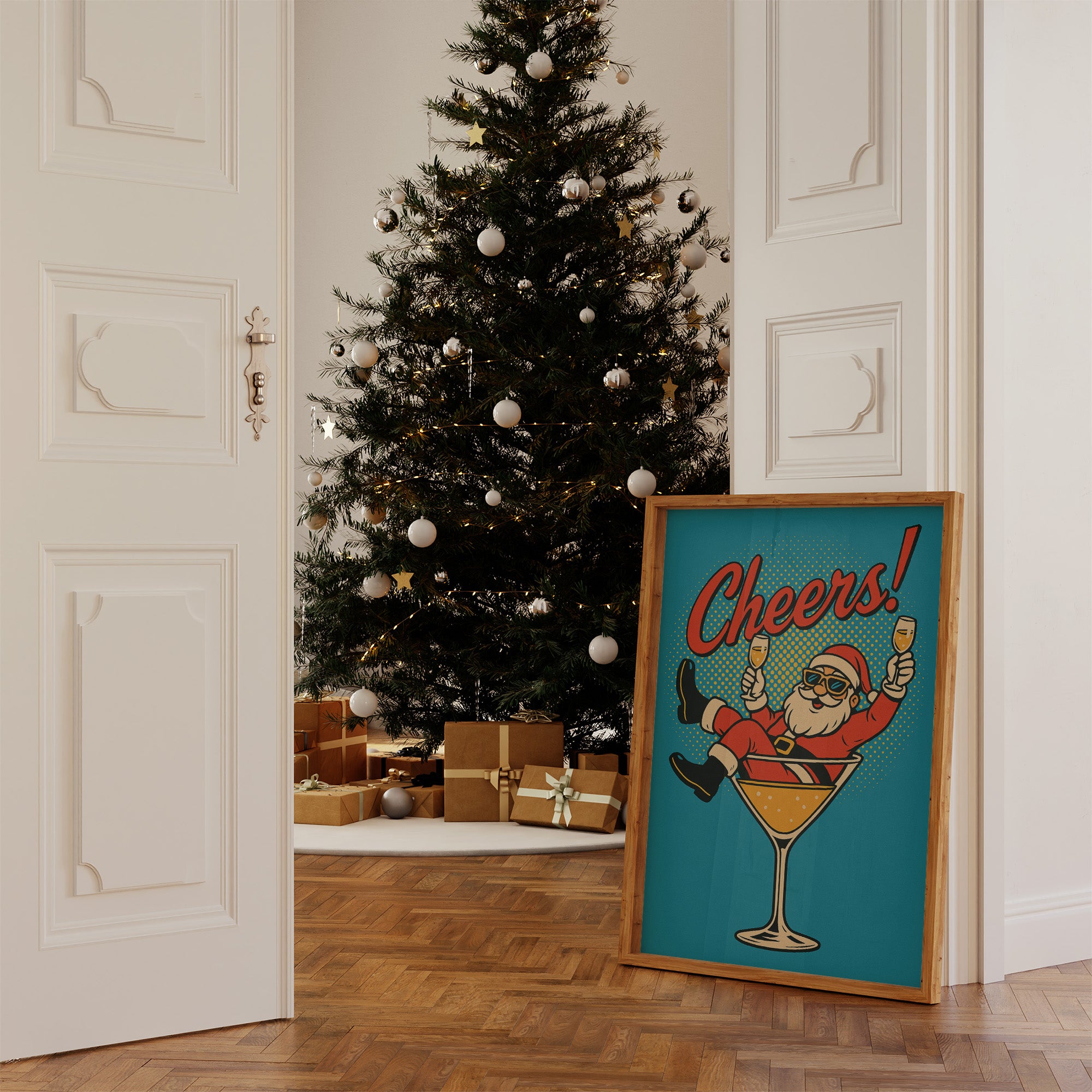 A vibrant splash of retro cheer captures the playful essence of holiday celebration. The pop art illustration features a jolly character lounging in a martini glass against a brilliant turquoise backdrop, raising glasses in festive toast. The bold red and yellow color palette creates a delightful contrast with the halftone dots adding vintage texture and energy to this whimsical scene. This spirited piece adds a touch of nostalgic fun to a home bar, kitchen, or entertainment space during the holiday season.