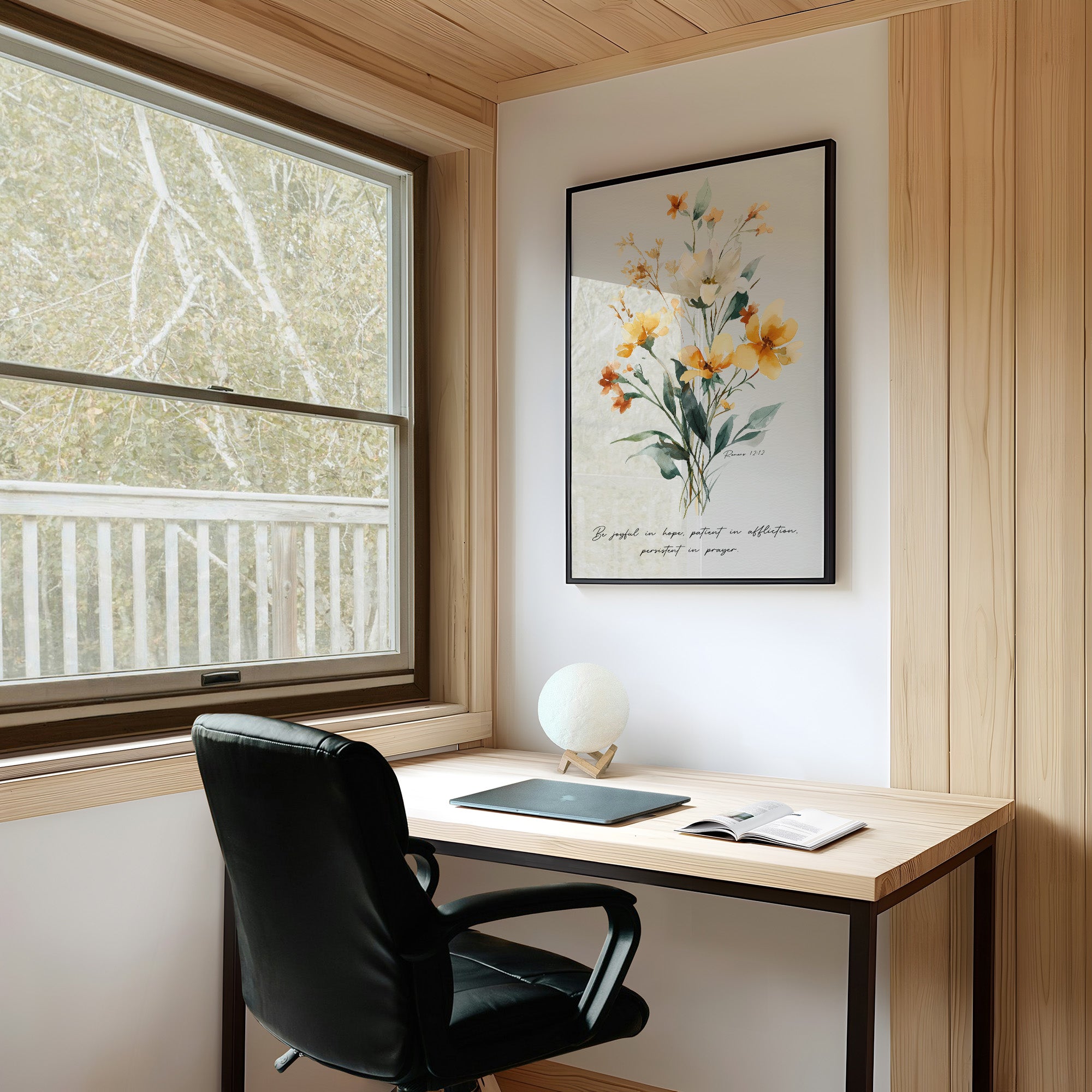 Sunlight filters through delicate petals, casting amber and cream across a moment of quiet devotion. Watercolor blooms dance between faith and artistry, their translucent orange blossoms and single ivory flower reaching skyward with gentle persistence. The scripture verse anchors this spiritual bouquet in purpose, offering both botanical beauty and biblical wisdom for spaces seeking tranquility.