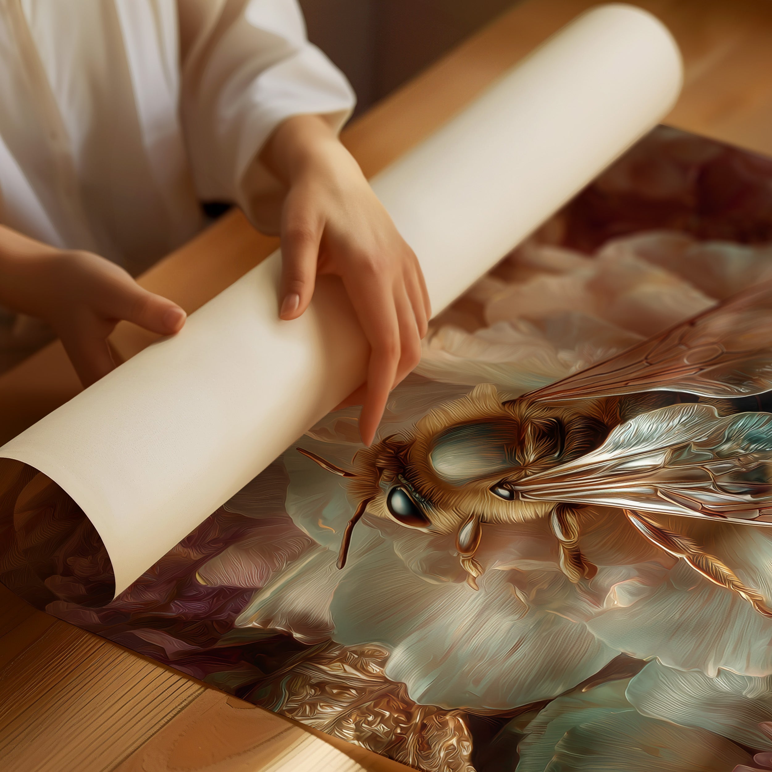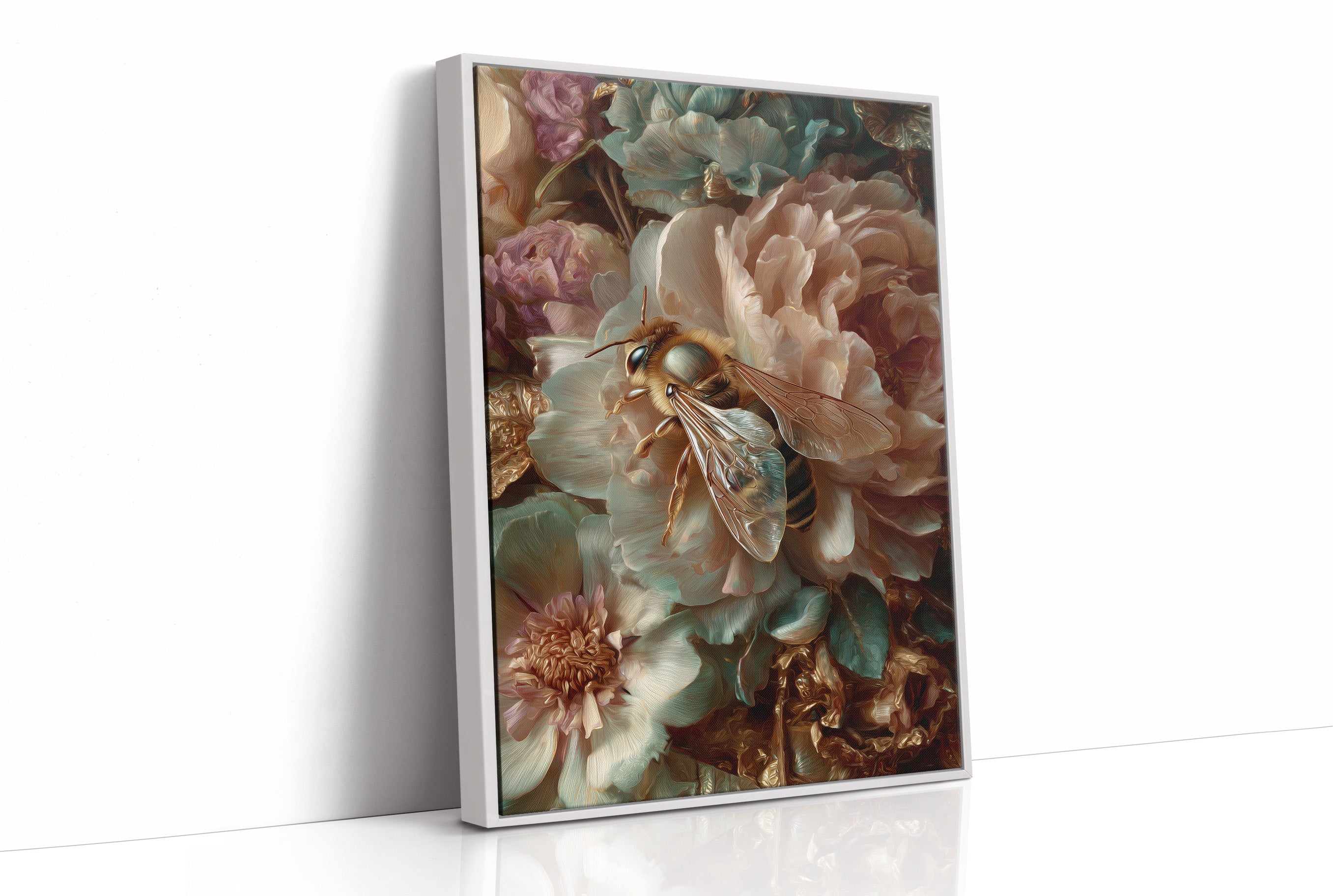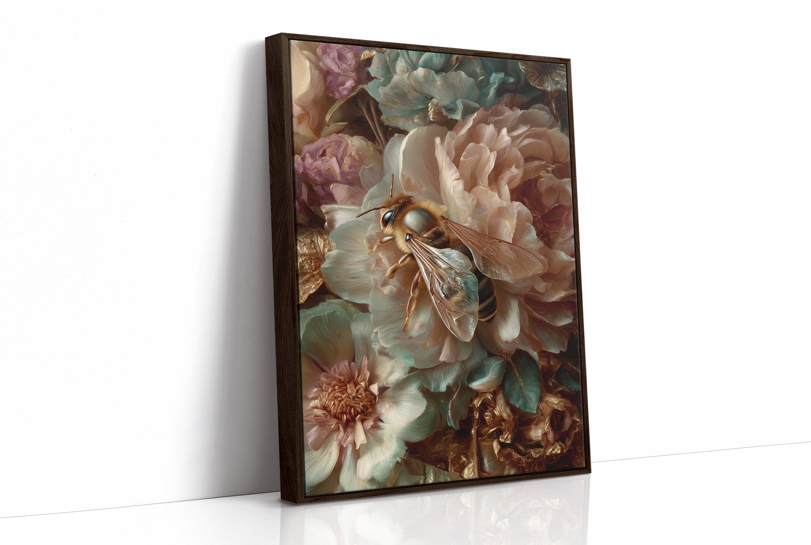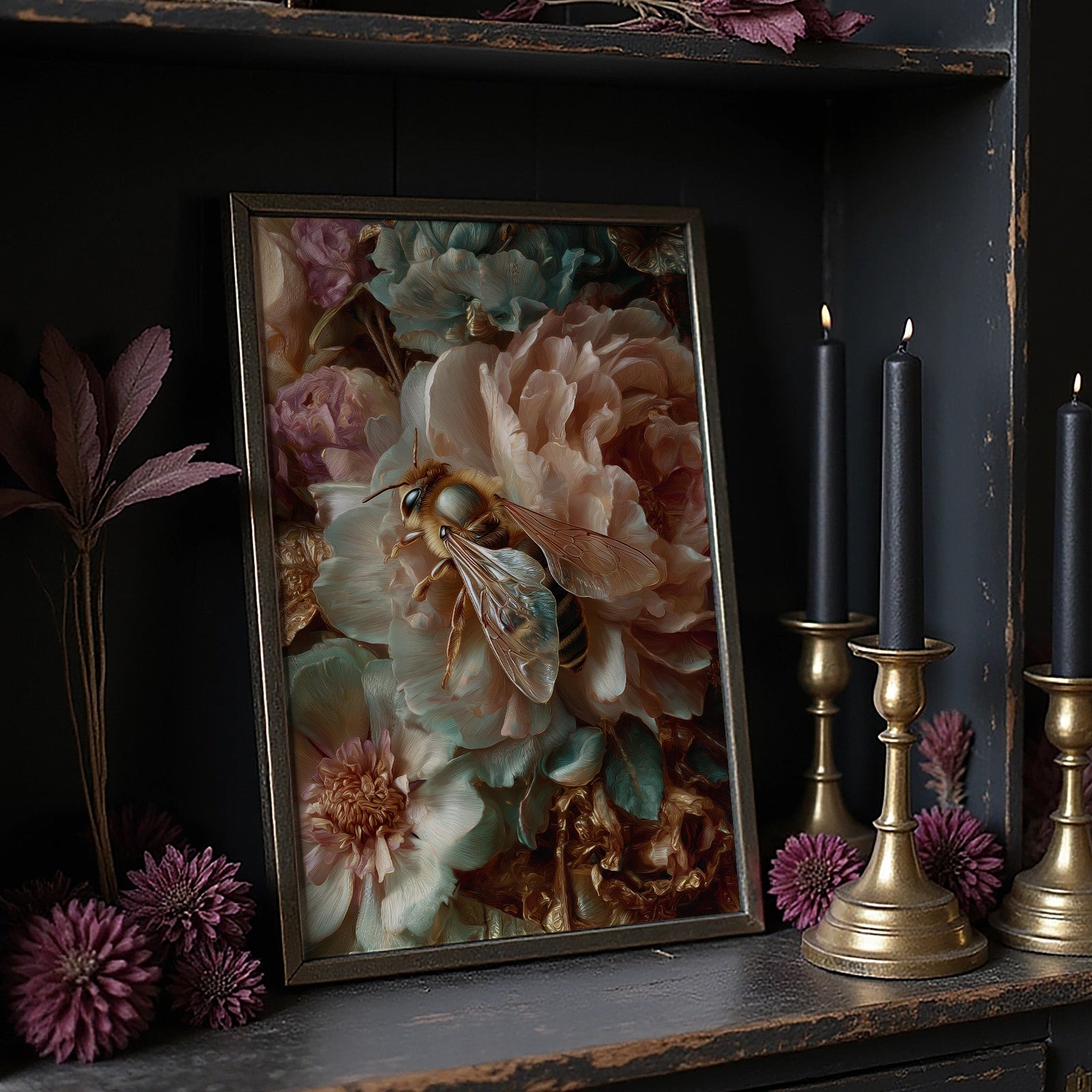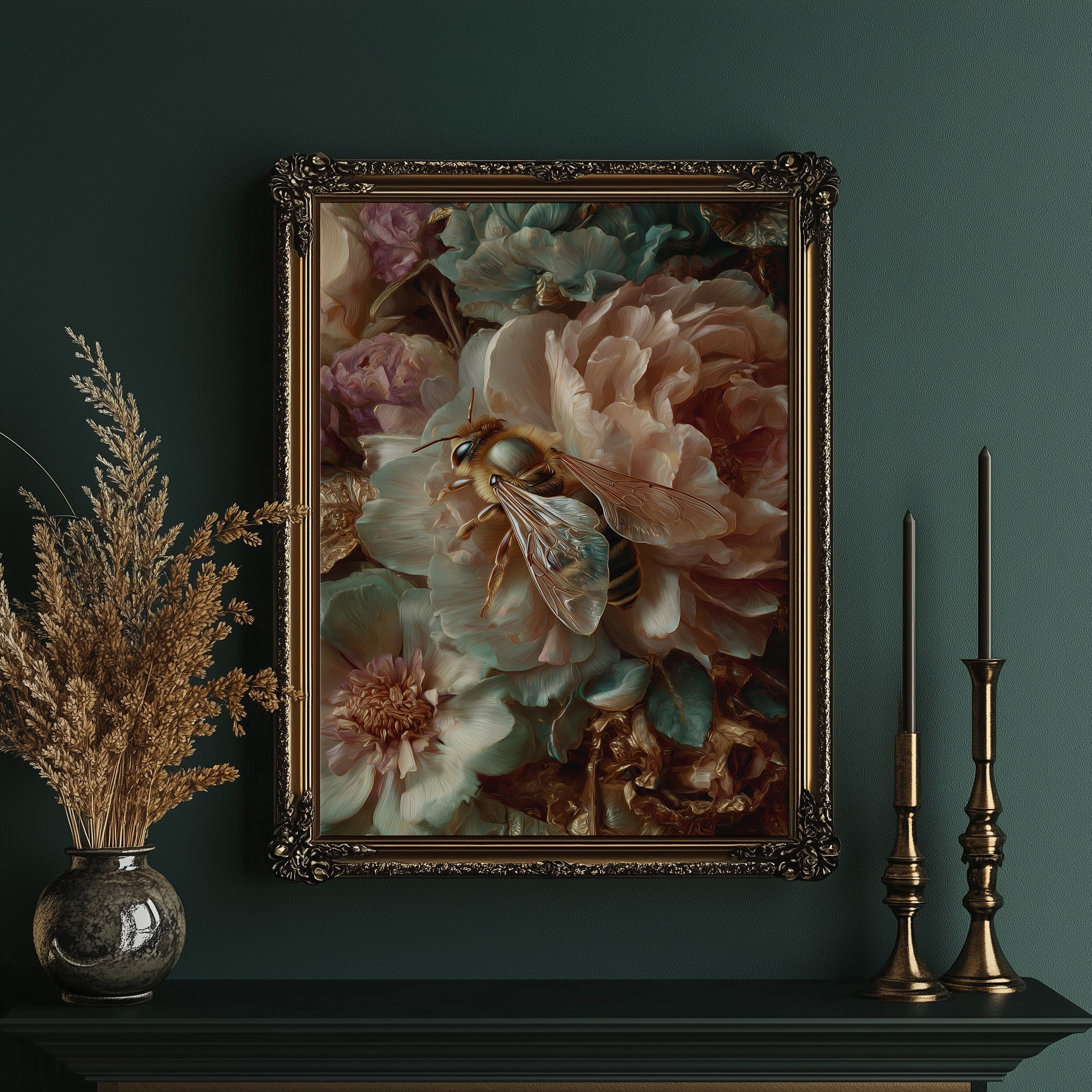 Time stands still as a golden honeybee alights on delicate peony blooms, its translucent wings catching the soft light. Layers of blush, cream, and teal petals unfold in luxurious abundance, creating a rich tapestry of botanical opulence against a shadowy backdrop. The painting captures that perfect moment of pollinationnature's intimate dance between insect and flowerrendered with dramatic depth and painterly realism.