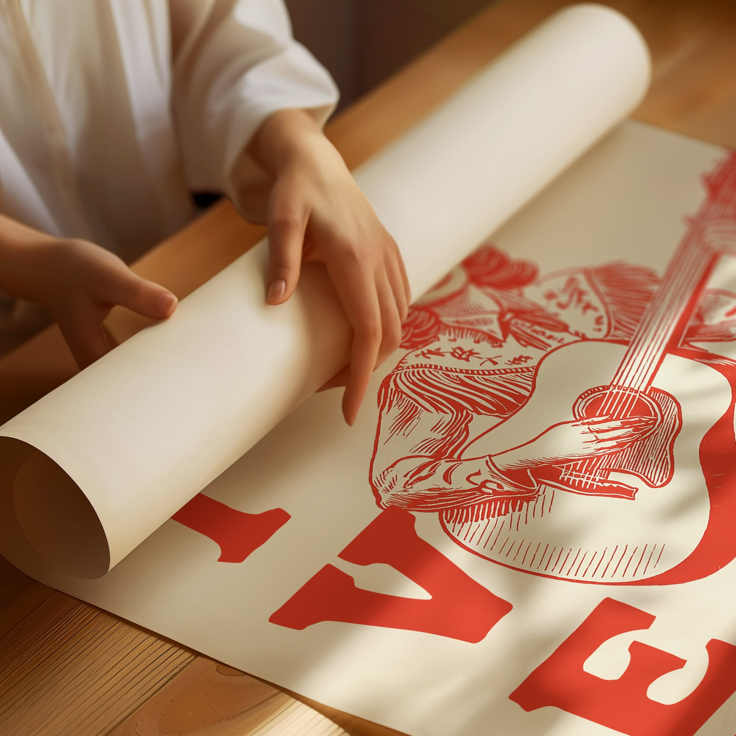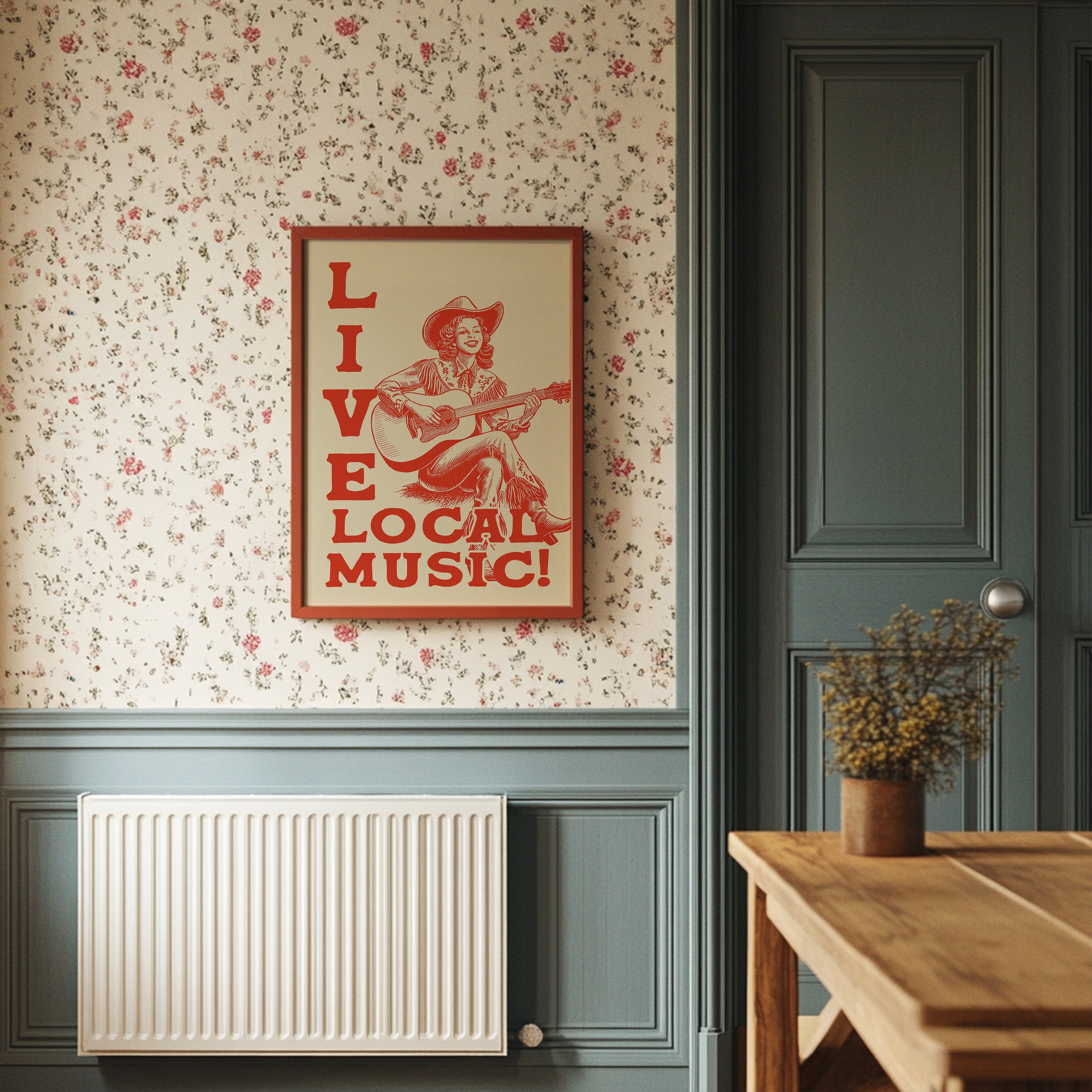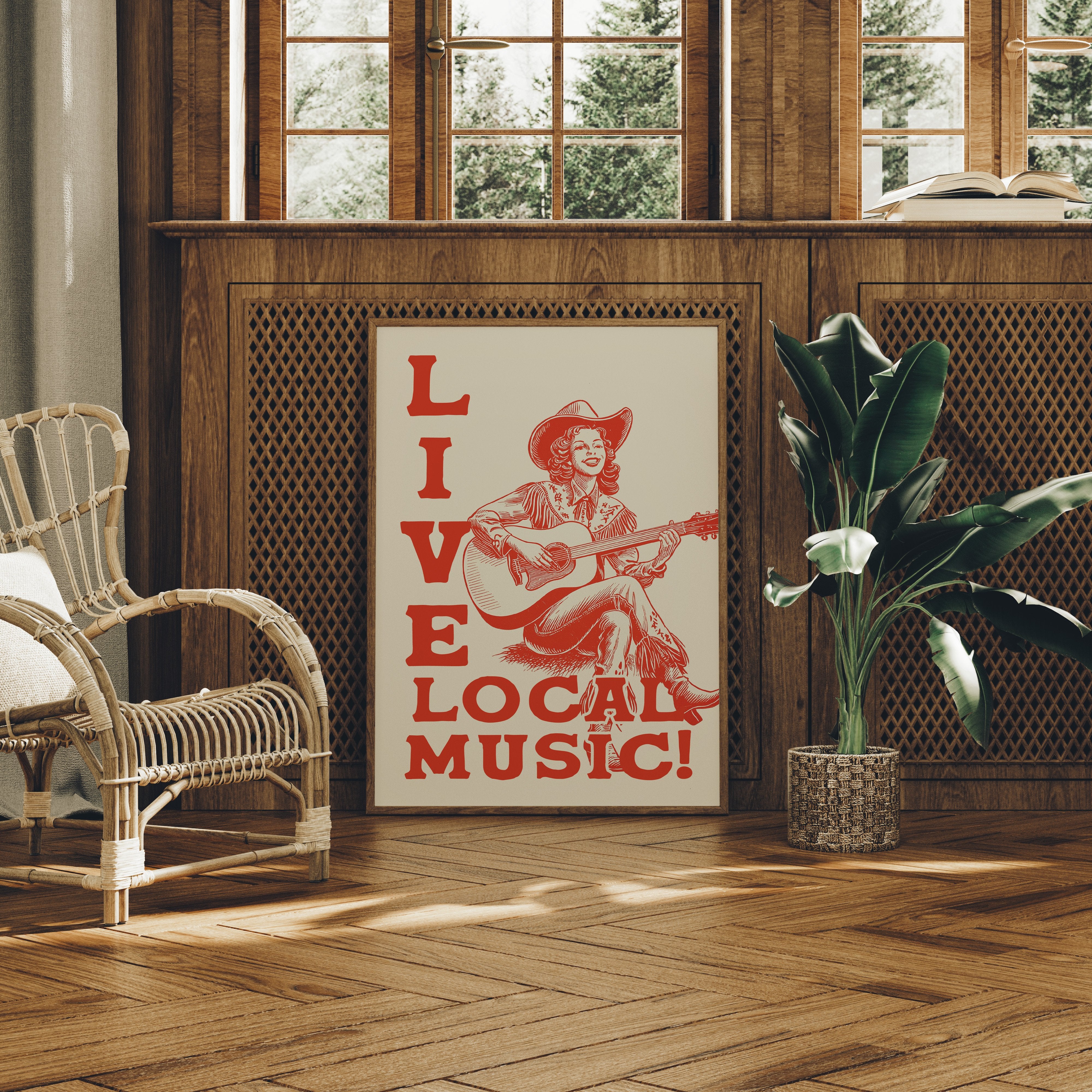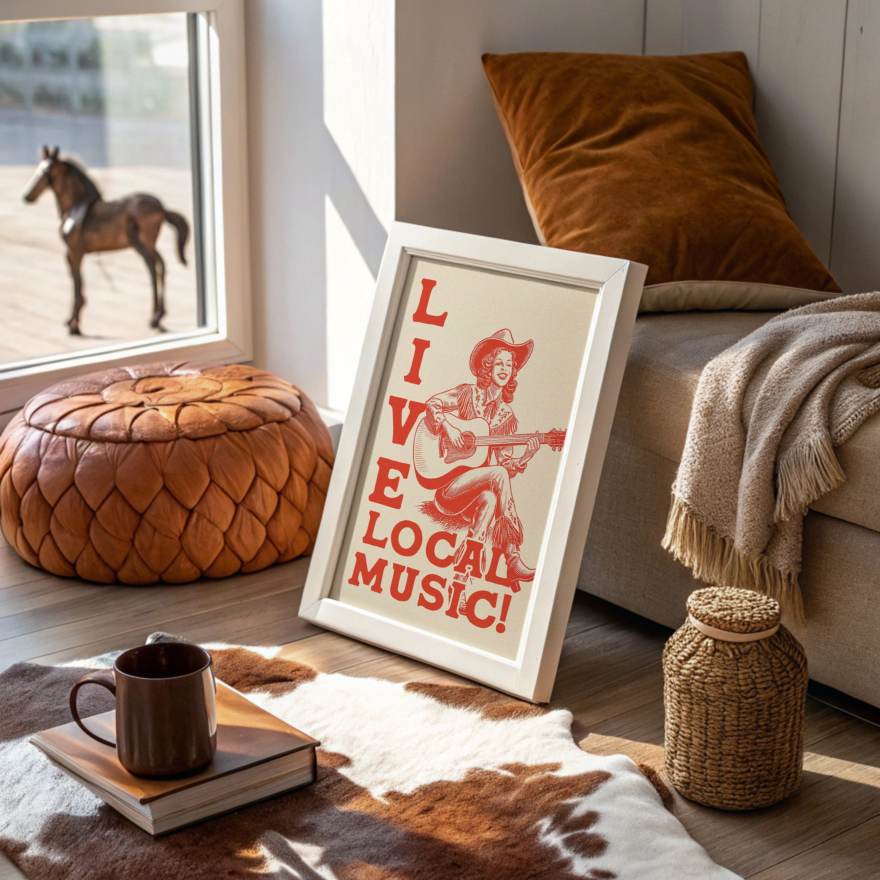 Nostalgia strums its way across this striking monochromatic illustration, where vintage charm meets musical tradition. The bold red line art against a cream background captures the essence of Americana, with its detailed rendering of a cowgirl musician complete with embroidered western wear and wide-brimmed hat. The typography boldly declares a love for local sounds, celebrating the grassroots spirit of community performance and regional musical heritage. This piece would bring a harmonious touch of retro character to a music room, home studio, or any space that honors the authentic roots of American culture.