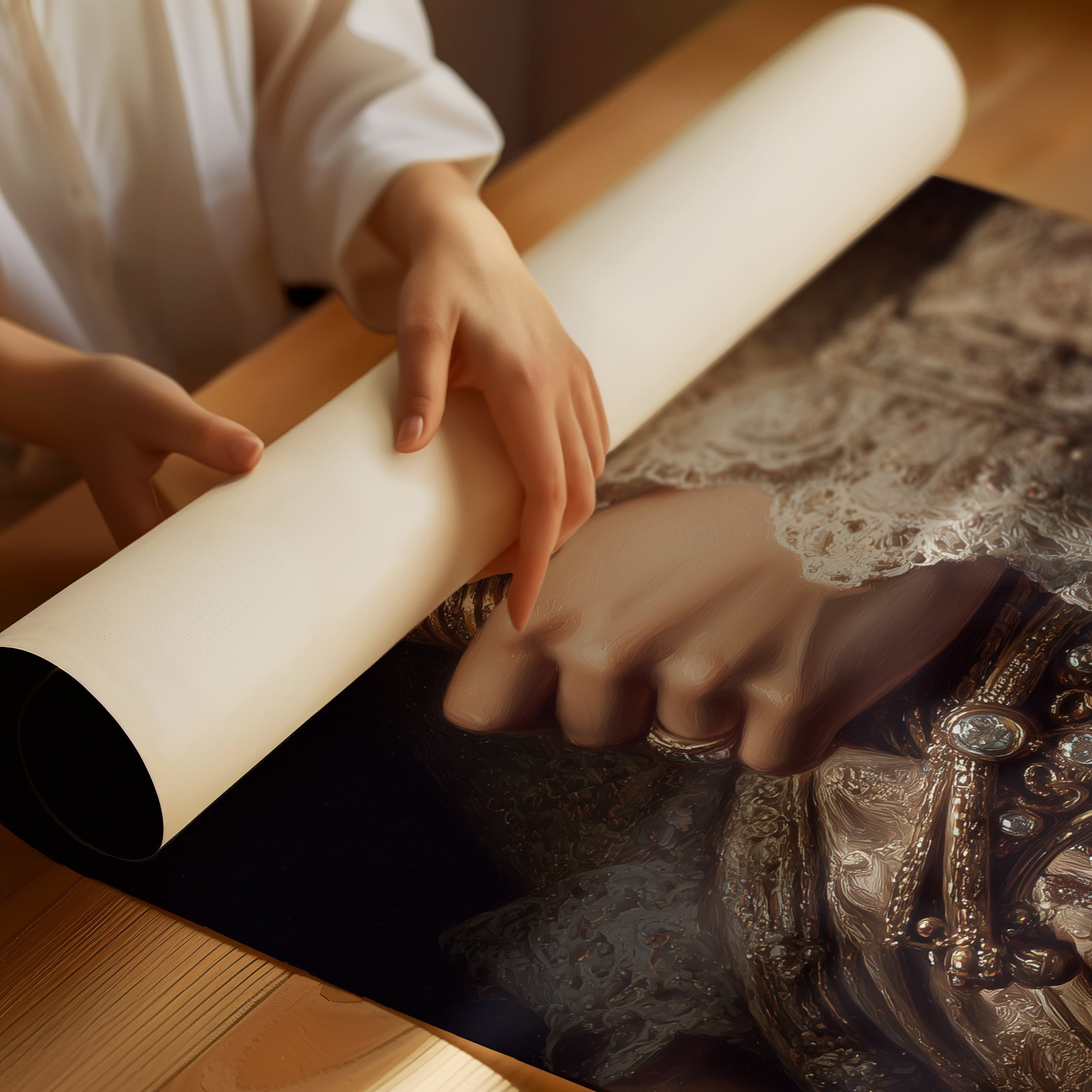 A moment suspended in time, where delicate lace meets cold metal in an elegant dance of contrast. The ornate details of the period costume glow with subtle warmth against the mysterious darkness, revealing intricate embroidery and the gentle curve of a hand gripping a ceremonial sword. This contemporary reimagining of classical portraiture speaks to the duality of power and refinement, strength wrapped in softness.