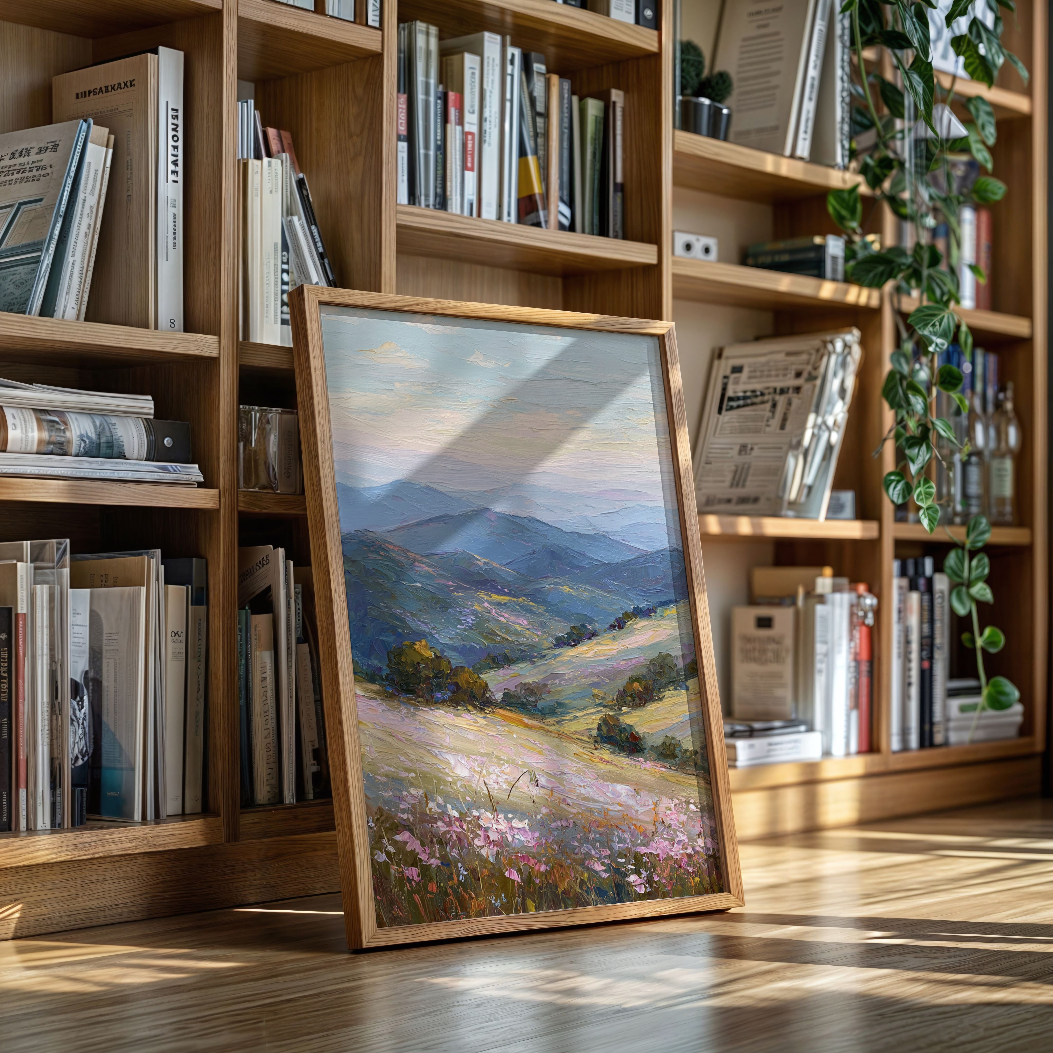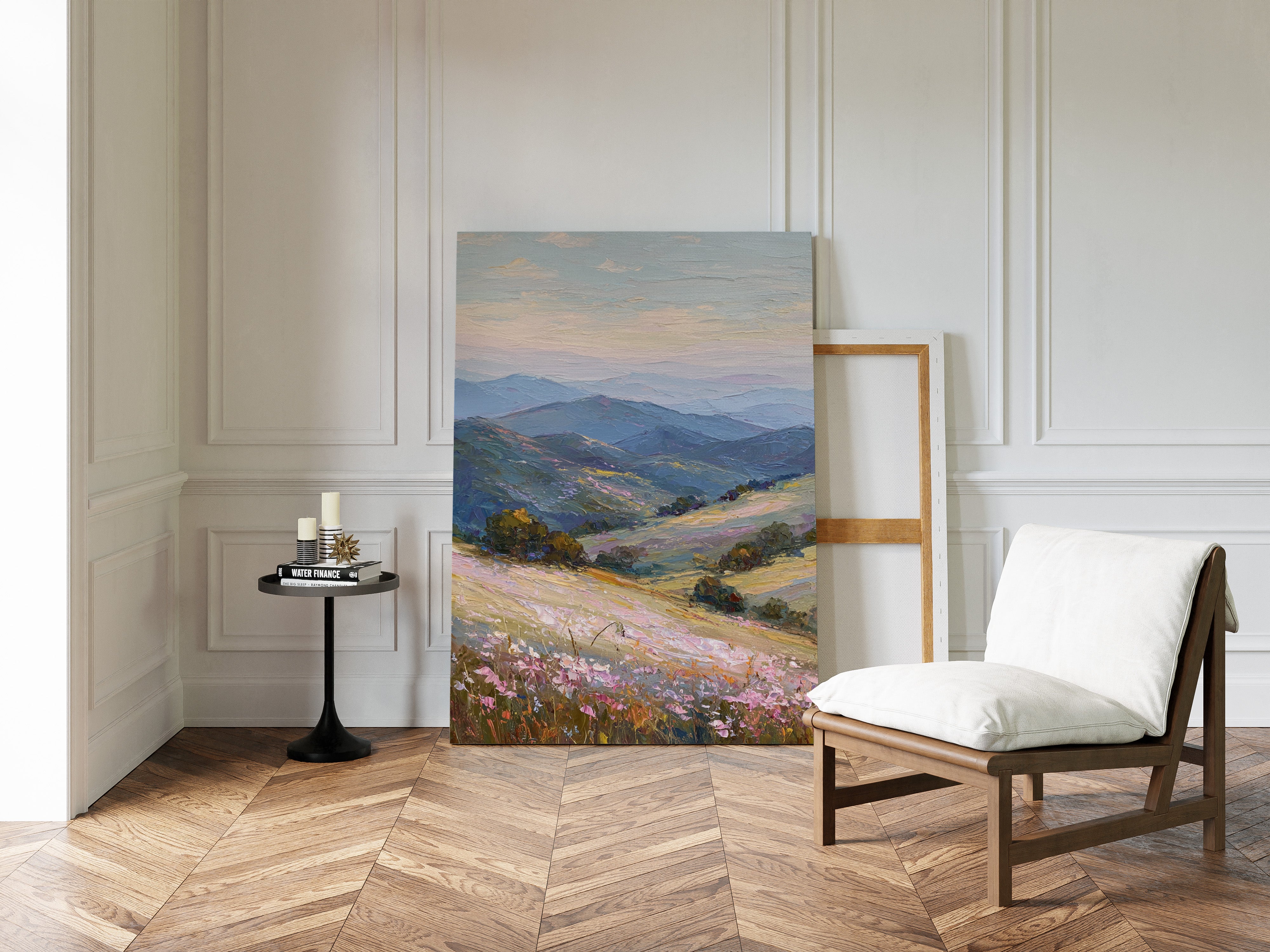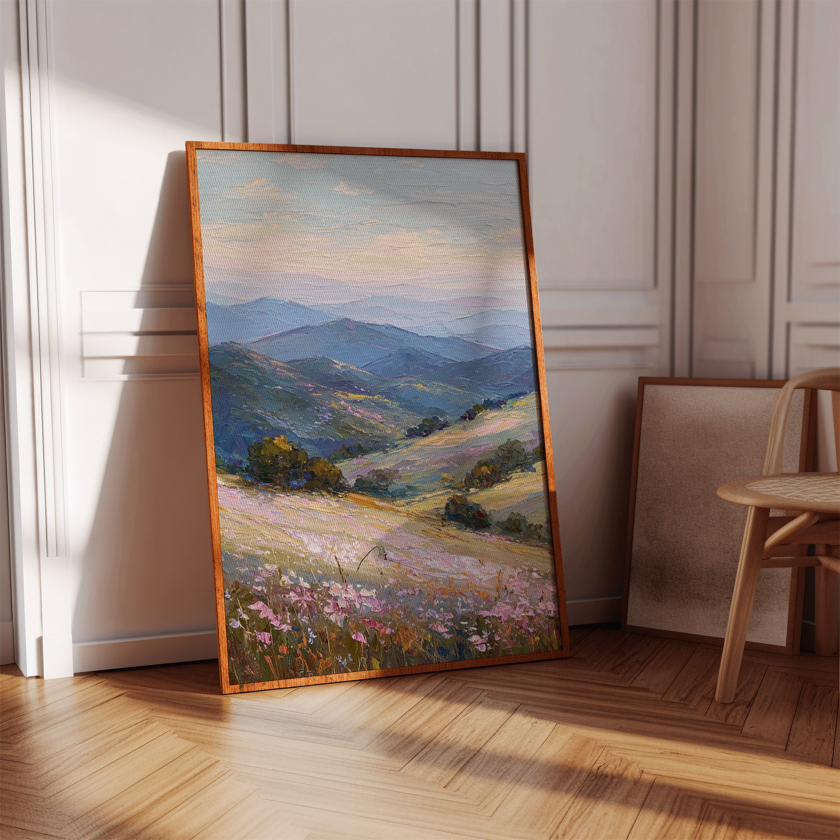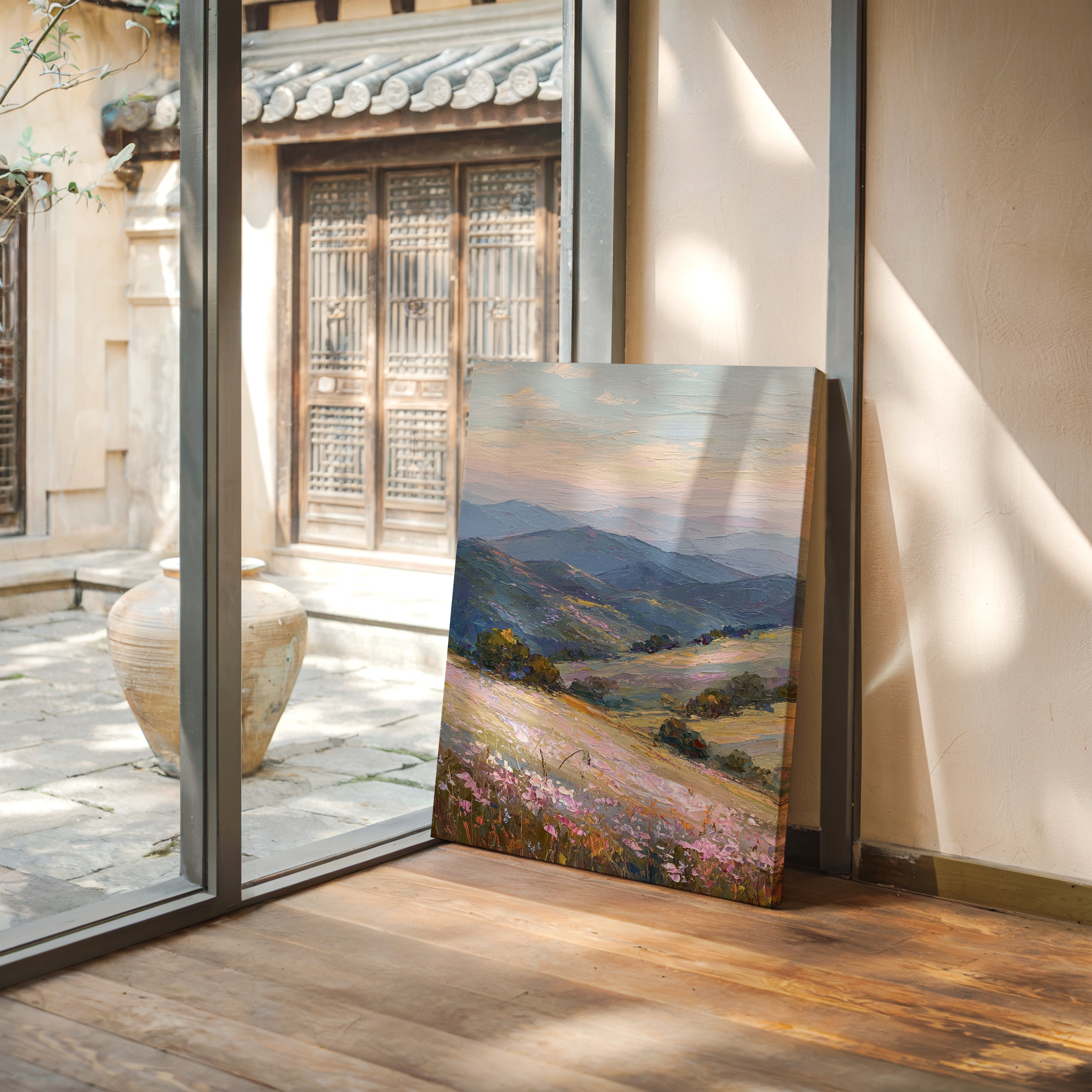 As the sun dips lower, a gentle breeze stirs the wildflowers, painting the landscape in hues of gold and lavender. This piece captures the essence of pastoral beauty, reminiscent of serene moments spent in nature's embrace. Layered strokes of vibrant colors evoke the rolling hills and blooming fields, inviting a sense of peace and tranquility. Perfect for a cozy reading nook or a tranquil bedroom, this artwork enhances the warmth of any space.