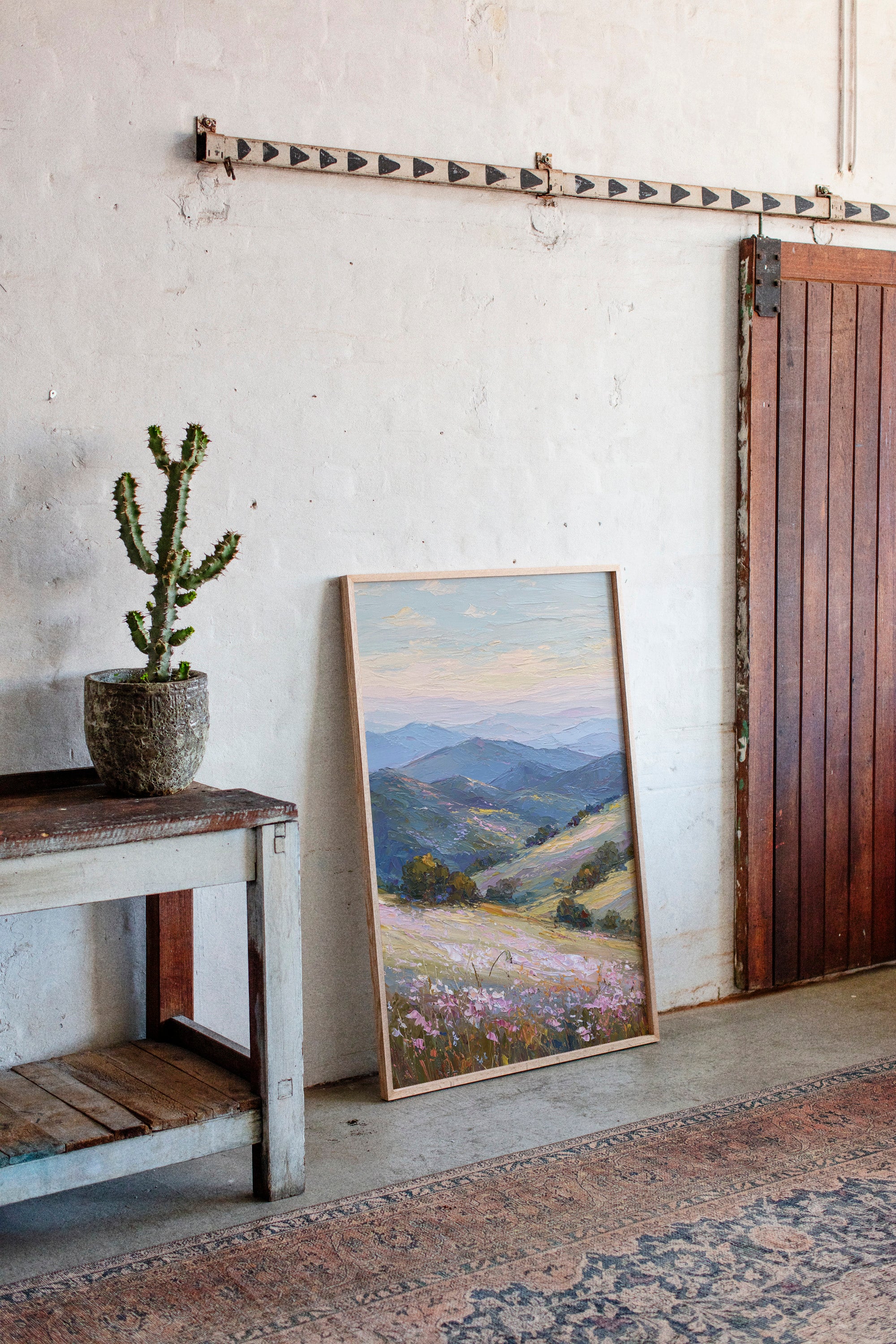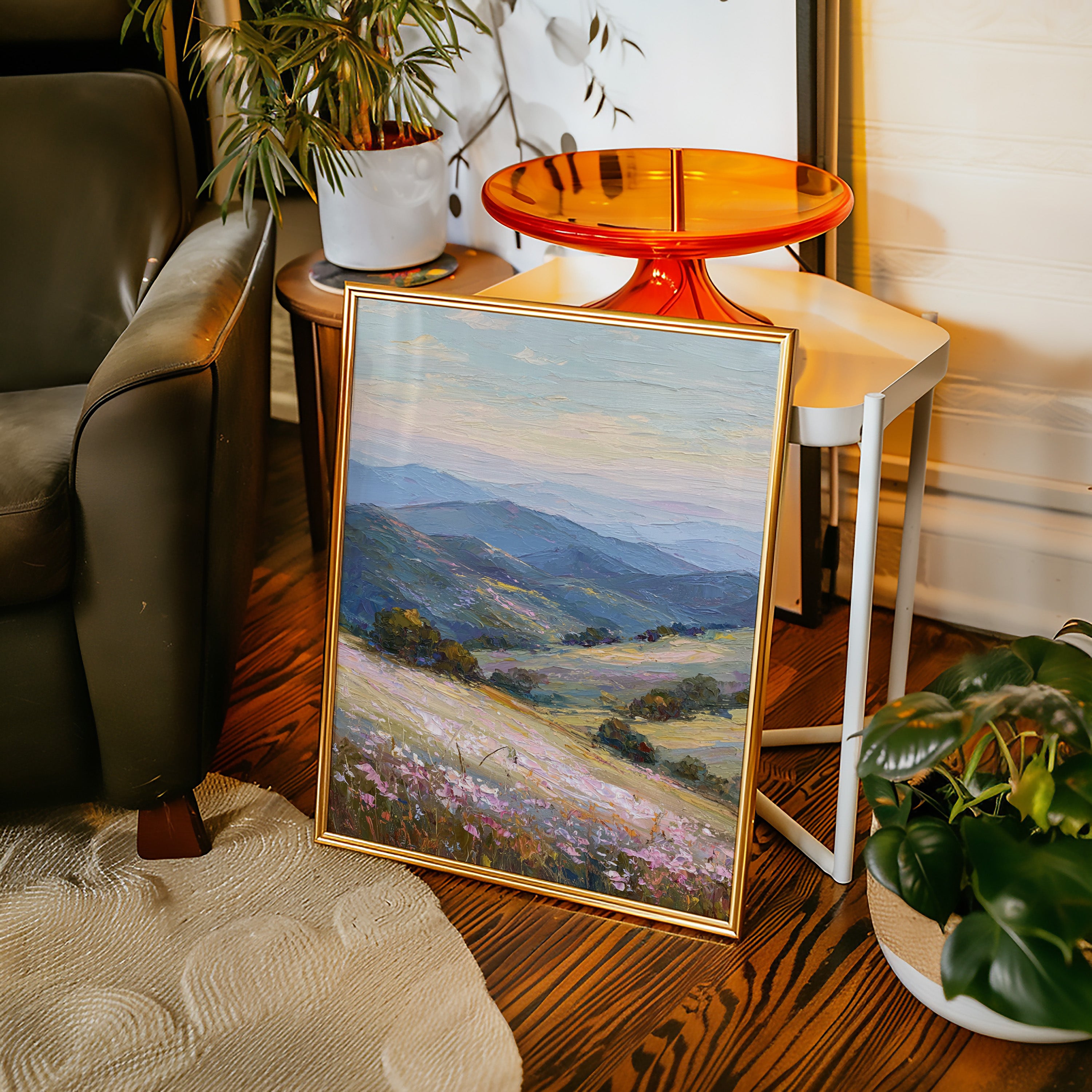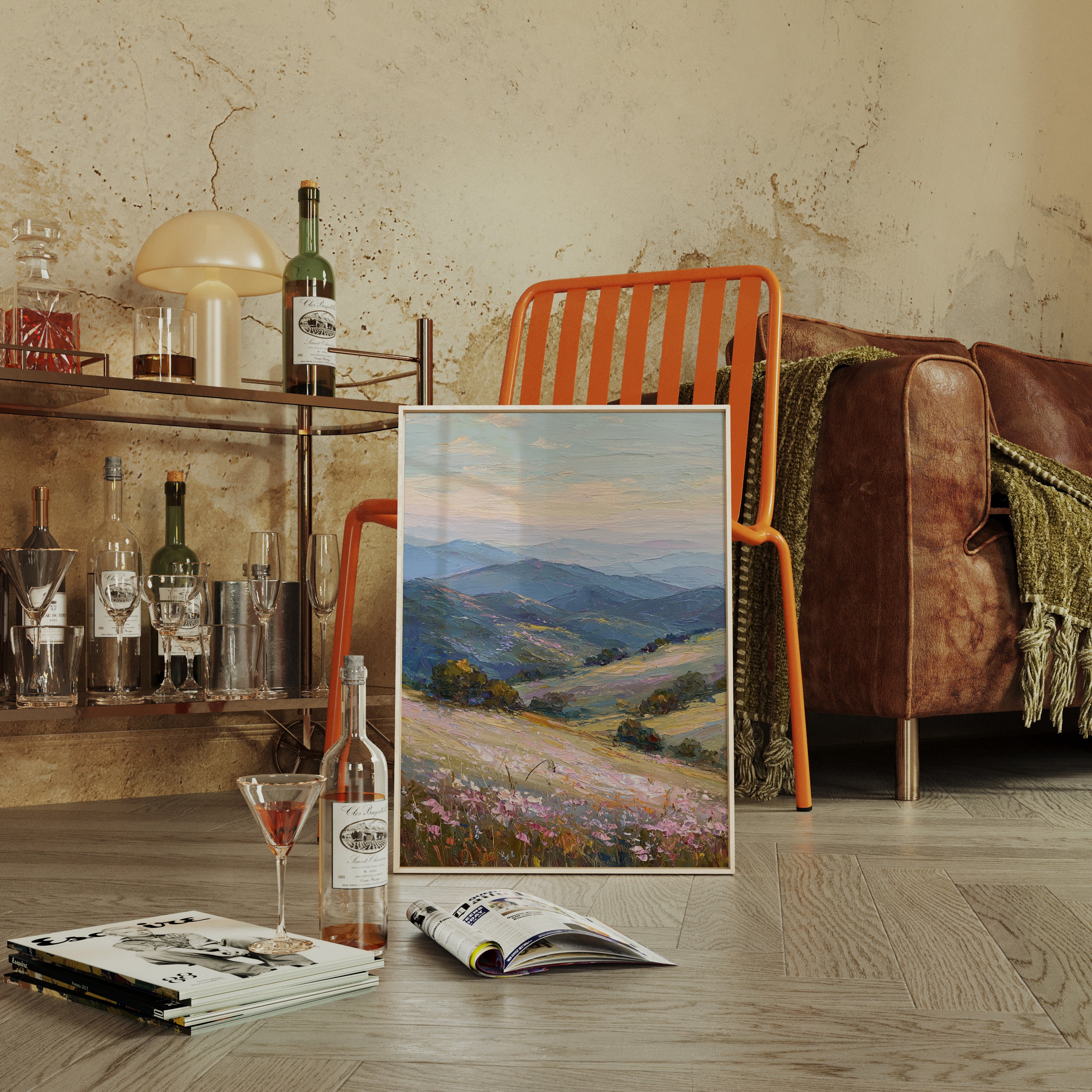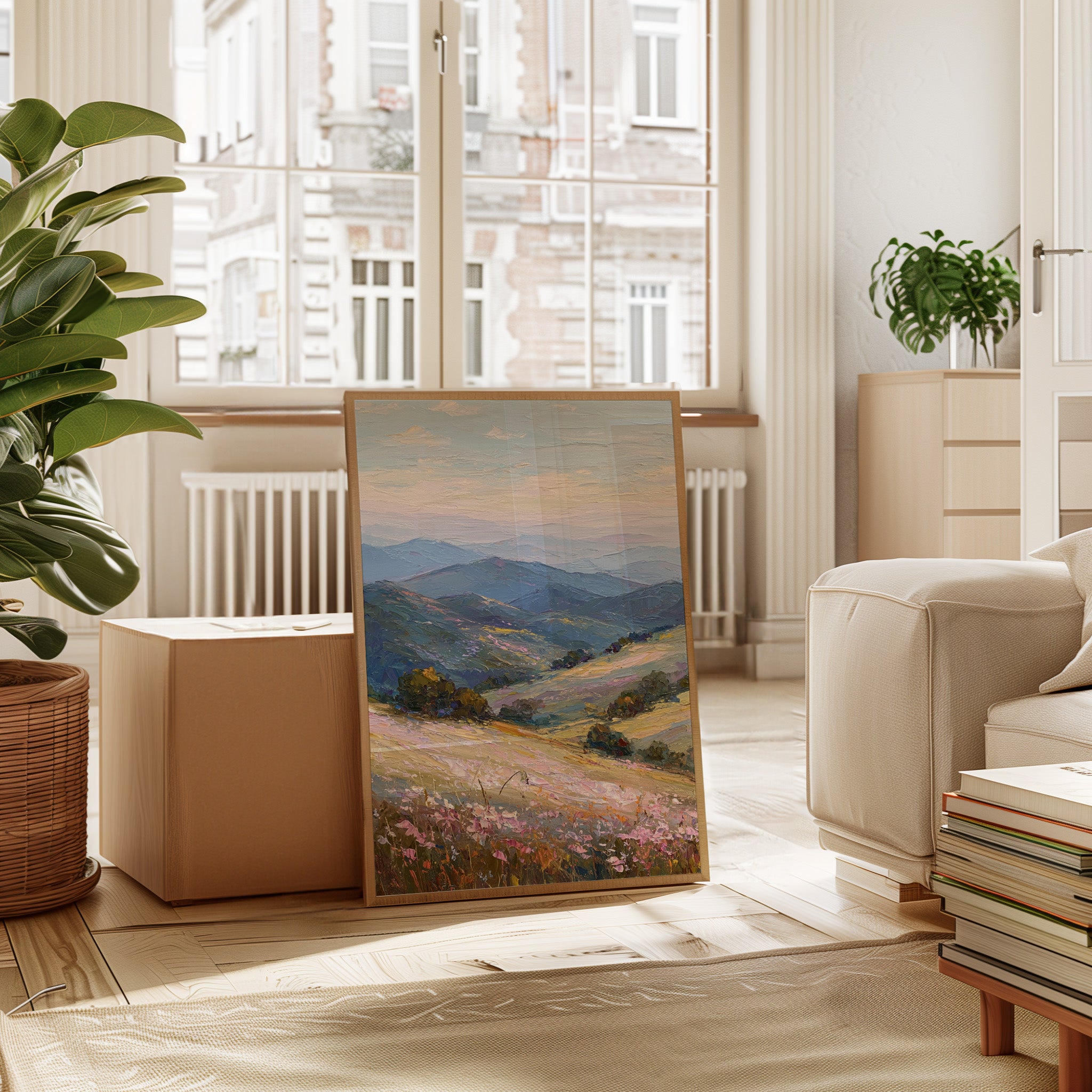 As the sun dips lower, a gentle breeze stirs the wildflowers, painting the landscape in hues of gold and lavender. This piece captures the essence of pastoral beauty, reminiscent of serene moments spent in nature's embrace. Layered strokes of vibrant colors evoke the rolling hills and blooming fields, inviting a sense of peace and tranquility. Perfect for a cozy reading nook or a tranquil bedroom, this artwork enhances the warmth of any space.