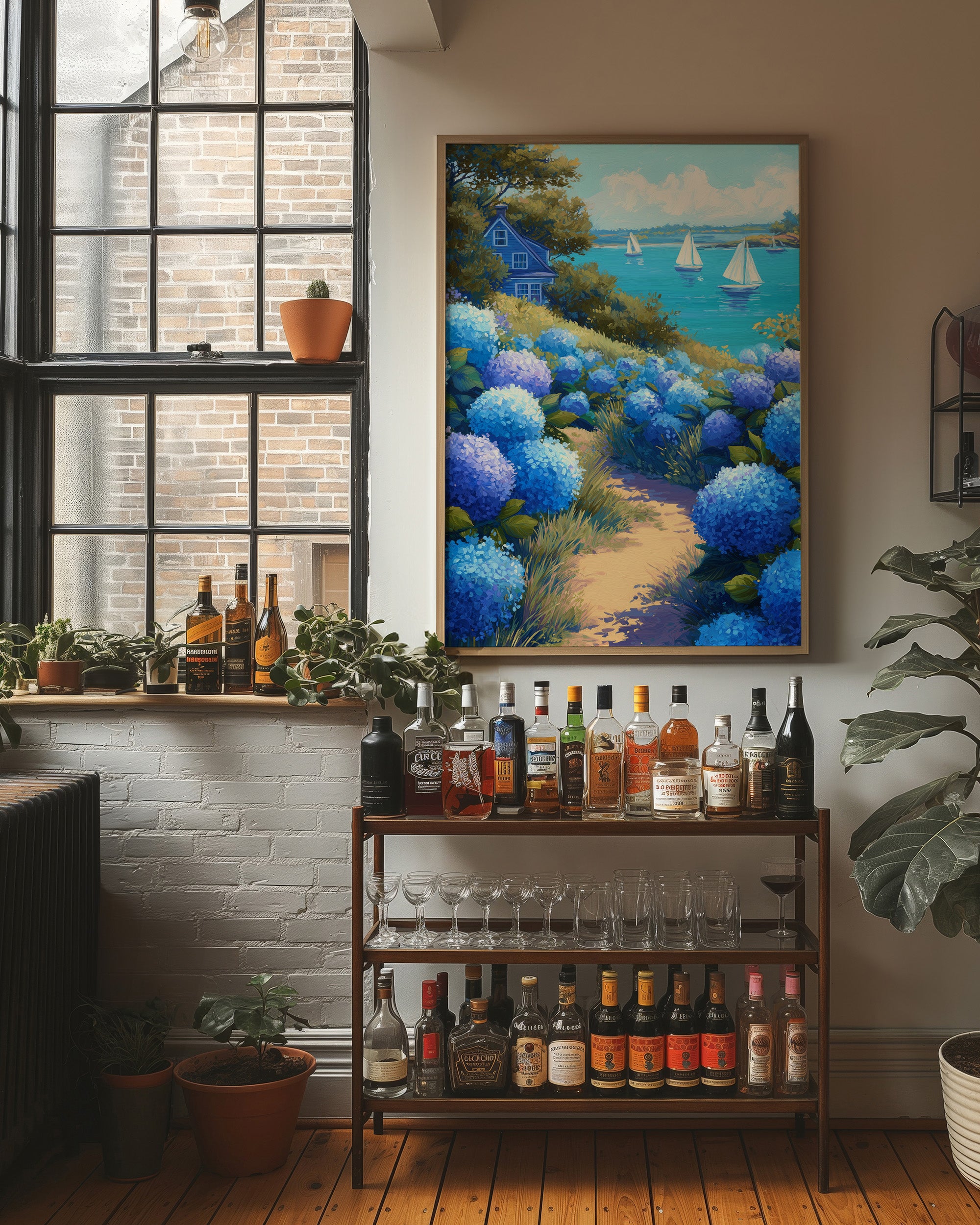 A vibrant coastal scene capturing the harmony between land and sea. A sandy path winds through lush blue hydrangea blooms, leading the eye toward a tranquil bay where white sailboats drift on turquoise waters. Nestled among green foliage sits a charming blue cottage overlooking the harbor.