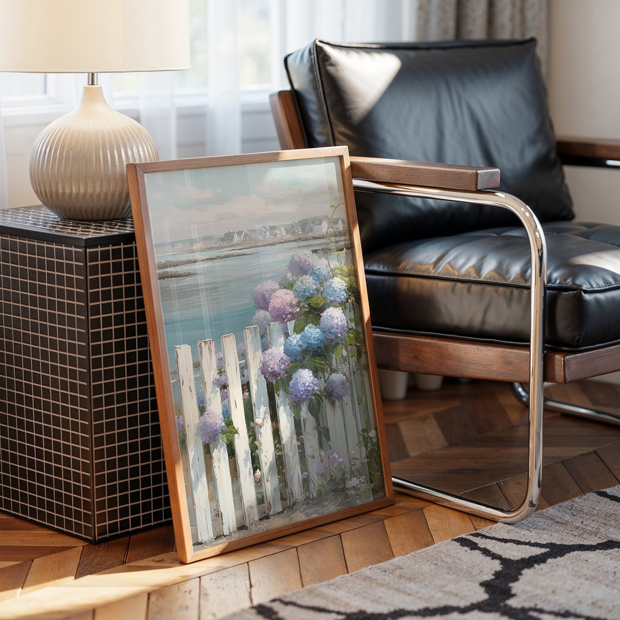 Beyond the floral foreground, a tranquil bay stretches toward distant shoreline houses under a soft blue sky with gentle clouds. The painting's impressionistic style captures the peaceful atmosphere of seaside living, with muted colors and delicate brushwork creating a dreamy coastal escape.