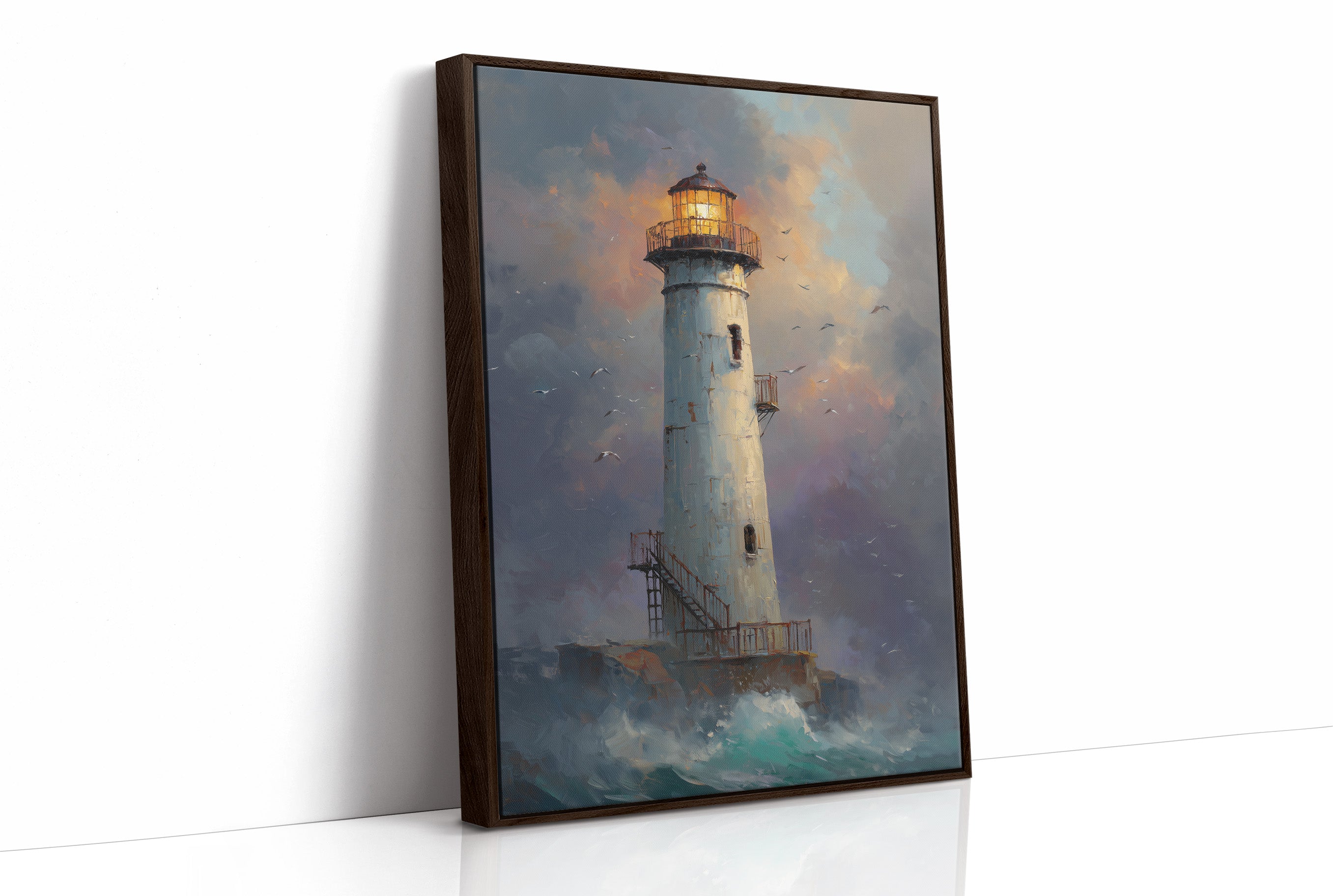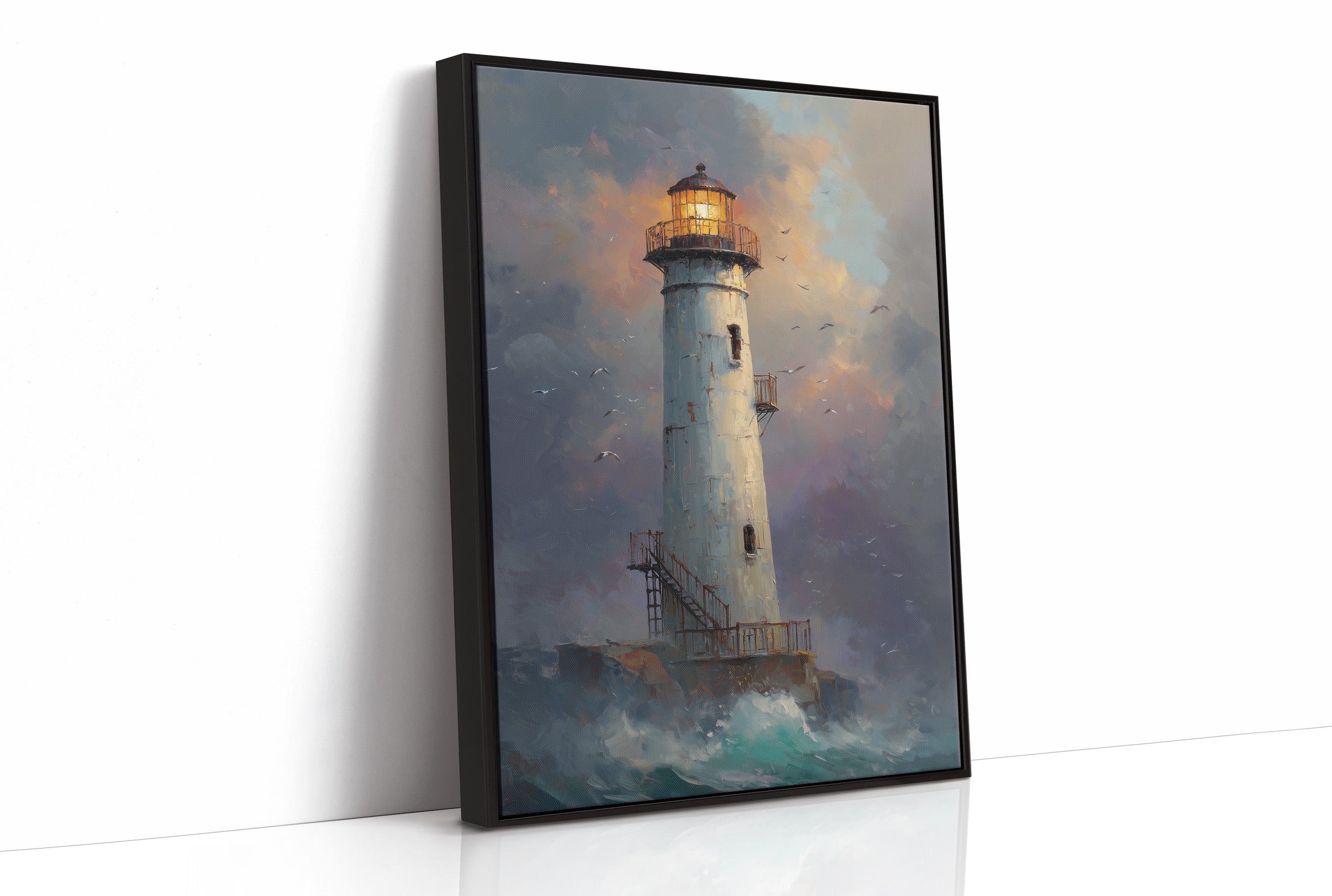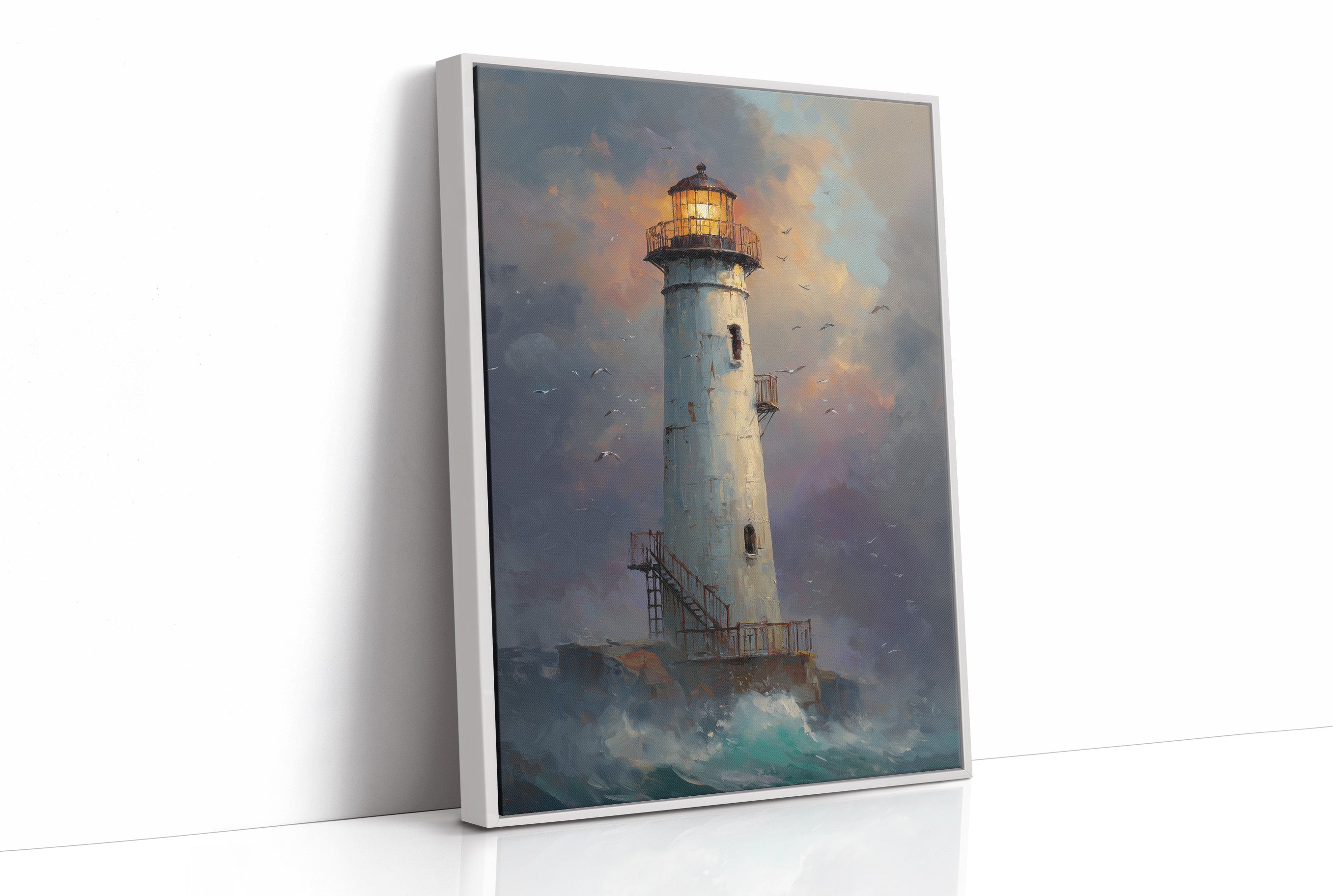 The white lighthouse tower rises majestically from rocky shores as turbulent waves crash below. Its lantern blues, and sunset oranges. Seabirds circle the structure, adding movement to the composition.