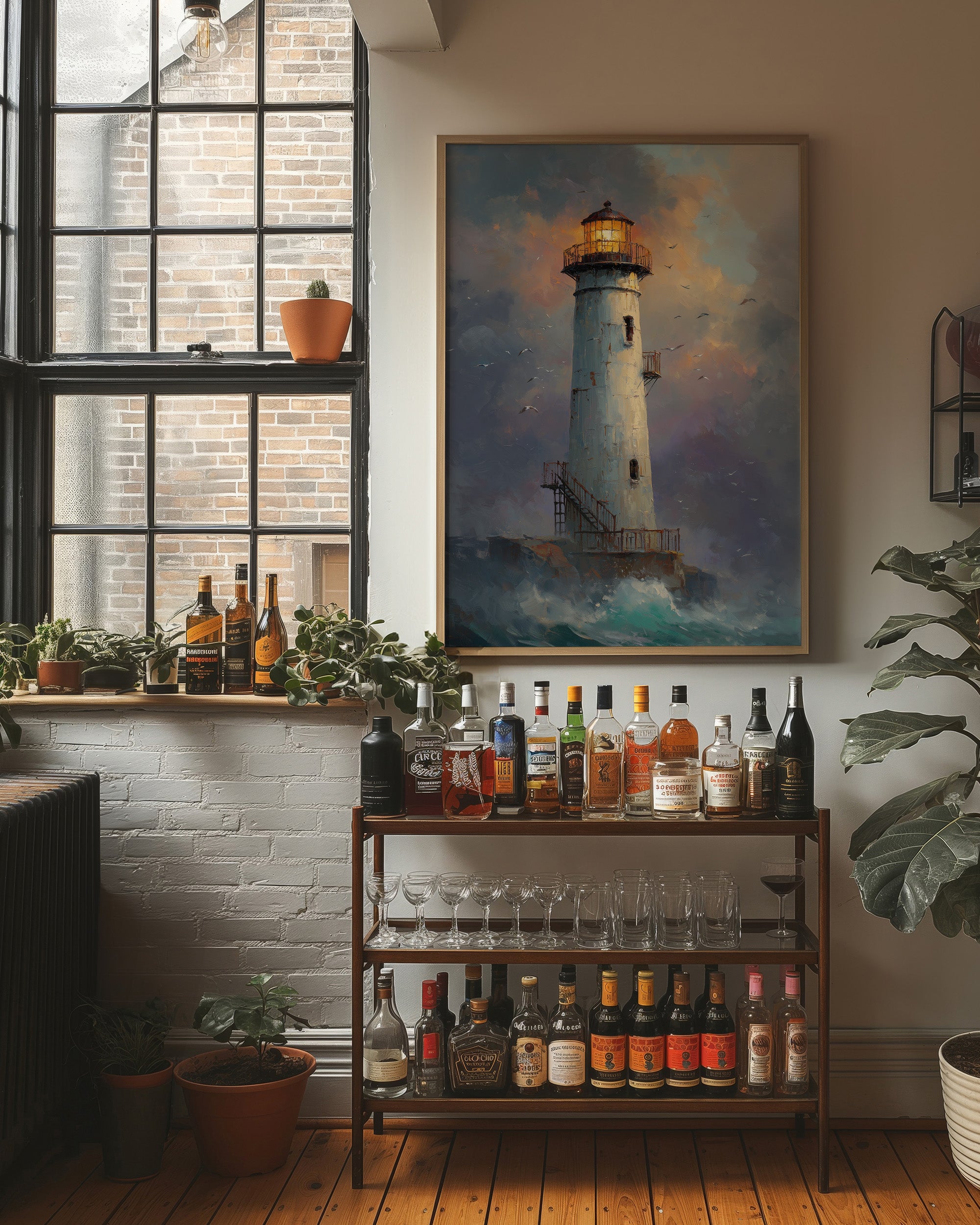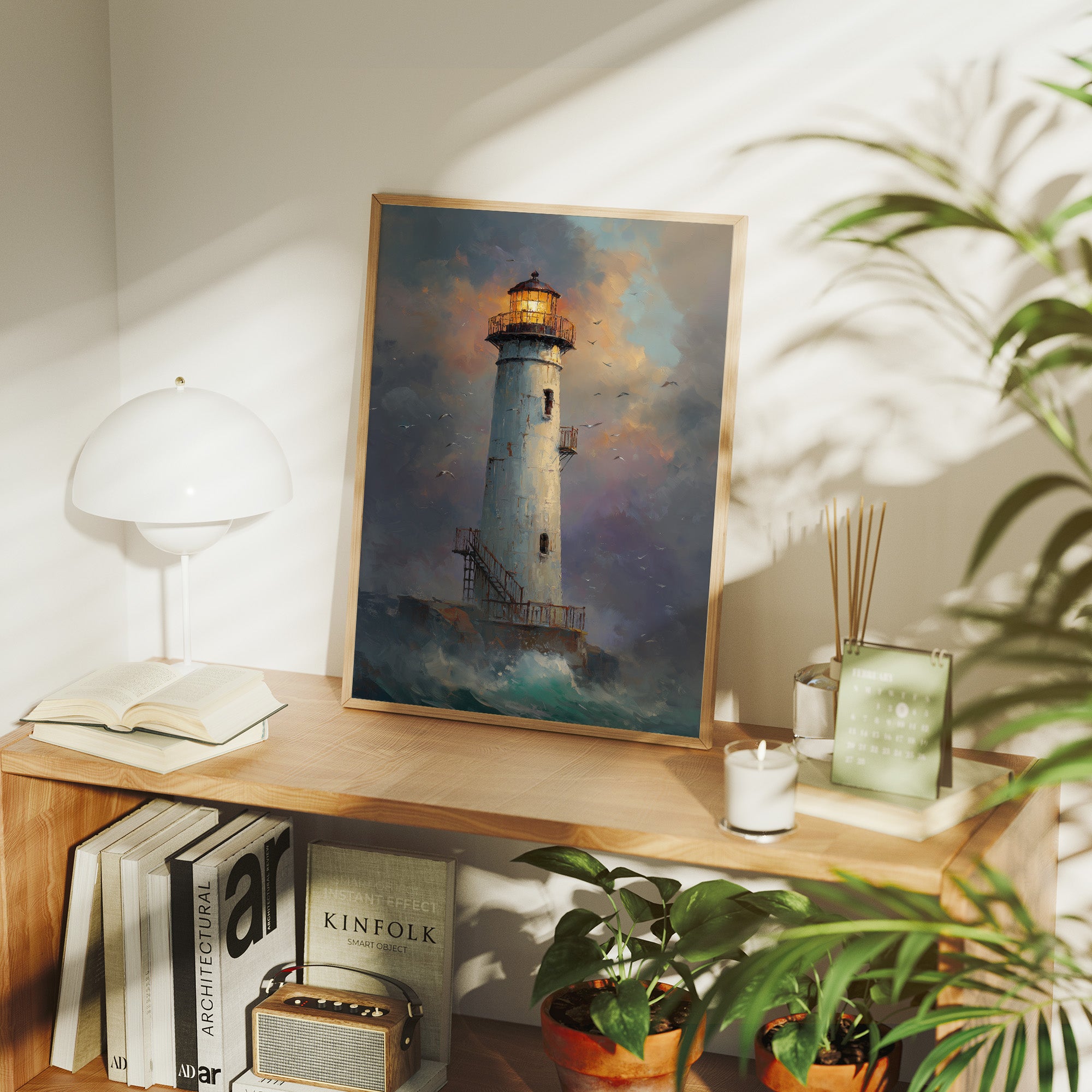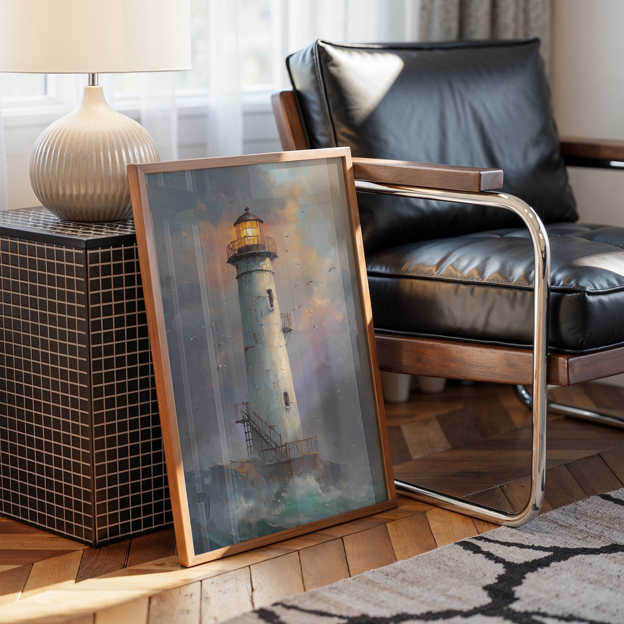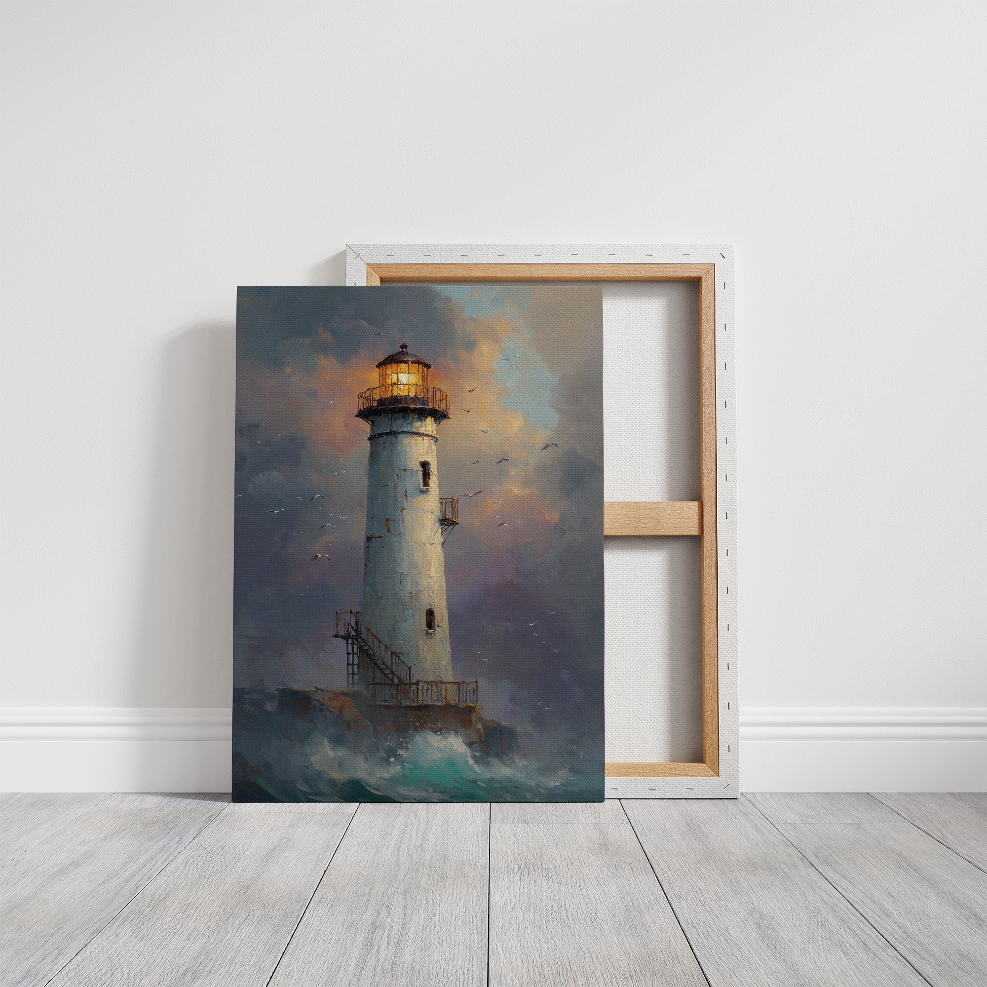 The white lighthouse tower rises majestically from rocky shores as turbulent waves crash below. Its lantern blues, and sunset oranges. Seabirds circle the structure, adding movement to the composition.