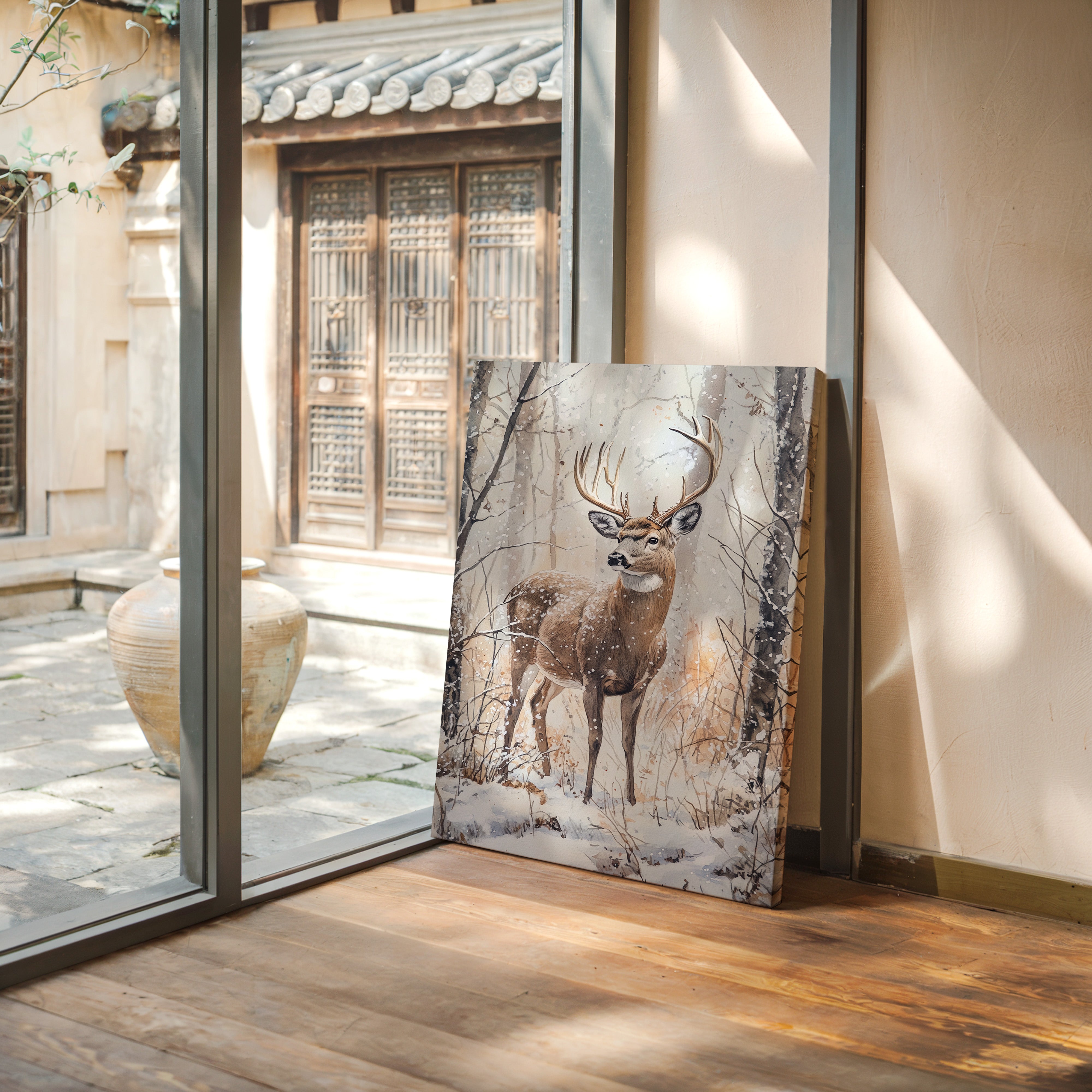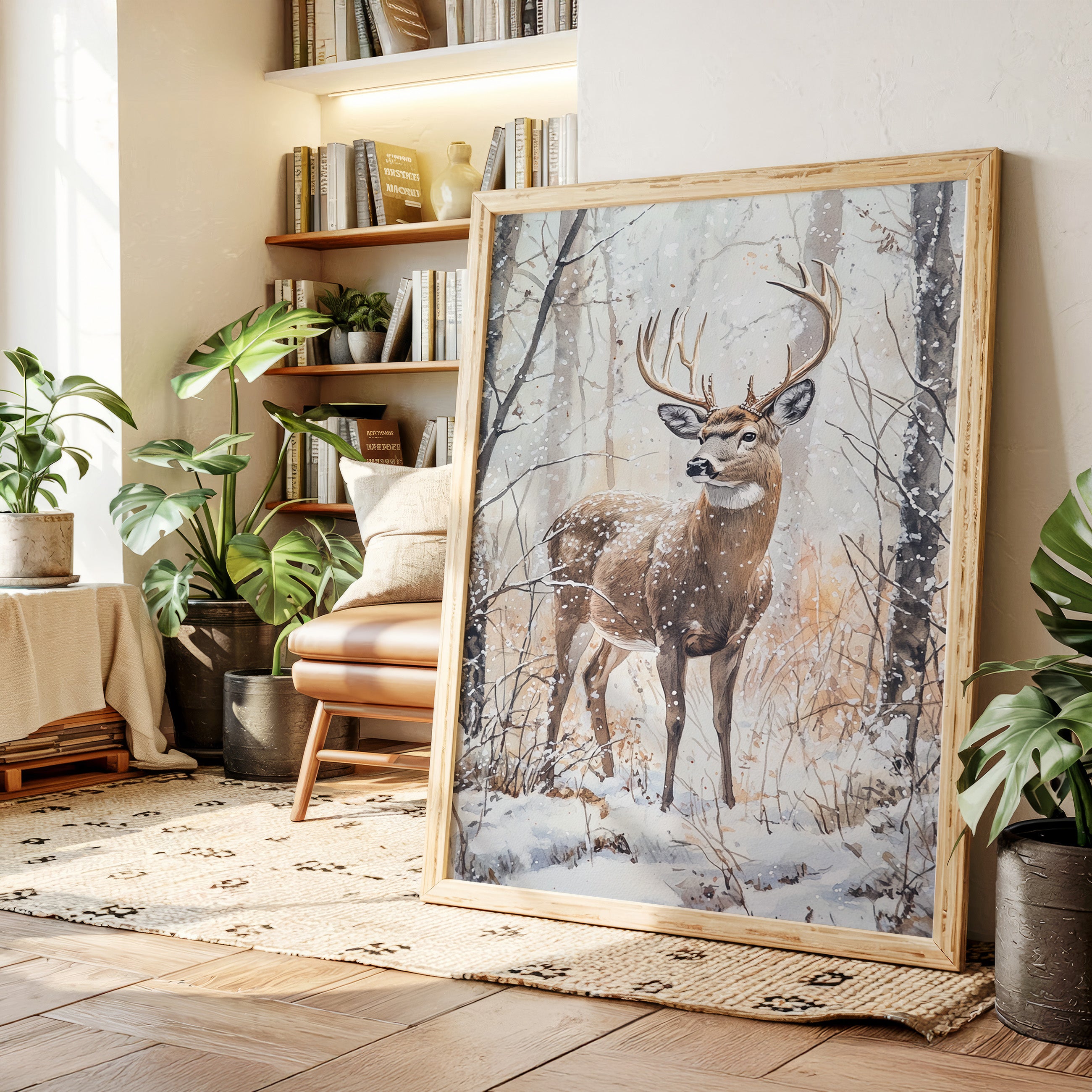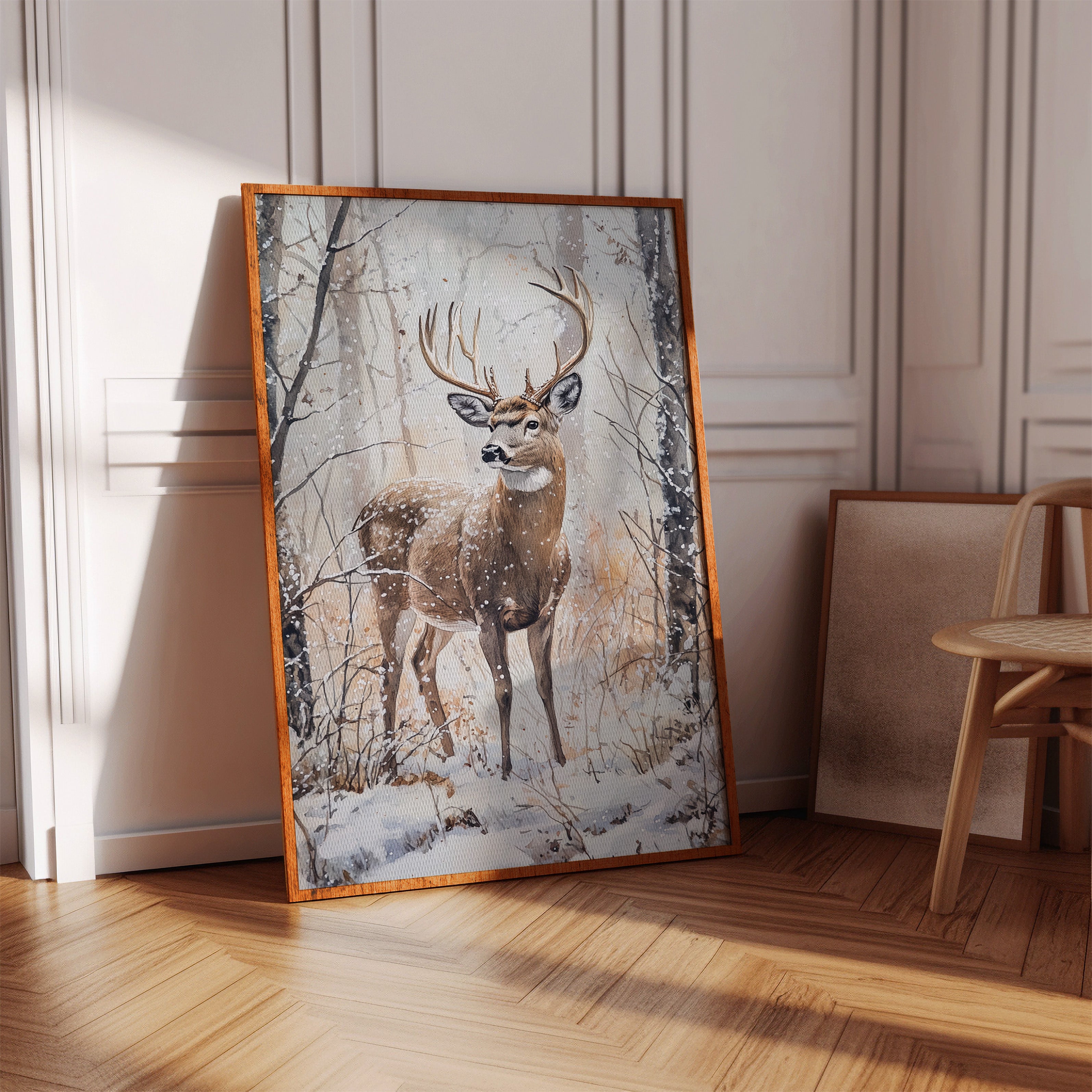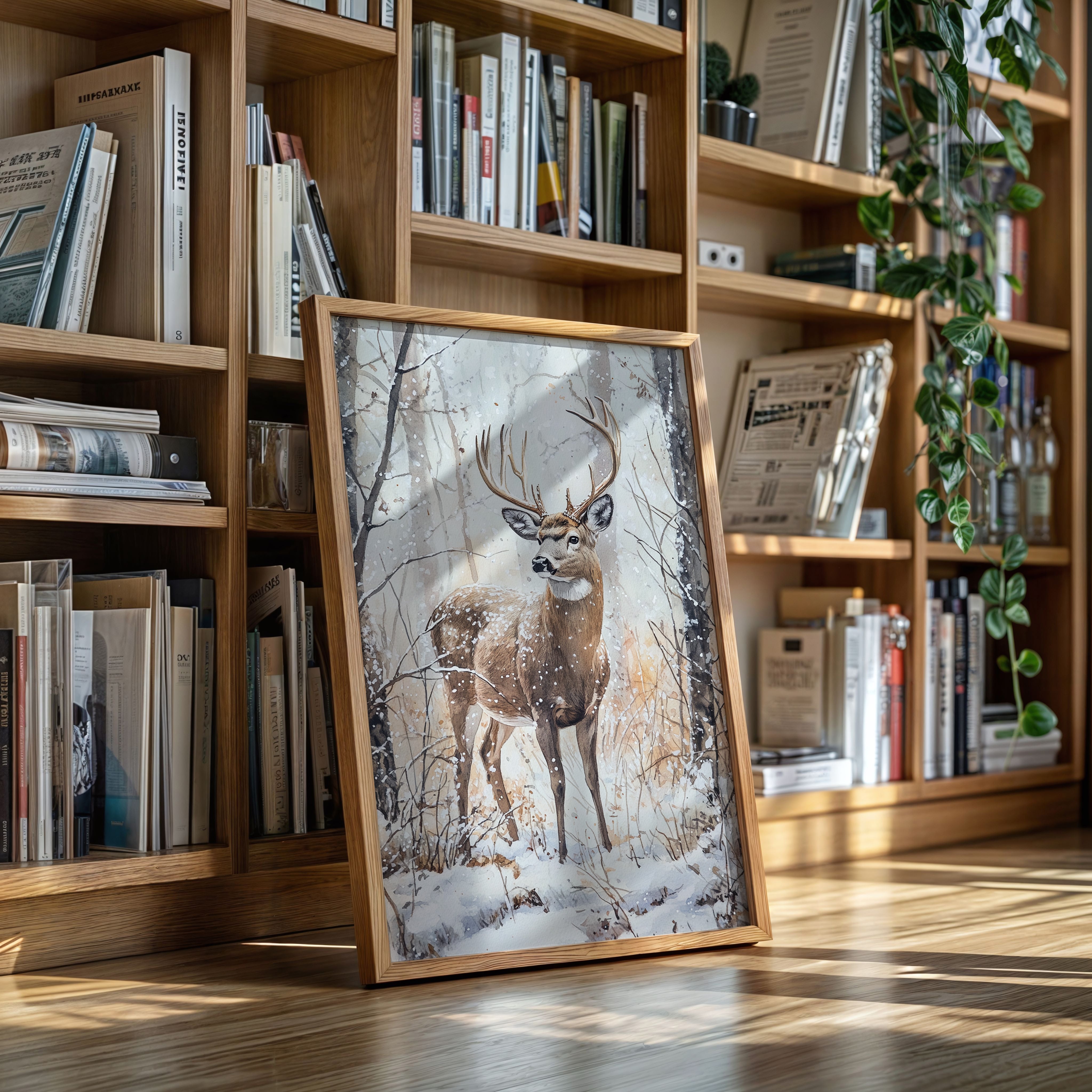 Amidst a gentle snowfall, a majestic deer stands poised, embodying the stillness of winter's embrace. This piece captures the essence of the wild, drawing you into its serene, snowy landscape. Each brush stroke reveals soft browns and whites, the warm fur contrasting beautifully with the coolness of the falling snow, evoking a sense of tranquility and awe. Imagine this captivating scene gracing your living room or study, inviting nature's peace into your home.